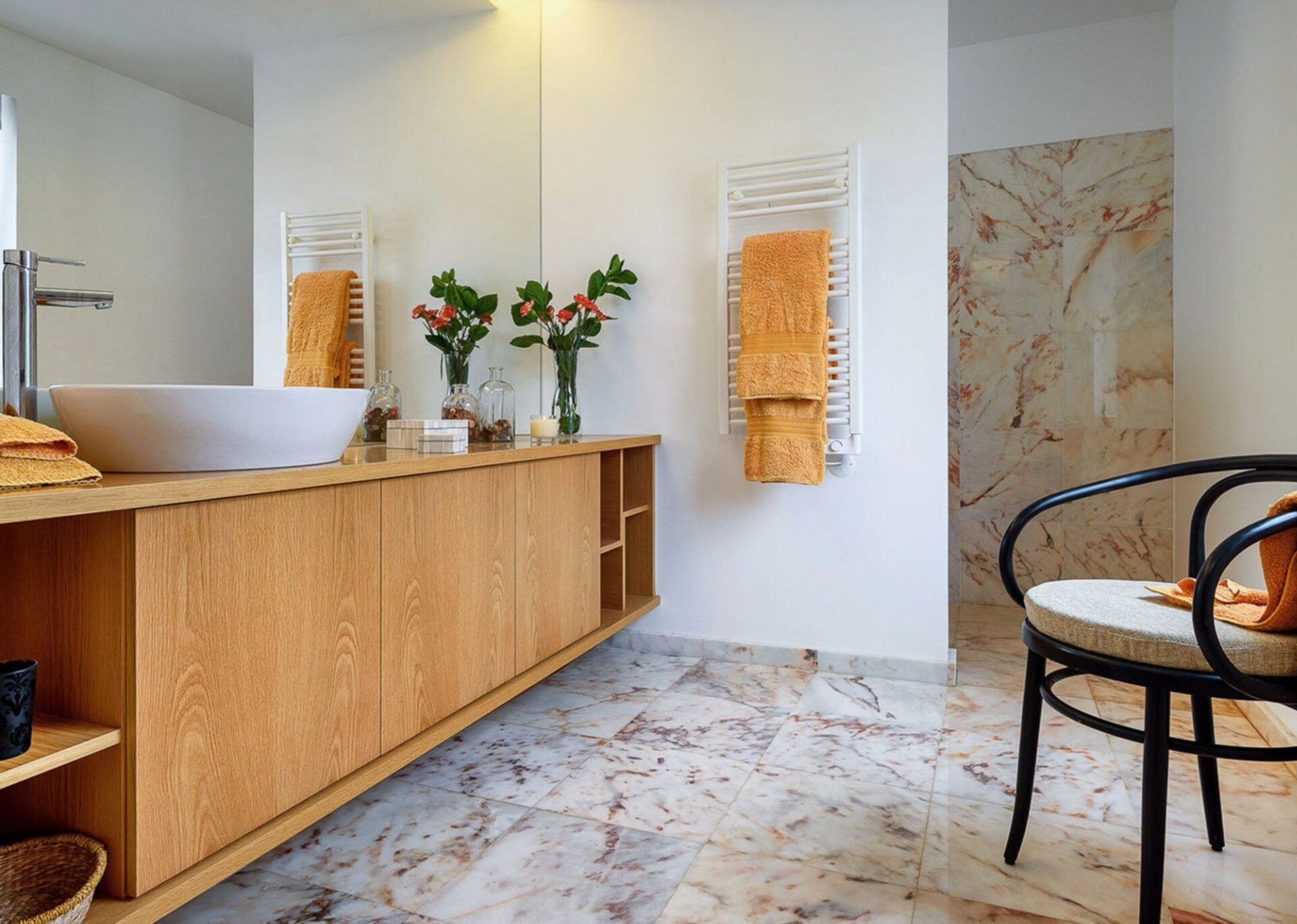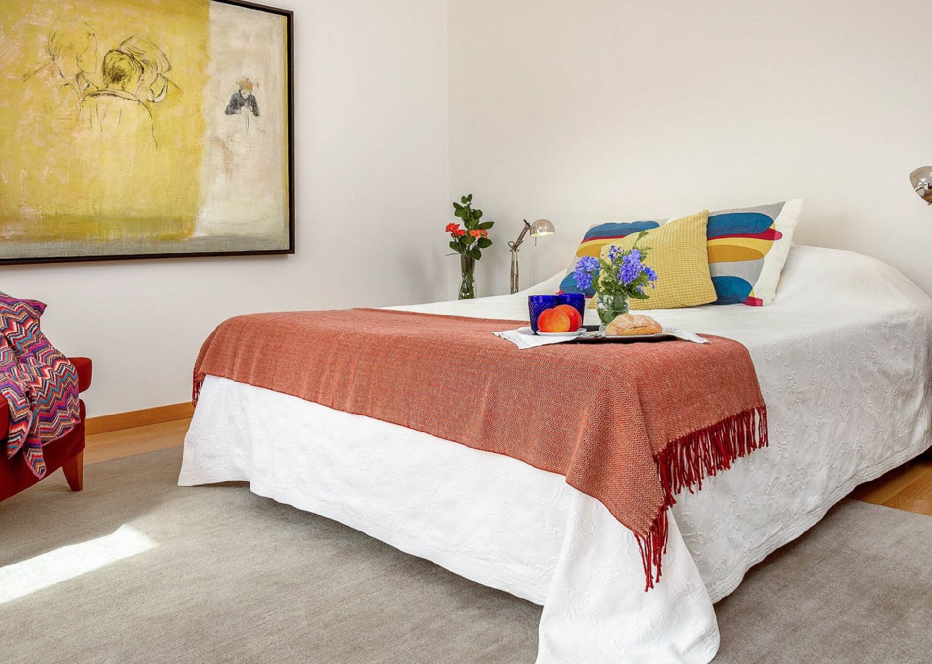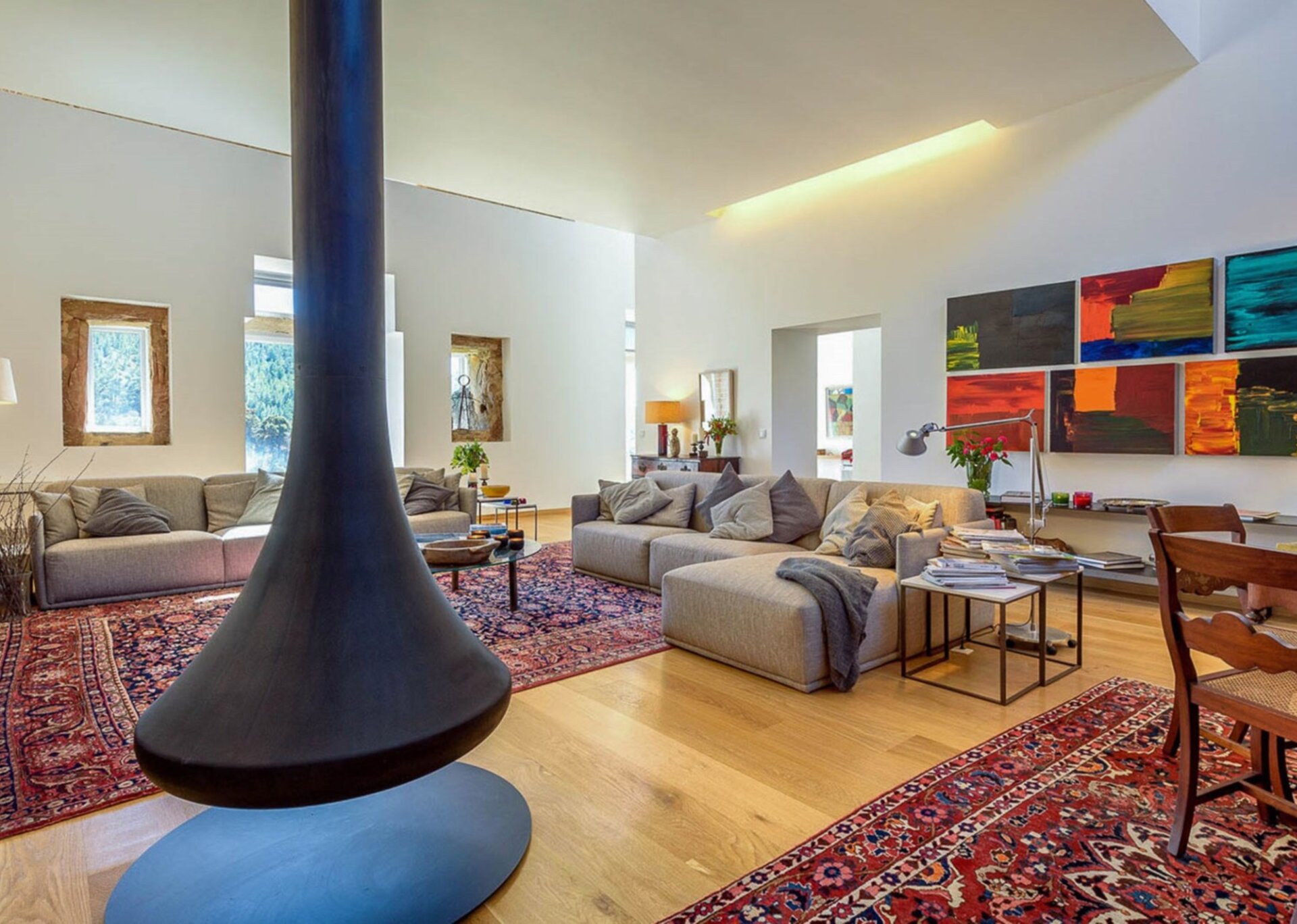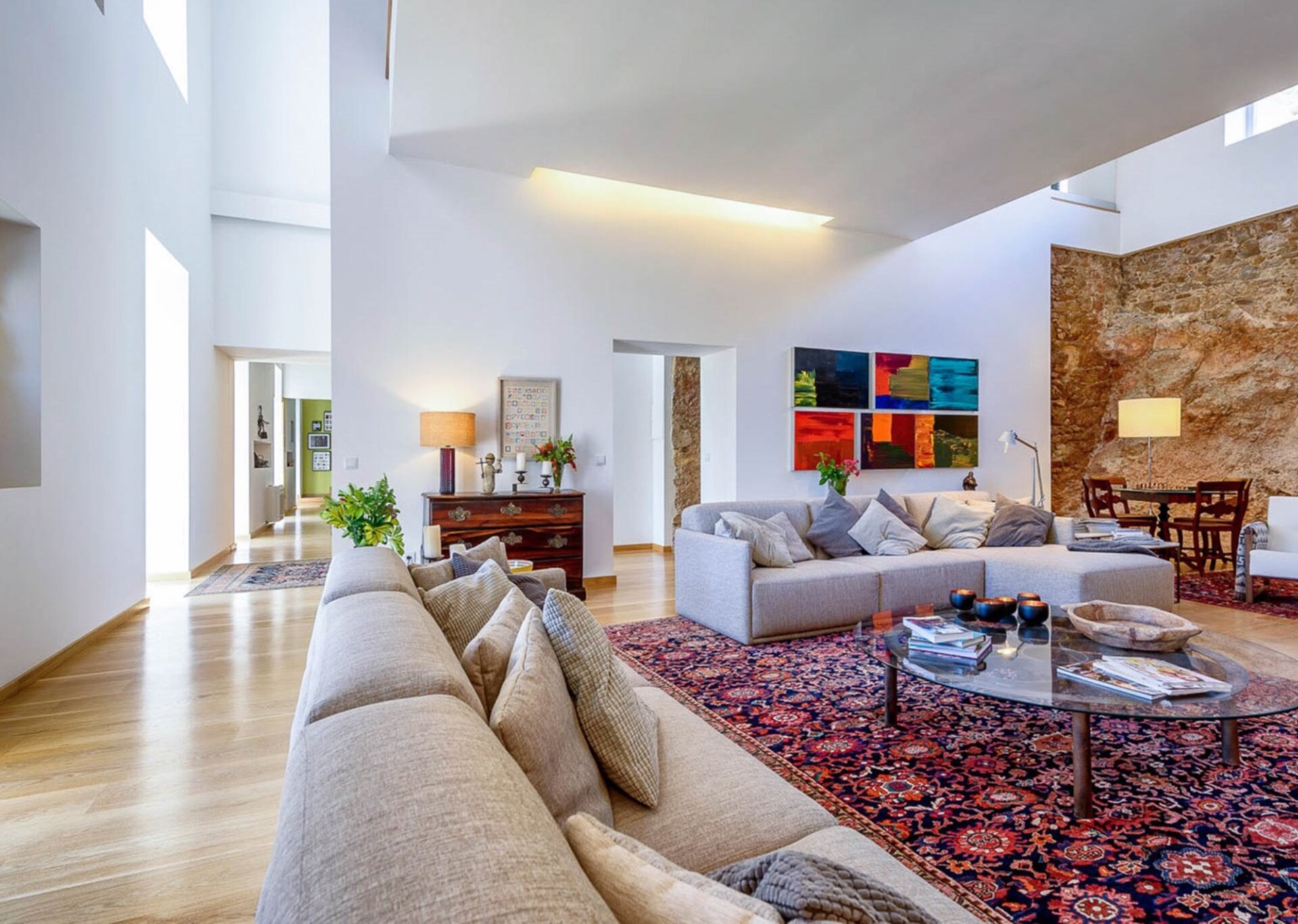 At this Peniche farmhouse, history has been well integrated with 21st-century comforts. The main house is a remodeled farm building where straight-line contemporary architecture blends seamlessly with centuries-old stone walls and floors. Add an interesting, vibrant contemporary art collection, oversized antique oriental rugs, a beautiful collection of antique furniture and comfy sofas and you have the perfect recipe for a harmonious multi-generation home.
