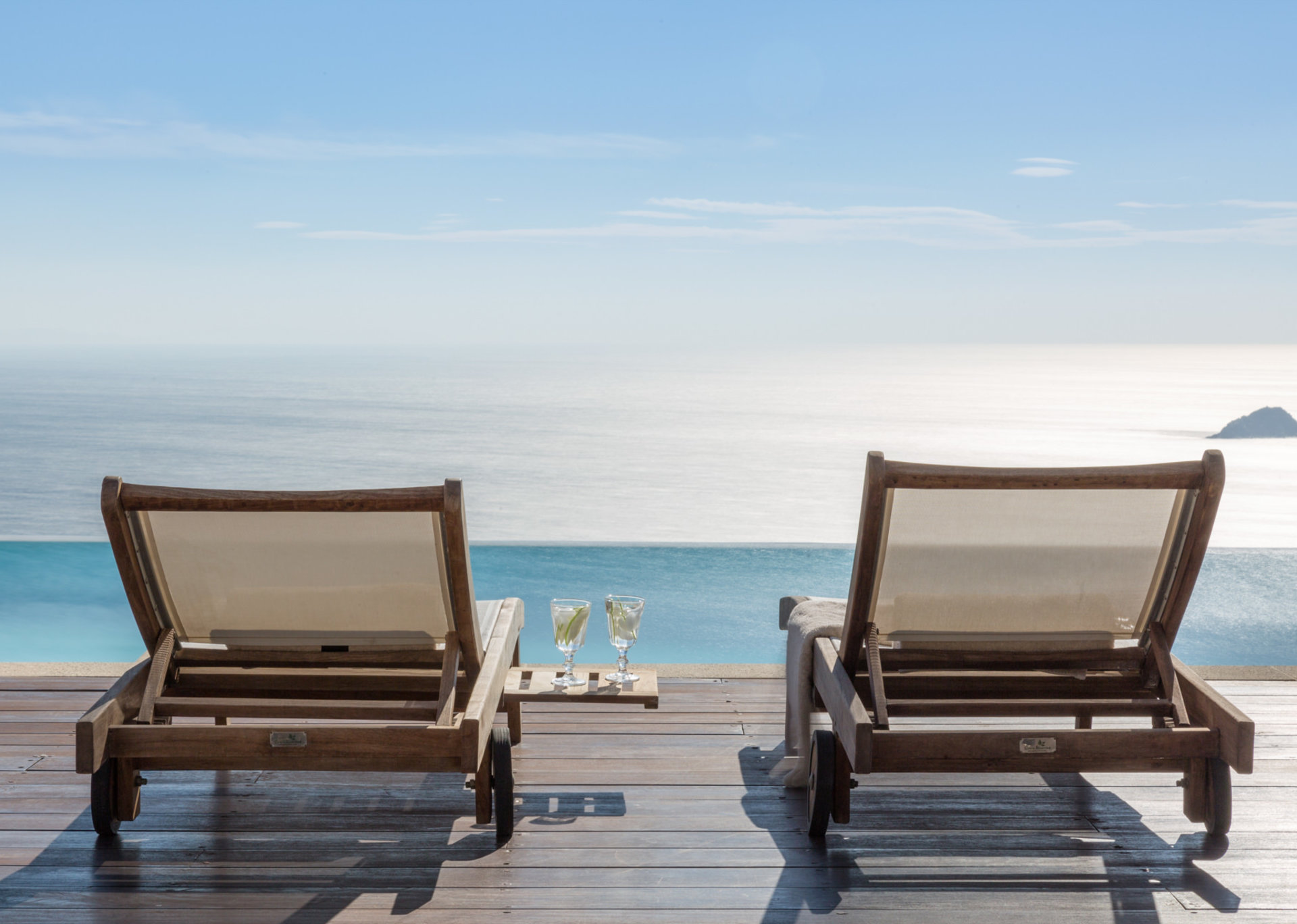 Sitting Room with sofas, fireplace and flat screen TV overlooking infinity pool and sea and opening onto pool terrace with French doors