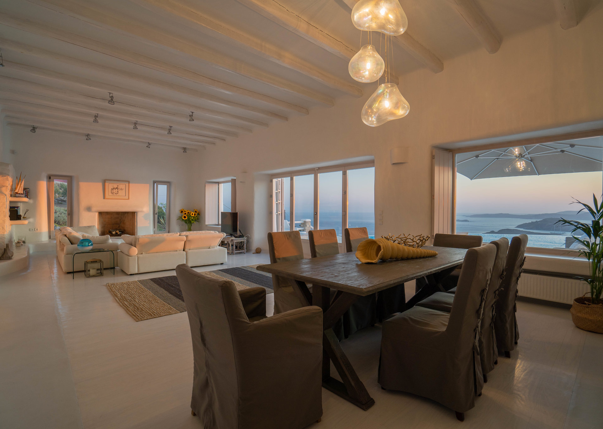 Dining room with table for 10, overlooking infinity pool and sea and opening onto pool terrace with French doors