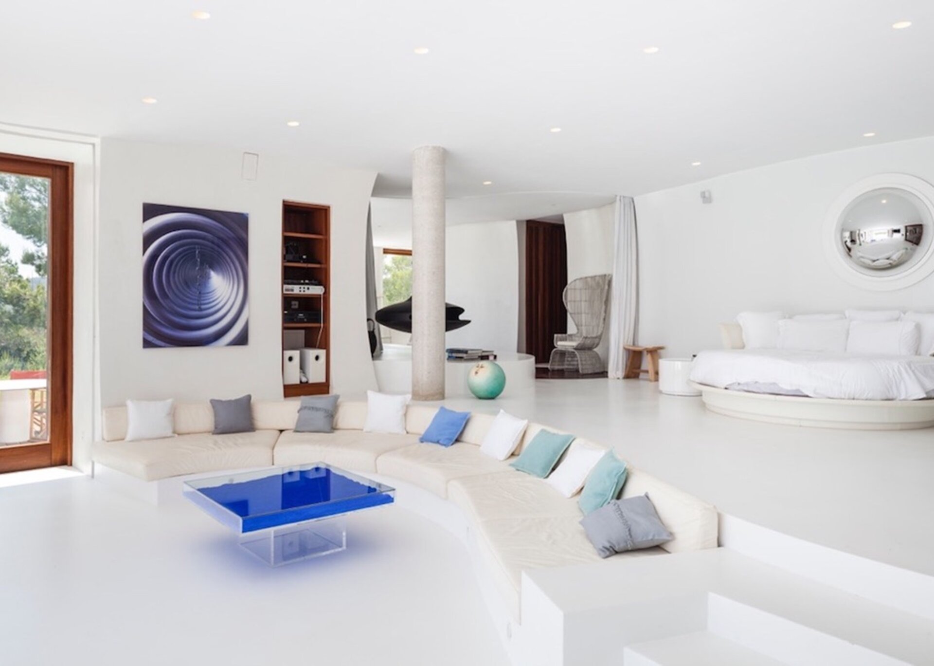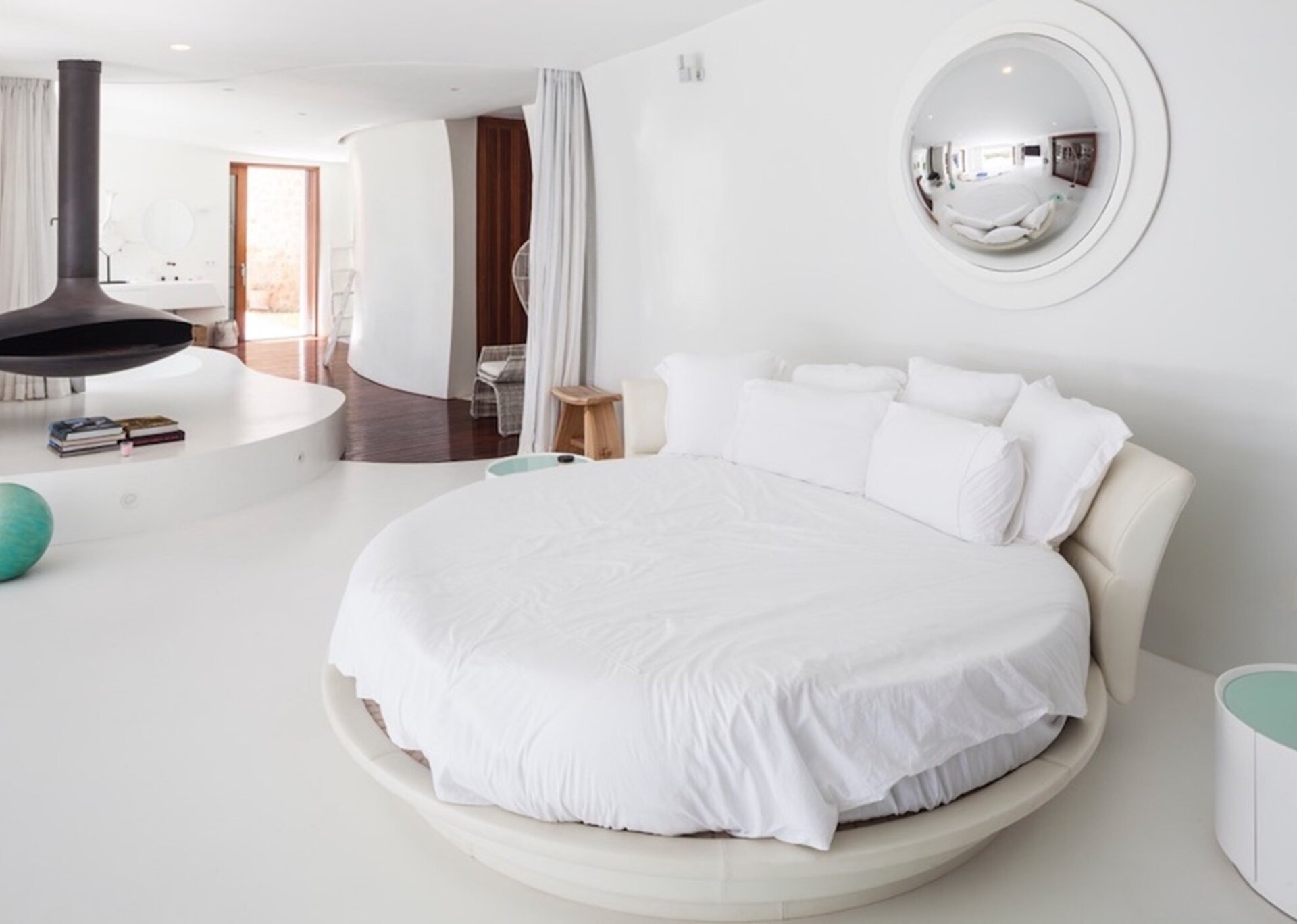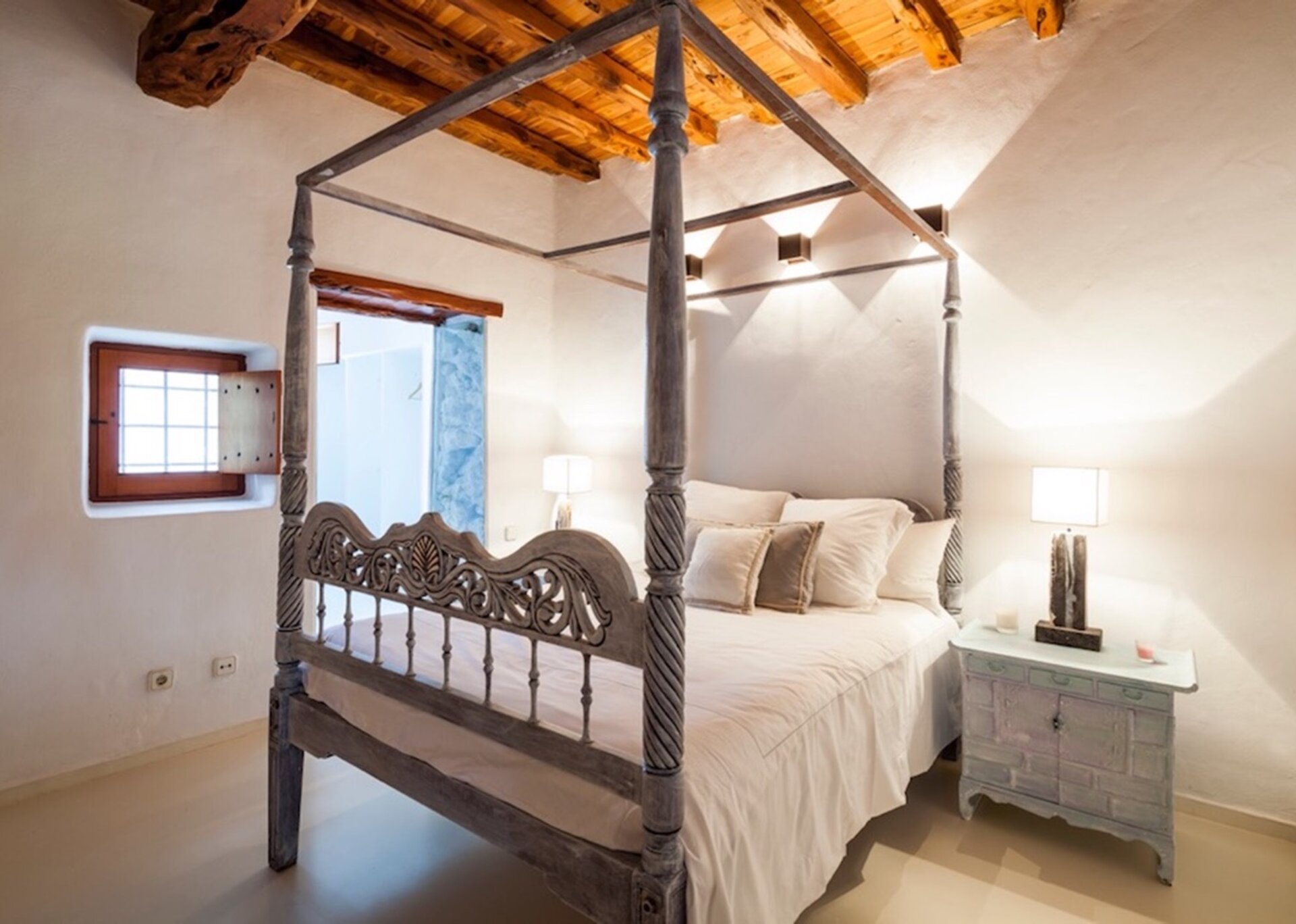 The main suite is spacious and airy. Elevated above the expansive infinity pool and orientated south towards Formentera, the national park of Salinas and enjoying excellent quality of natural light at all hours of the day. The suite is detached from the main house and300 m2 located on the top of the hill, with one of the most beautiful views of the island. Just beside there is a separate massage room.