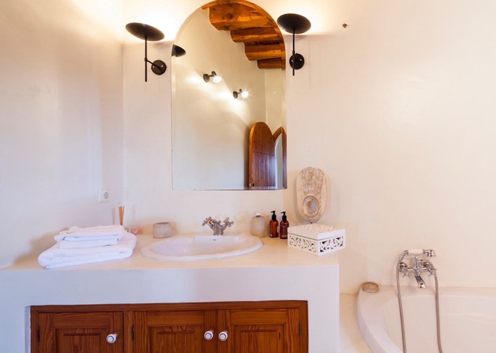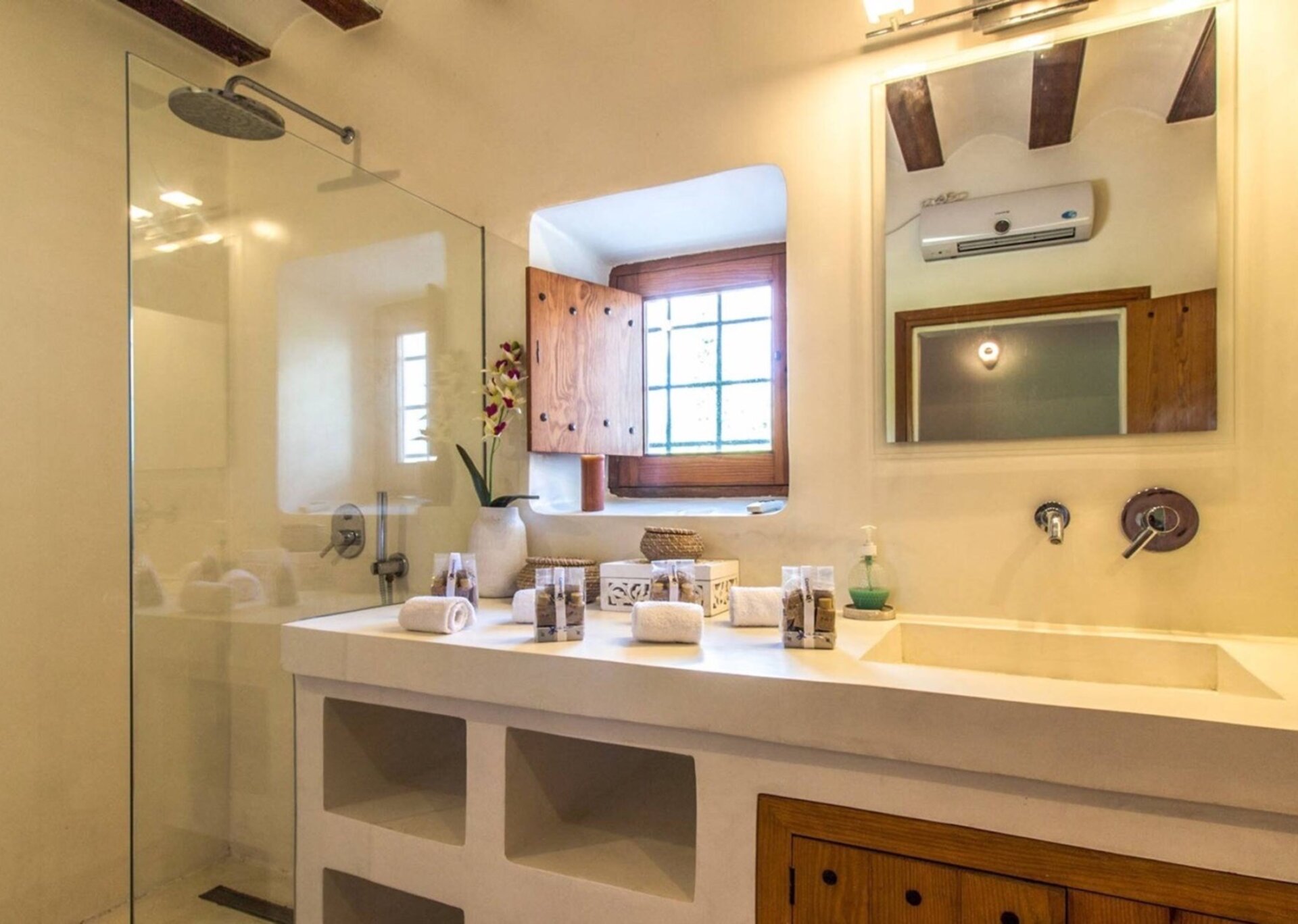 The master suite is located in a separate casita, a spacious and elegant suite with a huge round-shaped bed, opulent en-suite bathroom, sofa area and private terrace. The further bedrooms are equally elegant and stylishly furnished, with double beds and three have their own ensuite bathrooms.