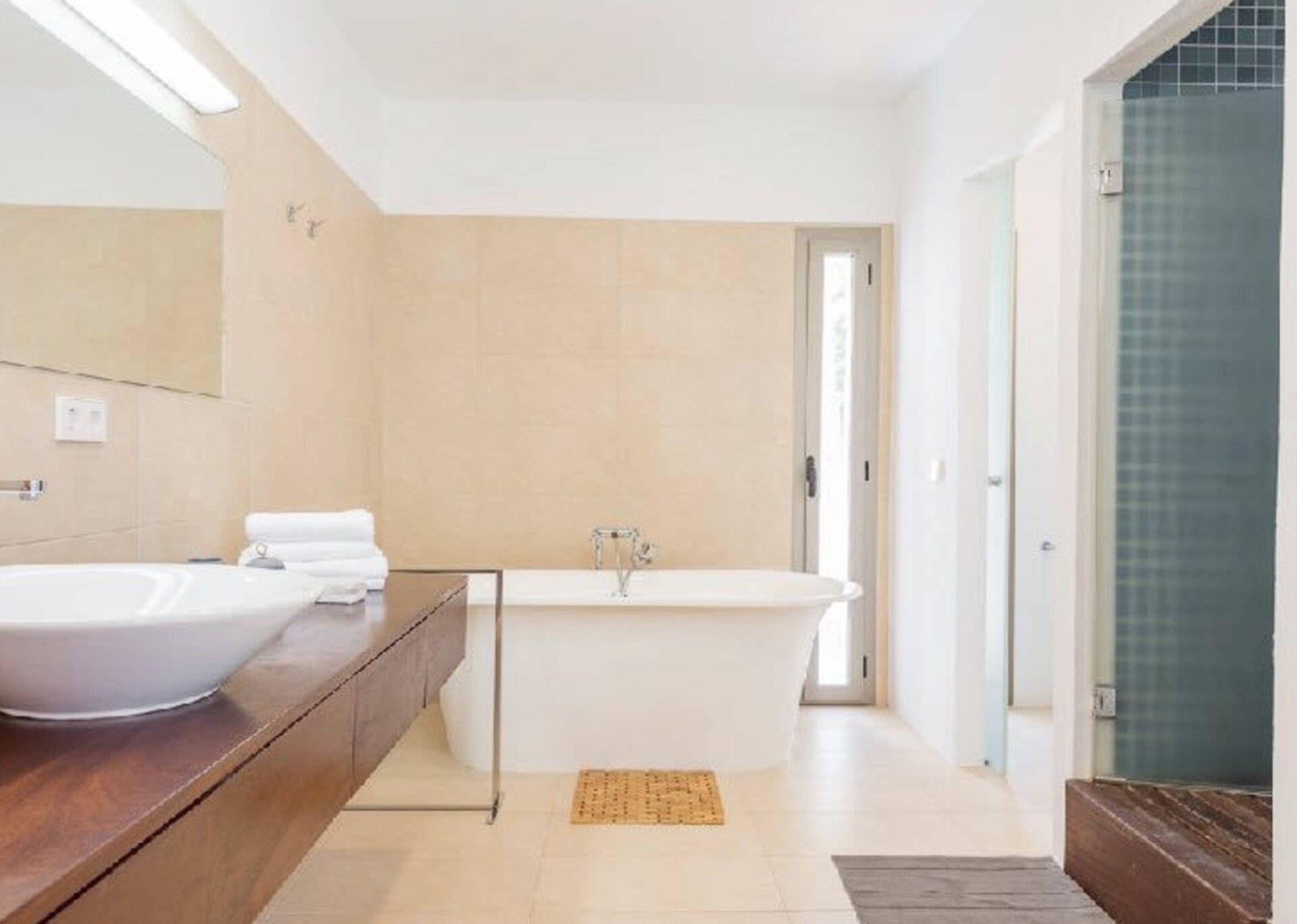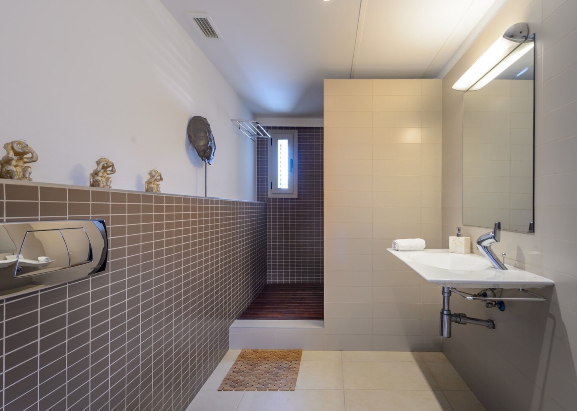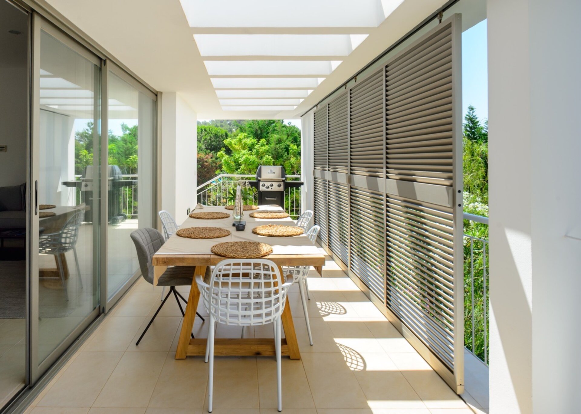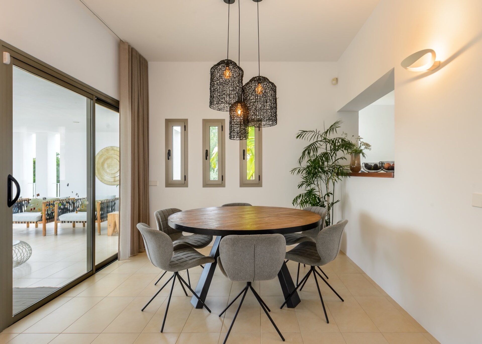The main house spans 400 square meters and accommodates 5 bedrooms, 6 bathrooms, an open-plan fully equipped kitchen, a cozy living room, and a dining room with picturesque views.