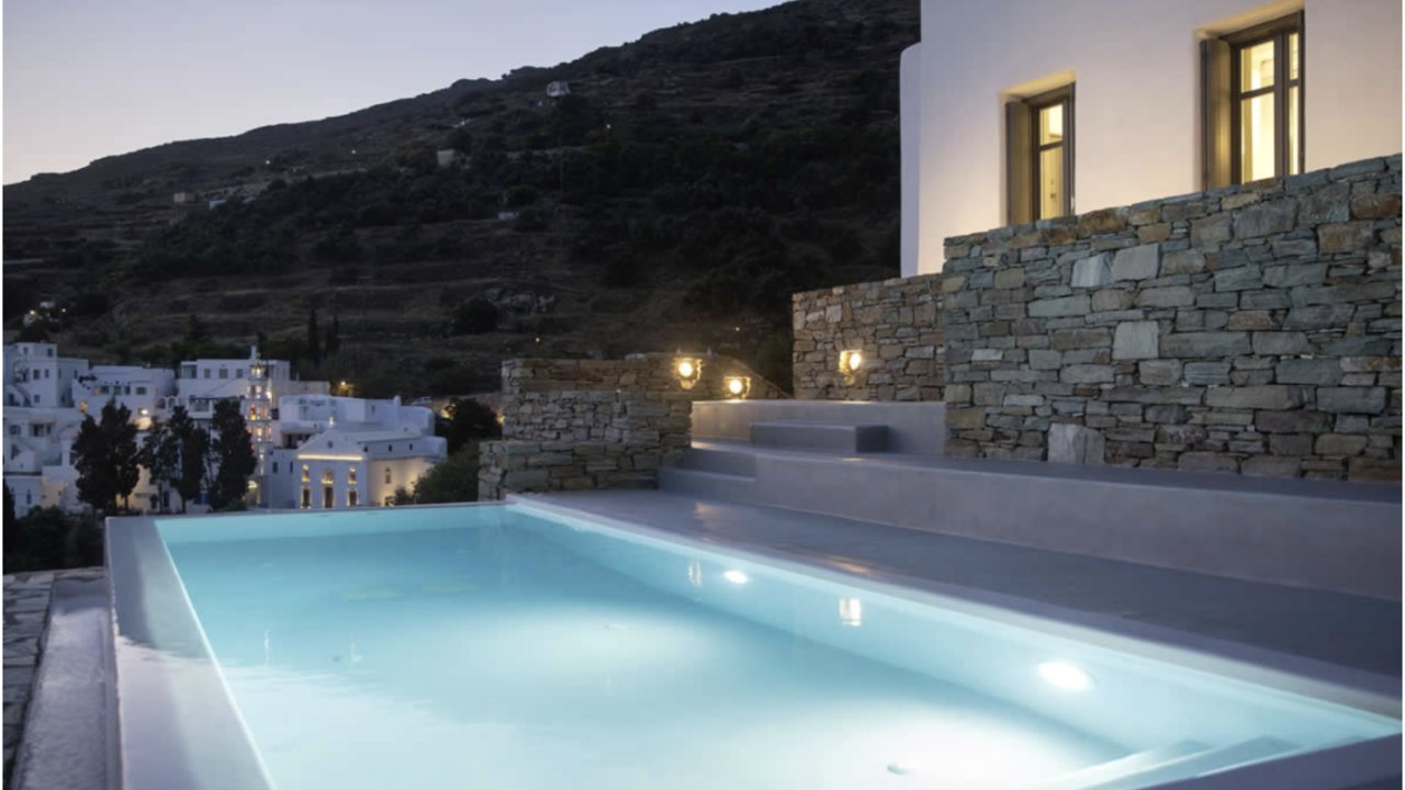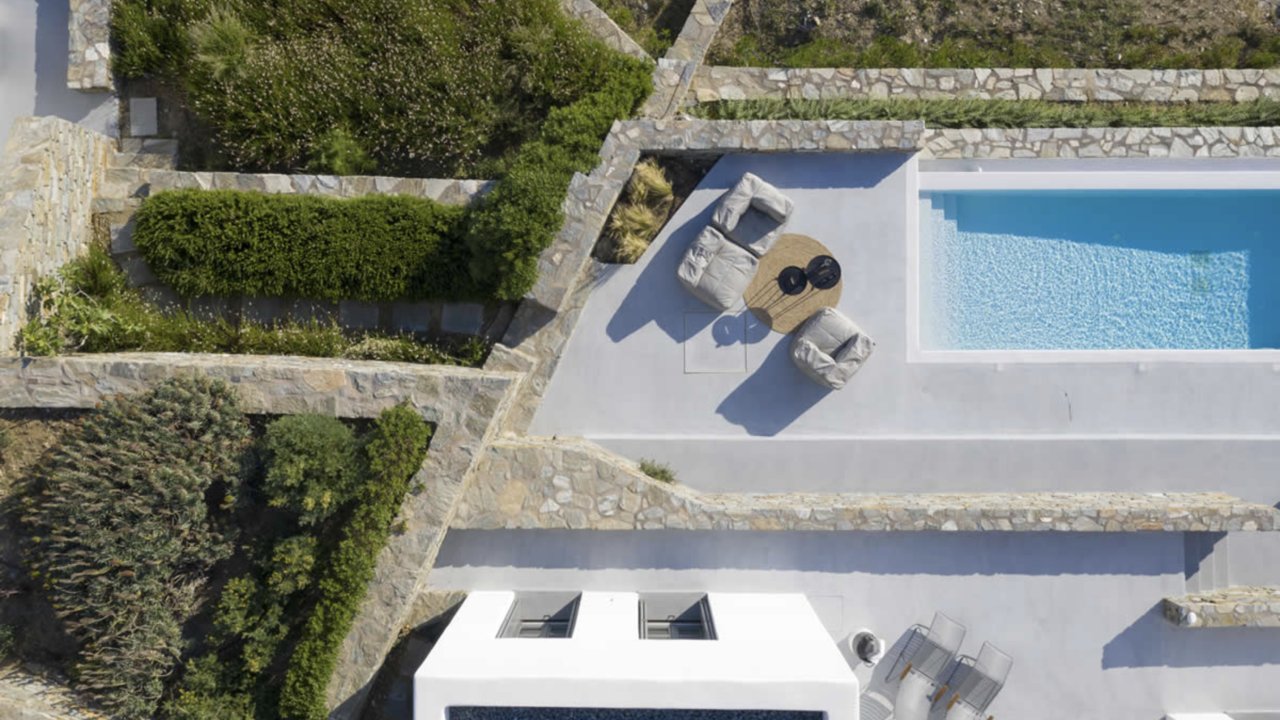 - U-shaped swimming pool, pergola shaded lounging area, Mediterranean garden, superb view of the Aegean sea and the village of Kardiani