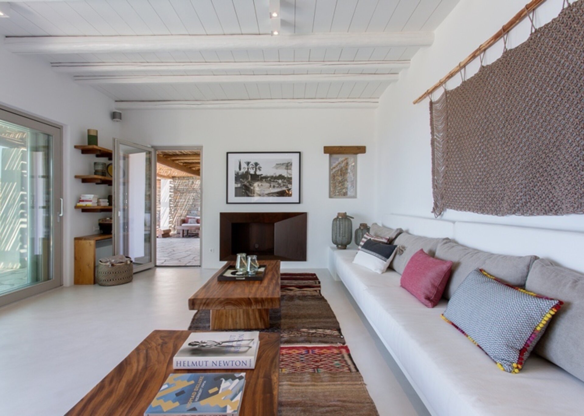 Inside the house the furniture and the decoration is elegant and bright, with a luxurious atmosphere and numerous features. The design is meticulous and each room is spacious and cozy. The living room has comfortable sofas to relax in front of a fireplace and near it there is an indoor dining place ideal for family gatherings.