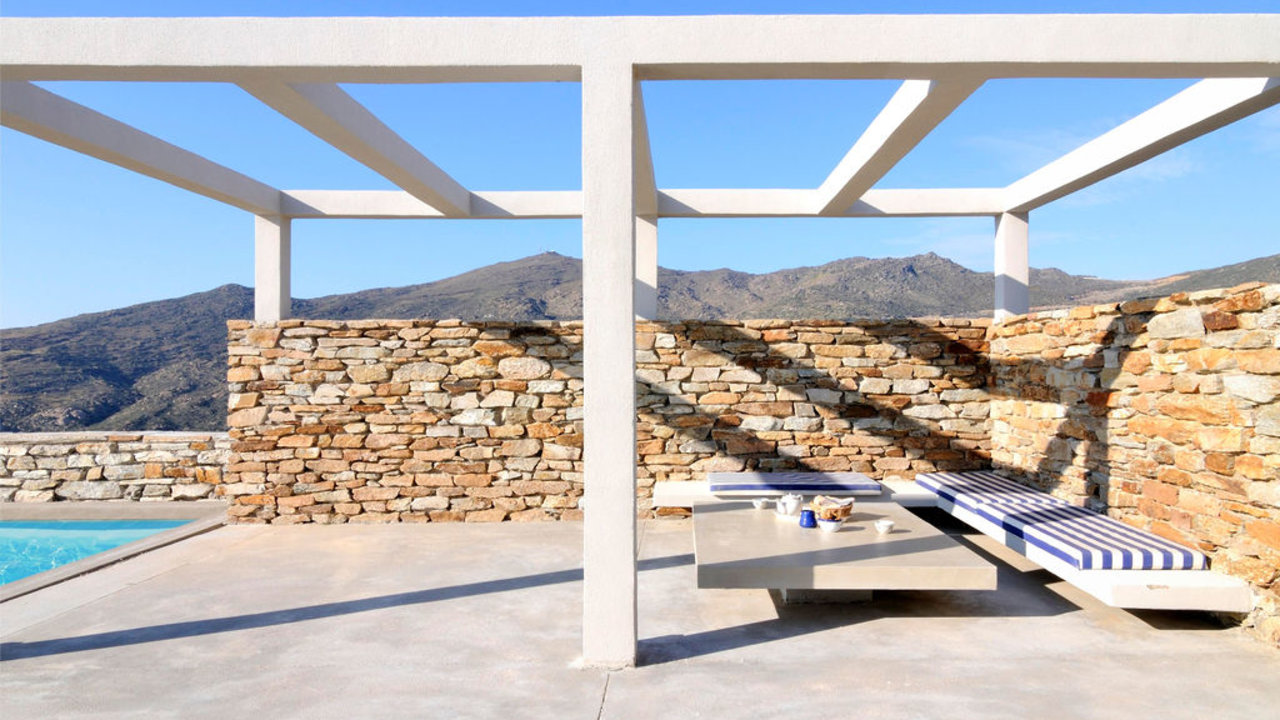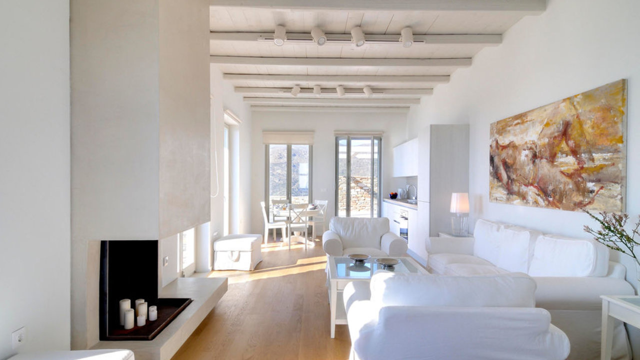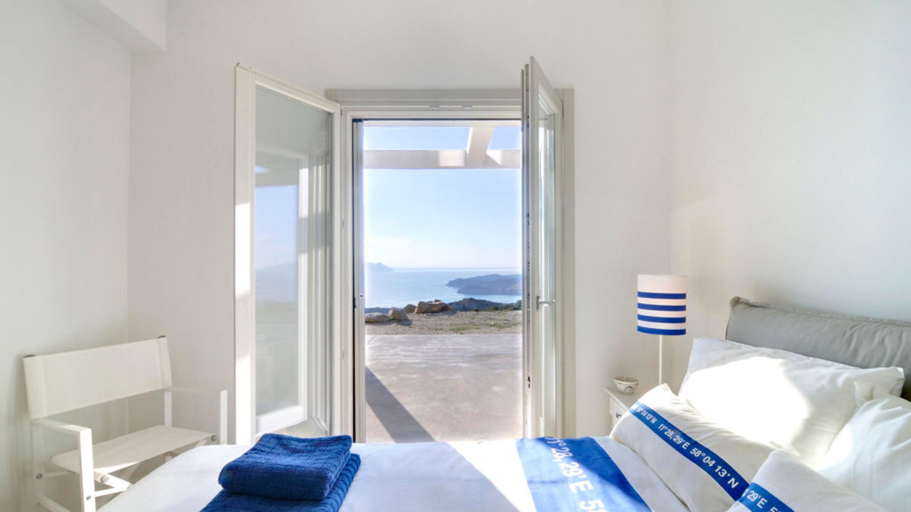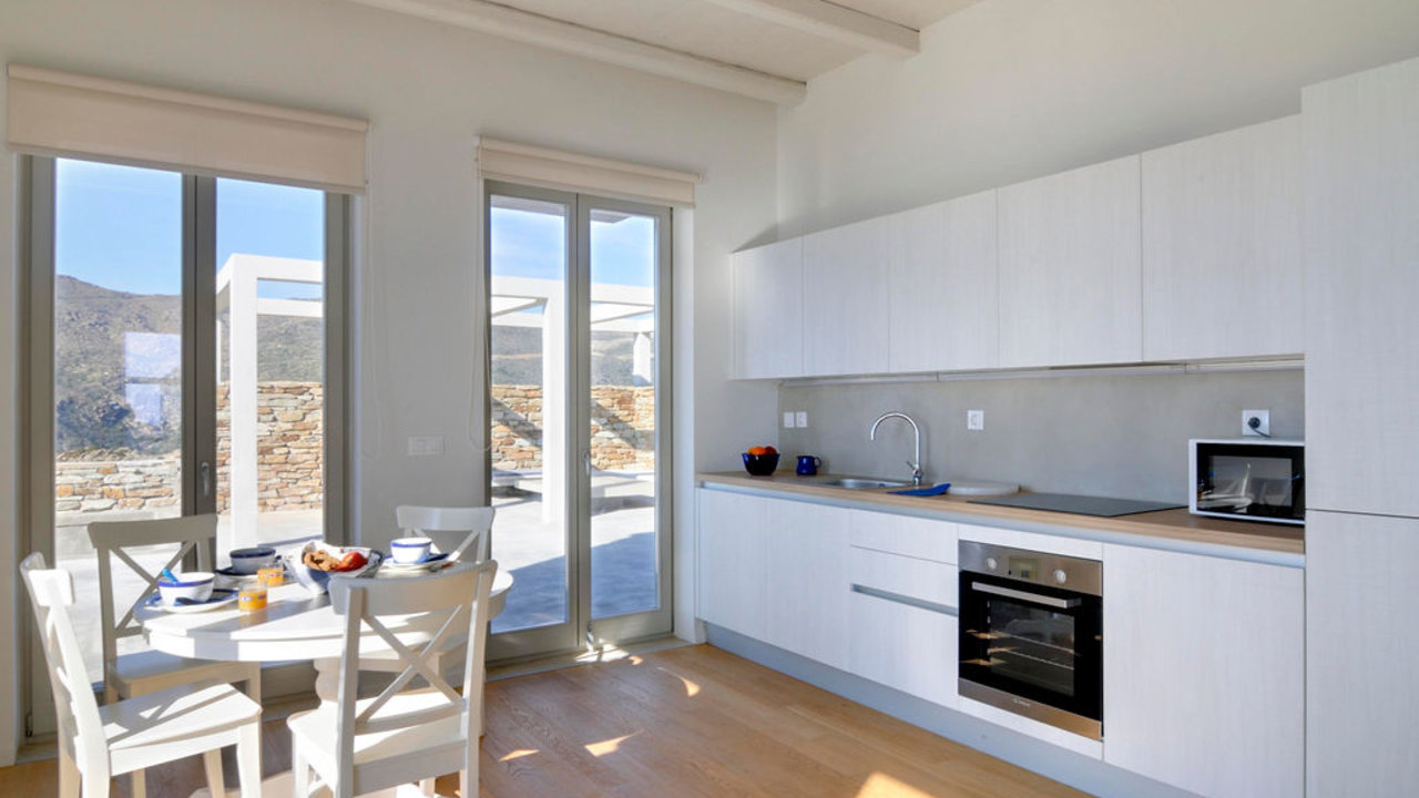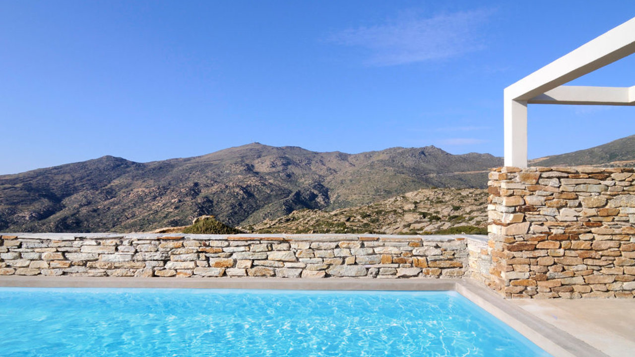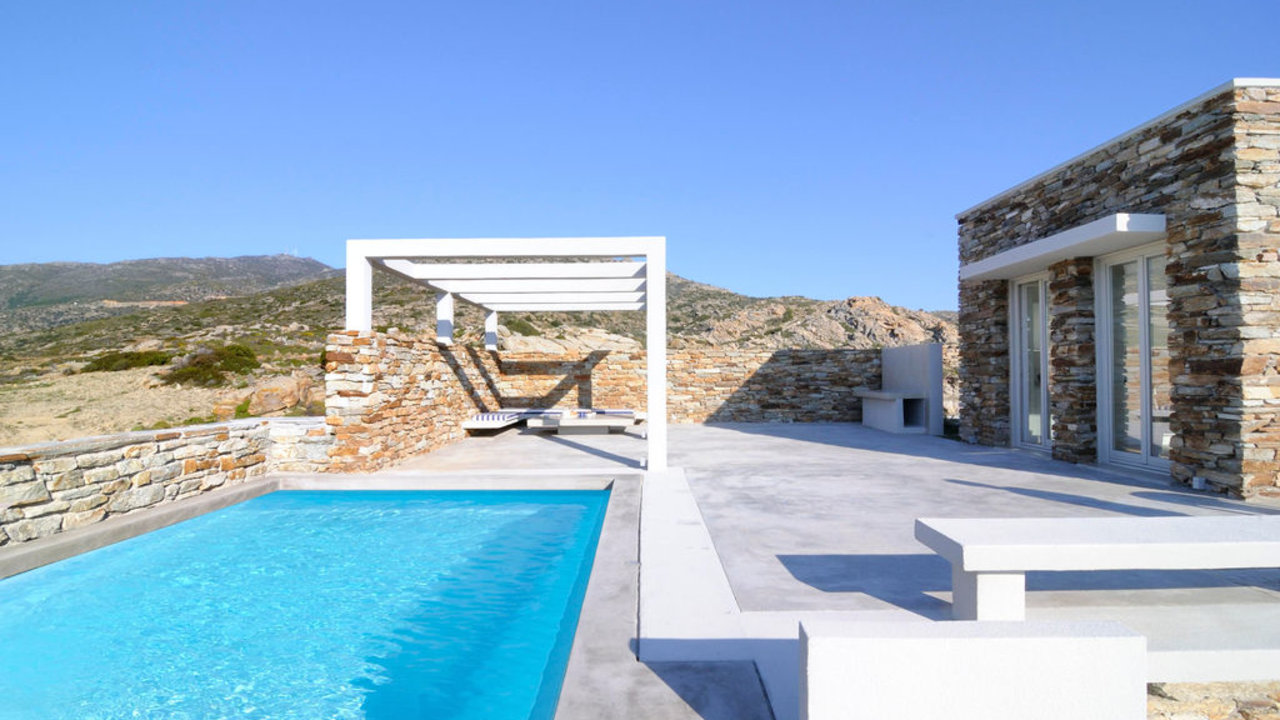 The villas are located in the Cycladic Island of Ios on the hill just on top of the Mylopotas bay, with unobstructed views of the deep blue of the Aegean sea including the beautiful island of Santorini and Sikinos Irene is less than 2km away from Mylopotas bay, 4km from city of Ios and 9km from the main port. Mylopotas Bay is the most popular beach on Ios and one of the most famous beaches in Greece. Mylopotas Beach has been awarded a Blue Flag for its quality service offering and its high environmental standards; it is more than 1km long and very wide, with beautiful golden sands and crystal-clear waters. Mylopotas also offers "beach fun", water sports, restaurants, bars and a lot of other activities. Irene is located in a complex with 4 villas, each villa has been designed with particular attention to detail with the primary objective being to offer high quality of living. The villas are entirely constructed with materials from the island itself including natural wood, stone and glass. Modern in design with open spaces, combined with the simplicity of Greek traditional architecture, the villas create an architectural style that blends entirely with their natural surroundings.