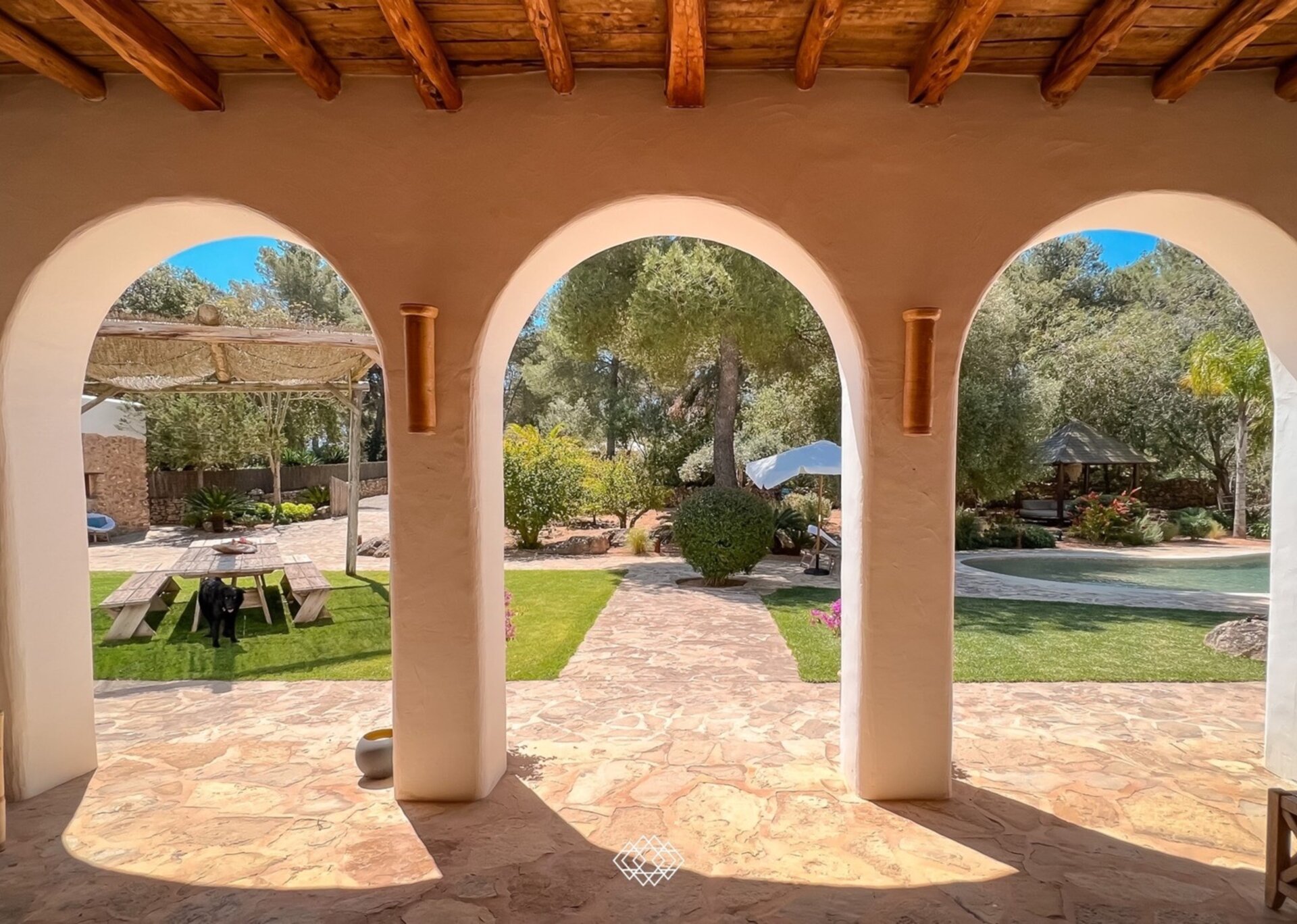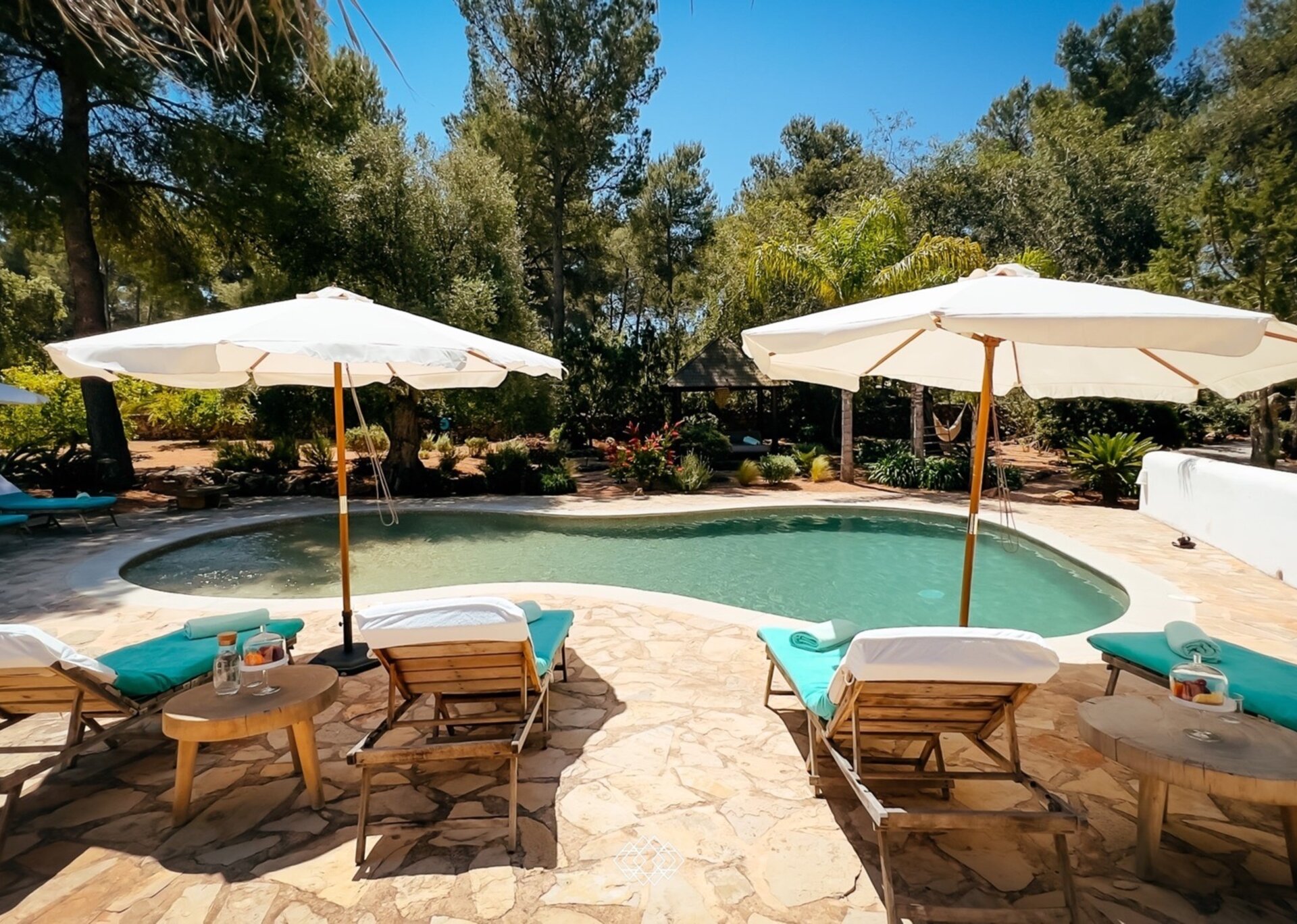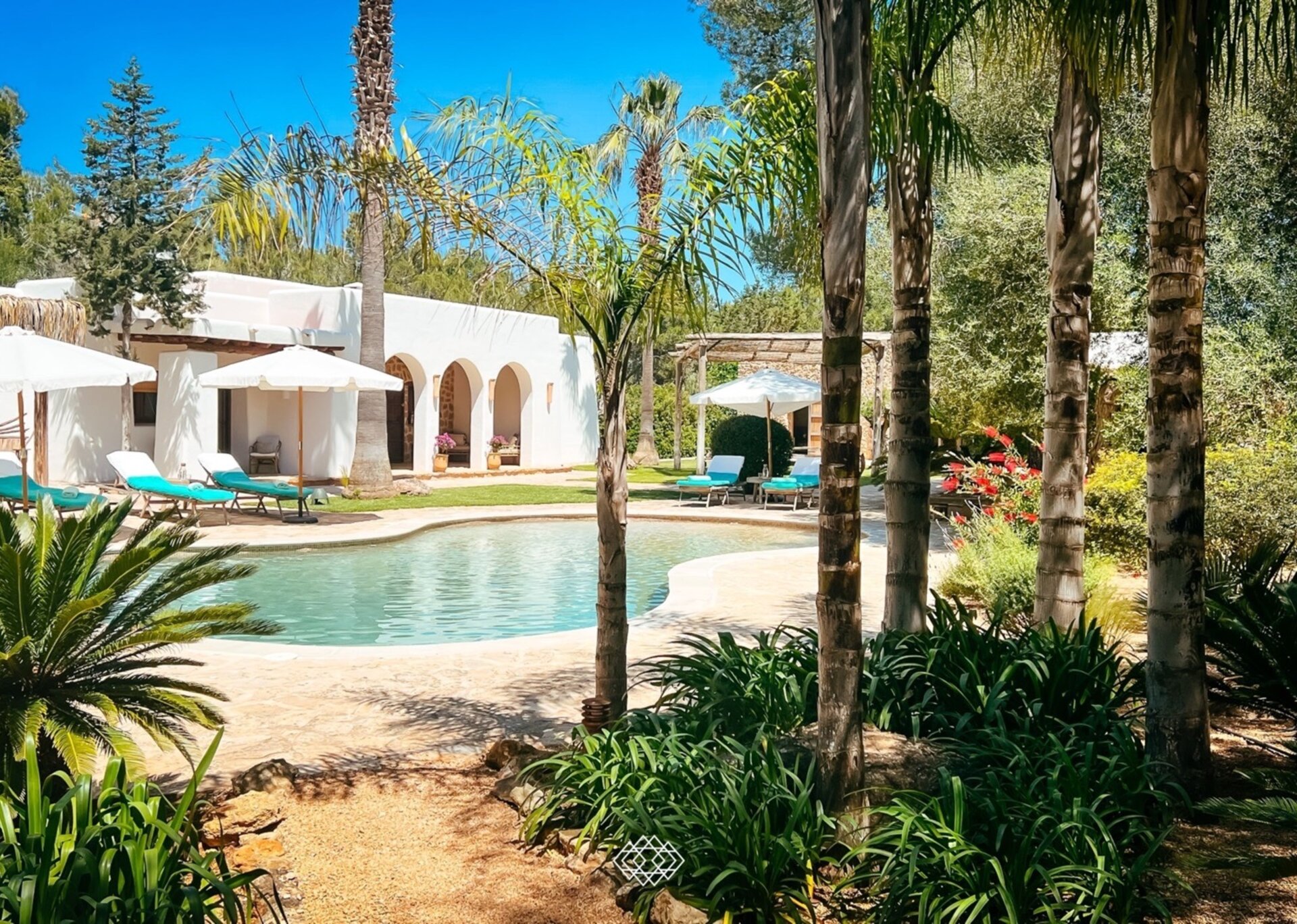 Nled amidst serene rolling hills and natural forests, just 2 km away from Santa Eulalia, lies a truly enchanting oasis. This idyllic retreat captivates with its abundant space, privacy, and tranquility. Upon passing through the entrance door, a brief drive of 50 meters brings you to two meticulously restored ibizencan fincas. Surrounded by a sprawling outdoor lounge area and a spacious pool, these fincas offer a harmonious blend of comfort and beauty. With 5 bedrooms, accommodating up to 12 guests, the architecture of the rooms allows for a flexible distribution, effortlessly catering to various types of guests - be it singles, couples, families, or groups.