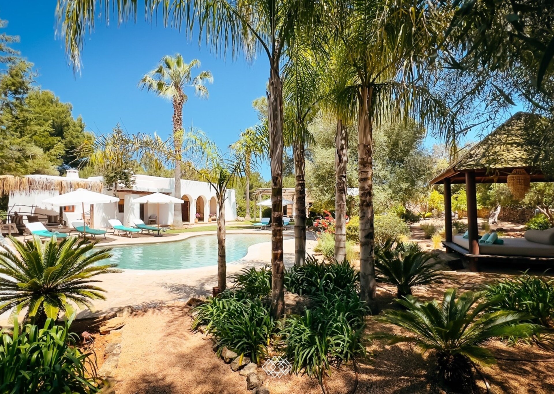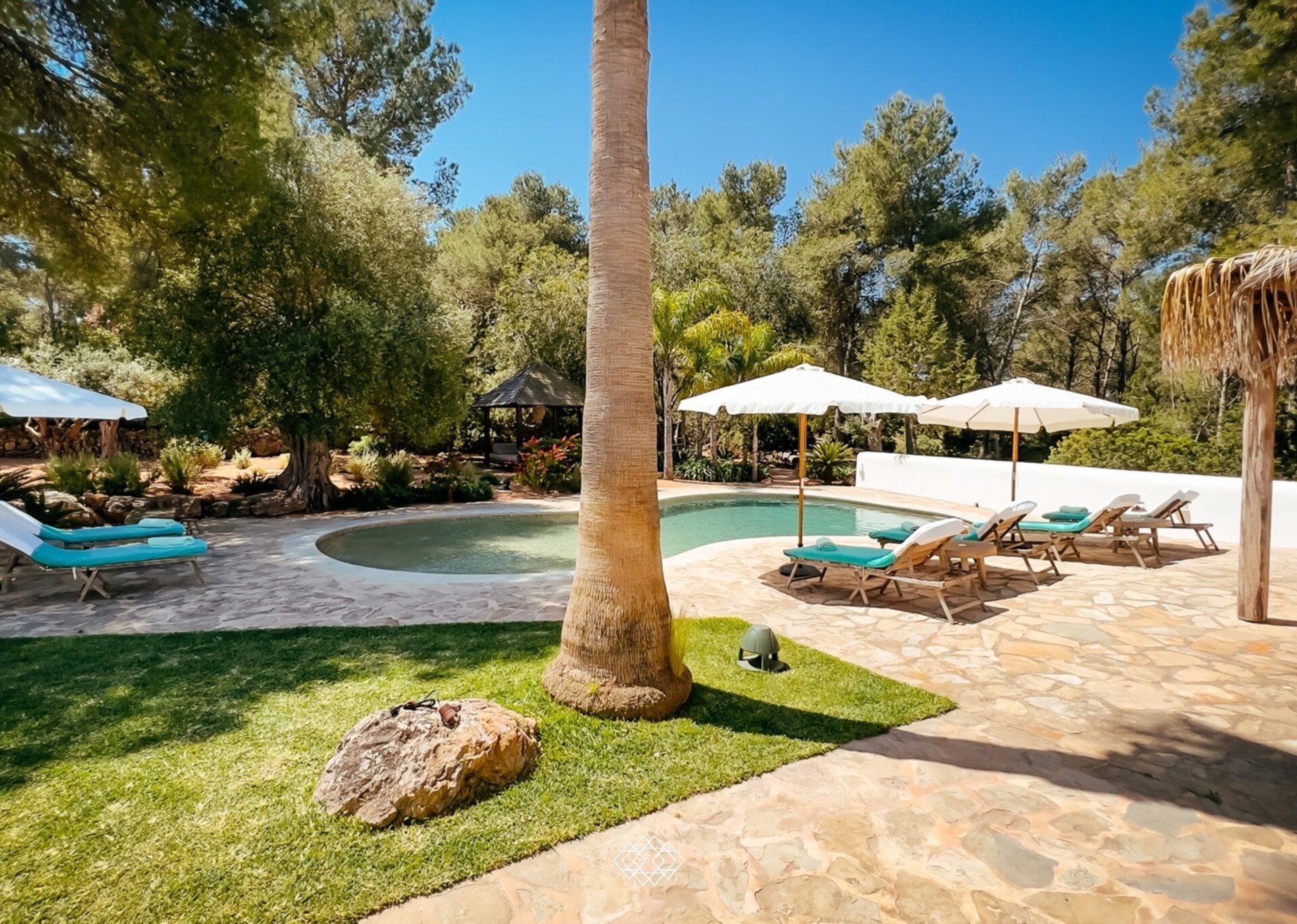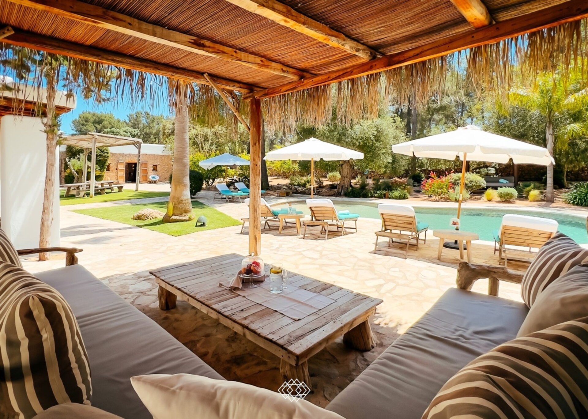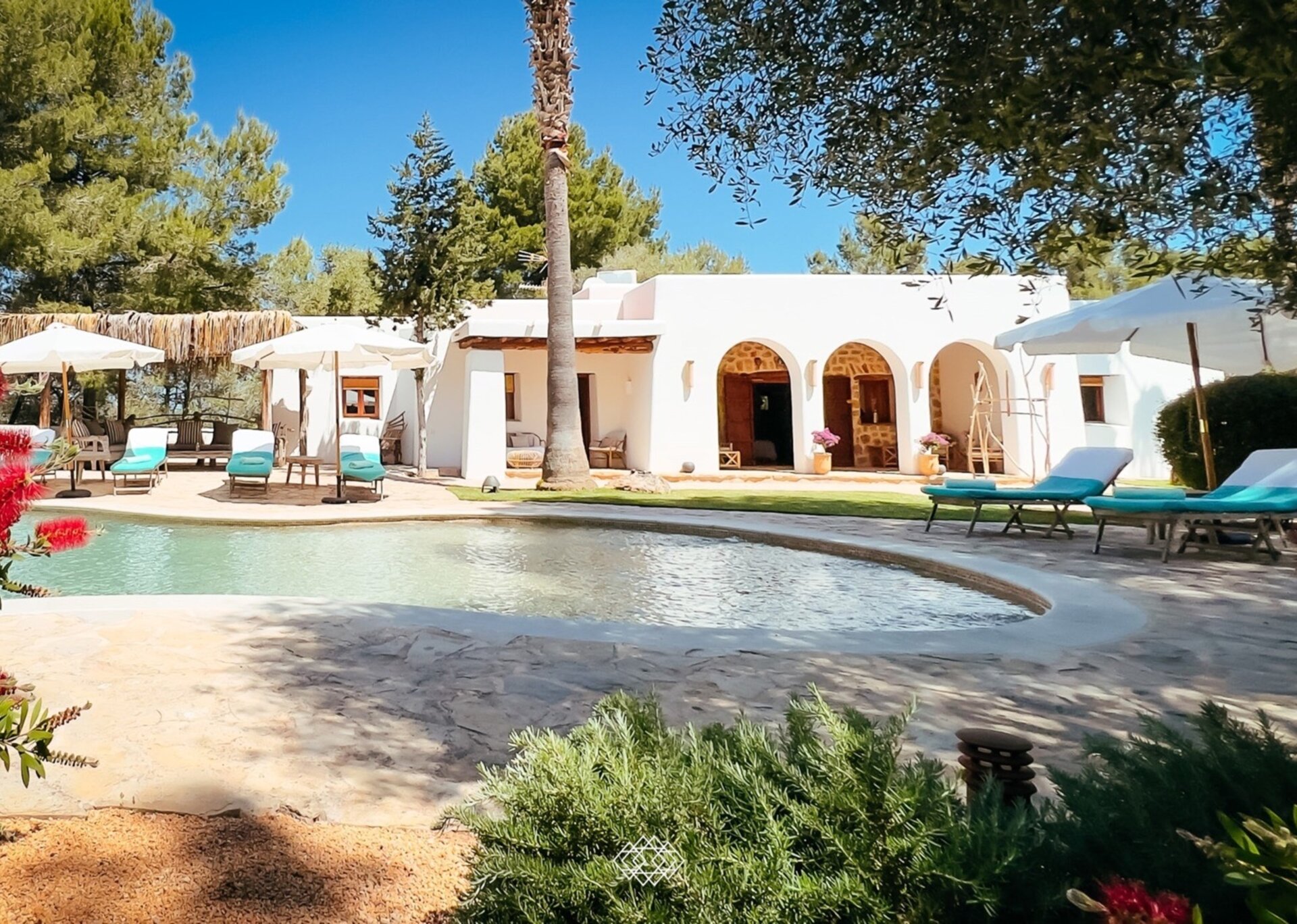 Nled amidst serene rolling hills and natural forests, just 2 km away from Santa Eulalia, lies a truly enchanting oasis. This idyllic retreat captivates with its abundant space, privacy, and tranquility. Upon passing through the entrance door, a brief drive of 50 meters brings you to two meticulously restored ibizencan fincas. Surrounded by a sprawling outdoor lounge area and a spacious pool, these fincas offer a harmonious blend of comfort and beauty. With 5 bedrooms, accommodating up to 12 guests, the architecture of the rooms allows for a flexible distribution, effortlessly catering to various types of guests - be it singles, couples, families, or groups.