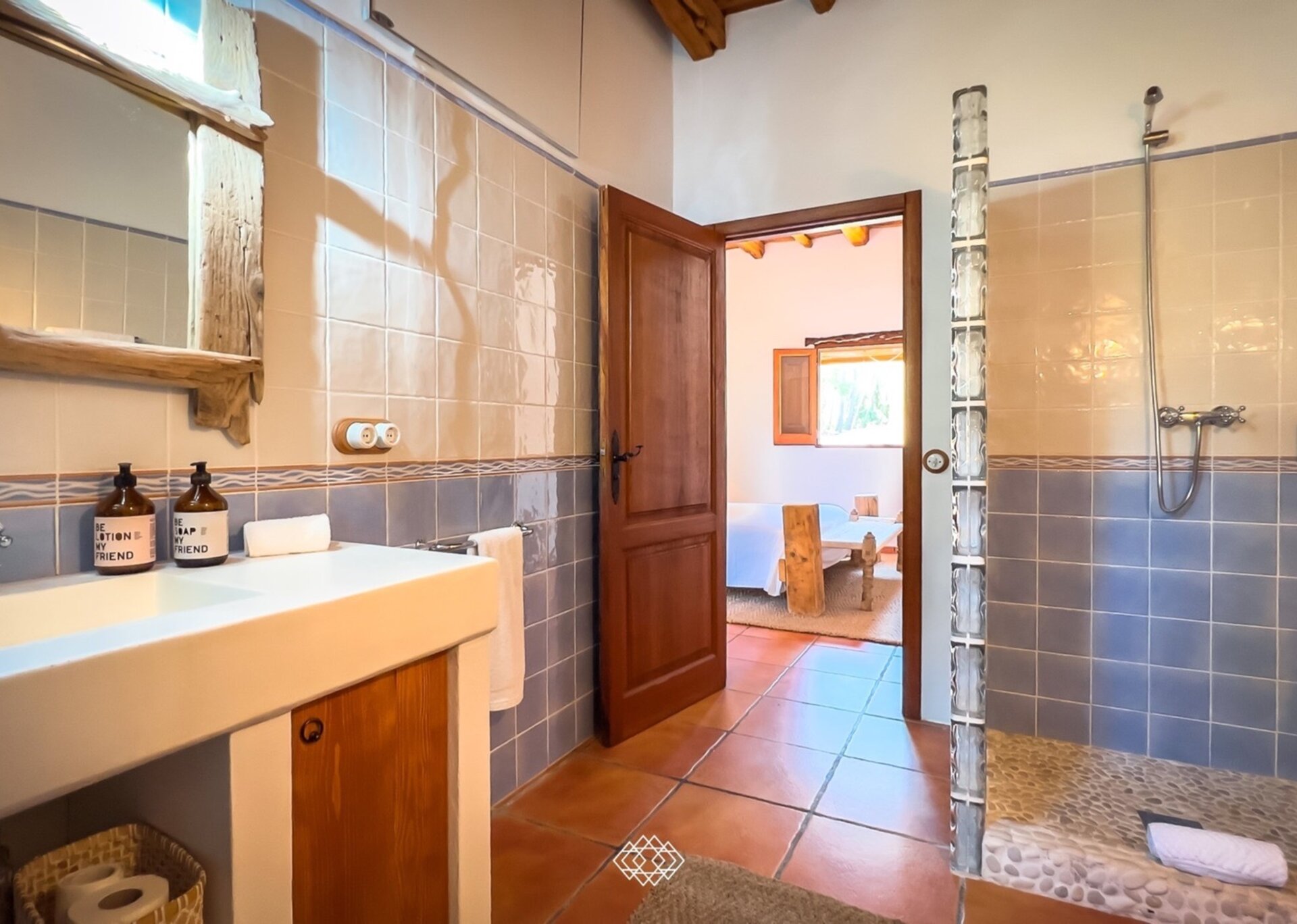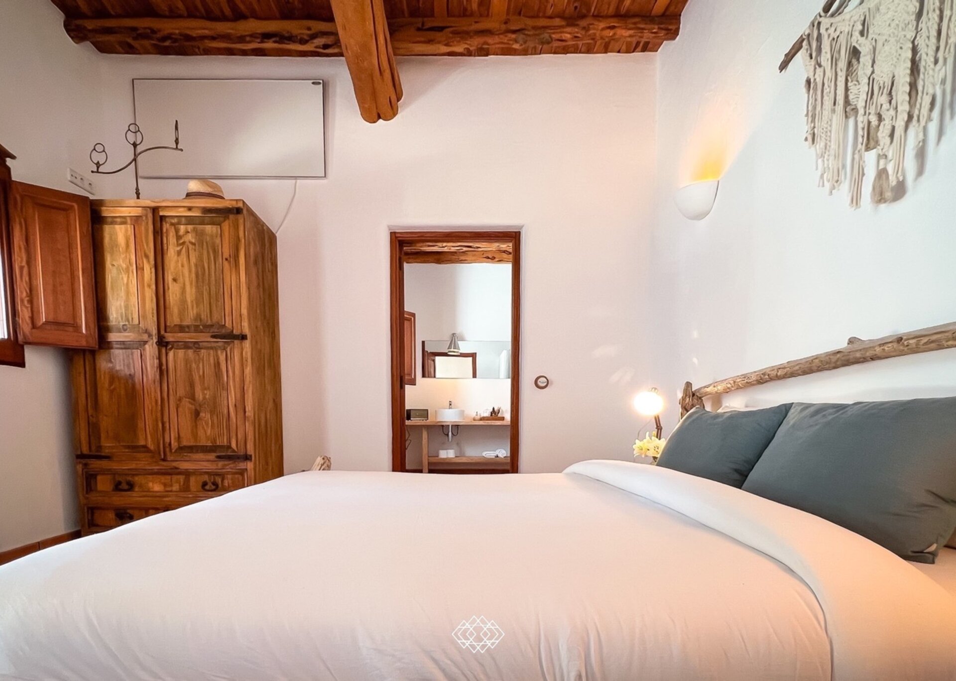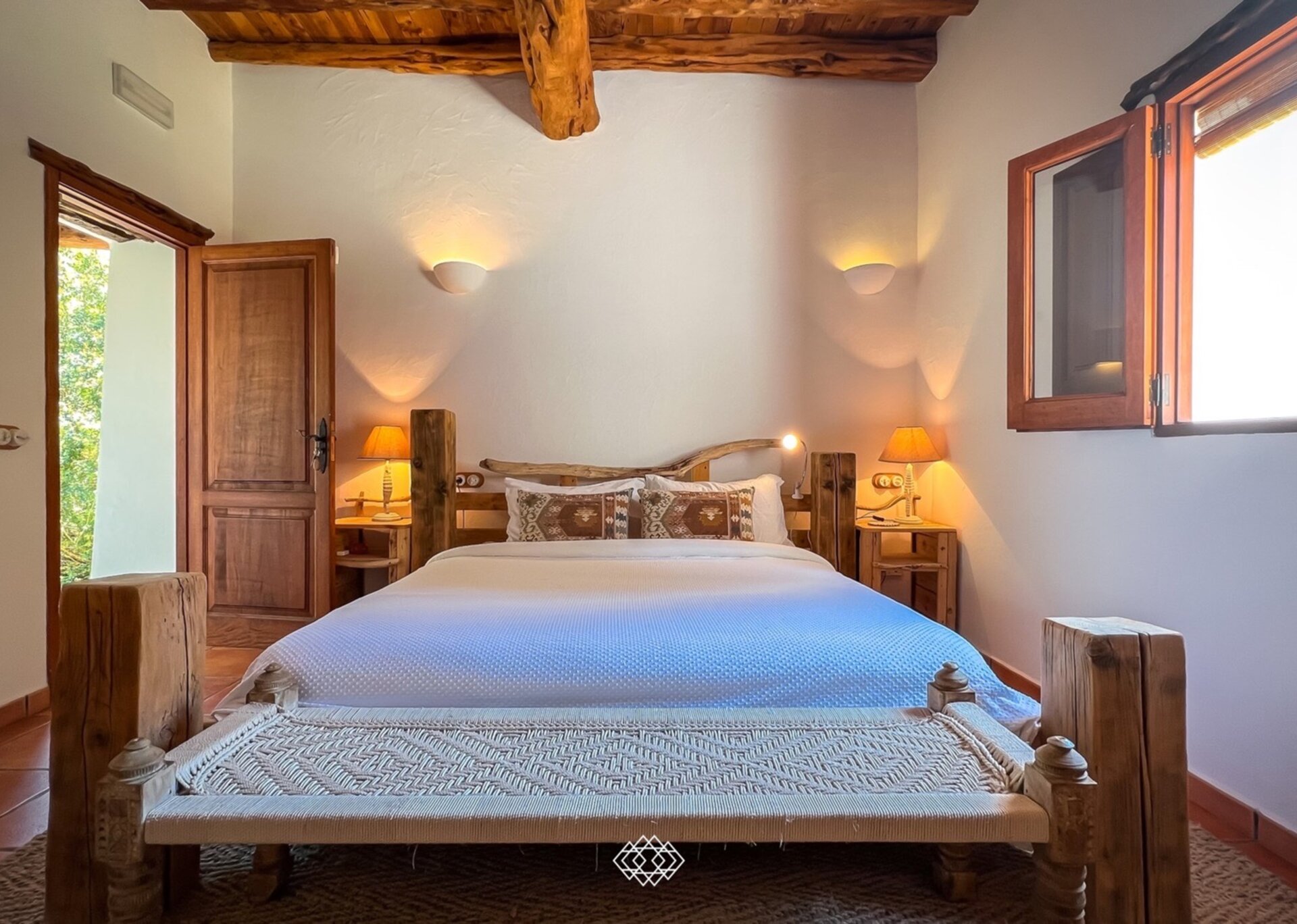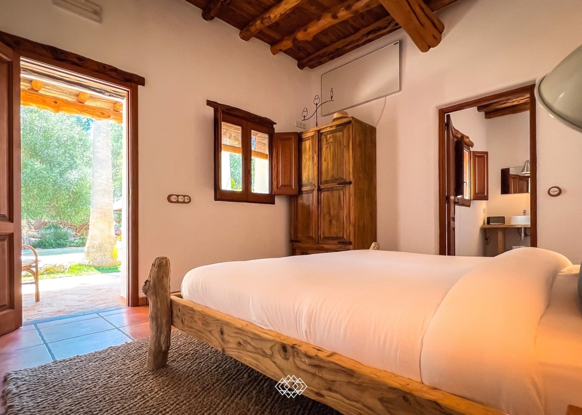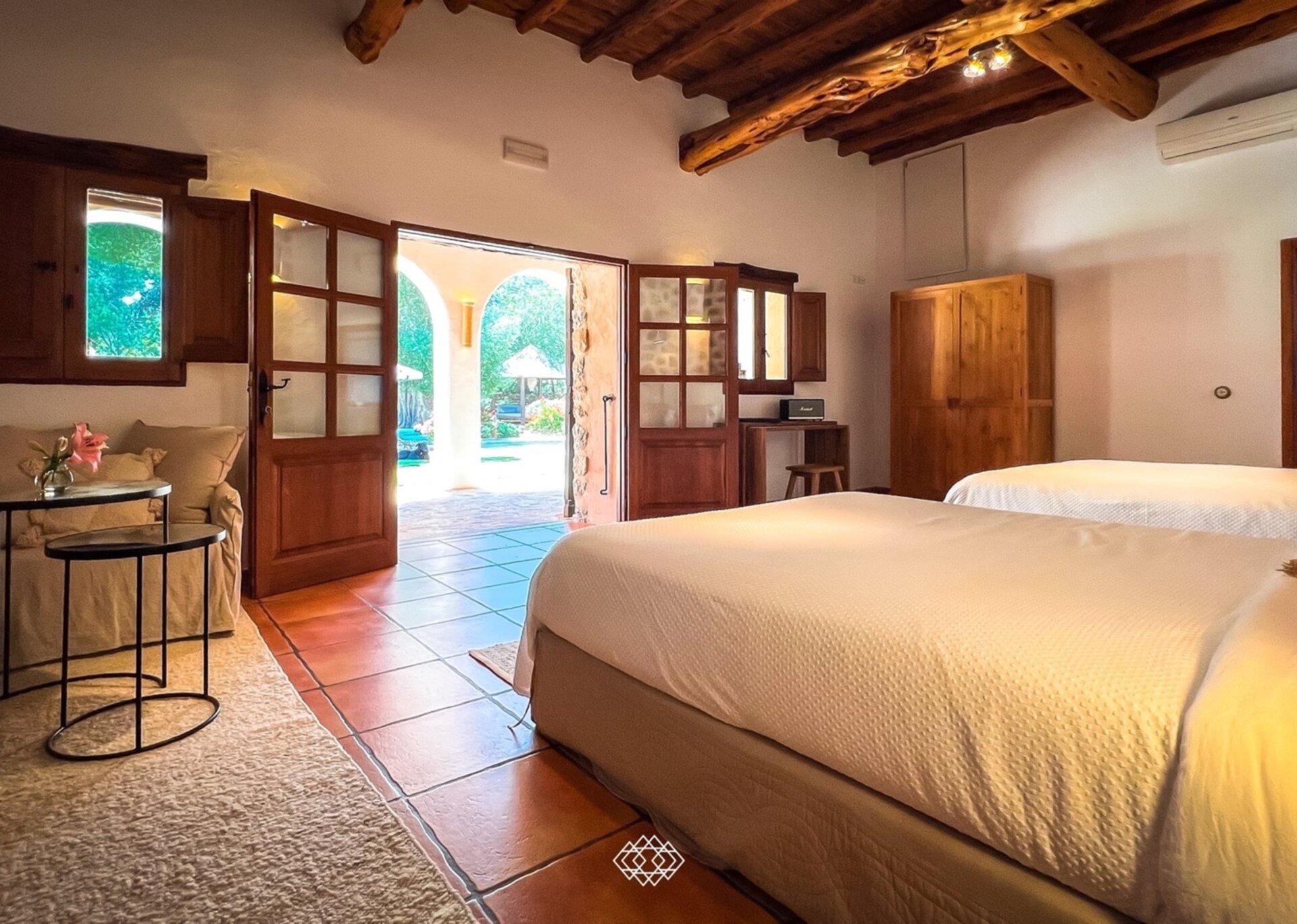 Among the bedrooms, three are elegantly designed as classic doubles, featuring ensuite bathrooms. The remaining two bedrooms are fashioned as cozy apartments, each capable of accommodating up to four individuals, complete with ensuite bathrooms, compact kitchens, and inviting living room spaces. Conveniently situated on the ground floor, each room boasts its own private entrance, providing maximum privacy and immediate access to the pool and lounge areas. These rooms artfully combine the allure of traditional ibizencan fincas - employing sturdy wooden materials, carefully curated furnishings, and retaining the essence of the rough stone structure - with modern amenities. Expect modern speaker systems, osmose freshwater systems, high-speed internet, and more, ensuring a comfortable and laid-back Ibiza experience.
