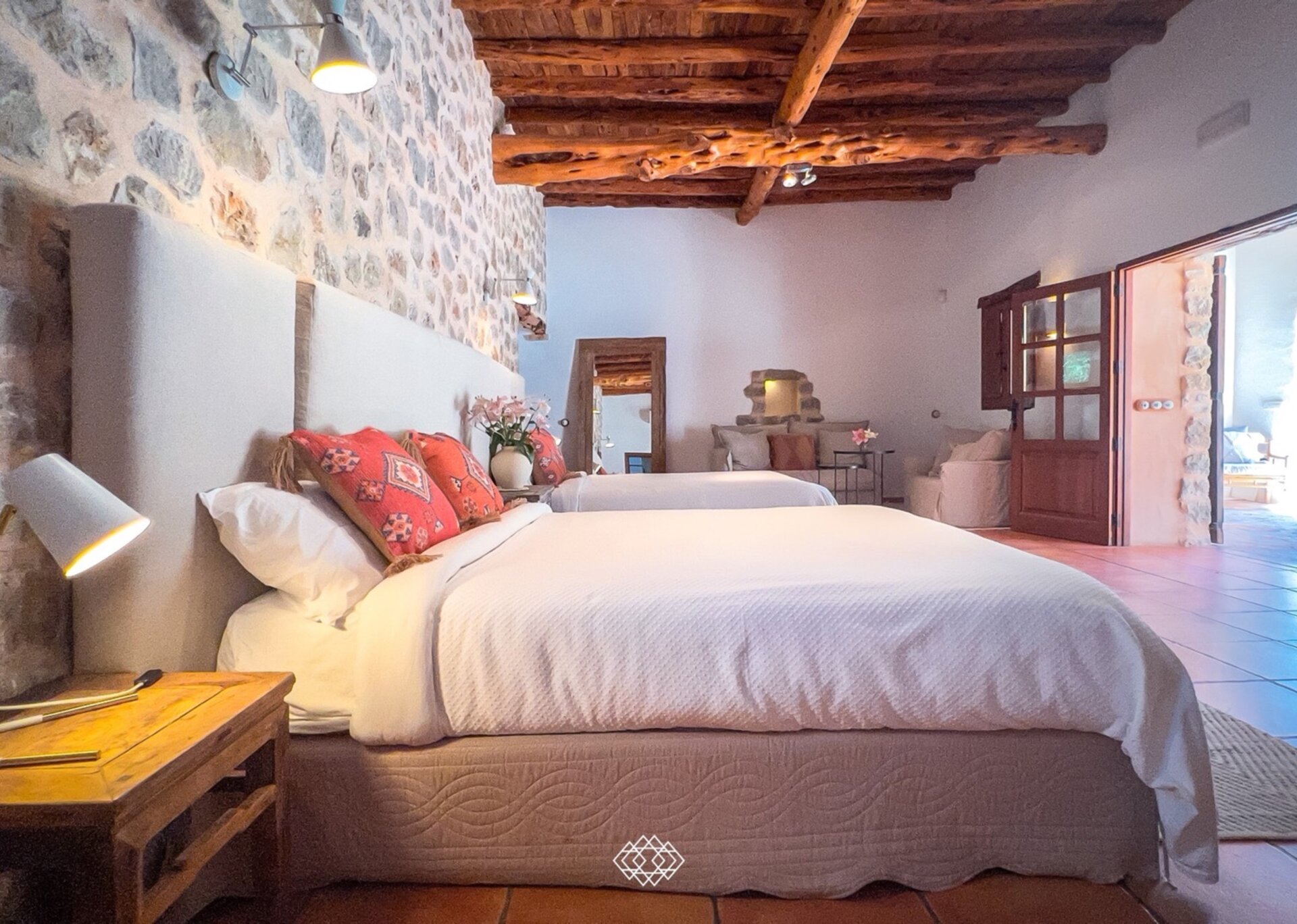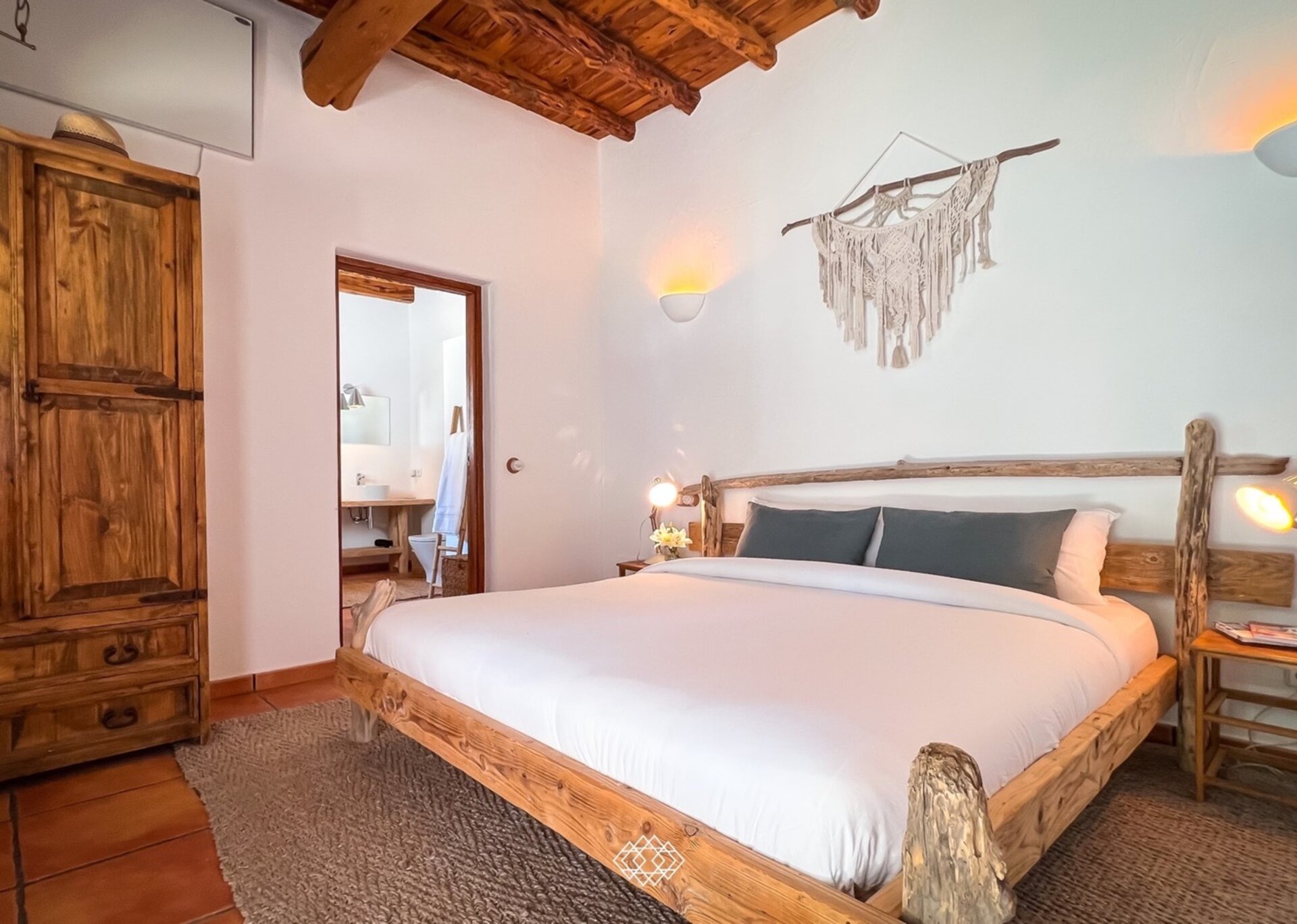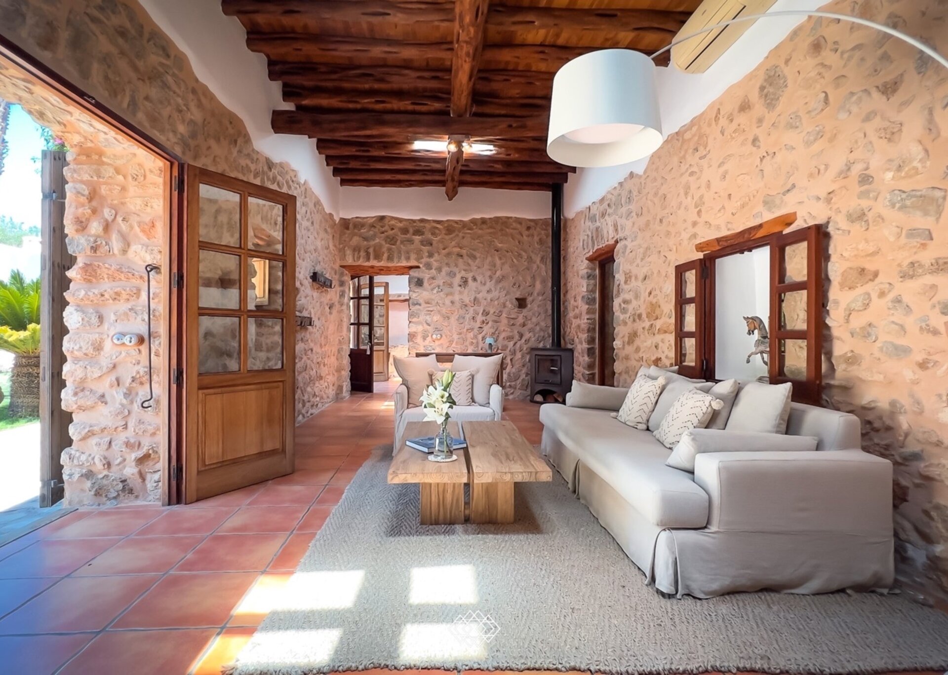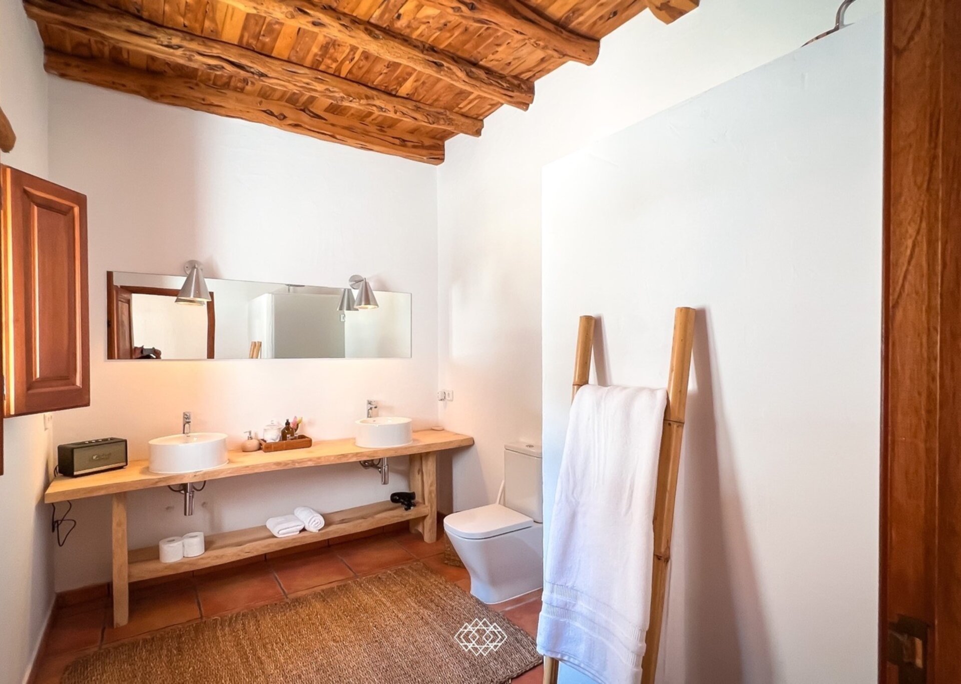 Among the bedrooms, three are elegantly designed as classic doubles, featuring ensuite bathrooms. The remaining two bedrooms are fashioned as cozy apartments, each capable of accommodating up to four individuals, complete with ensuite bathrooms, compact kitchens, and inviting living room spaces. Conveniently situated on the ground floor, each room boasts its own private entrance, providing maximum privacy and immediate access to the pool and lounge areas. These rooms artfully combine the allure of traditional ibizencan fincas - employing sturdy wooden materials, carefully curated furnishings, and retaining the essence of the rough stone structure - with modern amenities. Expect modern speaker systems, osmose freshwater systems, high-speed internet, and more, ensuring a comfortable and laid-back Ibiza experience.