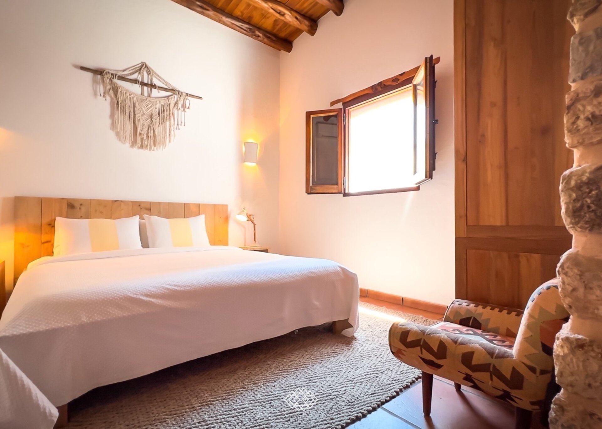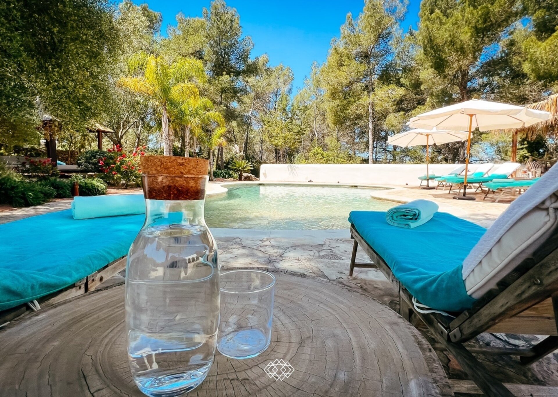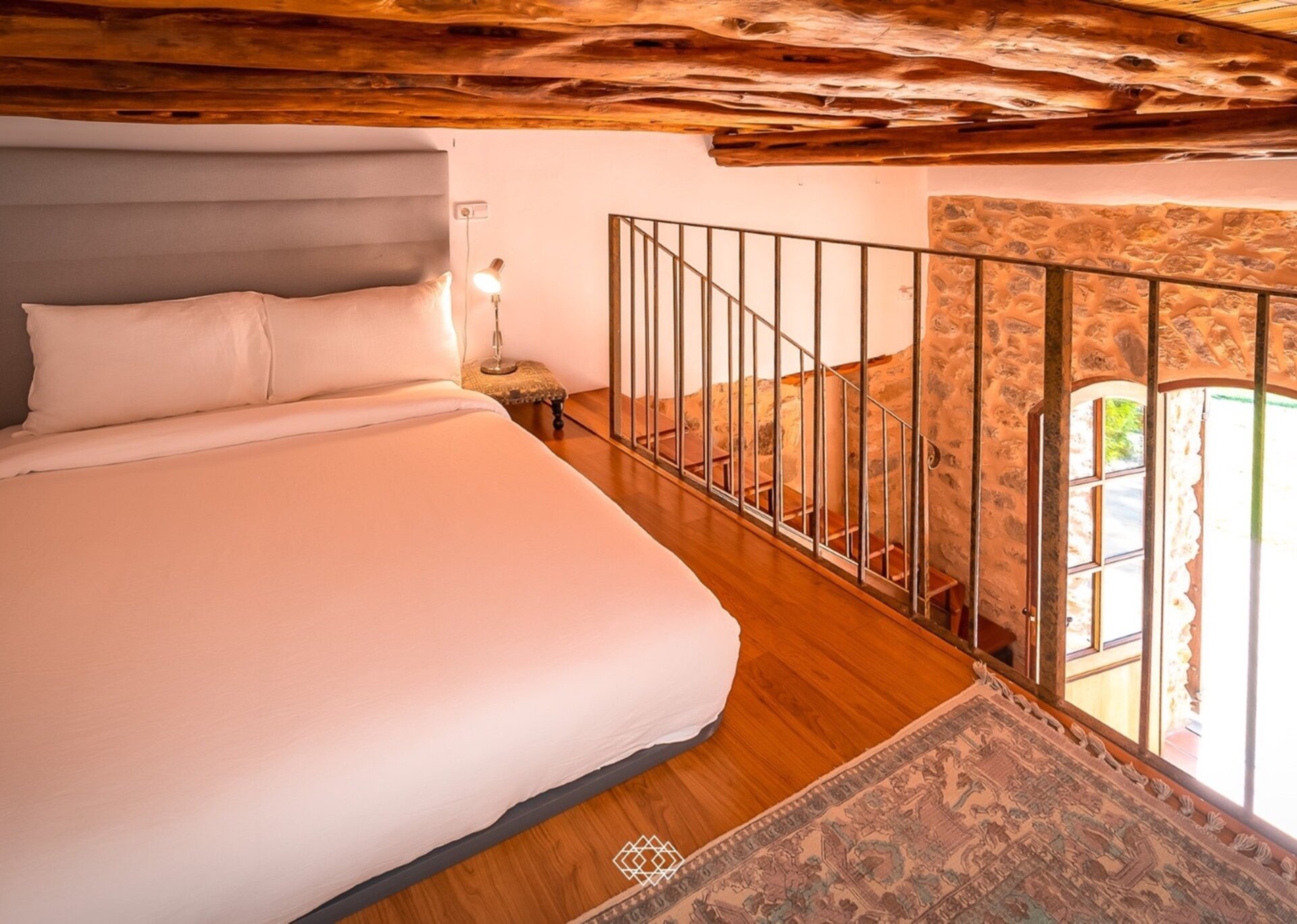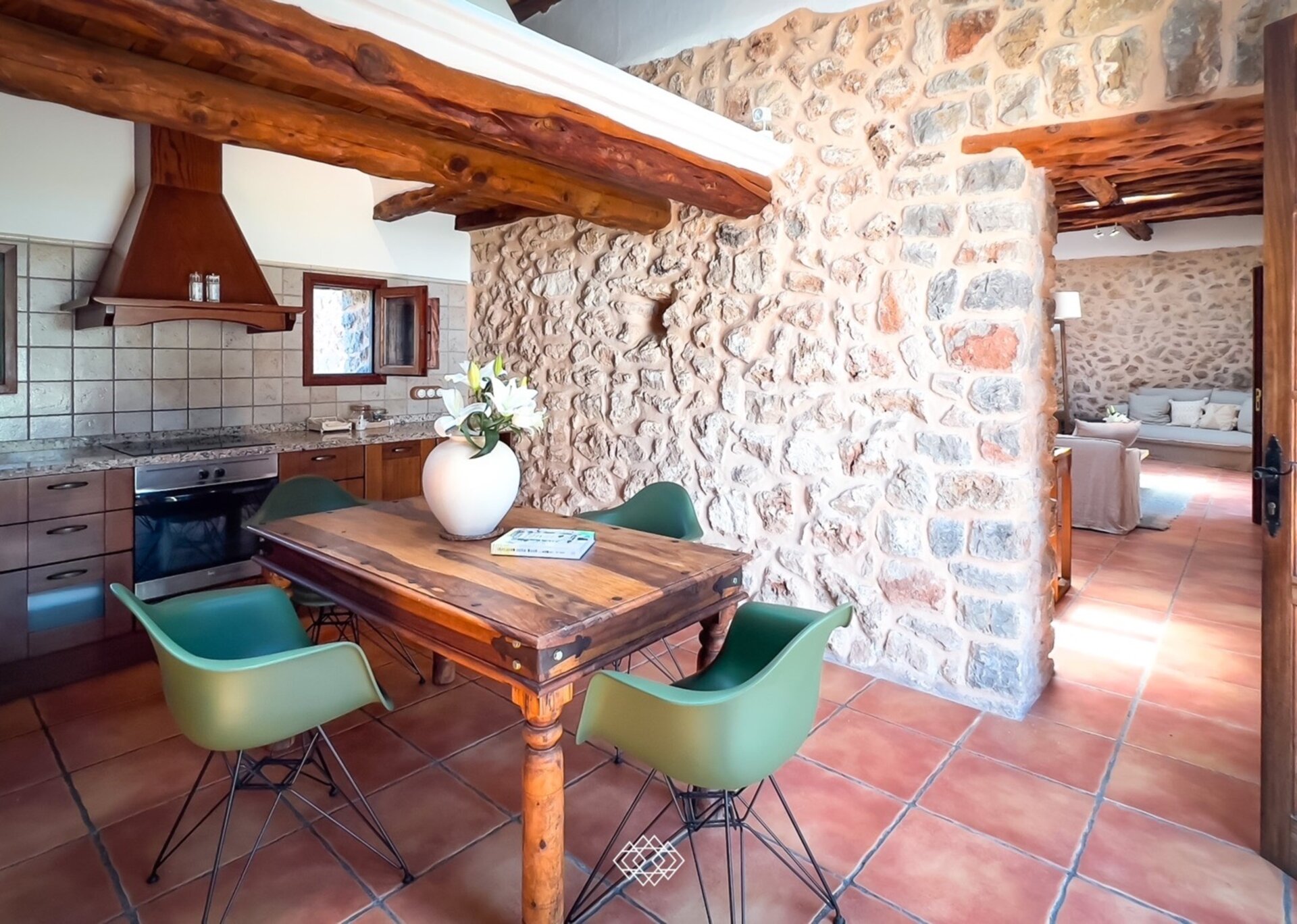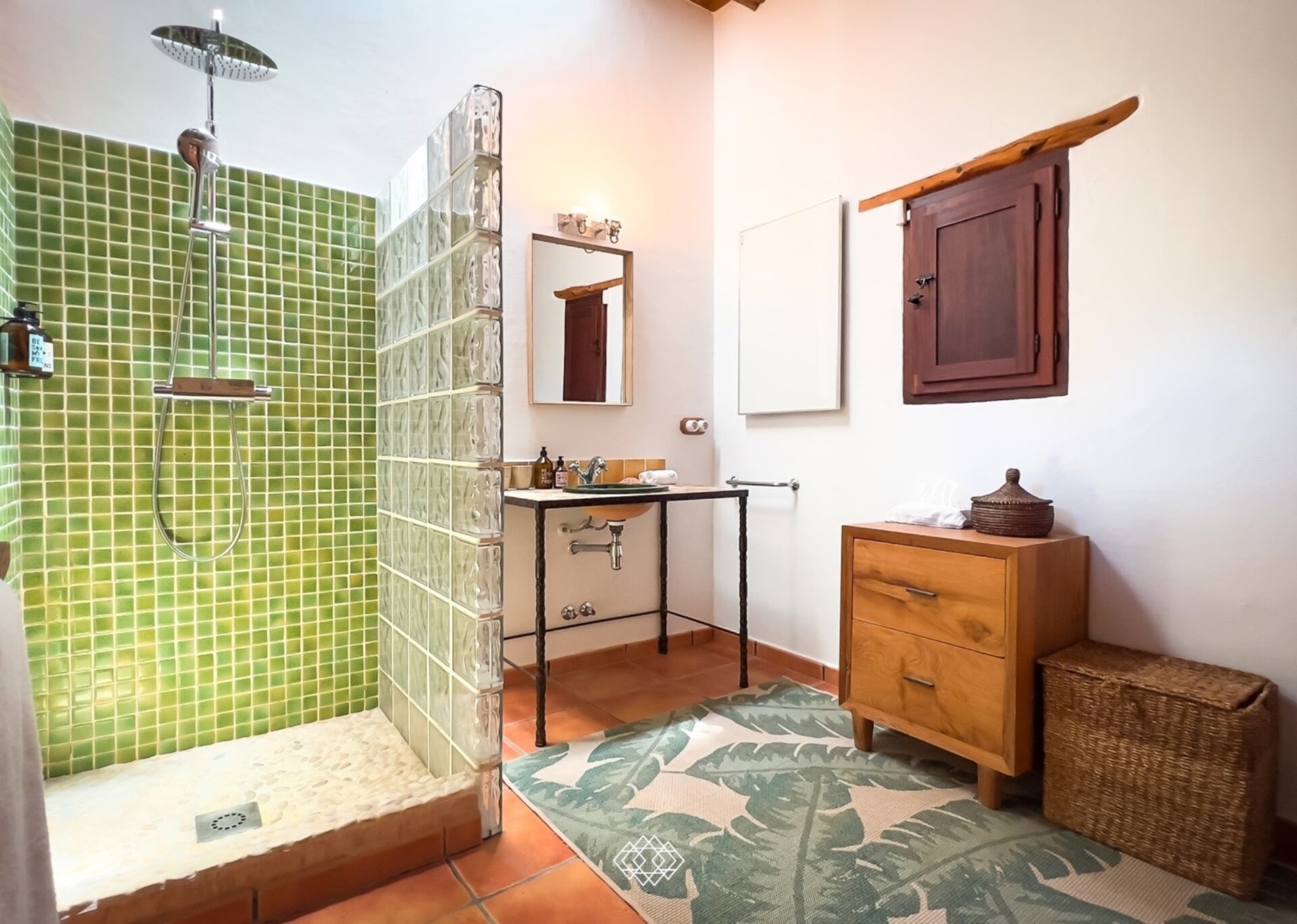 Among the bedrooms, three are elegantly designed as classic doubles, featuring ensuite bathrooms. The remaining two bedrooms are fashioned as cozy apartments, each capable of accommodating up to four individuals, complete with ensuite bathrooms, compact kitchens, and inviting living room spaces. Conveniently situated on the ground floor, each room boasts its own private entrance, providing maximum privacy and immediate access to the pool and lounge areas. These rooms artfully combine the allure of traditional ibizencan fincas - employing sturdy wooden materials, carefully curated furnishings, and retaining the essence of the rough stone structure - with modern amenities. Expect modern speaker systems, osmose freshwater systems, high-speed internet, and more, ensuring a comfortable and laid-back Ibiza experience.