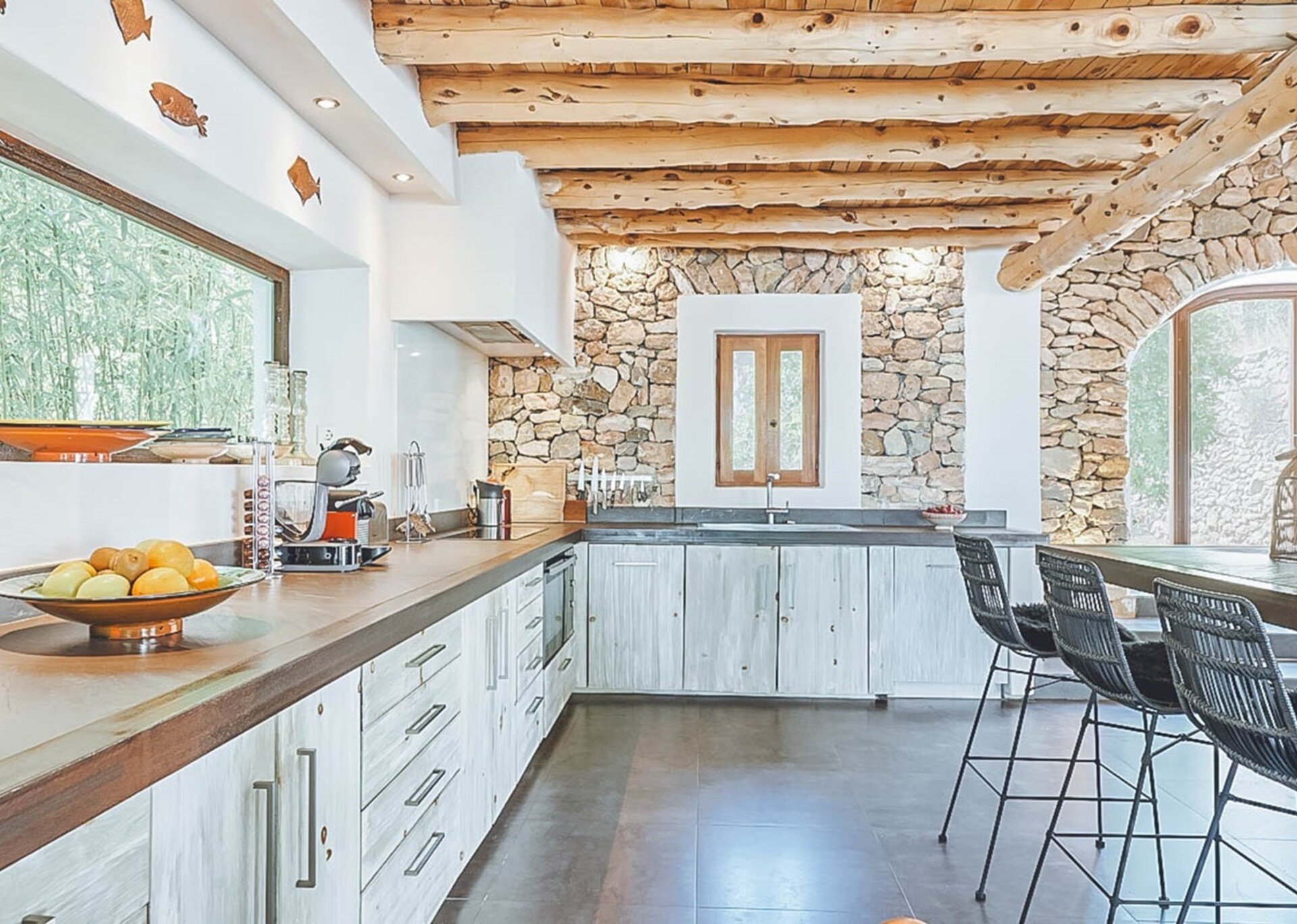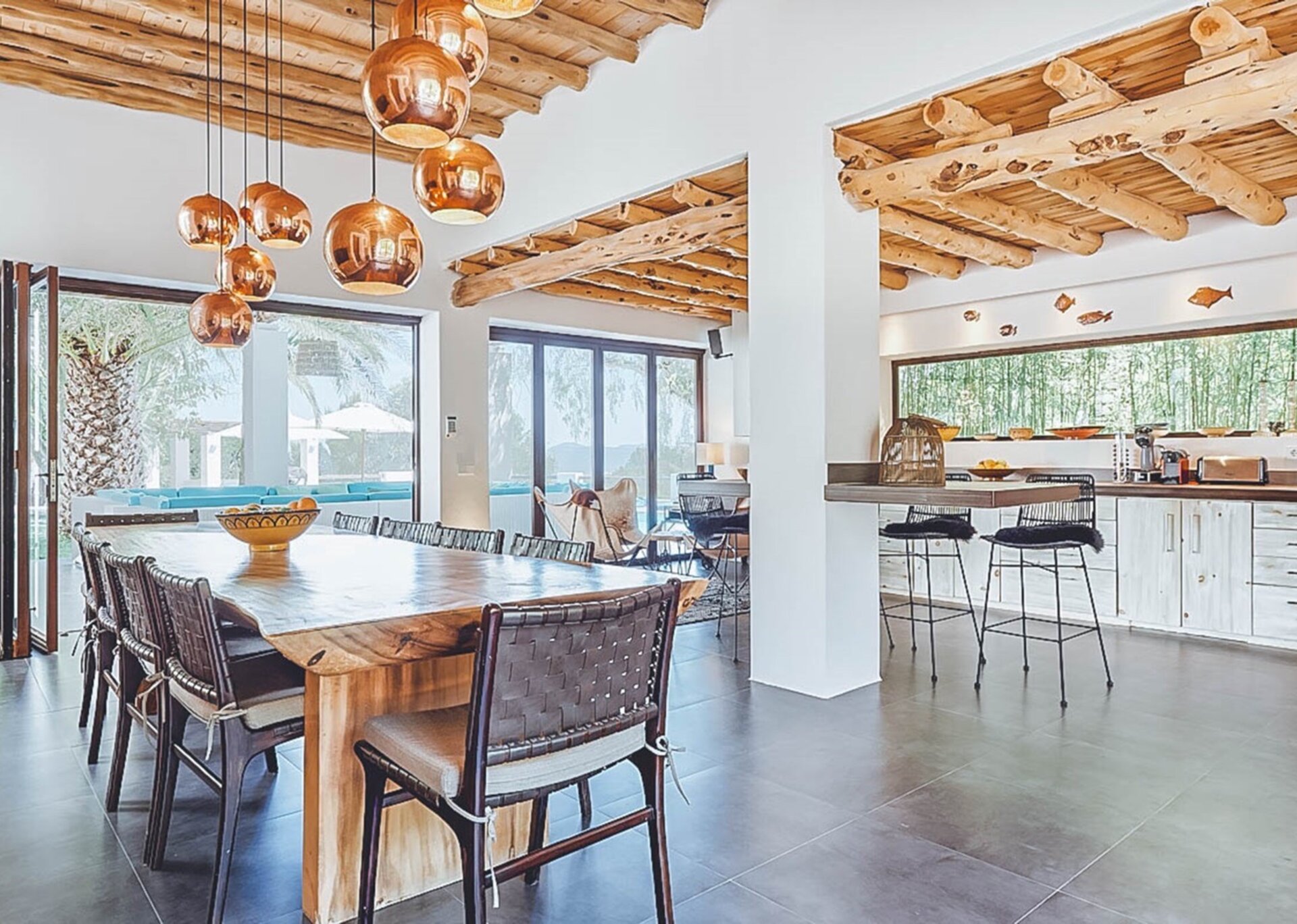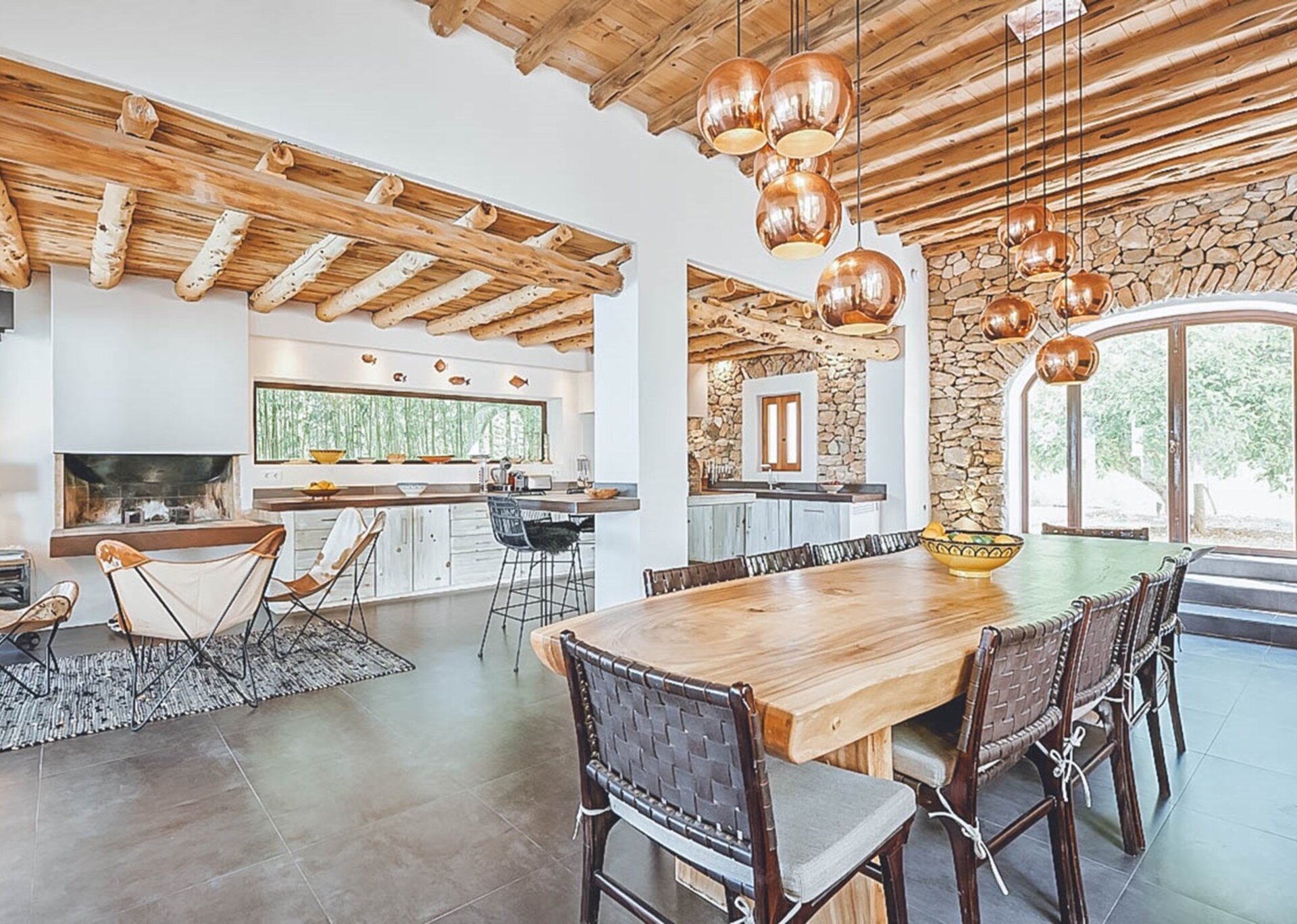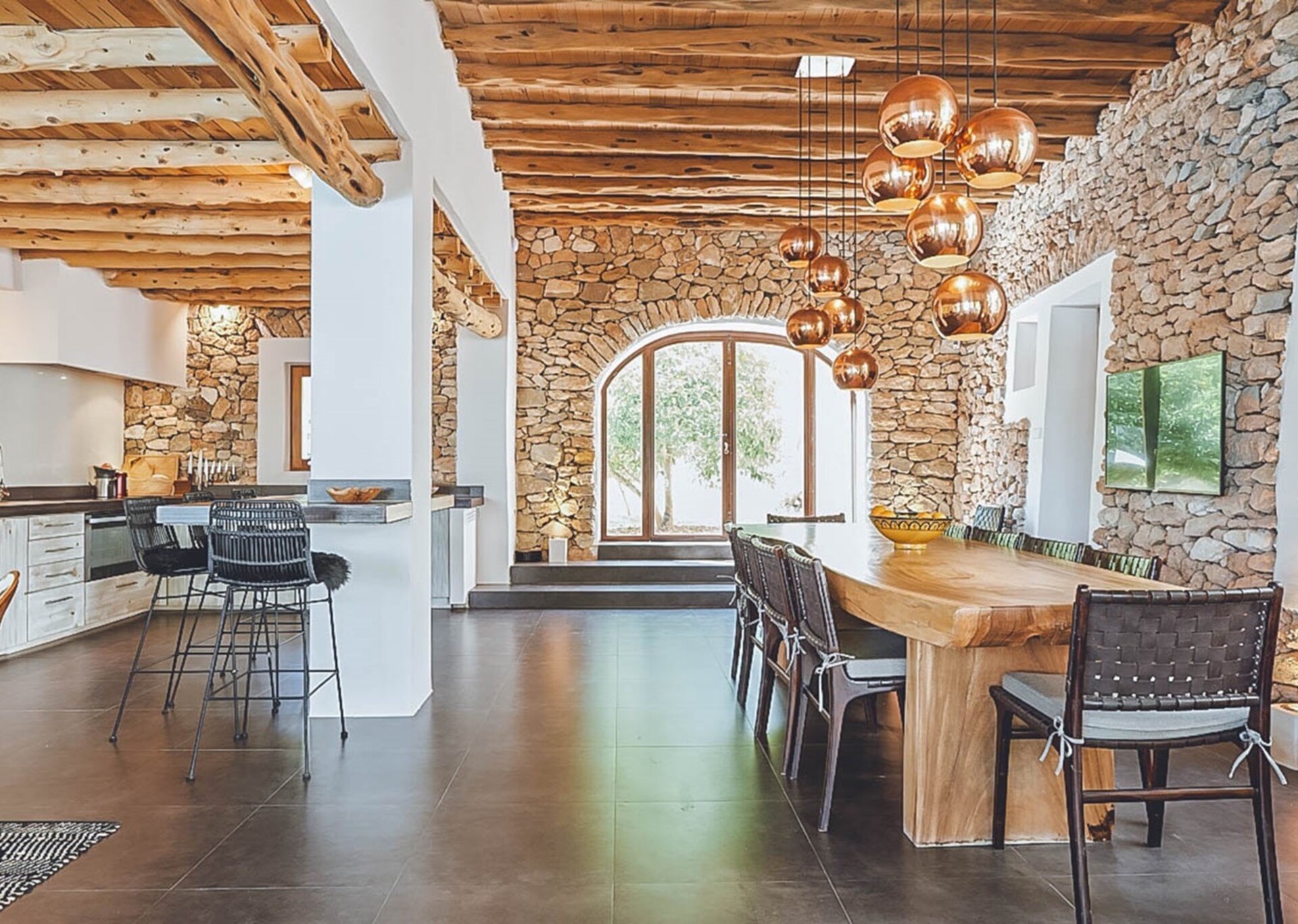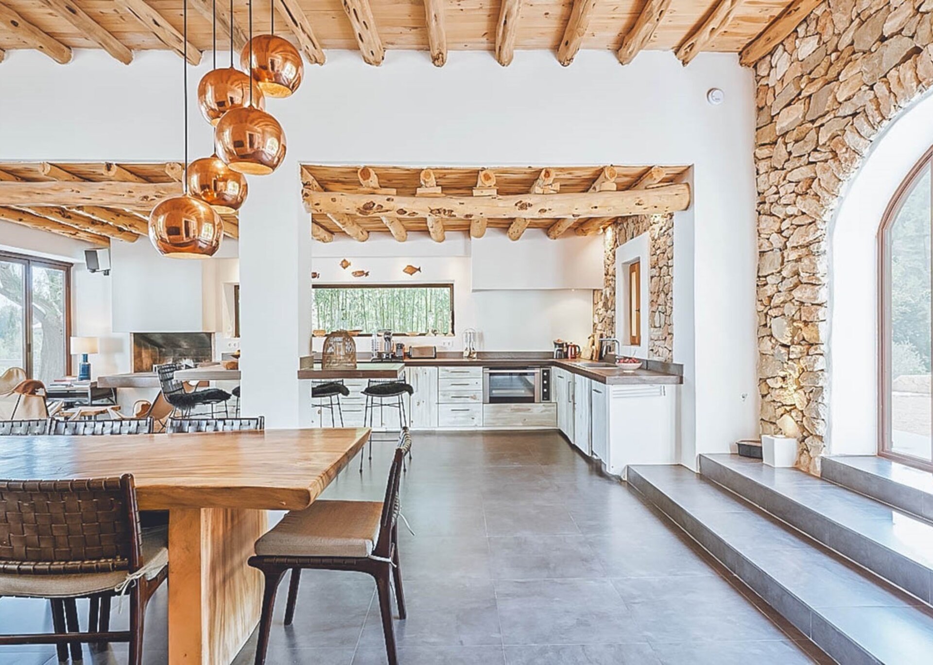 Inside, Jasper exudes the traditional 'Ibicenco' style, showcasing floor-to-ceiling stone masonry walls and wooden beamed ceilings flawlessly blended with contemporary finishes in brilliant white and modern decor. The villa features a cozy lounge area with a spacious and comfortable sofa, various dining spaces, and a sleek, fully equipped modern kitchen complete with a breakfast bar and all the state-of-the-art appliances you would expect from a property of this caliber. Stylish contemporary lighting, artwork, and furniture effortlessly harmonize the traditional design with modern sophistication.