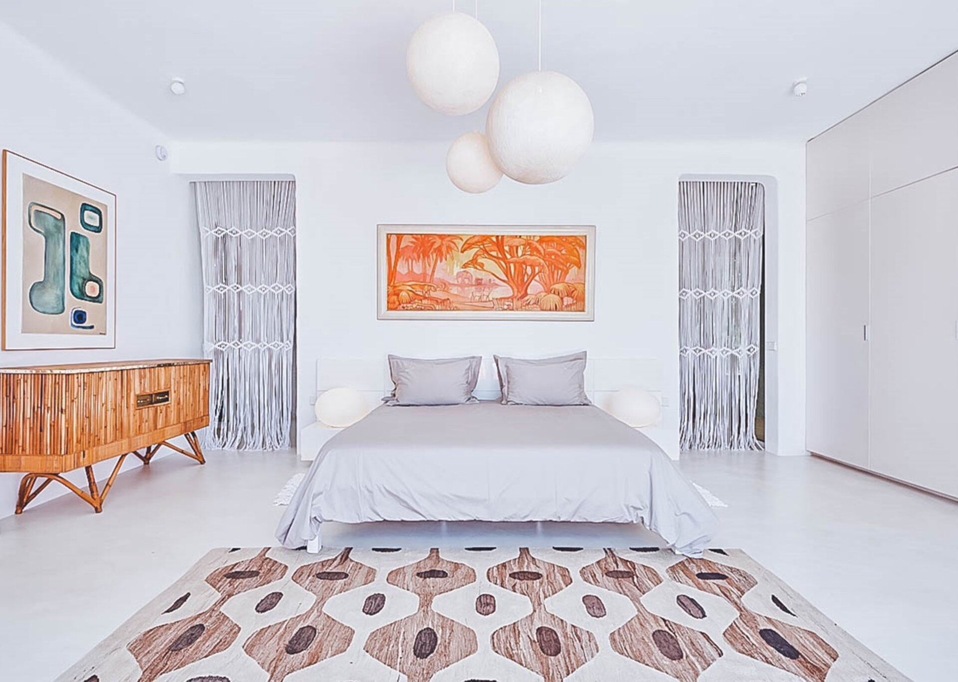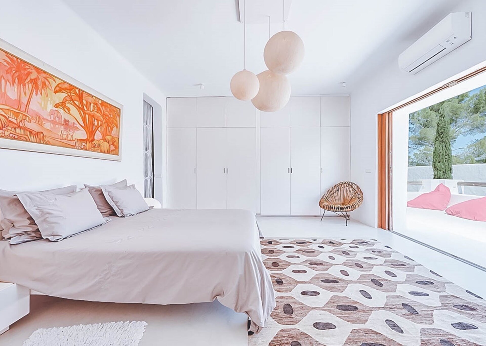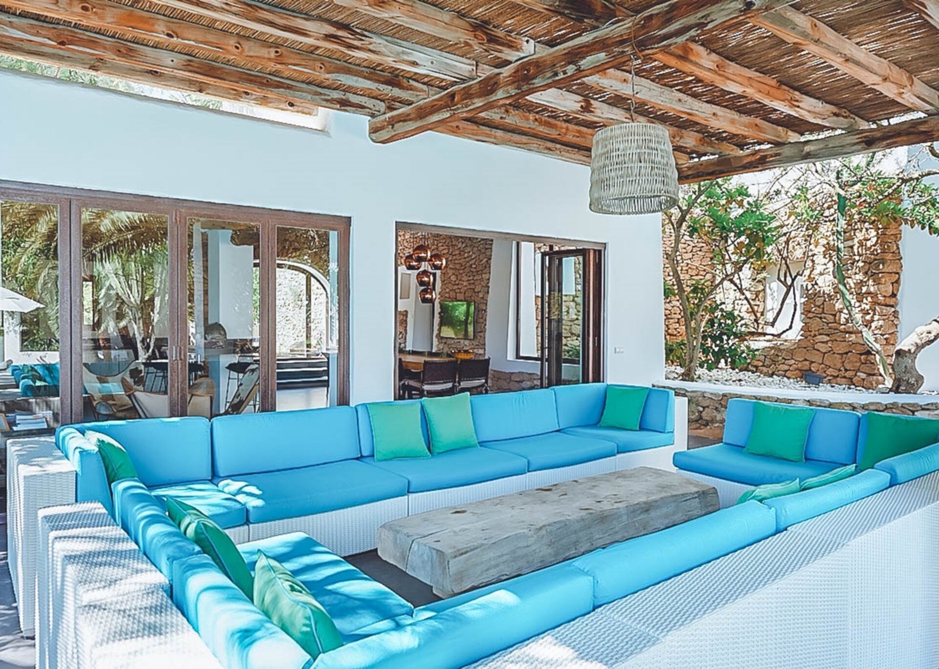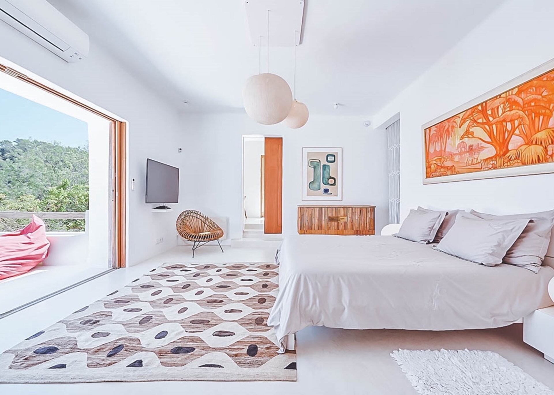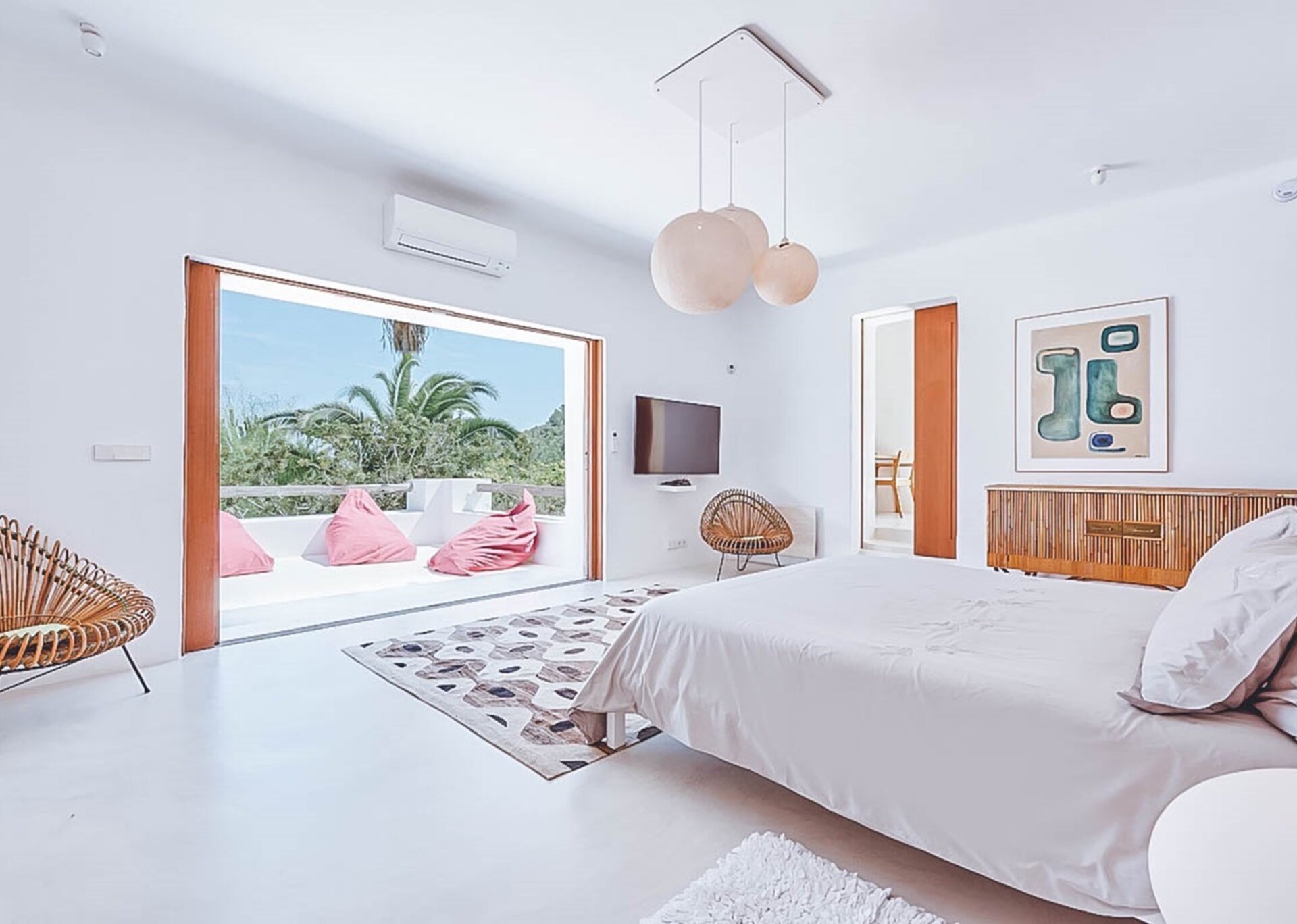 Inside, Jasper exudes the traditional 'Ibicenco' style, showcasing floor-to-ceiling stone masonry walls and wooden beamed ceilings flawlessly blended with contemporary finishes in brilliant white and modern decor. The villa features a cozy lounge area with a spacious and comfortable sofa, various dining spaces, and a sleek, fully equipped modern kitchen complete with a breakfast bar and all the state-of-the-art appliances you would expect from a property of this caliber. Stylish contemporary lighting, artwork, and furniture effortlessly harmonize the traditional design with modern sophistication.