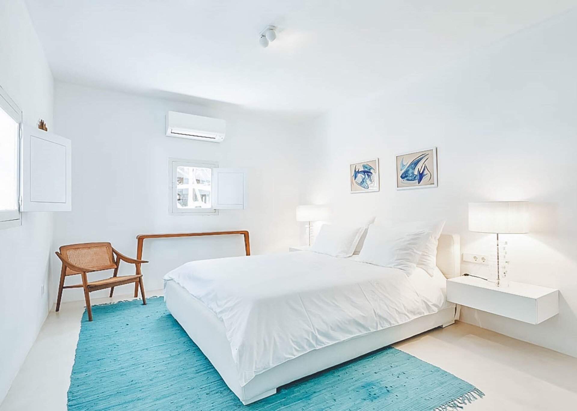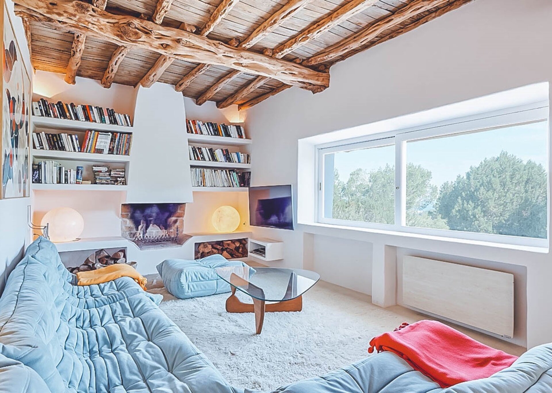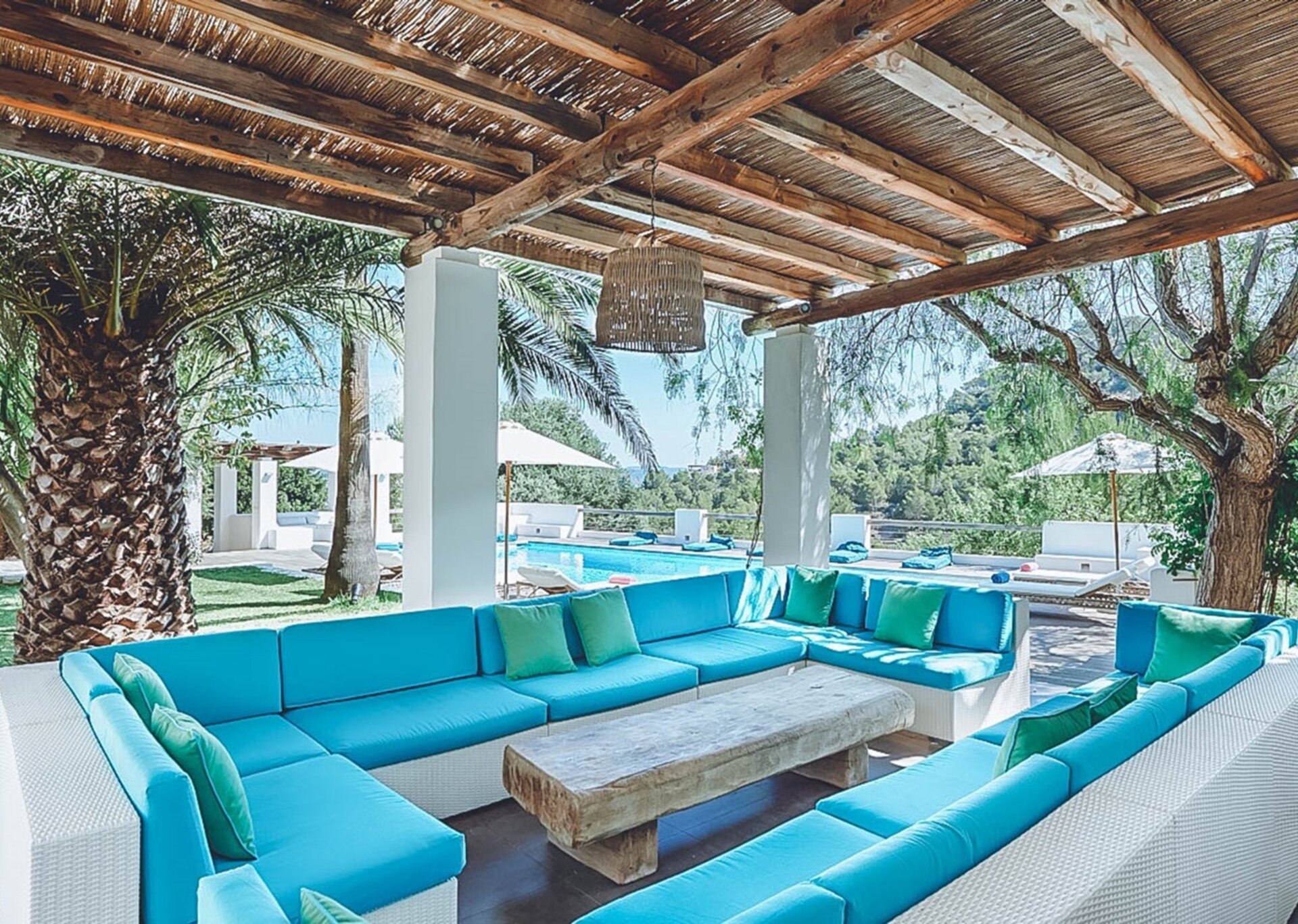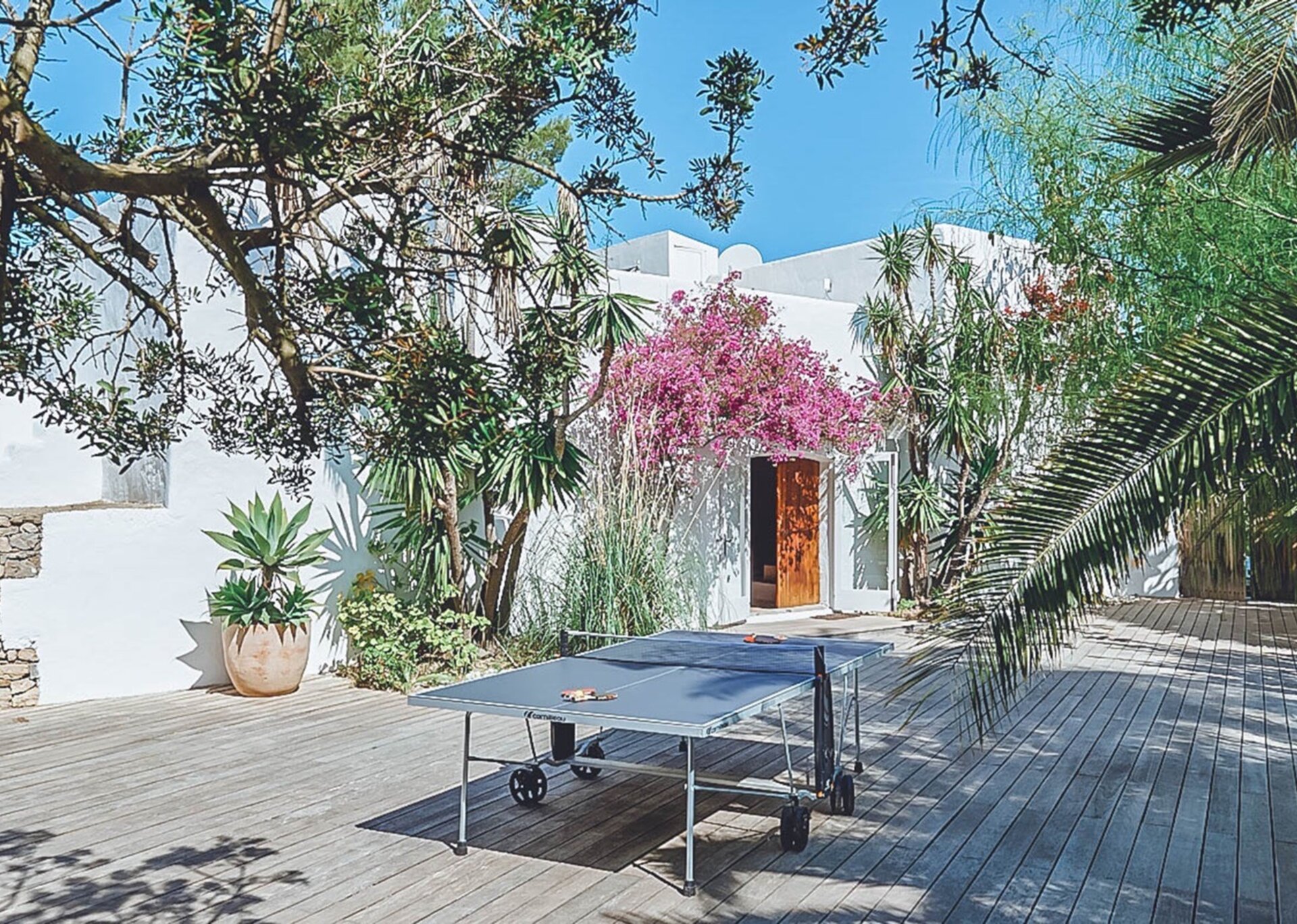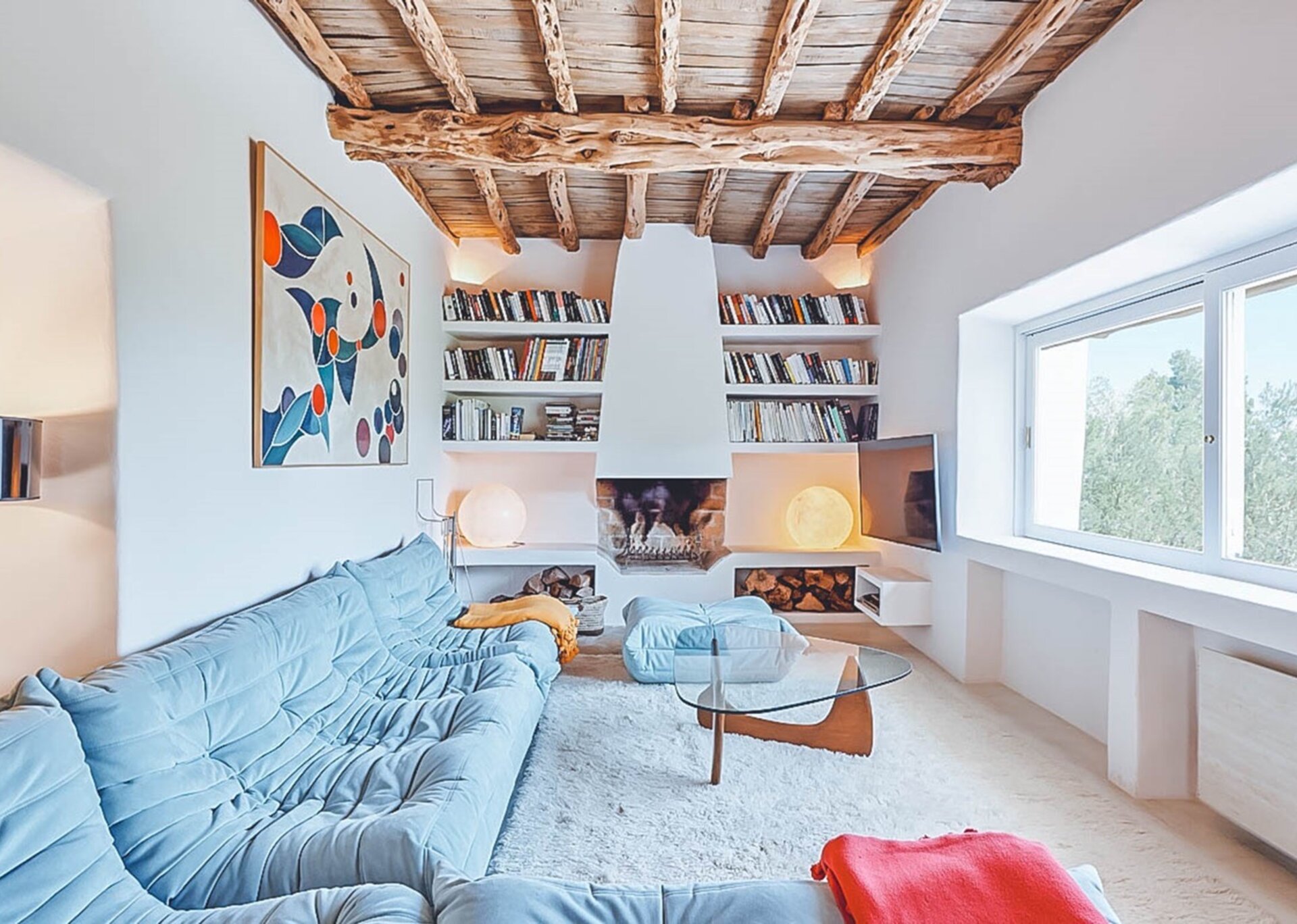 Inside, Jasper exudes the traditional 'Ibicenco' style, showcasing floor-to-ceiling stone masonry walls and wooden beamed ceilings flawlessly blended with contemporary finishes in brilliant white and modern decor. The villa features a cozy lounge area with a spacious and comfortable sofa, various dining spaces, and a sleek, fully equipped modern kitchen complete with a breakfast bar and all the state-of-the-art appliances you would expect from a property of this caliber. Stylish contemporary lighting, artwork, and furniture effortlessly harmonize the traditional design with modern sophistication.