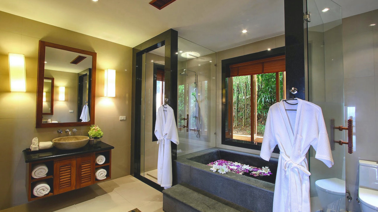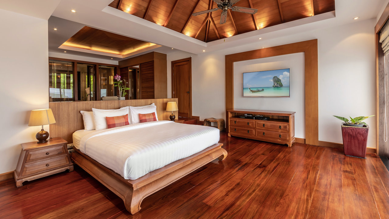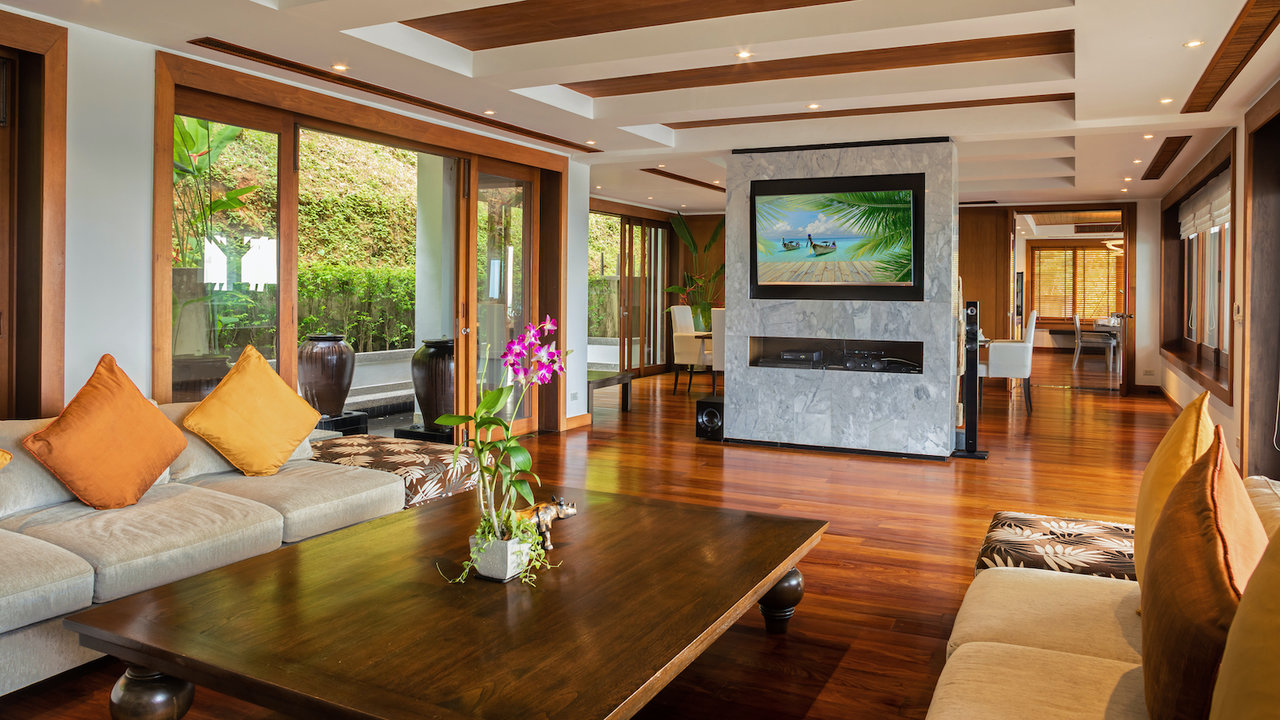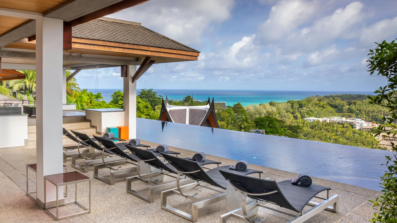 This tall luxurious villa also has a spacious and open reception that offers sufficient space and perfect flow. It also features an entertainment area, a Thai Sala which is excellent for massage treatments and an outdoor bar reception. The indoor and outdoor spaces meant for entertainment and relaxation is created in such a way that they blend harmoniously with a formal lounge located indoors and a dining area. The living quarters is connected to the kitchen and dining areas. The kitchen located near the outdoor dining/living area is fully equipped and has the capacity of accommodating up to 12 guests. The outdoor living space offers seating for ten guests and beautiful large panoramic views. Other than the four expansive suites, the fifth bedroom can be used as a cinema fitted with an LCD projector and a big screen which makes it perfect for watching movies with a group.