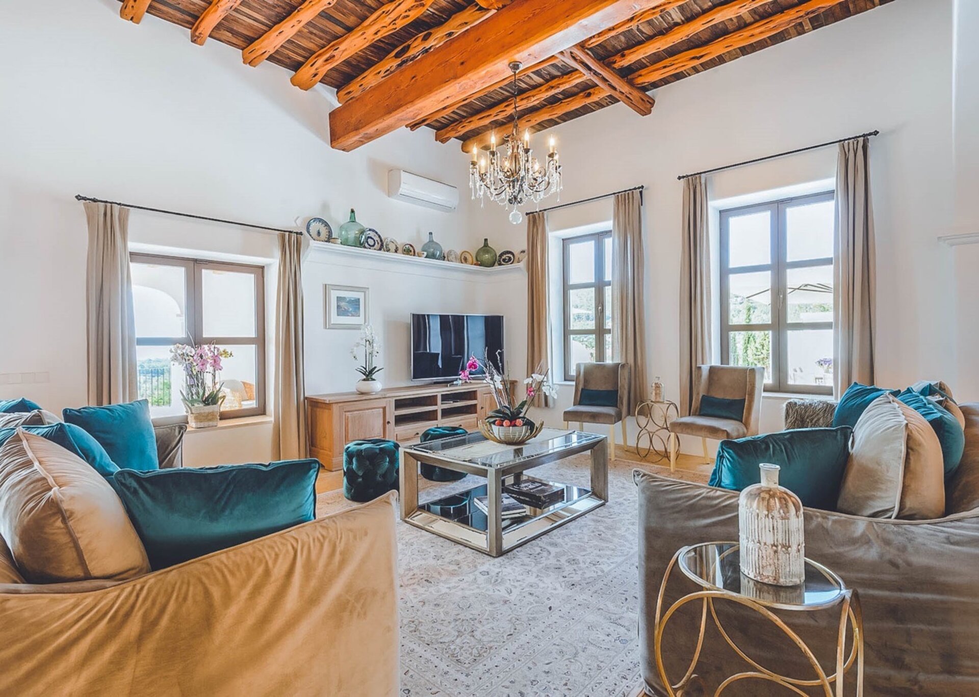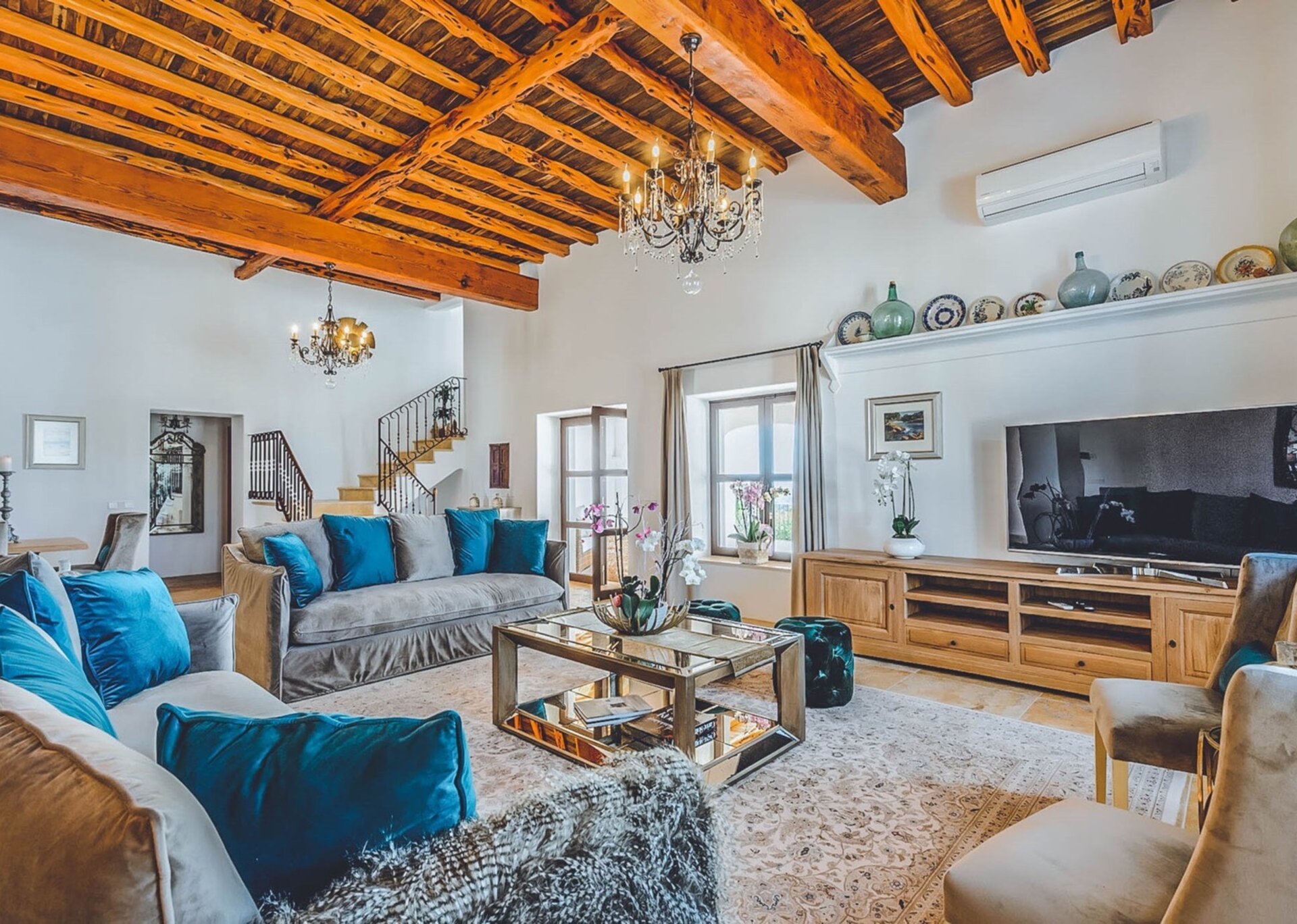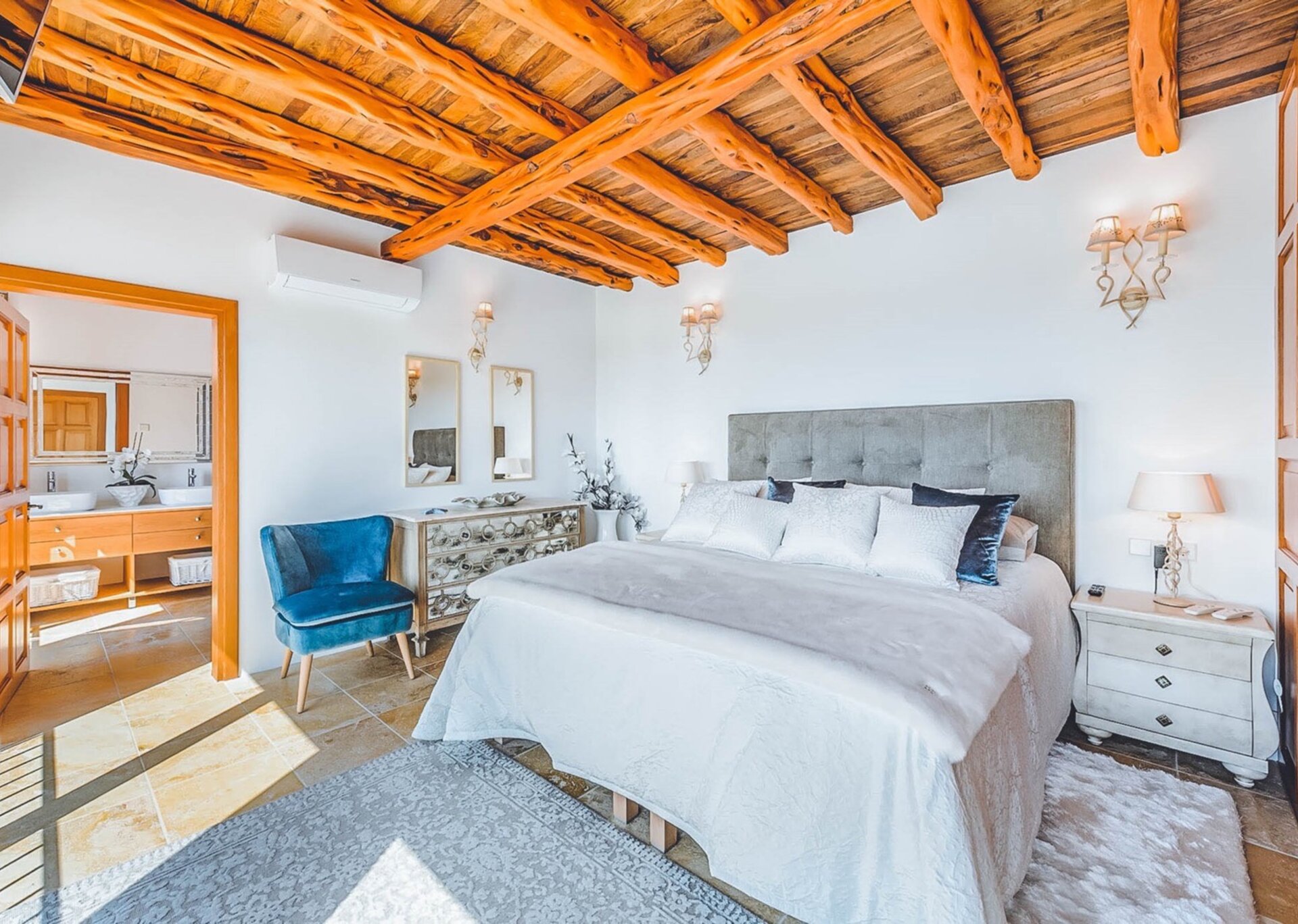 This immaculately designed property boasts a clean and elegant aesthetic, featuring a stylish living room adorned with high-end furnishings. The fully equipped modern kitchen offers top-quality appliances, complemented by minimalist decor and authentic wooden beamed ceilings, lending a touch of traditional charm. Each of the six bedrooms boasts a king-sized bed and en-suite bath and shower, showcasing exceptional standards of decoration with their unique styles and charm. A separate annex serves as the sixth bedroom, offering added privacy with its mini fridge and private access.