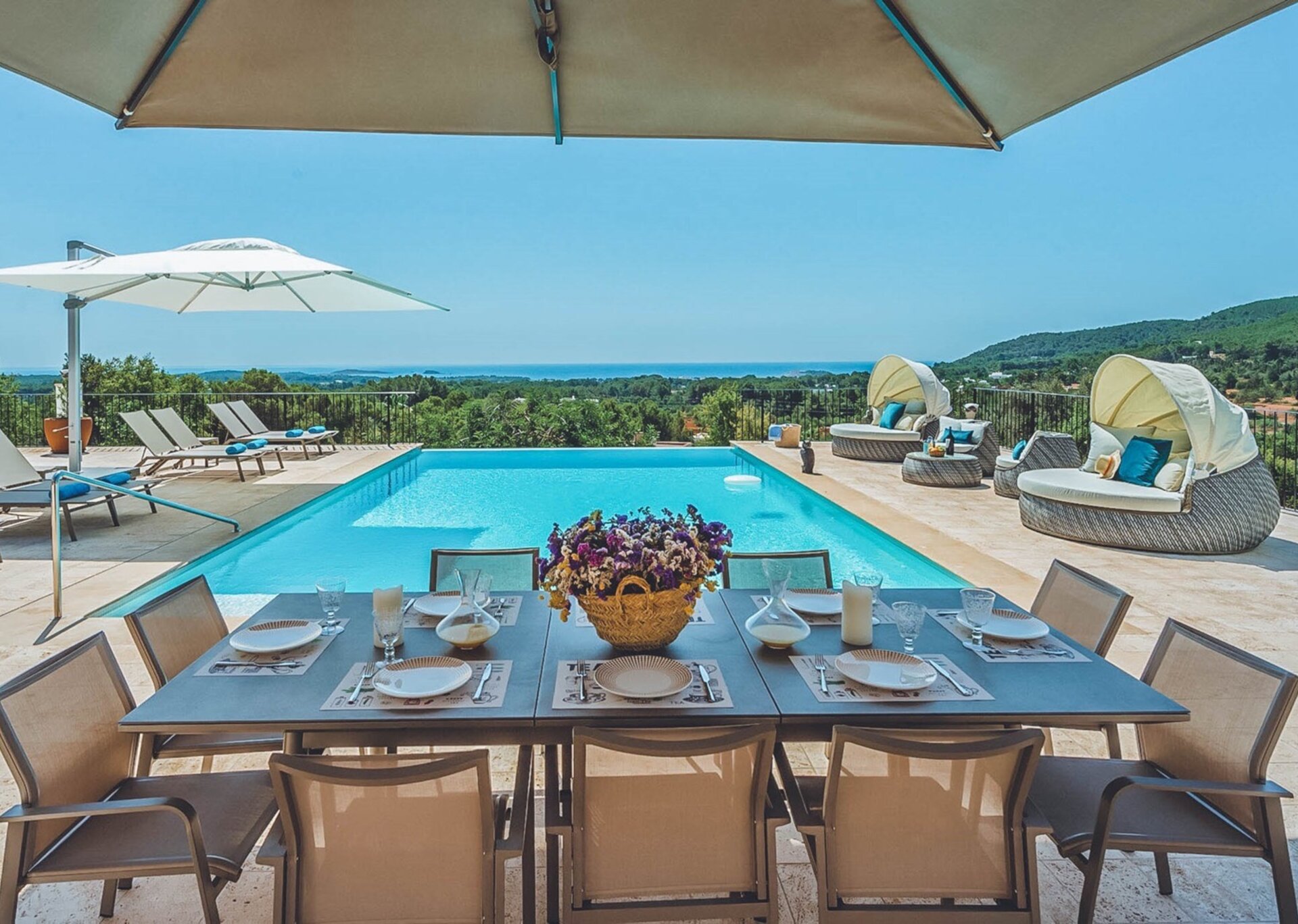 Situated on a private and expansive plot, this luxury property provides a sense of boundless space to relish the stunning views of the lush green landscape and the breathtaking Mediterranean sea. The grounds are enveloped by luscious gardens, featuring an inviting heated swimming pool, ample sun beds, and two spacious shaded luxury daybeds. Additionally, an outdoor bathroom and shower are provided for your convenience.