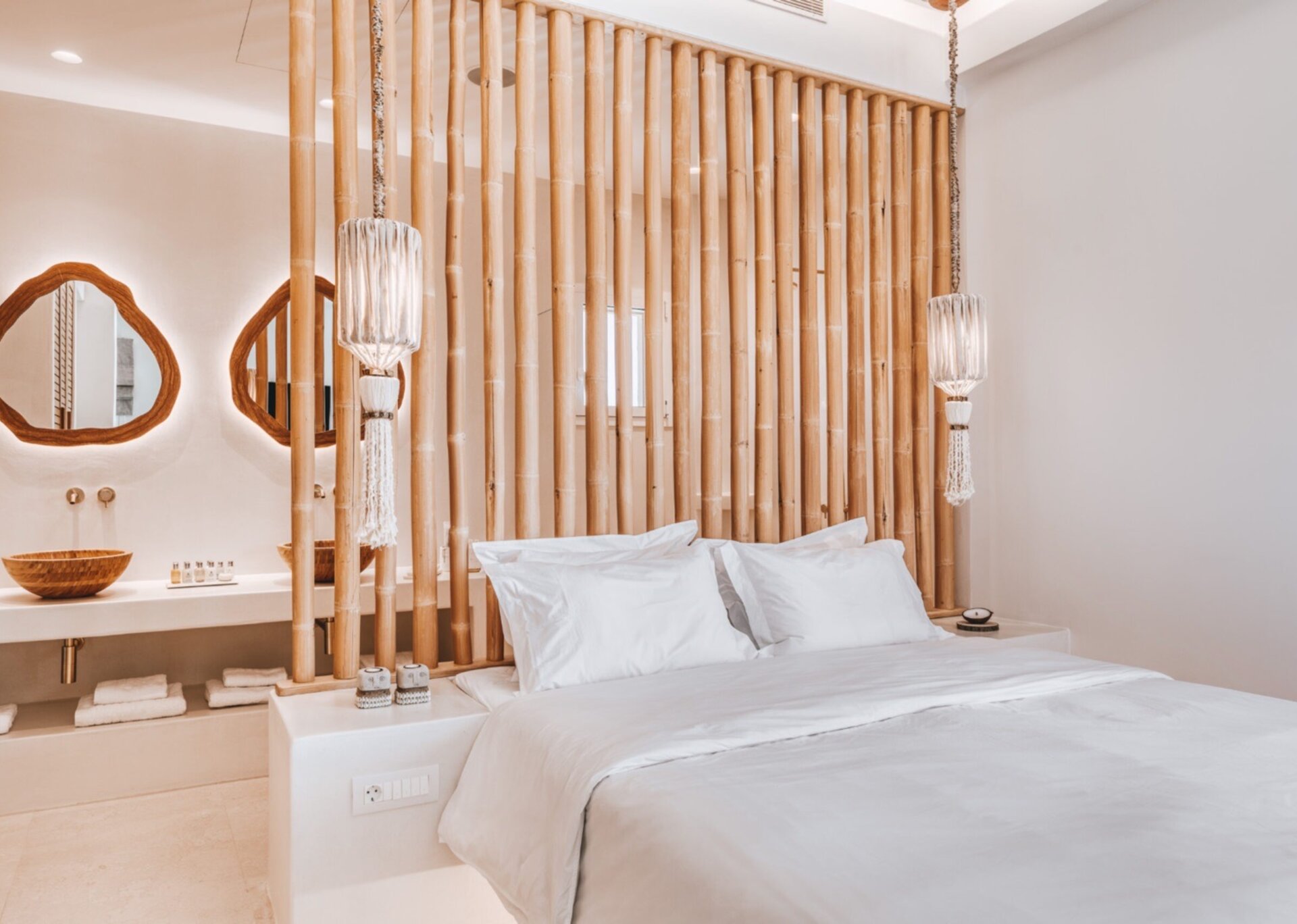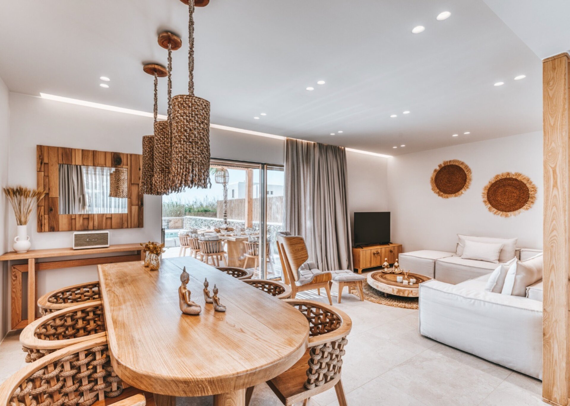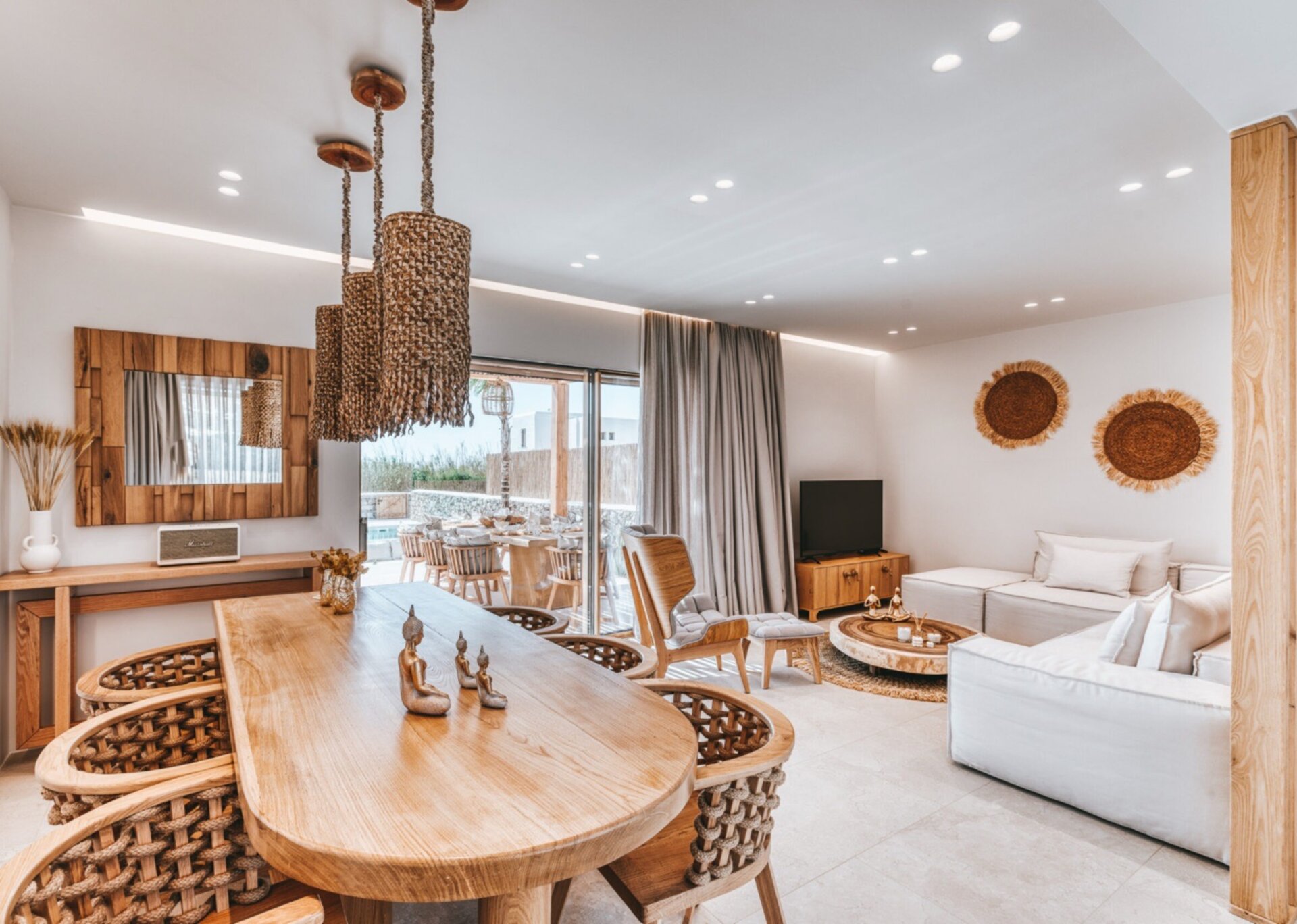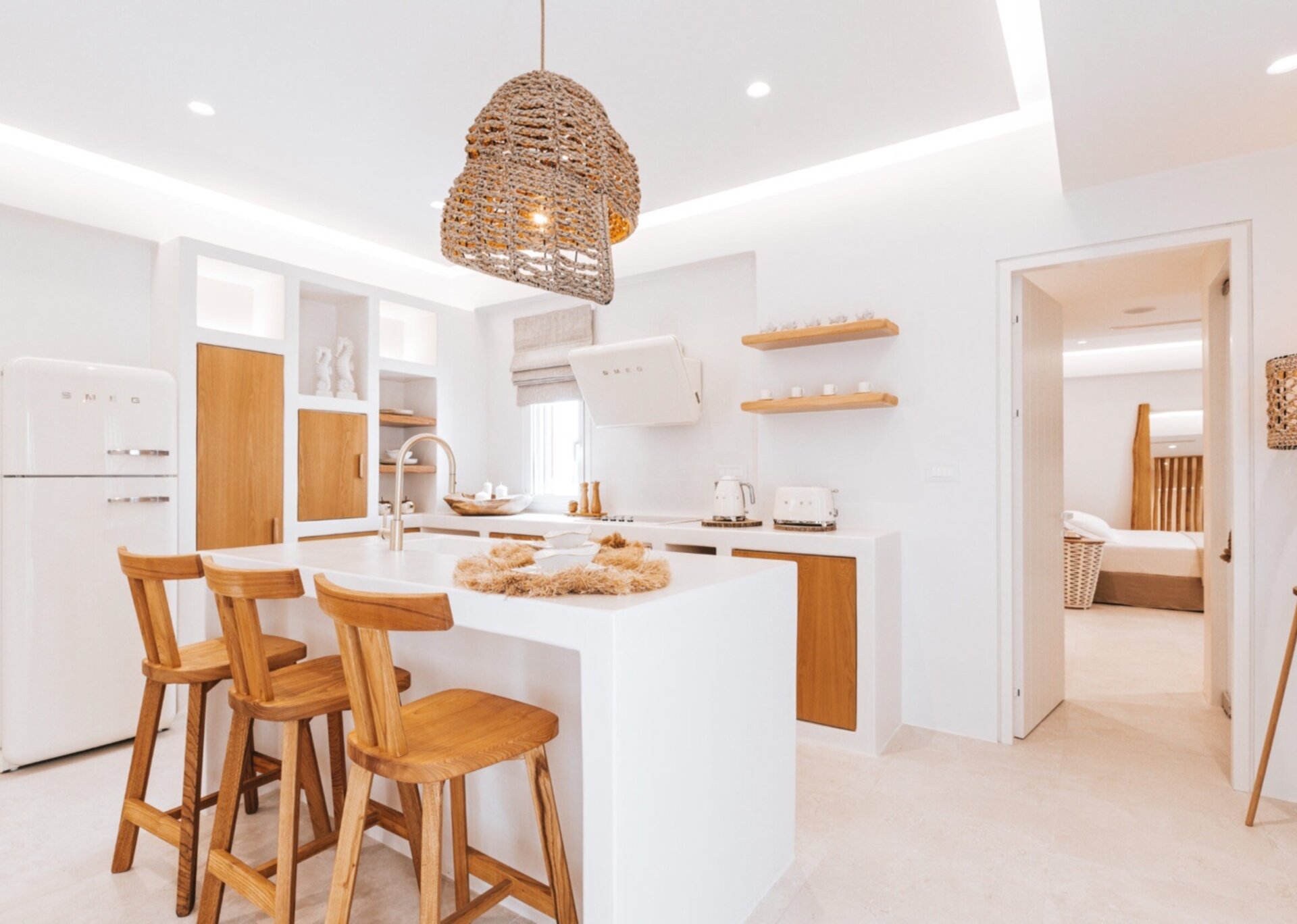 Indulge in the stunning interior, which spans an expansive 150 square meters. Discover the comfort of two King-sized bedrooms, where you can rest and rejuvenate after a day of exploration. Luxuriate in the elegant bathrooms, designed with meticulous attention to detail. The capacious living room welcomes you with its tasteful decor and inviting ambiance, creating a perfect space for relaxation and socialization. Prepare your meals in the vintage Cycladic-inspired kitchen, which adds a touch of timeless beauty to the villa.