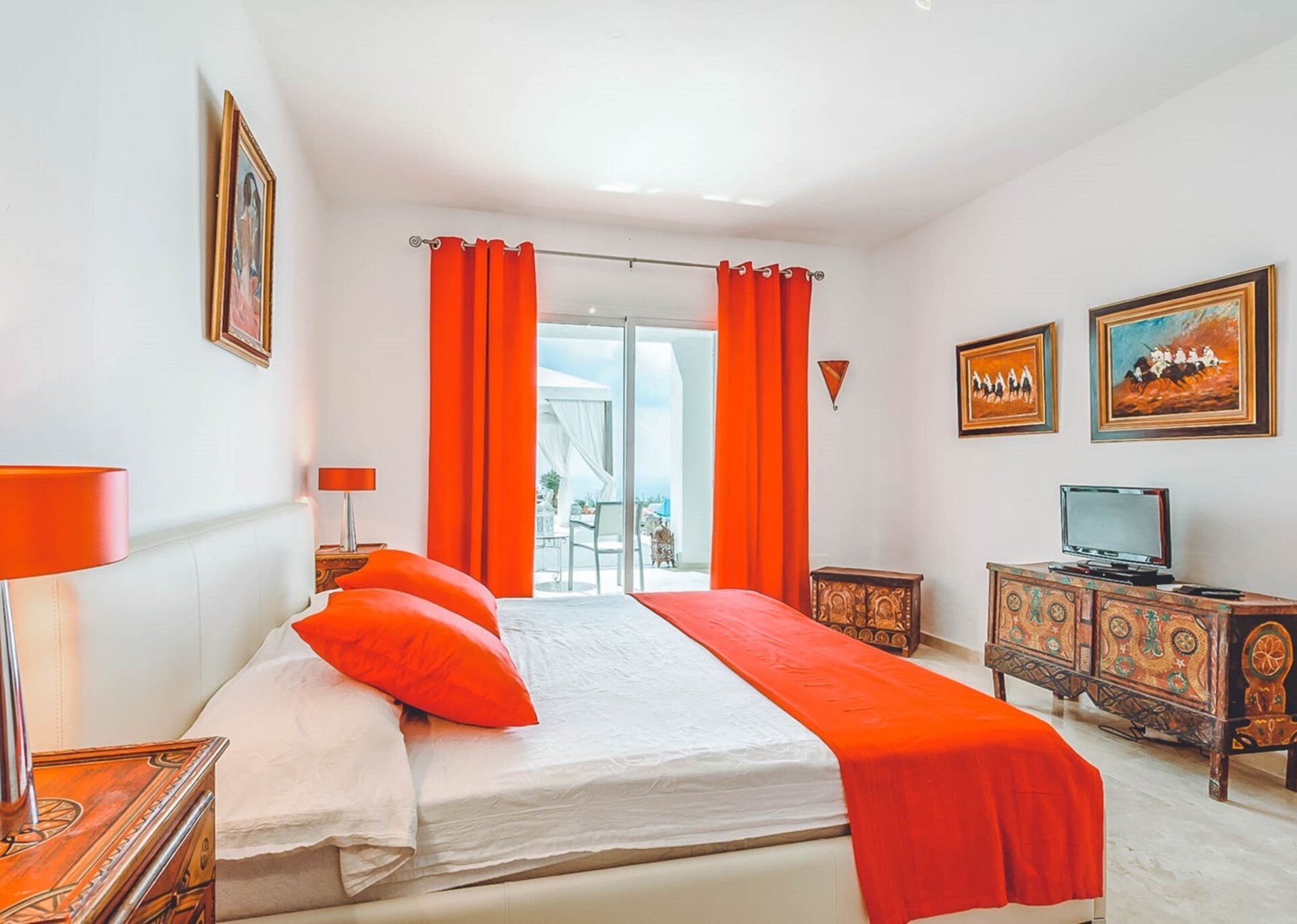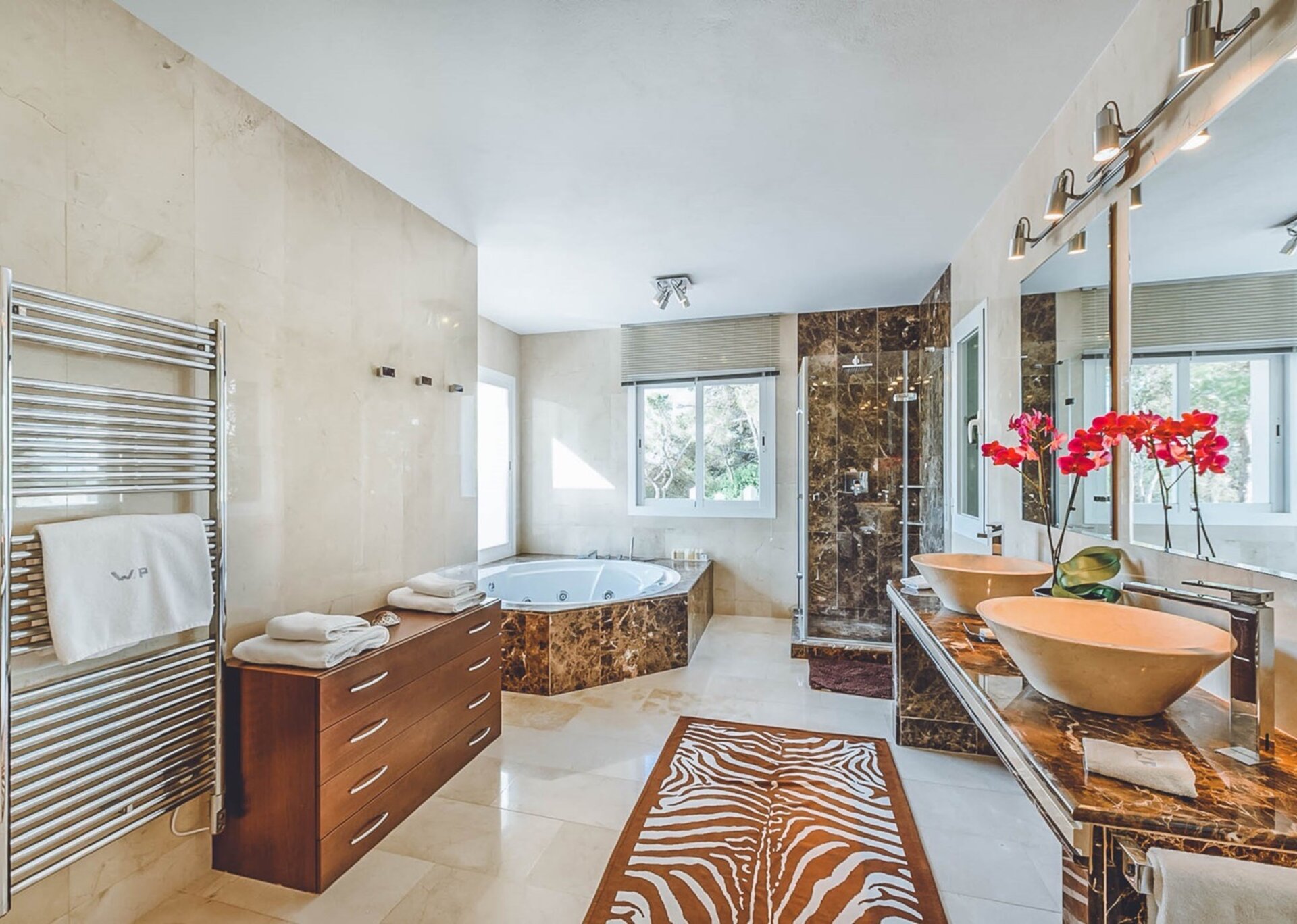 The bedrooms maintain the elegant style found throughout the house, each complete with its own en-suite bathroom. The two larger suites boast king-size beds and luxurious Jacuzzi bathtubs. Every room is adorned with impeccable finishes and furnished with high-quality linens for your ultimate comfort.