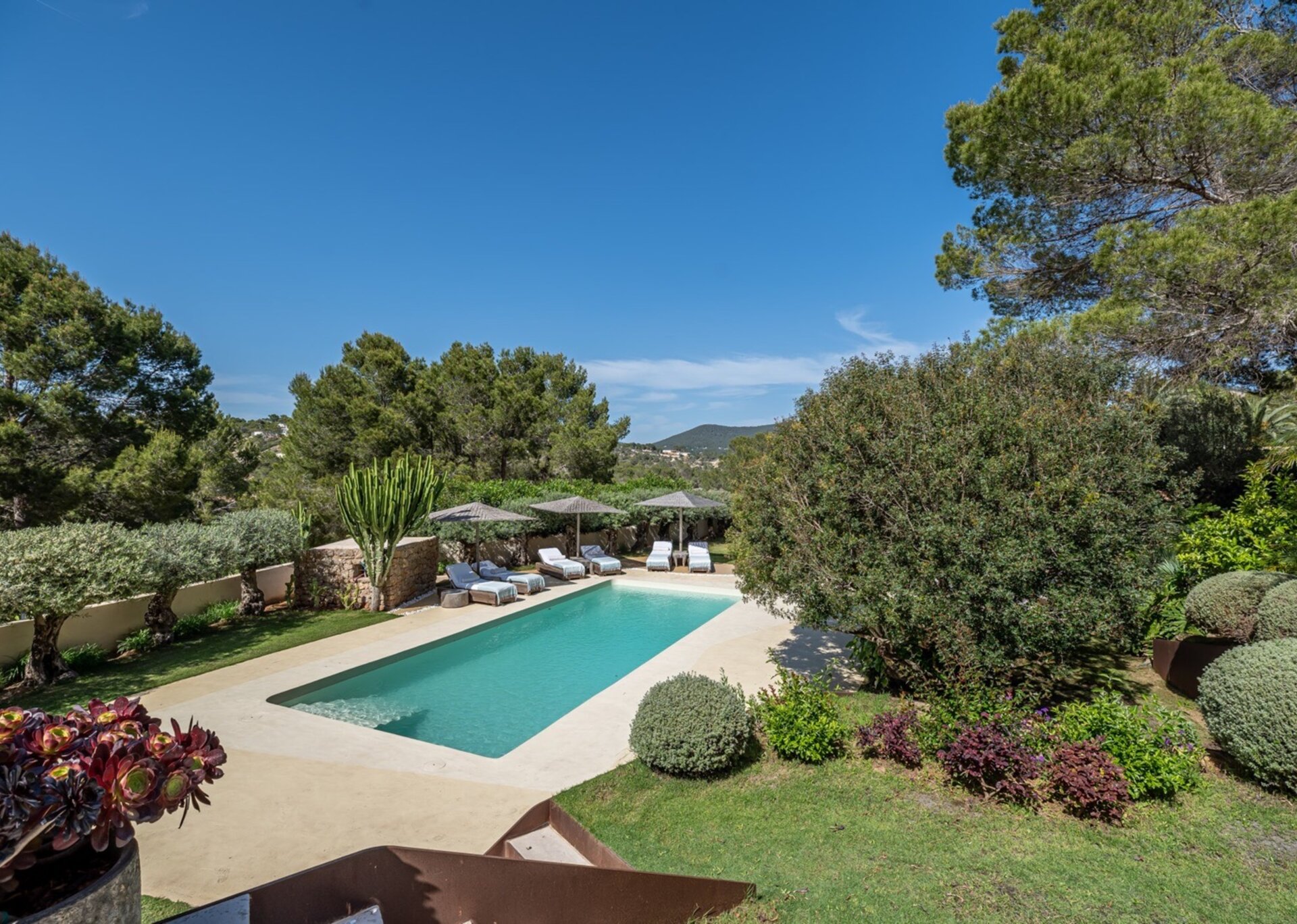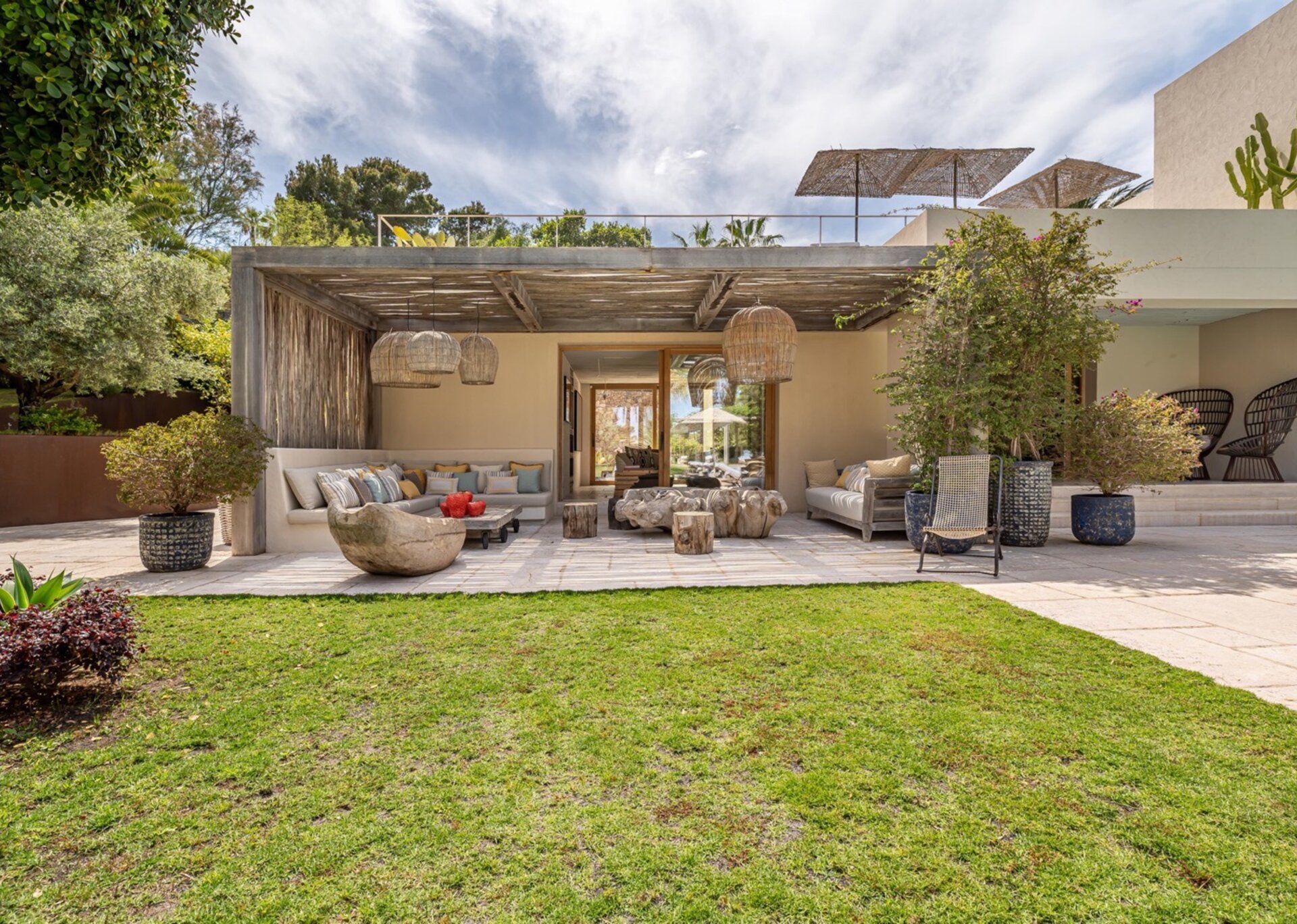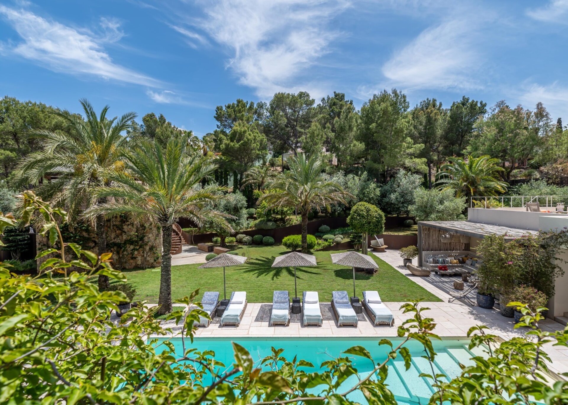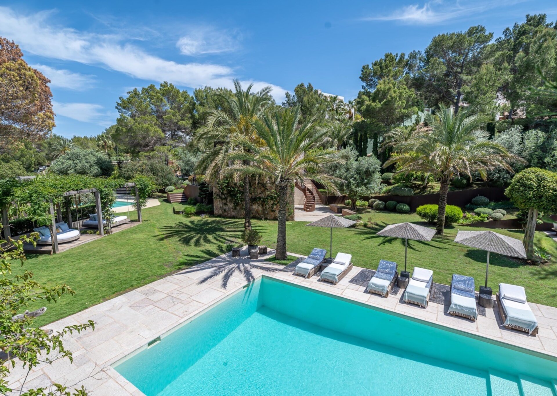 Villa Kylie, spread across a 4100m2 plot, comprises two houses encompassing a total of 600m2. The main house features five bedrooms, while a separate guest house offers four bedrooms. An additional bedroom is also available for staff. Recently renovated to the highest standards, the house exudes a tranquil elegance, with meticulous attention to natural materials and design.