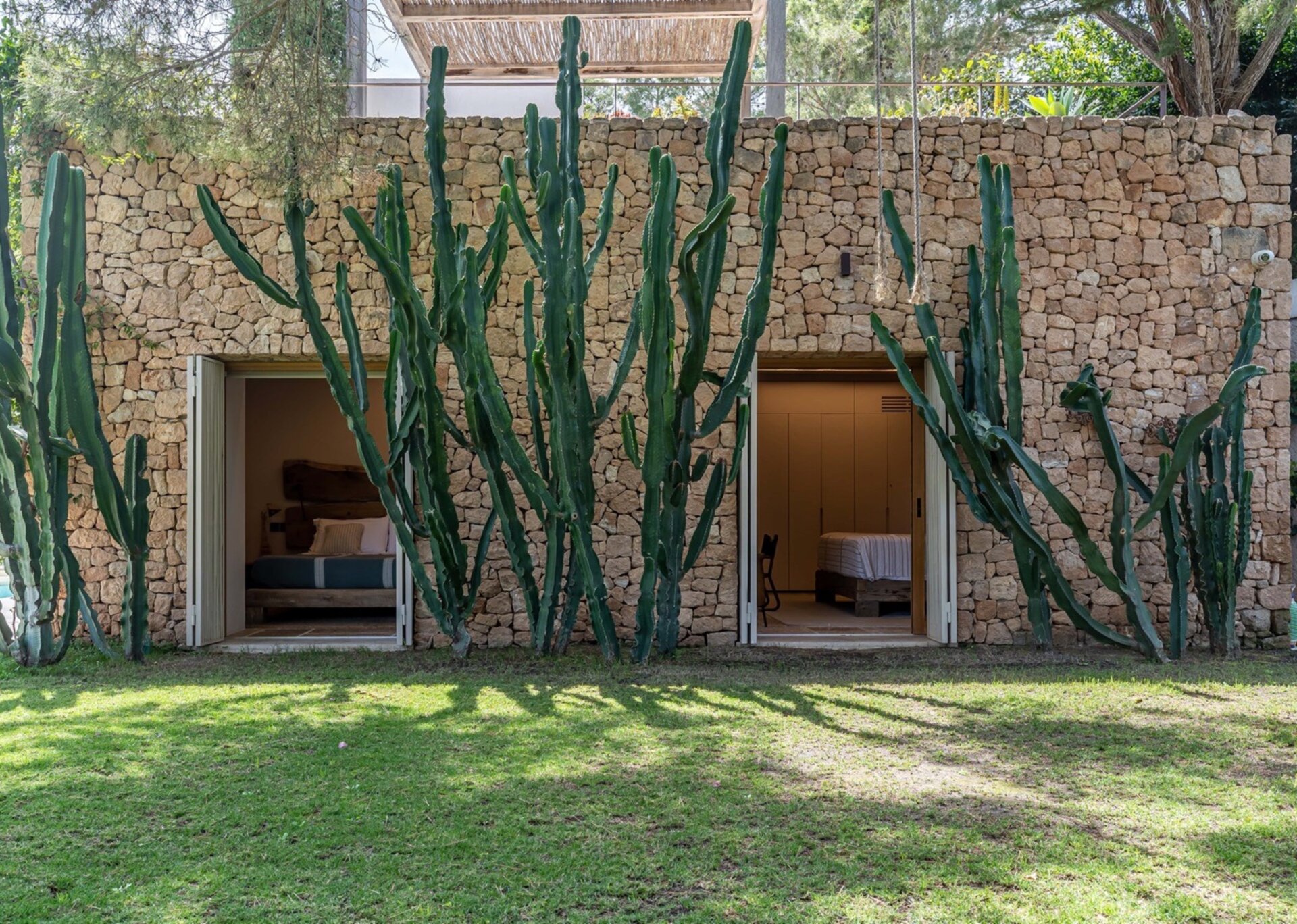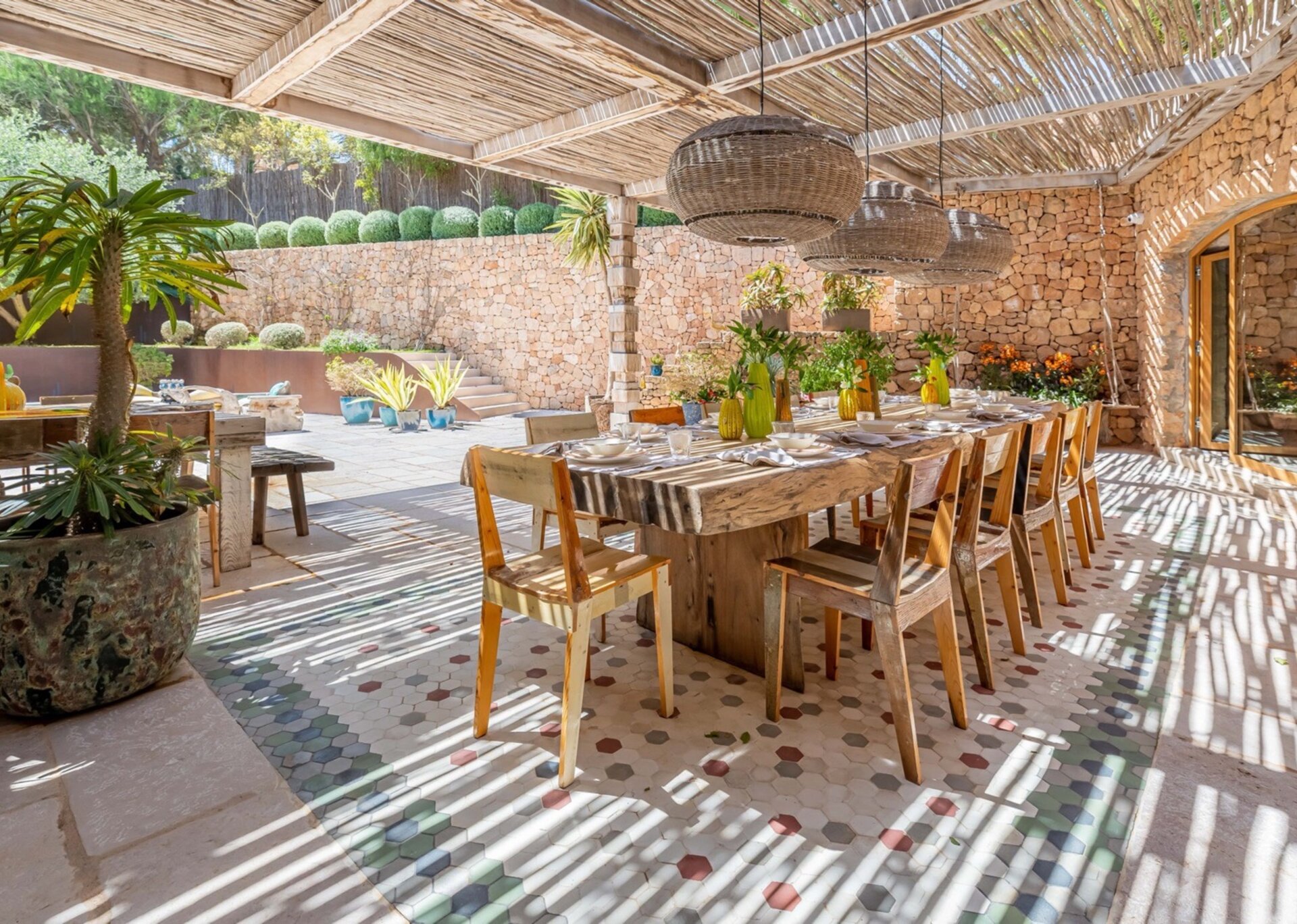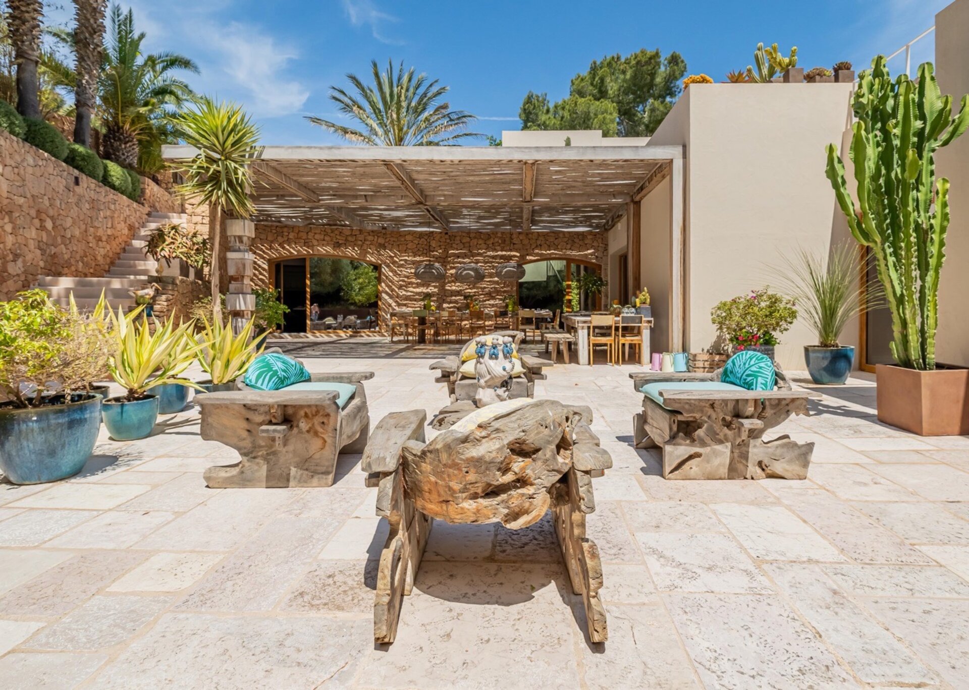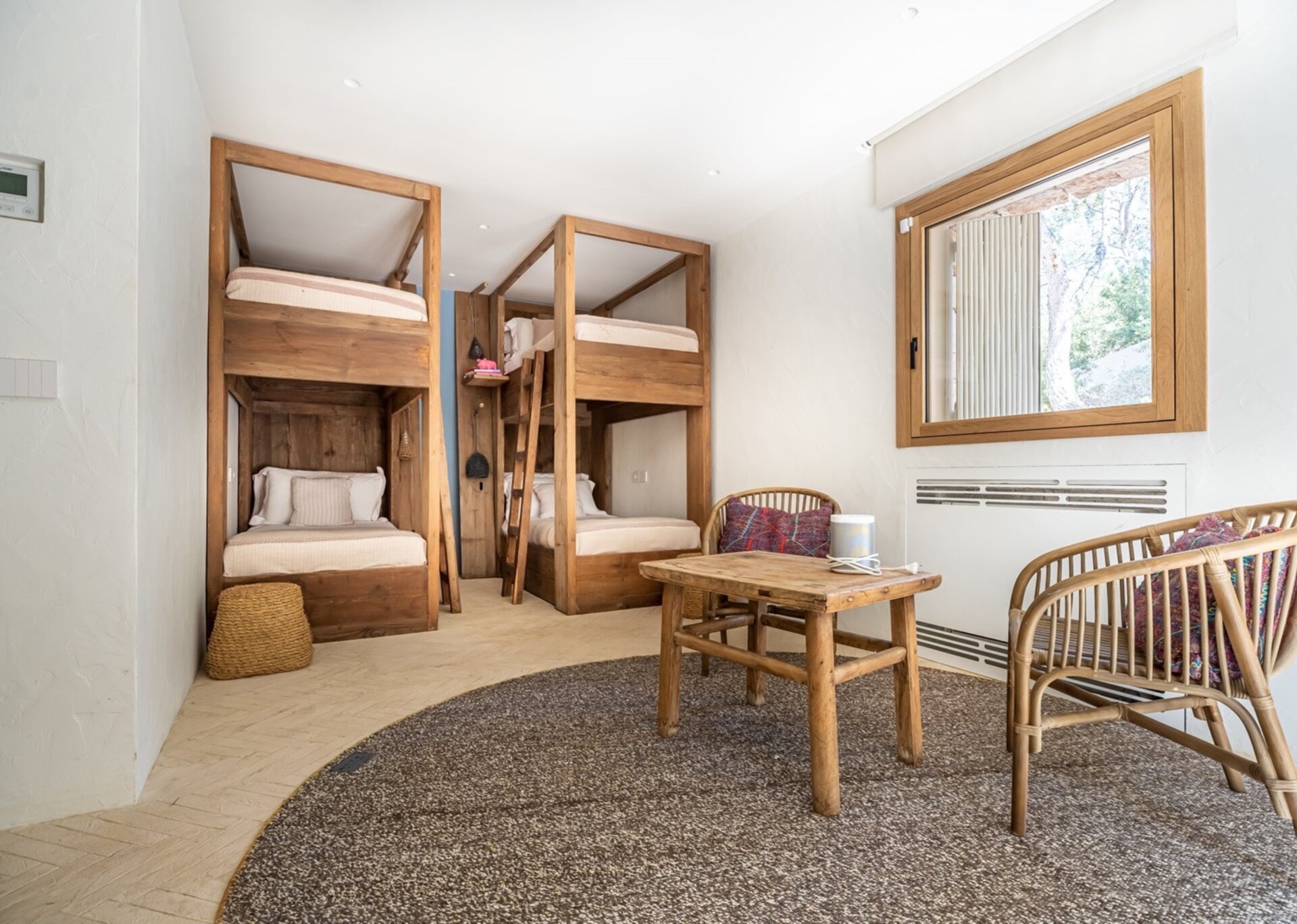 Villa Kylie, spread across a 4100m2 plot, comprises two houses encompassing a total of 600m2. The main house features five bedrooms, while a separate guest house offers four bedrooms. An additional bedroom is also available for staff. Recently renovated to the highest standards, the house exudes a tranquil elegance, with meticulous attention to natural materials and design.