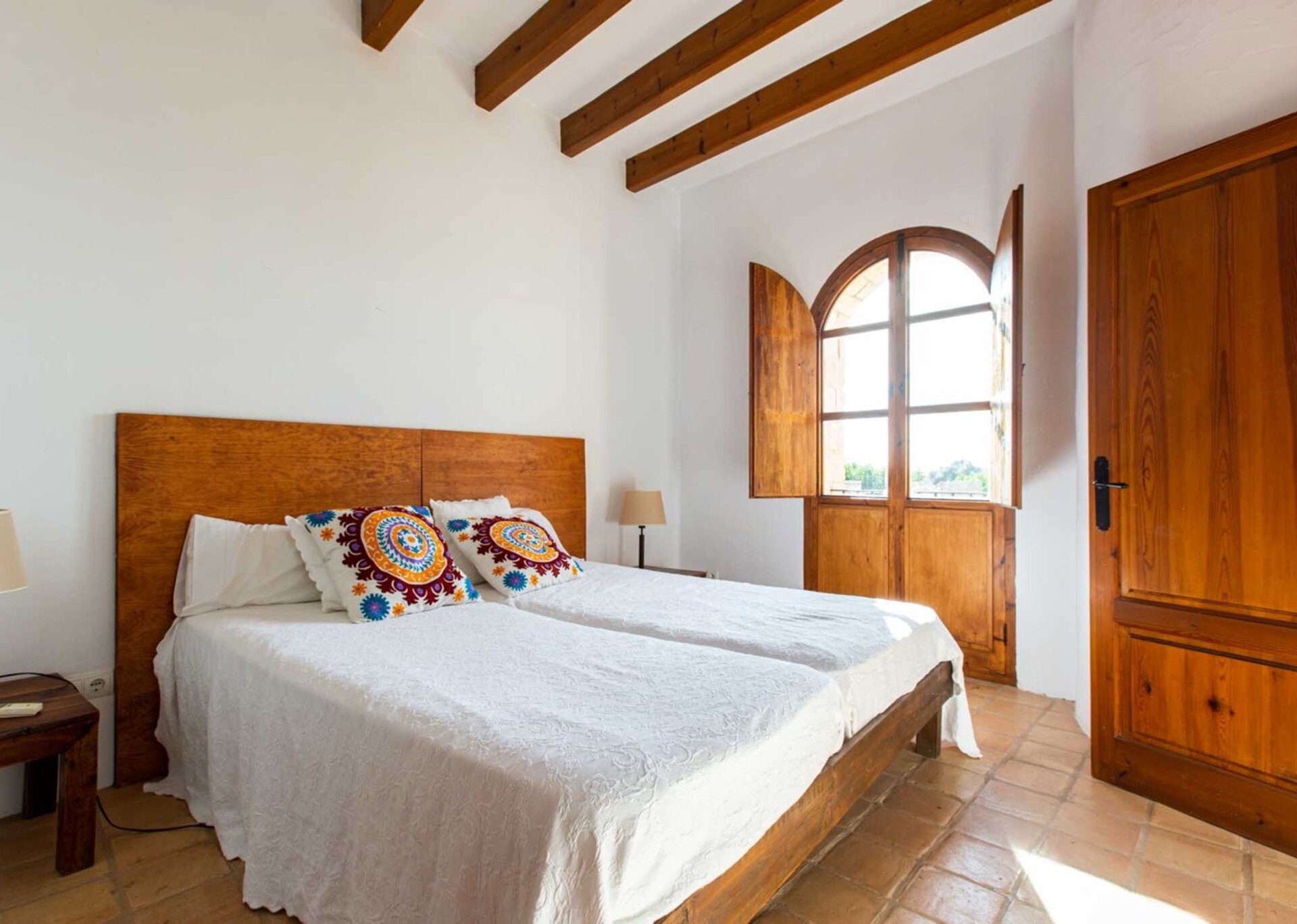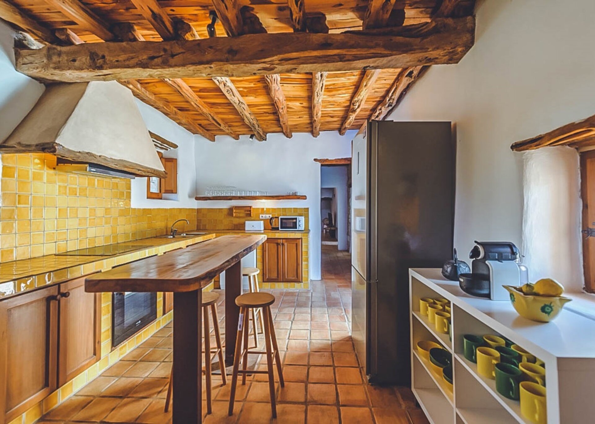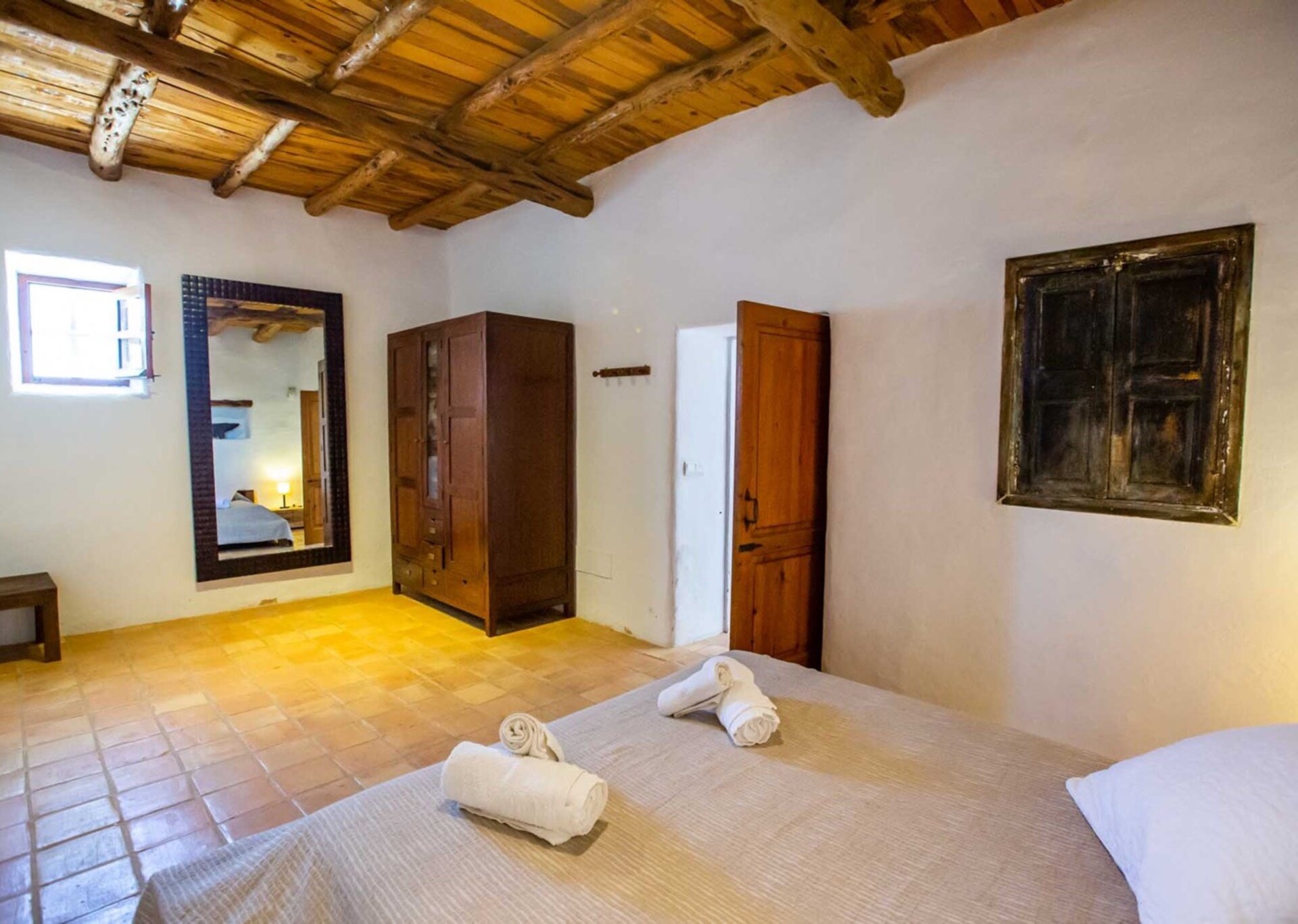 Drawing inspiration from the surrounding landscape, the four bedrooms in the main house exude tranquility with their organic color palette and thoughtful detailing. The reception, living room, and kitchen exude the charm of a farmhouse, adorned with Sabina beams and traditional tiled floors, creating a cool and calming space for relaxation. Additionally, the guest house features two twin bedrooms.