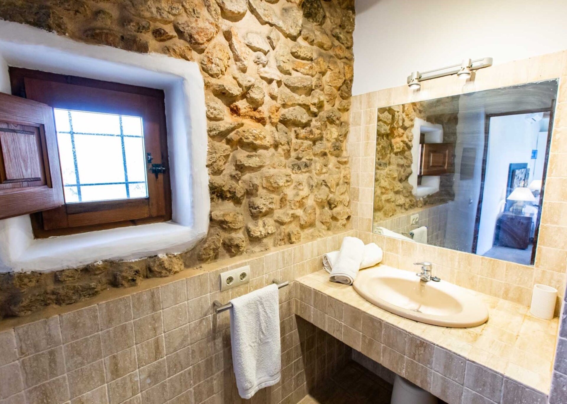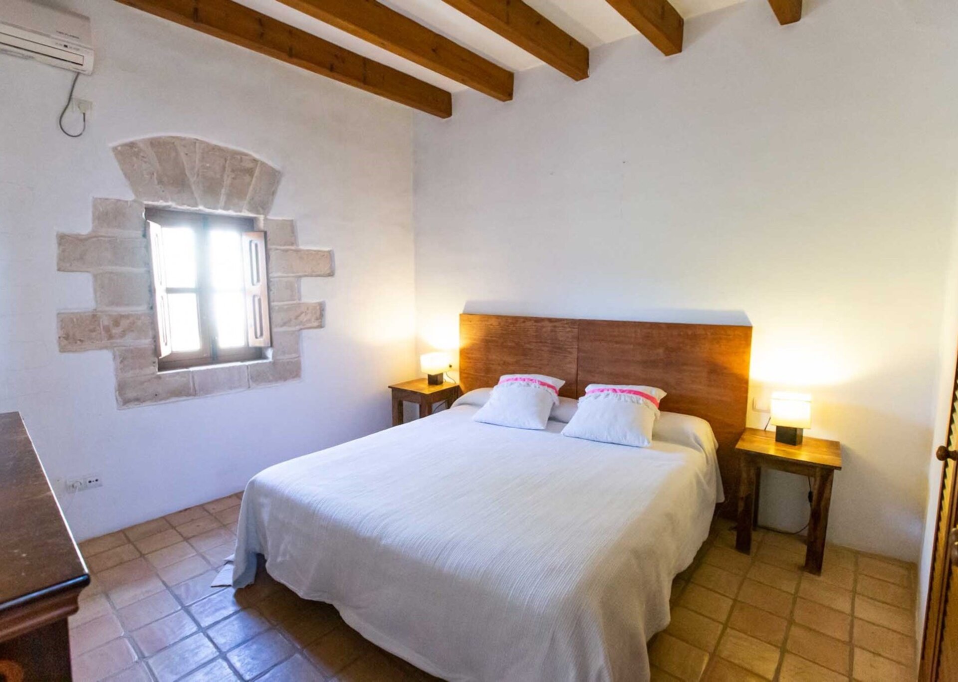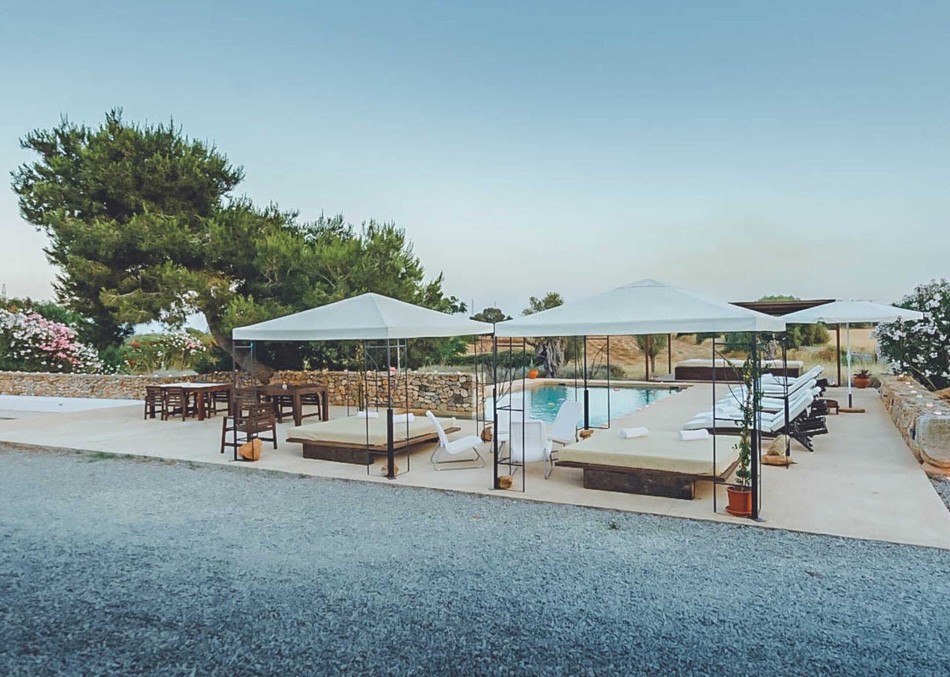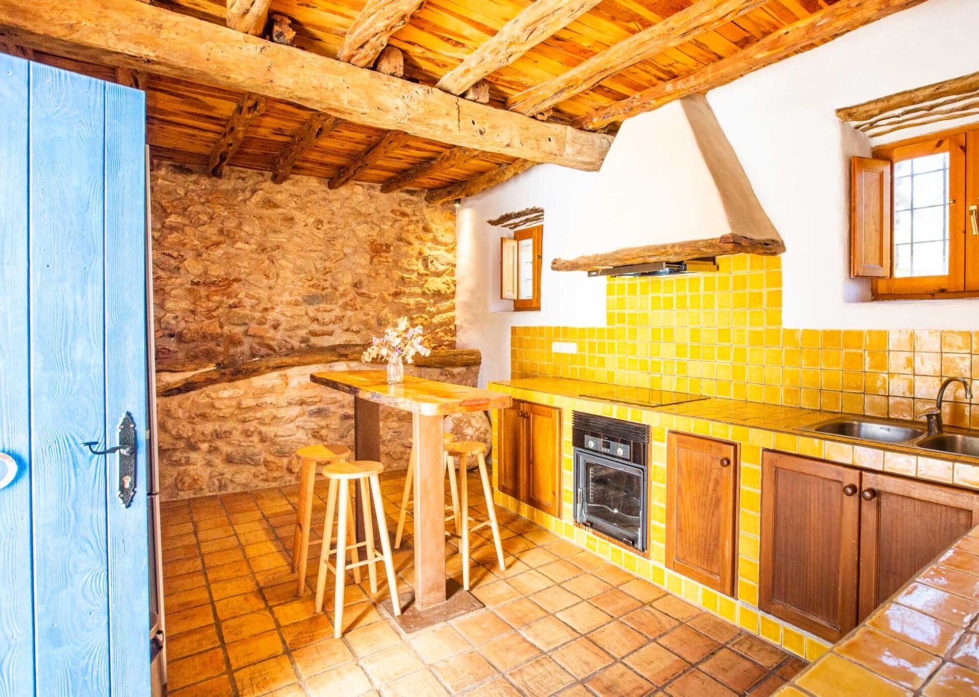 Drawing inspiration from the surrounding landscape, the four bedrooms in the main house exude tranquility with their organic color palette and thoughtful detailing. The reception, living room, and kitchen exude the charm of a farmhouse, adorned with Sabina beams and traditional tiled floors, creating a cool and calming space for relaxation. Additionally, the guest house features two twin bedrooms.
