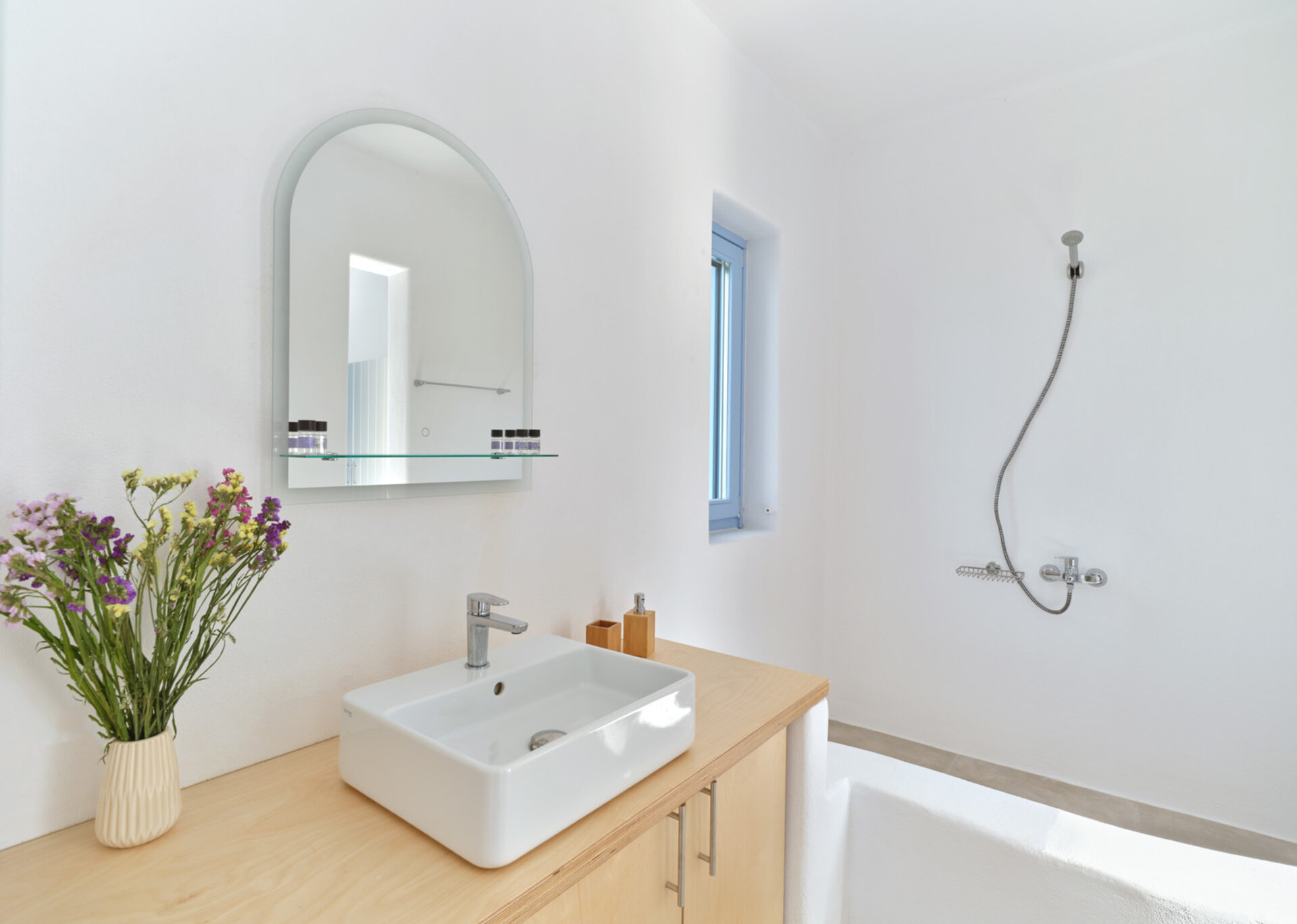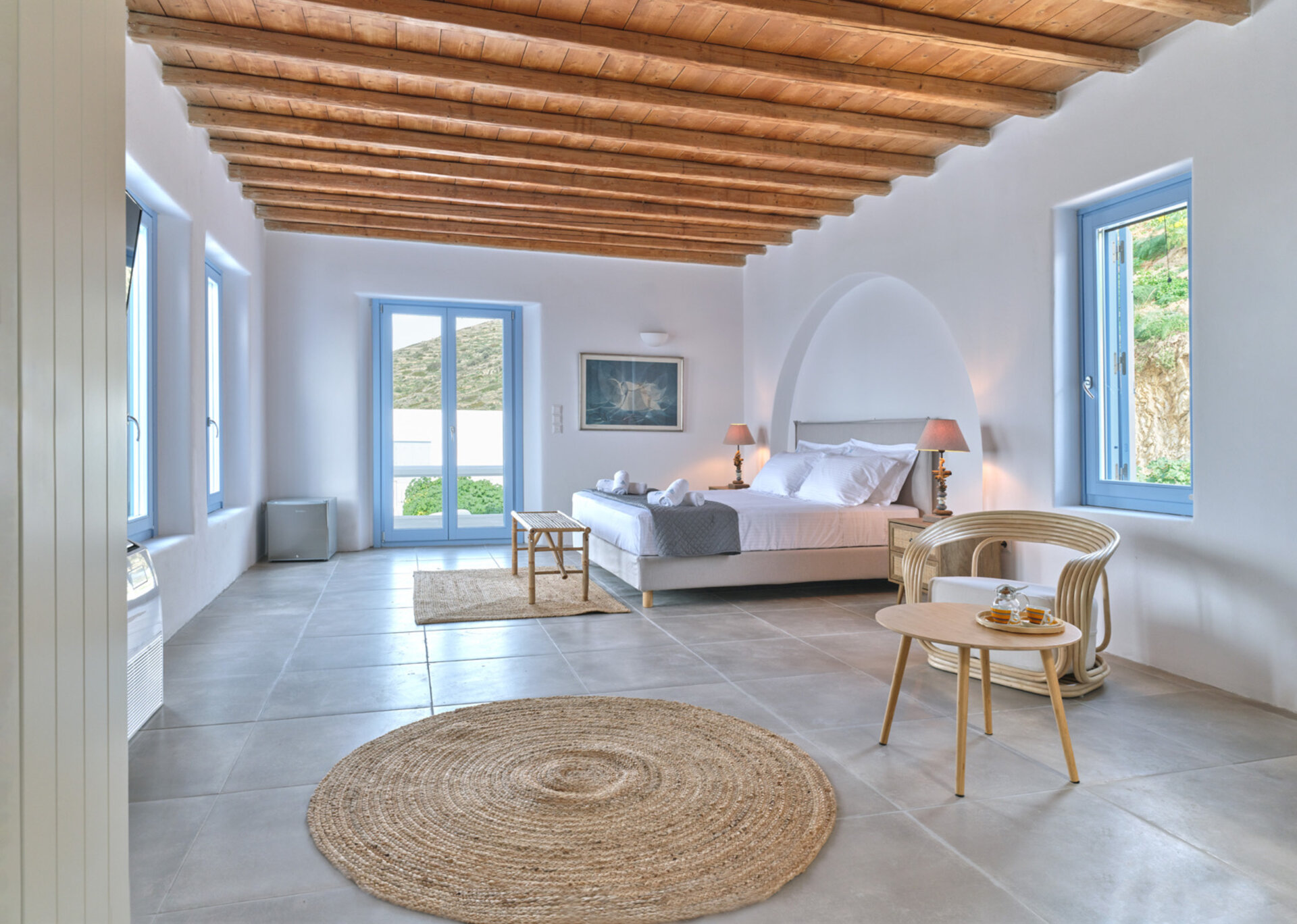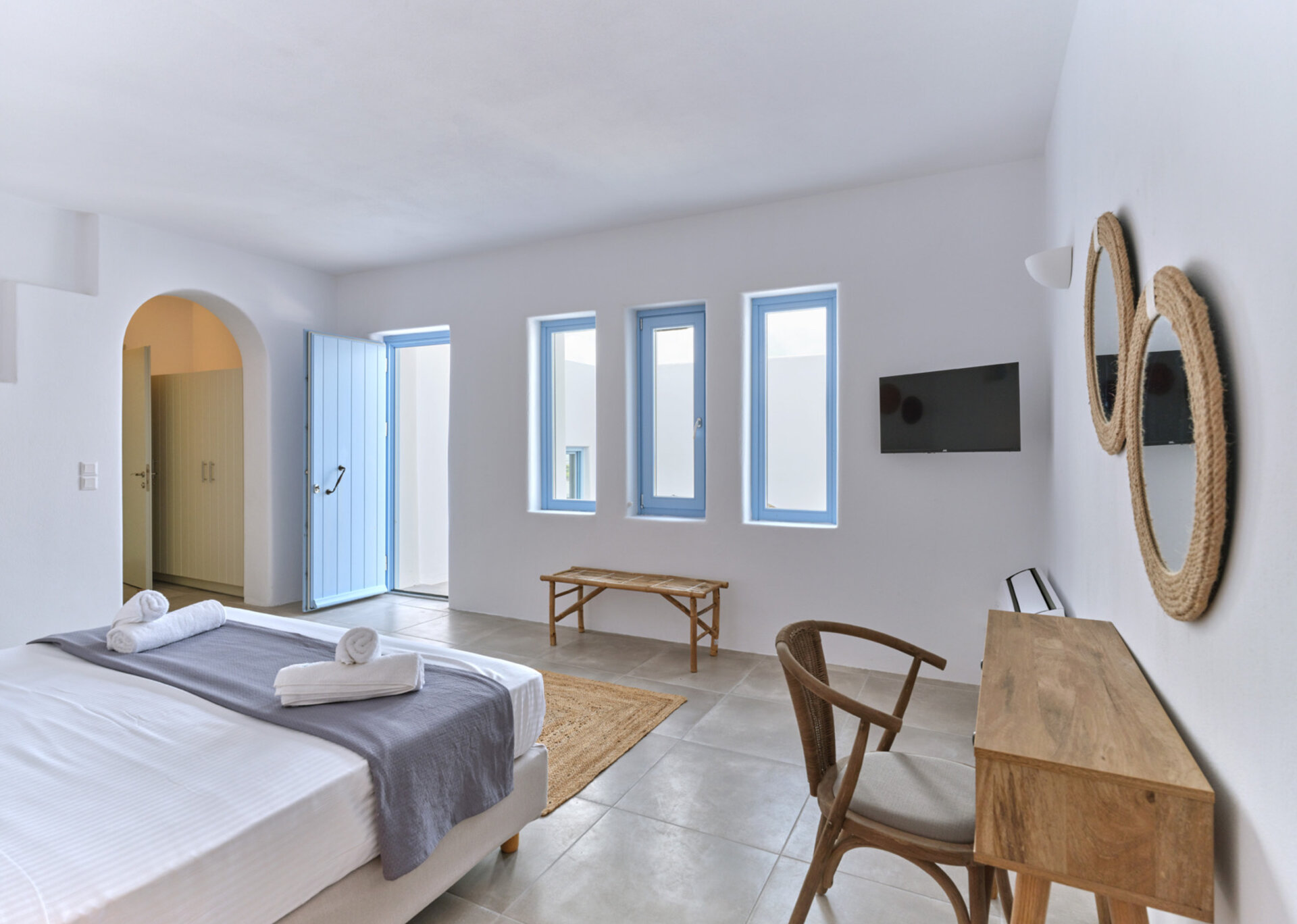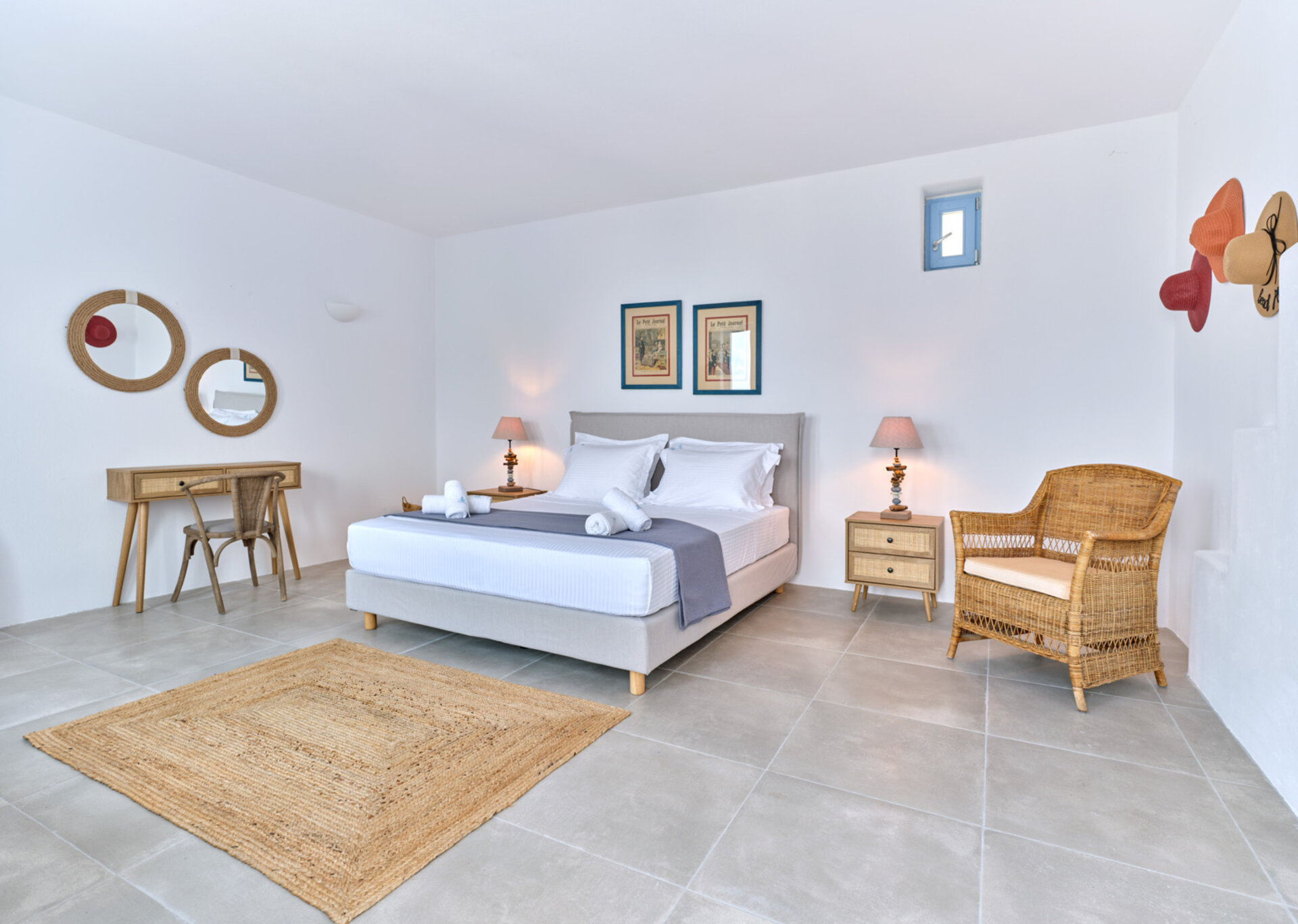 - Double room with private entrance and en suite bathroom (shower, twin joinable beds – convertible to a king size bed, A/C, TV, mini fridge, sea view)