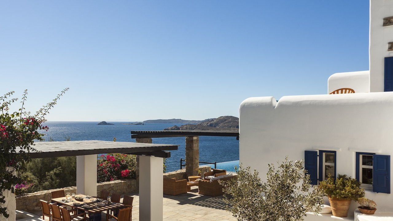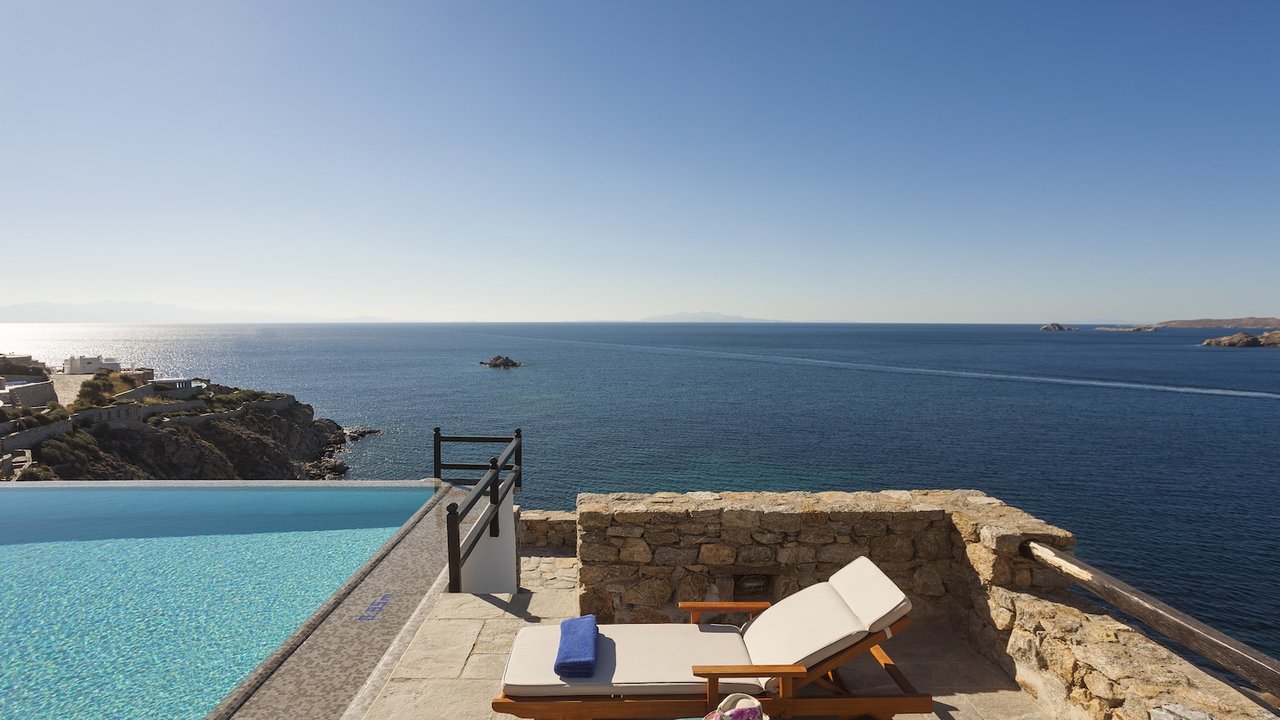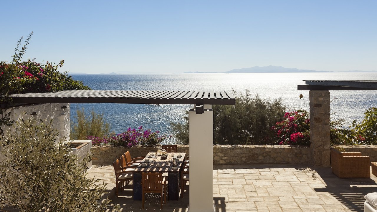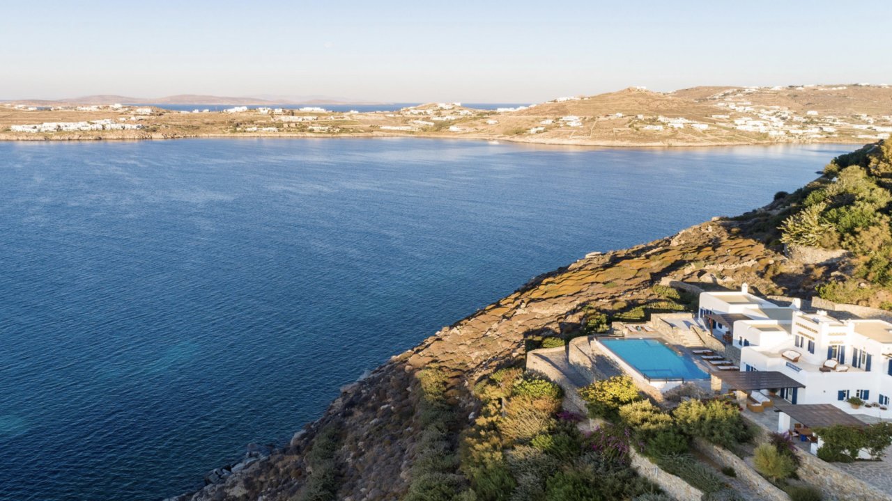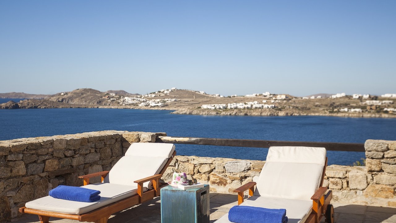 Villa Lauren is nestled on the edge of the Agios Lazaros Mykonos private 11 Luxury Villa estate seafront and enjoys an uninterrupted view of the islands of Delos and Rhenea over a majestic drop to the sea, offering the picture-perfect Mykonos sunset. The world-renown designer, Alberto Pinto, intended the white-washed indoors and minimal designs to distract guests from the over-powering natural beauty of the island, and the white upholstery is intended to complement the island’s unique Cycladic architecture. The curved walls and seating arrangements blend in seamlessly with the Mykonian style, where 90-degree angles are all but absent. In contrast to the interior, the exterior of Pinto’s designs draw upon the magnificent, fiery-colored, stone-chiseled walls and broad flagstones to blend into the natural zeitgeist of the island’s wild-side, offering up an uninterrupted frame from within which to view Apollo’s birth place, Delos, and the myriad of Cycladic islands scattered beyond it into the distance.