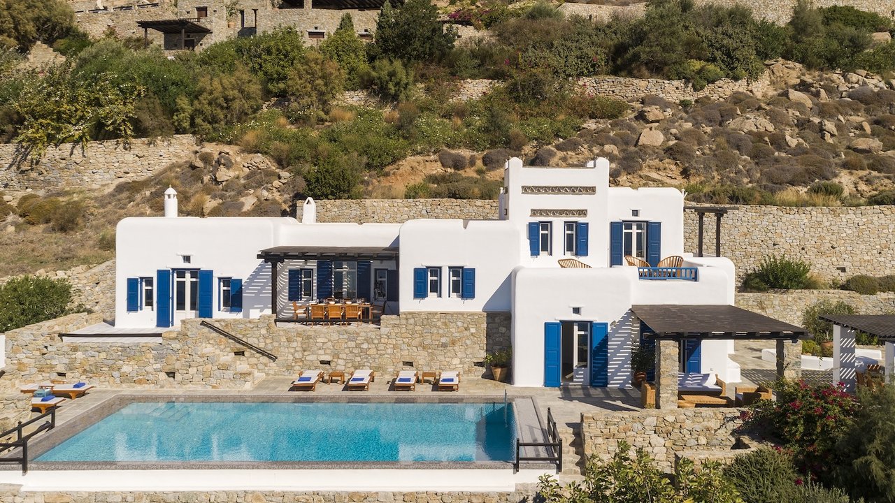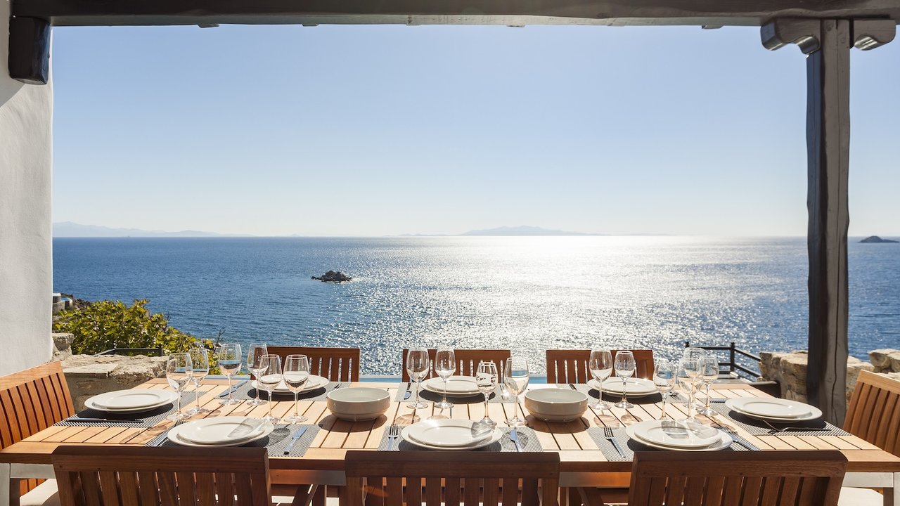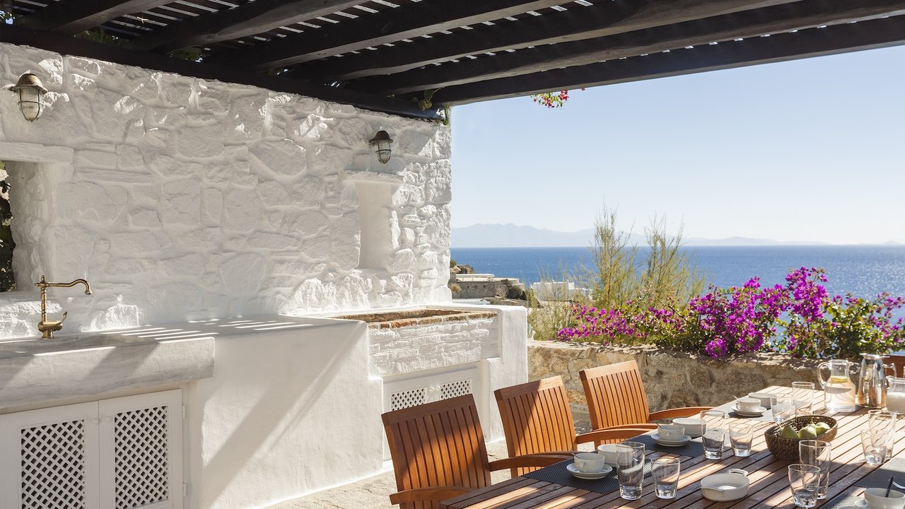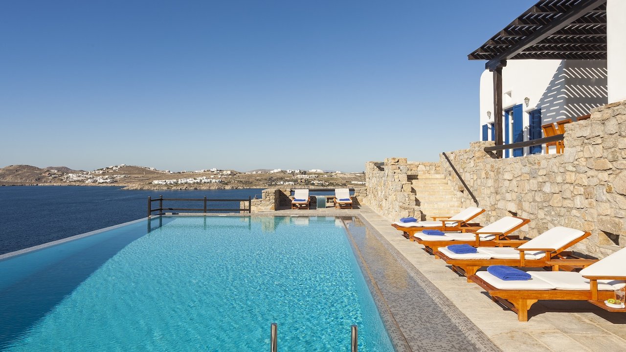 Villa Lauren is nestled on the edge of the Agios Lazaros Mykonos private 11 Luxury Villa estate seafront and enjoys an uninterrupted view of the islands of Delos and Rhenea over a majestic drop to the sea, offering the picture-perfect Mykonos sunset. The world-renown designer, Alberto Pinto, intended the white-washed indoors and minimal designs to distract guests from the over-powering natural beauty of the island, and the white upholstery is intended to complement the island’s unique Cycladic architecture. The curved walls and seating arrangements blend in seamlessly with the Mykonian style, where 90-degree angles are all but absent. In contrast to the interior, the exterior of Pinto’s designs draw upon the magnificent, fiery-colored, stone-chiseled walls and broad flagstones to blend into the natural zeitgeist of the island’s wild-side, offering up an uninterrupted frame from within which to view Apollo’s birth place, Delos, and the myriad of Cycladic islands scattered beyond it into the distance.