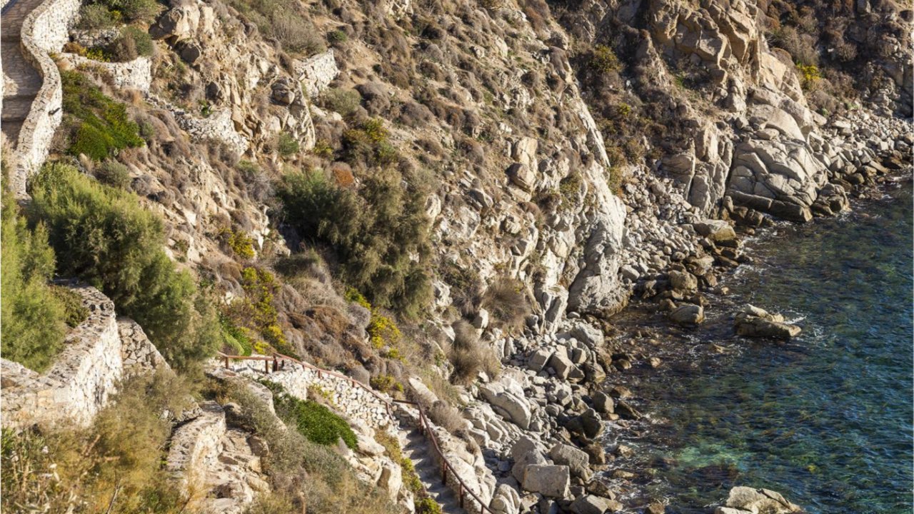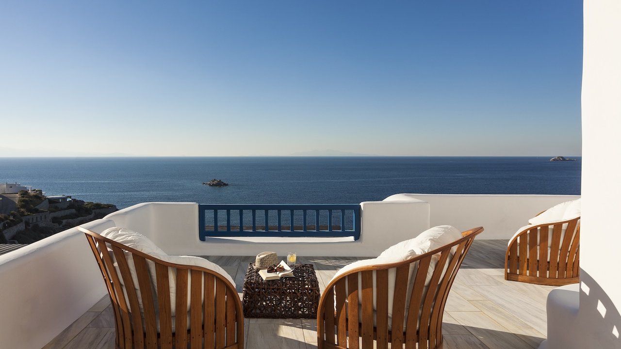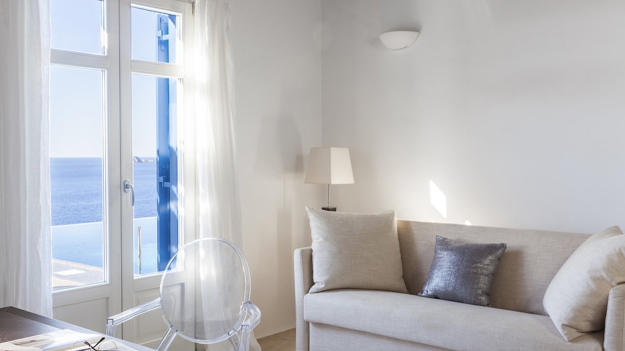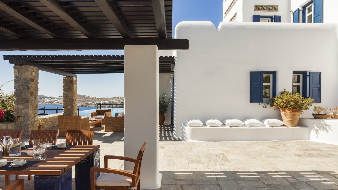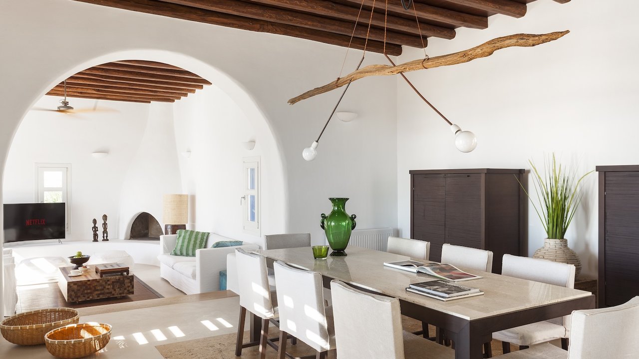 Villa Lauren is nestled on the edge of the Agios Lazaros Mykonos private 11 Luxury Villa estate seafront and enjoys an uninterrupted view of the islands of Delos and Rhenea over a majestic drop to the sea, offering the picture-perfect Mykonos sunset. The world-renown designer, Alberto Pinto, intended the white-washed indoors and minimal designs to distract guests from the over-powering natural beauty of the island, and the white upholstery is intended to complement the island’s unique Cycladic architecture. The curved walls and seating arrangements blend in seamlessly with the Mykonian style, where 90-degree angles are all but absent. In contrast to the interior, the exterior of Pinto’s designs draw upon the magnificent, fiery-colored, stone-chiseled walls and broad flagstones to blend into the natural zeitgeist of the island’s wild-side, offering up an uninterrupted frame from within which to view Apollo’s birth place, Delos, and the myriad of Cycladic islands scattered beyond it into the distance.