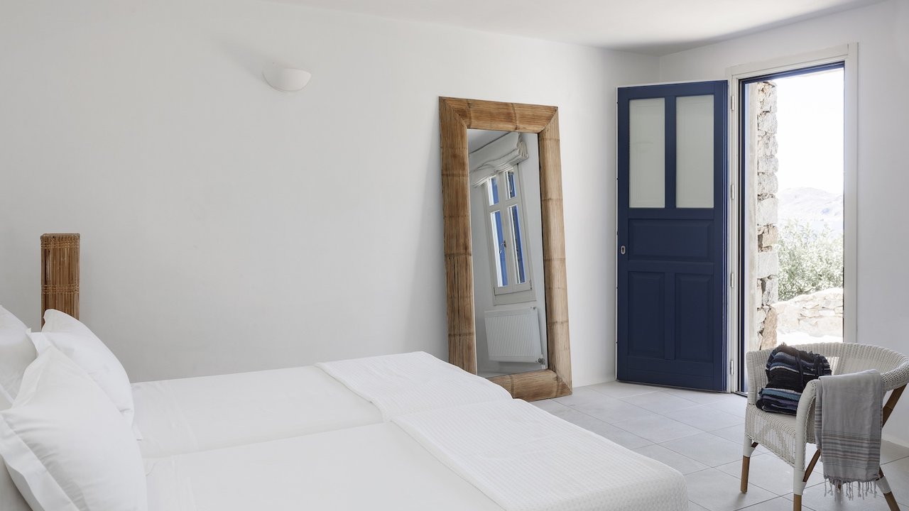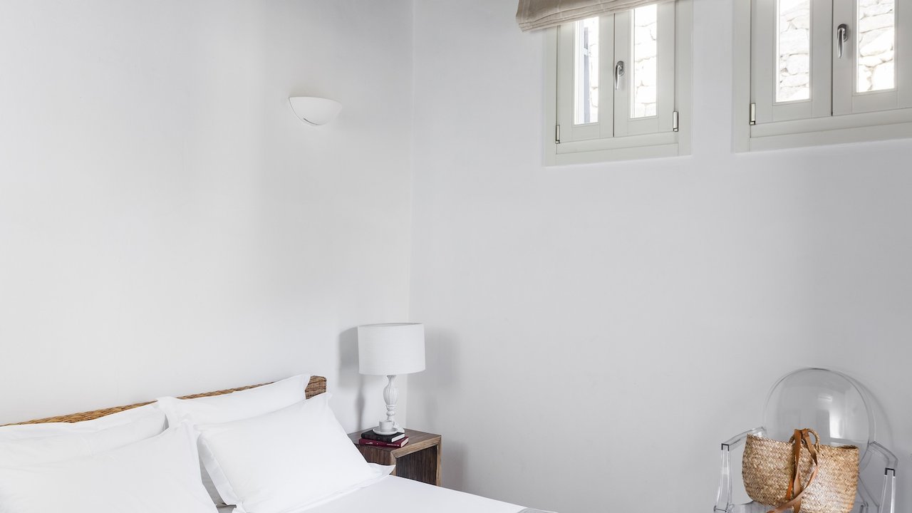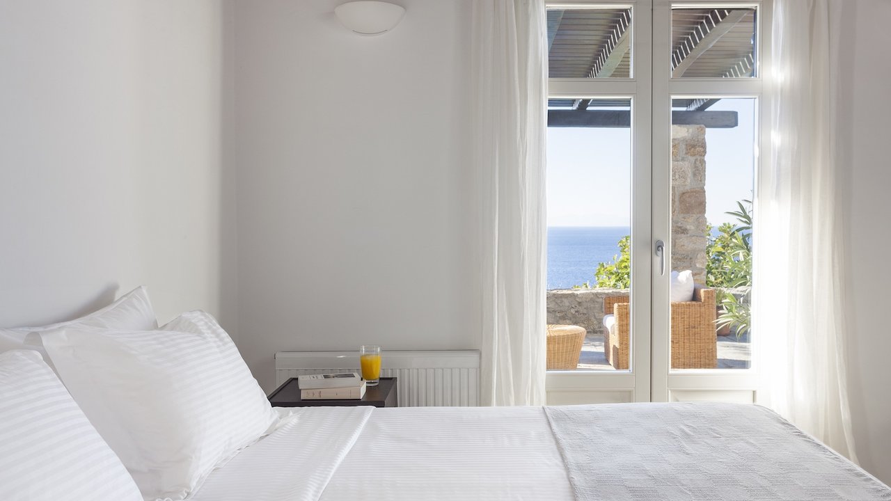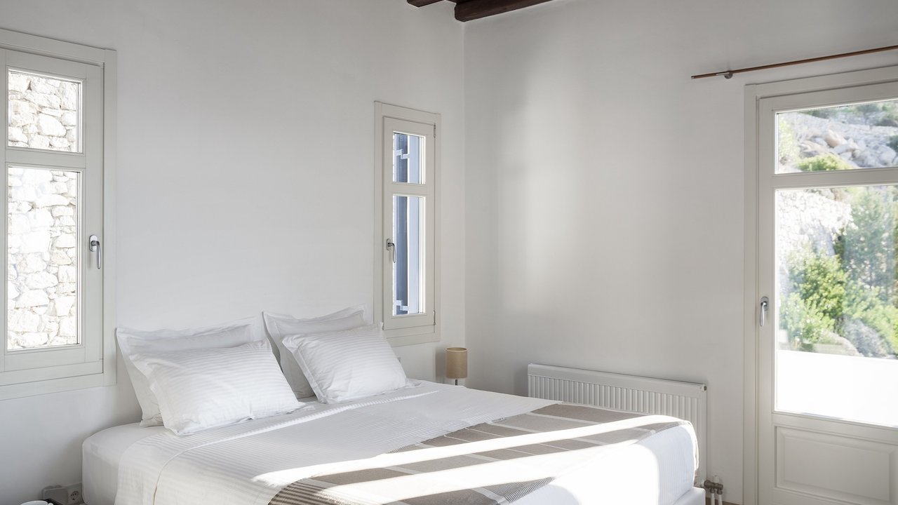Villa Lauren boasts an outdoor BBQ and an outdoor dining area overlooking a magnificent view of the infinity pool that appears to flow off into the sea. There are sunny & shady (all day long) areas in front of the 98m2 infinity pool that flows off into the Aegean horizon- and you are still less than a two-minute walk to the sea (still within the estate). Villa Lauren main entrance opens into the living and dining areas and to the open-plan kitchen. The dining and living room areas (w/ fire-place) are on the right. The view to the sea is breath taking from all three rooms. To the left of the main entrance, and upstairs, is a Master bedroom with a Super King bed w/ an en-suite bathroom w/Jaccuzzi, and a private balcony. On the pool level are two bedrooms, the left one has a private entrance and bathroom. The room on the right is a suite with a sofa (this room can be closed off) and an en-suite bathroom and direct access to the outside (pool) areas. At the ground level are 2 more bedrooms both with en-suite bathrooms and 2 singles each (one is rather dark). There are also two storage rooms, a laundry room and another bathroom. The brilliant white interiors and exteriors and the subtle tasteful decorations reflect the Mykonian-elegance the island is known for, so you can totally immerse yourself in the spirit of the island. The refurbished luxury estate has daily, complimentary maid service-so you don’t lift a finger, 24/7 CCTV monitoring at the periphery of the estate- so unauthorized people are detectable, Netflix- to quench your thirst for relaxed adventure, flat-screen TVs- so everyone can watch, back-up generators- to face the frequent local electric shortages, a desalination plant- so you can ignore the frequent local water shortages, and a 24/7 gate-access control. The pool can be heated for a fee.