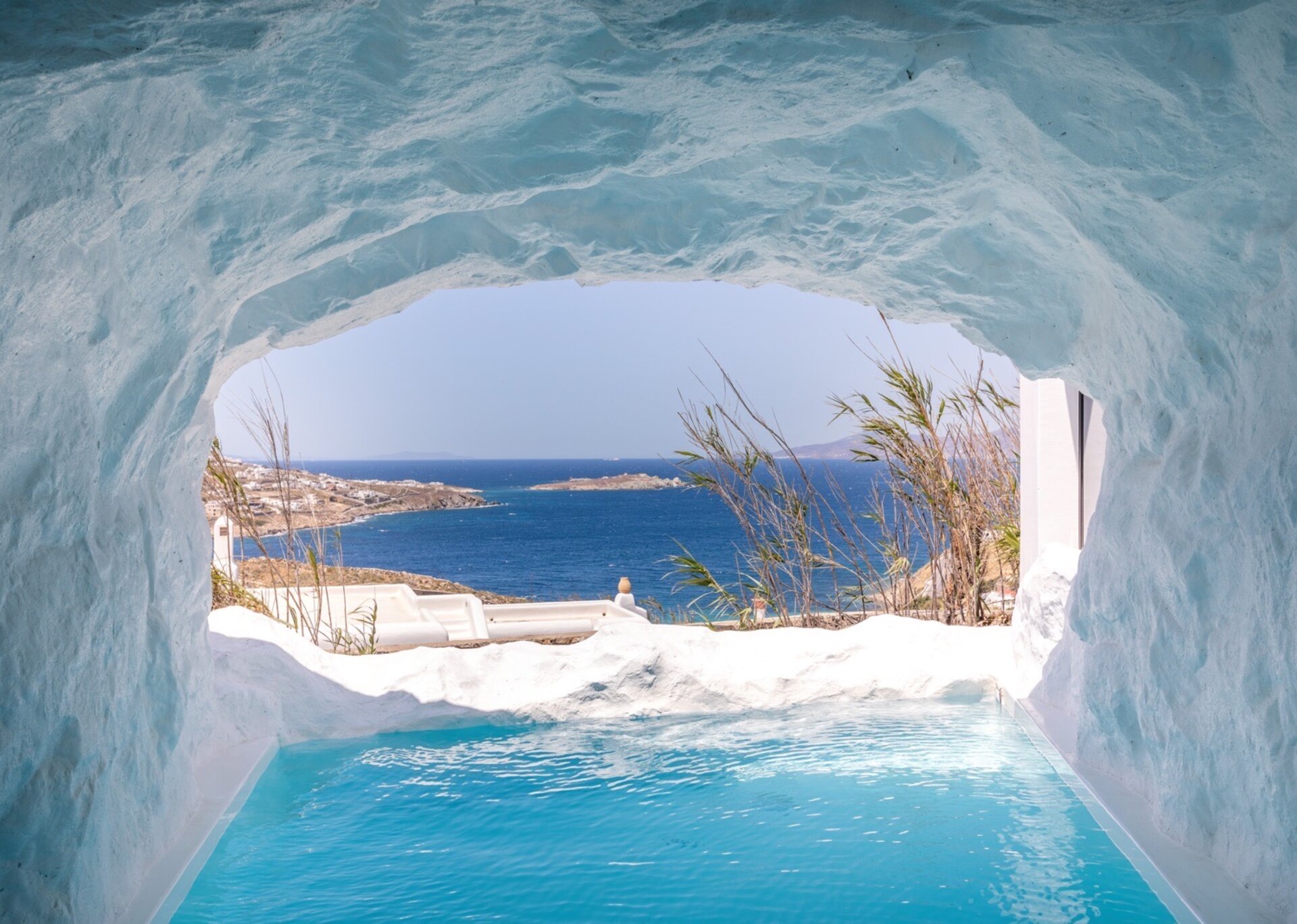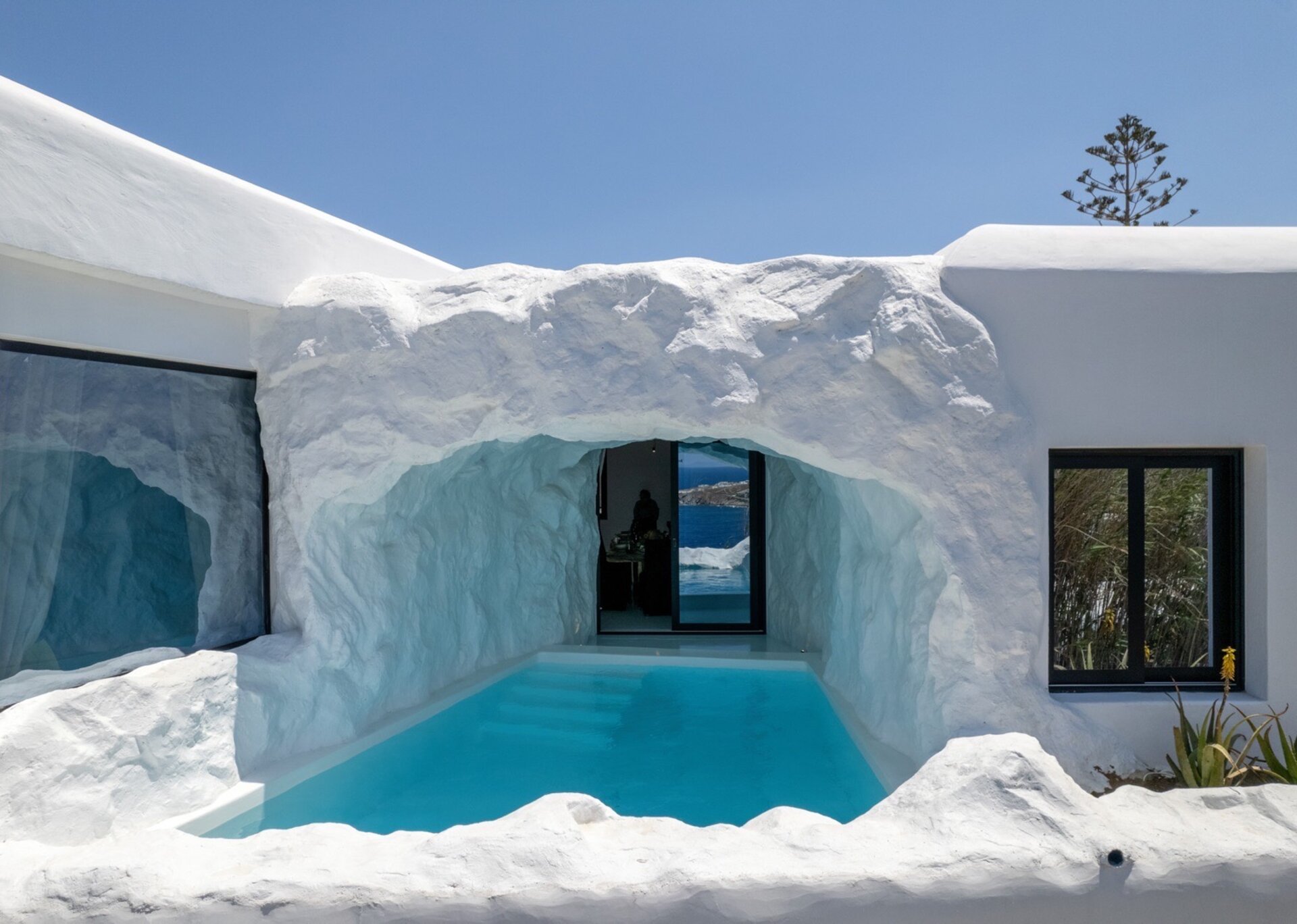 A stunning estate located in Mykonos island that offers a unique Cycladic ambience, villa Lelya is a luxurious adventure with numerous spoiling amenities. The main terrace features a decked swimming pool and a comfortable pergola-shaded lounge/ dining area that overlook the Aegean. The exceptional pool is surrounded with sun beds perfect for relaxation and sunbathing during the summer time. The outdoor area also includes a magnificent cave heated pool which is directly accessible from indoor through a balcony door and an outdoor Jacuzzi, ideal for private moments.