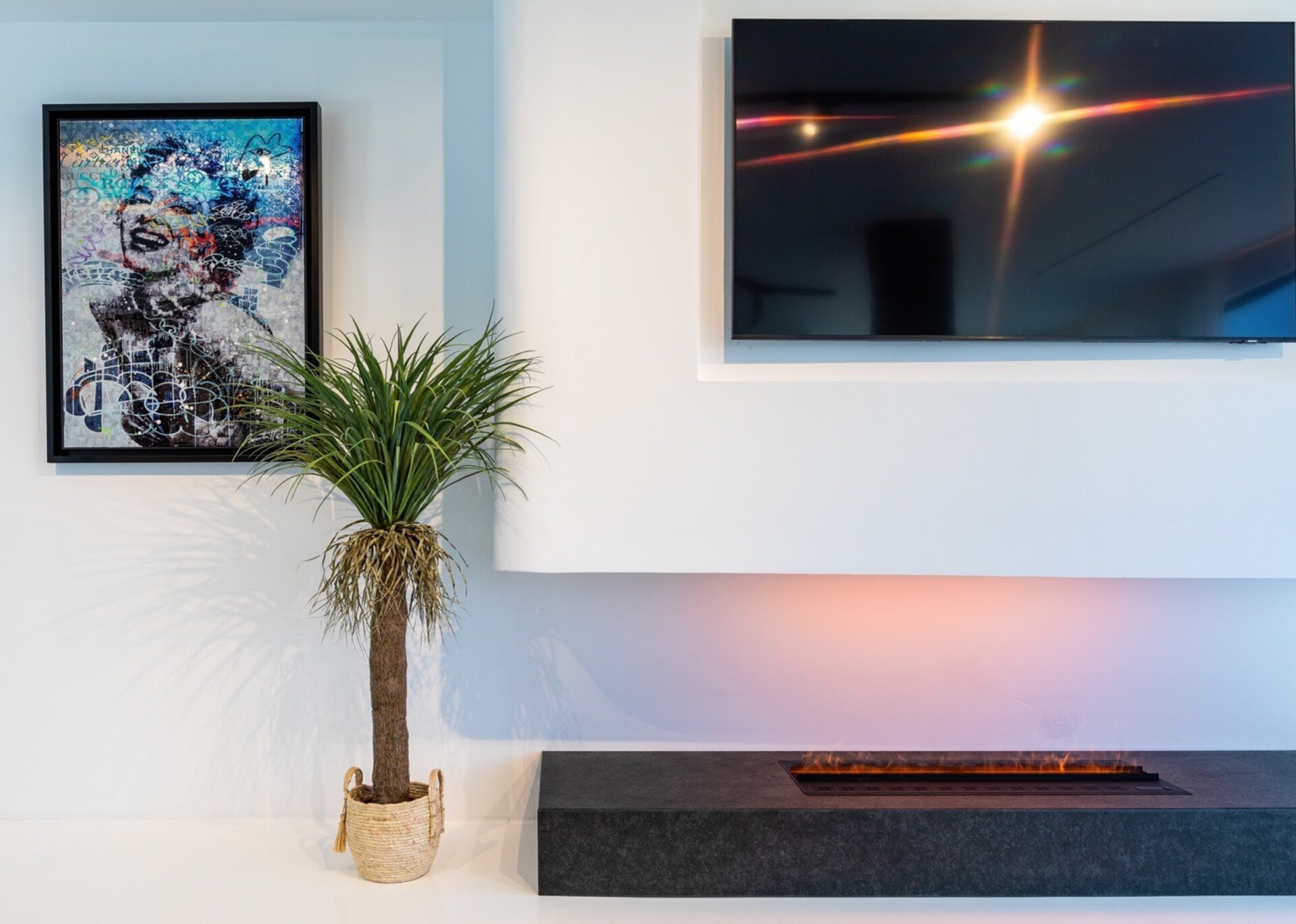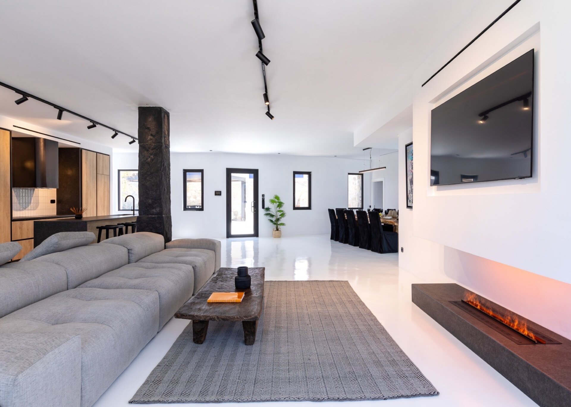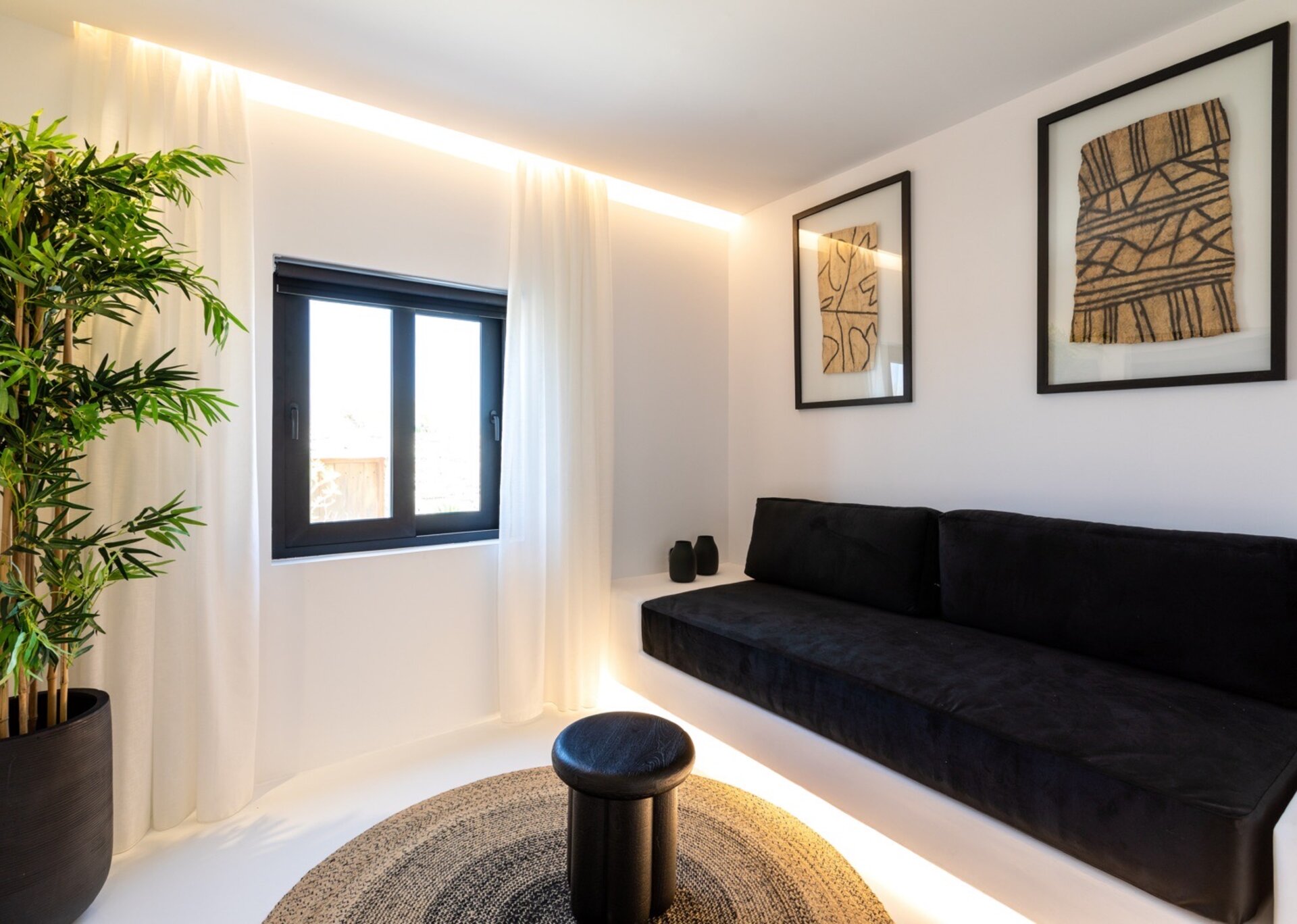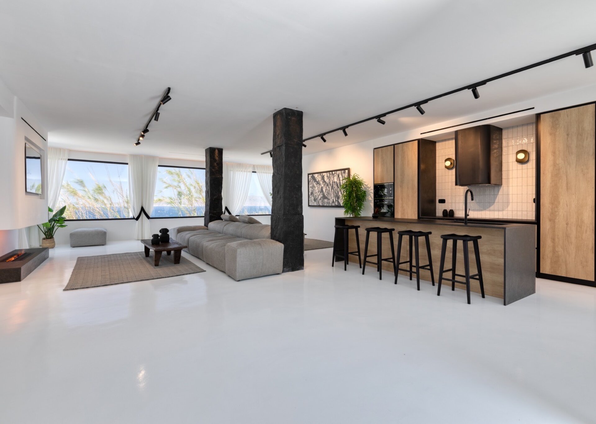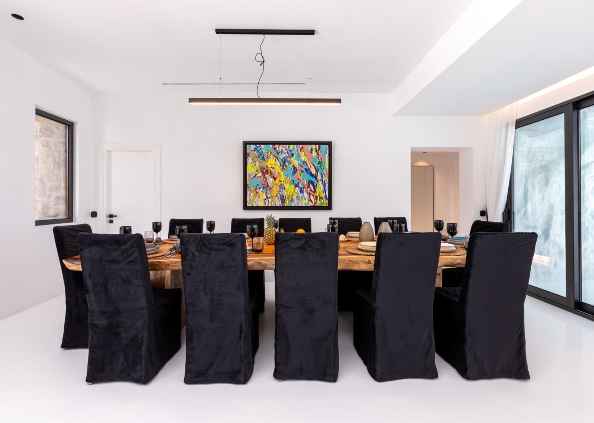Inside the house, space is ample, the mood lavish and the palette fashionably subtle. The decoration is crisp and elegant and the interior is bright and stripped of unnecessary details. The windows and the balcony doors welcome the Greek sun inside the house and blurs the physical boundaries between the indoor and the outdoor spaces. Inside the house there is also a spacious dining room full of light and very comfortable for Lelya's guests.