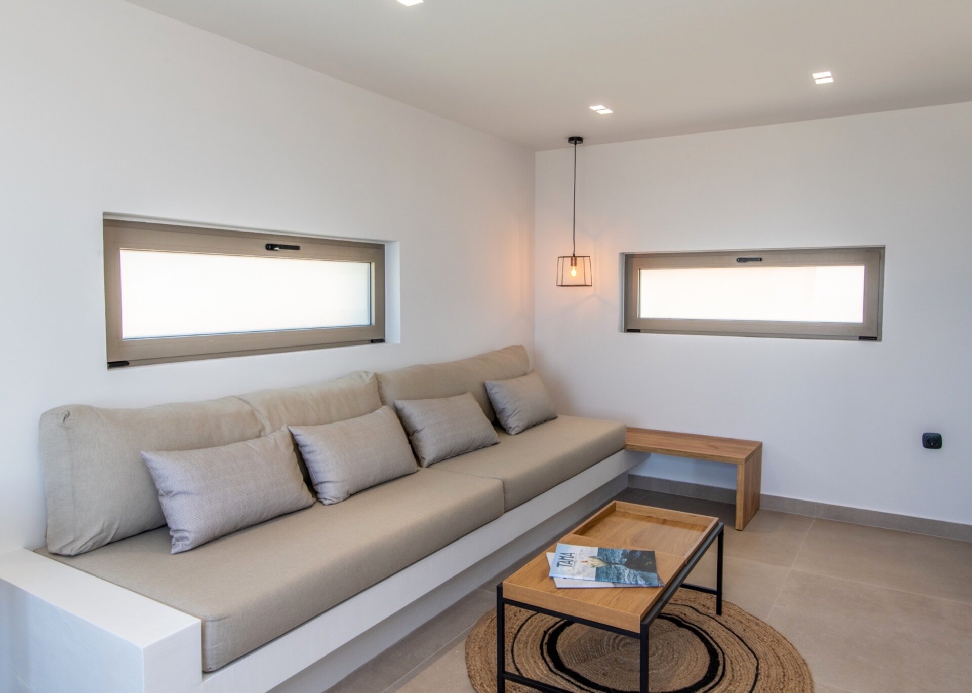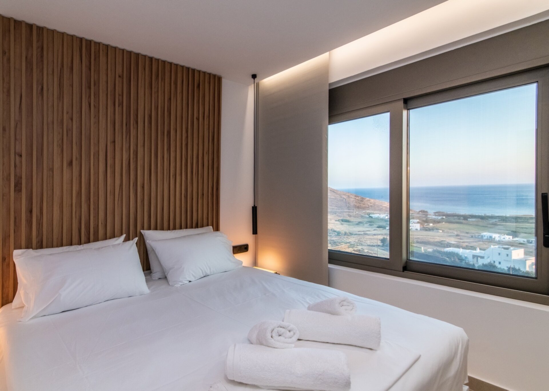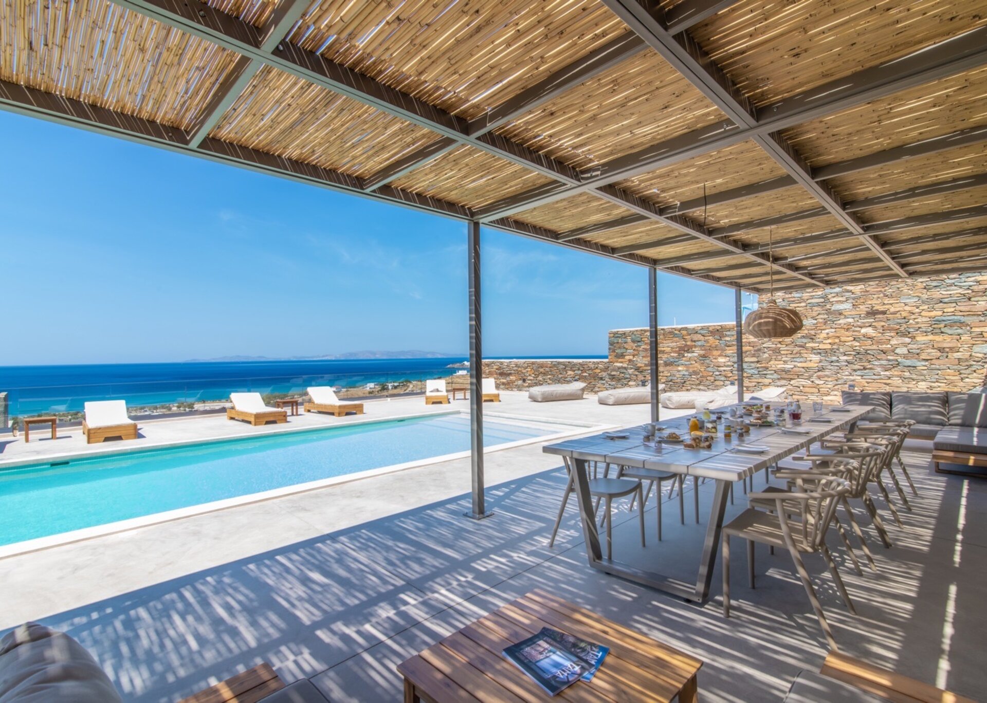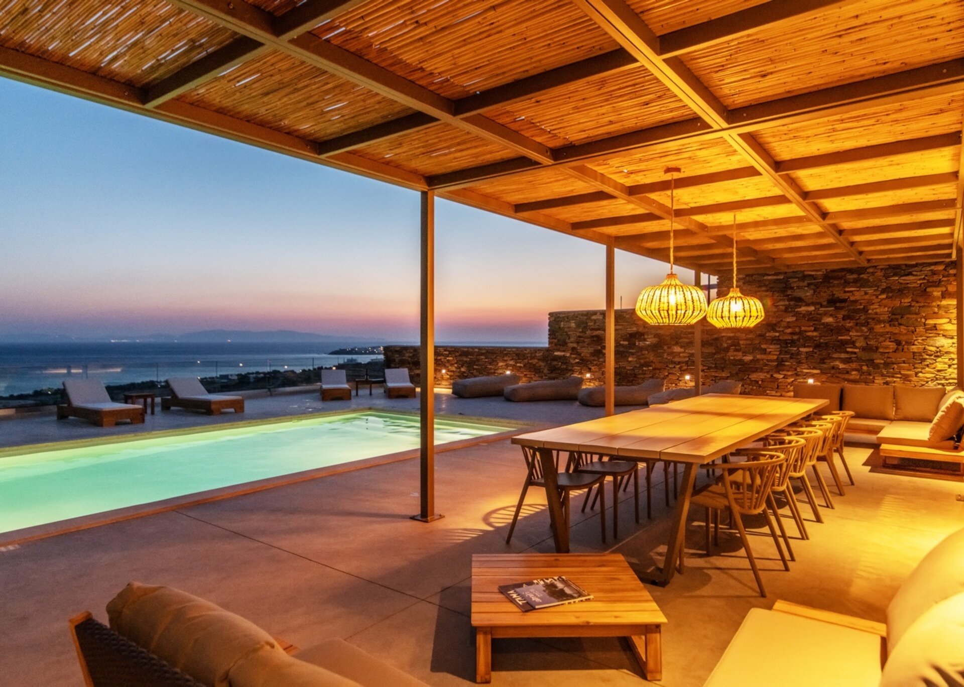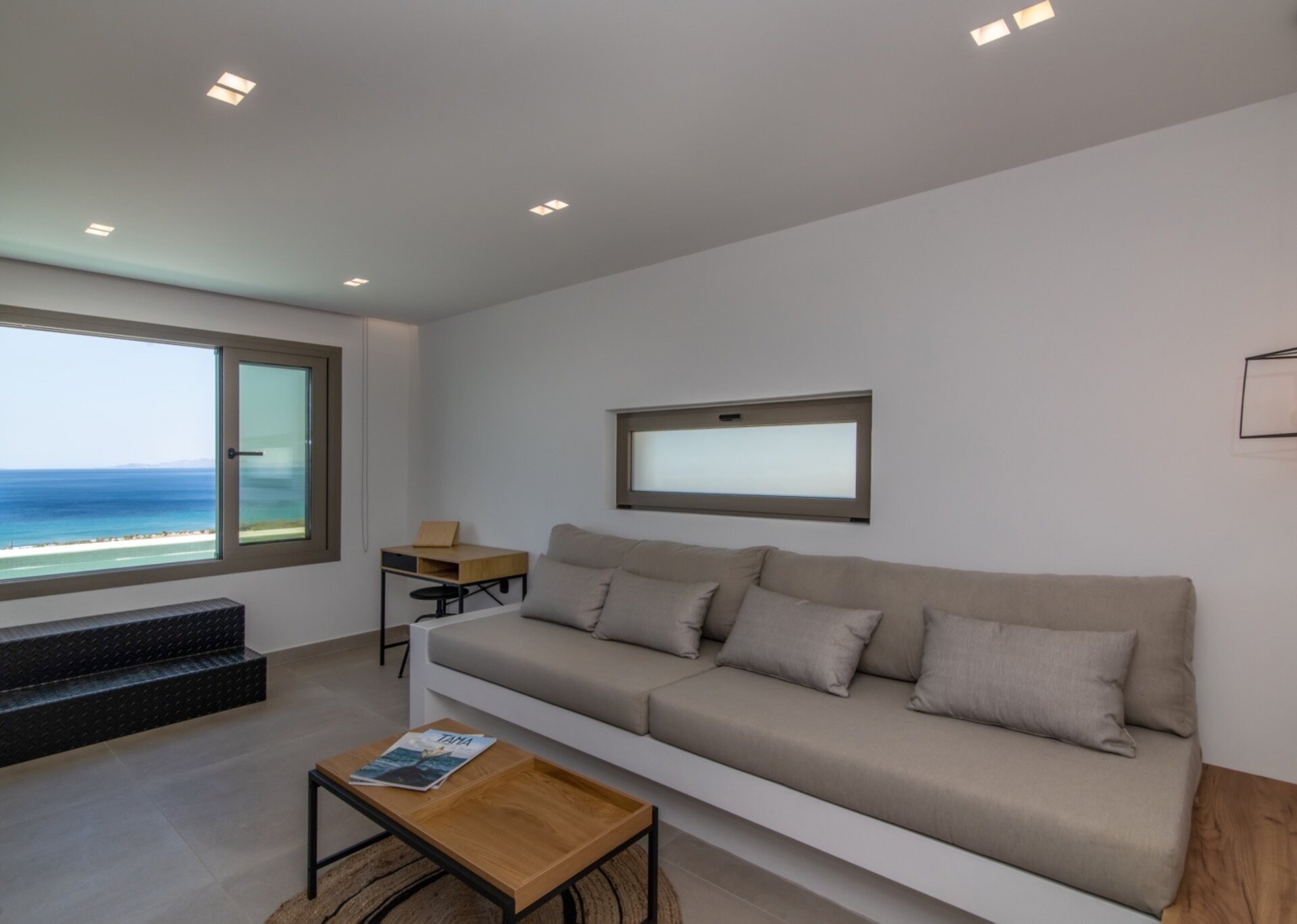 The outdoor spaces are equally captivating, offering panoramic views of the rugged coastline and the shimmering Aegean from every vantage point. Here, luxury meets nature, providing an unparalleled sense of freedom and tranquility.