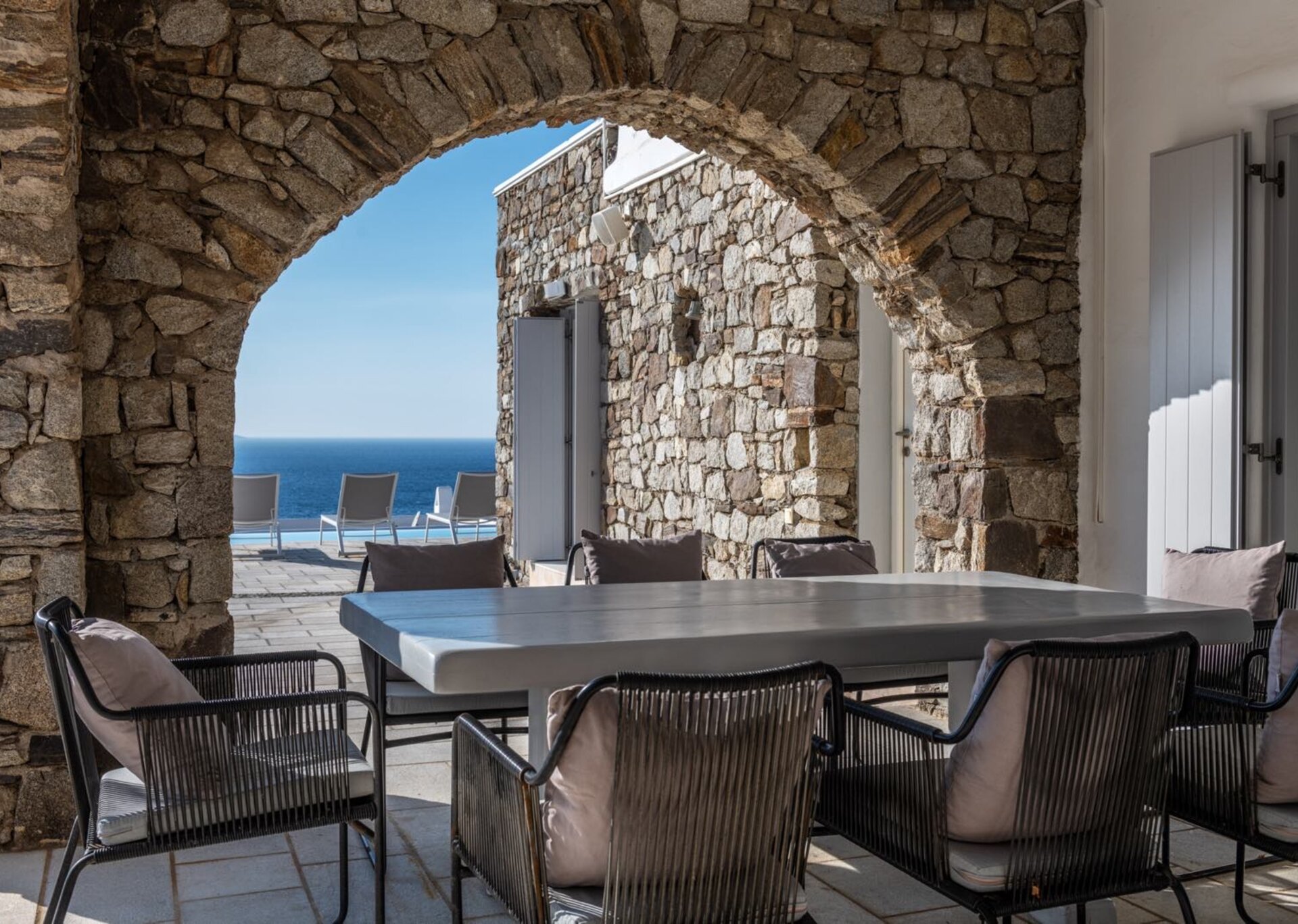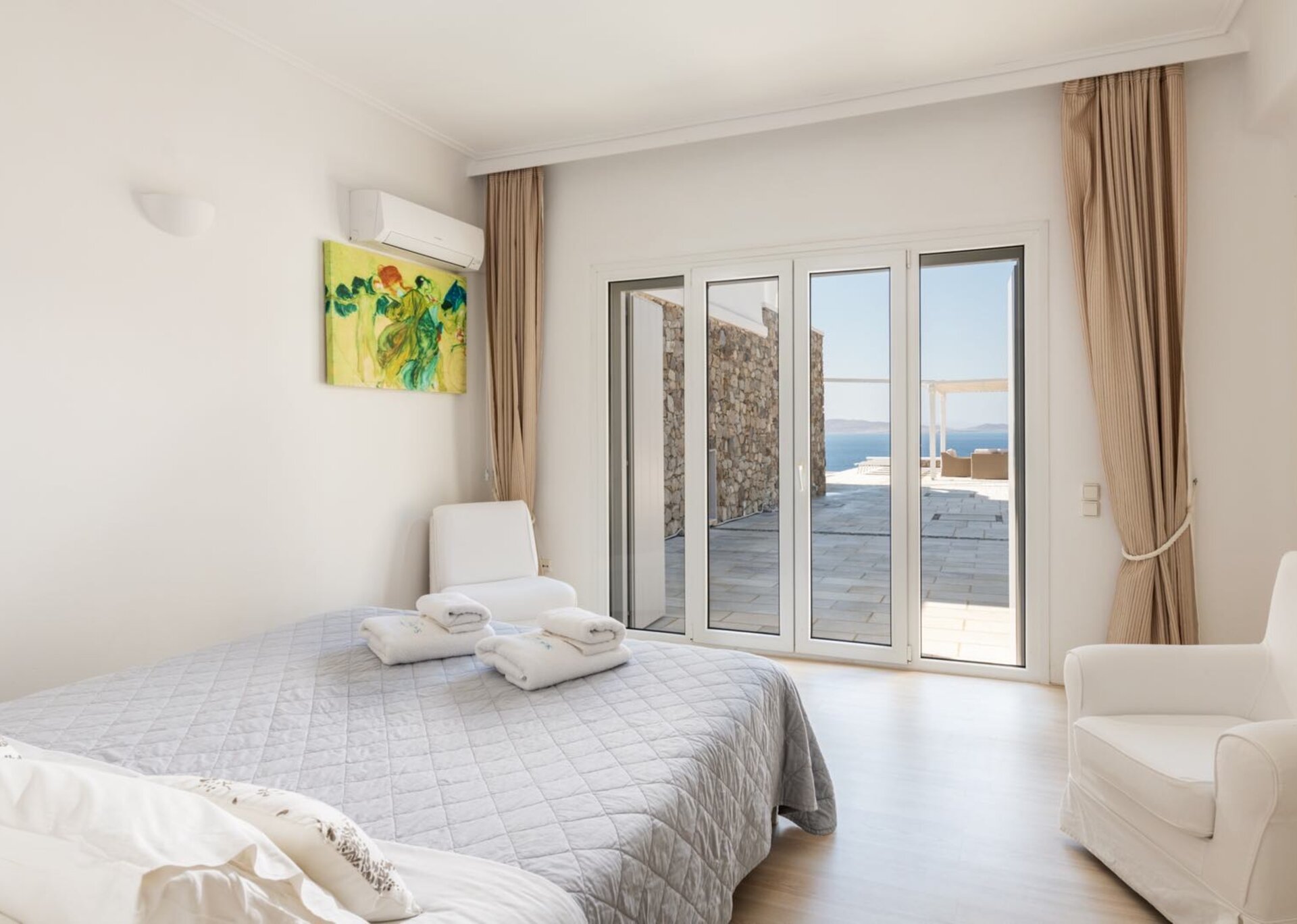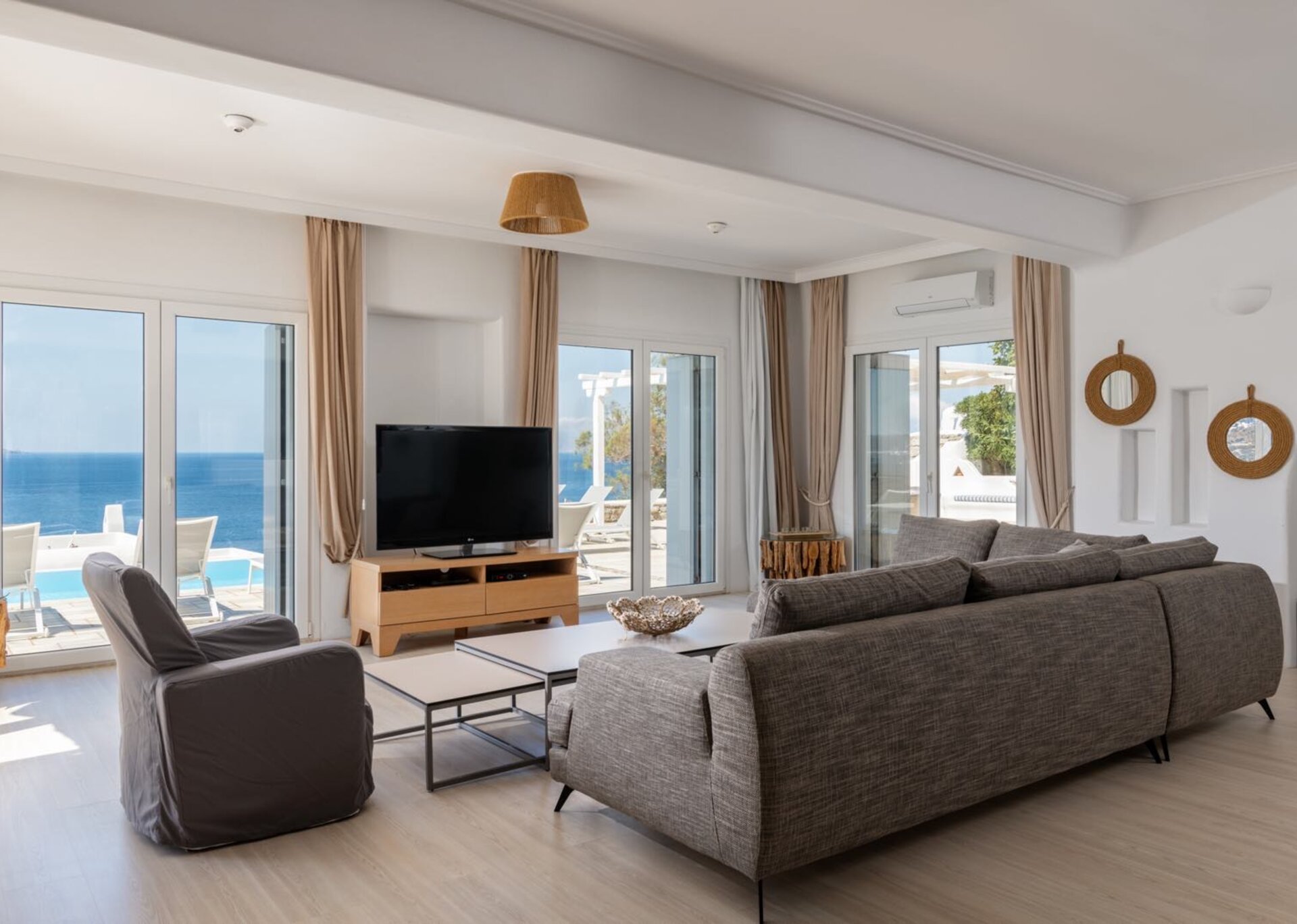 The living room is decorated with elegant and modern white furniture. The fully equipped kitchen and formal dining area feature large windows and balconies overlooking the pool and the sea, offering a panoramic view of the Aegean even while indoors. One master bedroom with TV, safe and en suite bathroom and one double bedroom with separate bathroom are located on the ground floor. The upper floor features a master bedroom with TV and safe and 2 similar bedrooms, all having their own en suite bathrooms and private terraces.