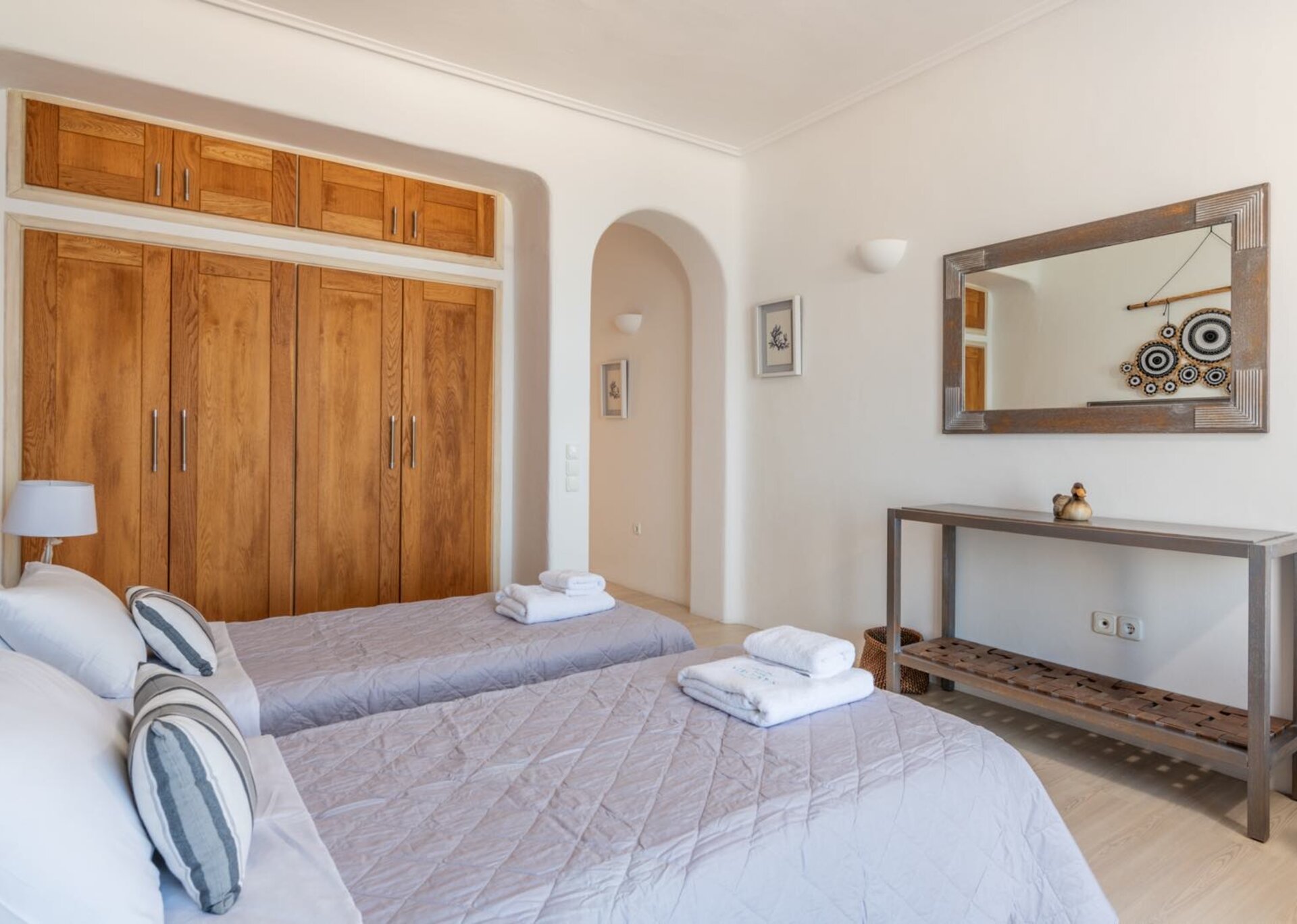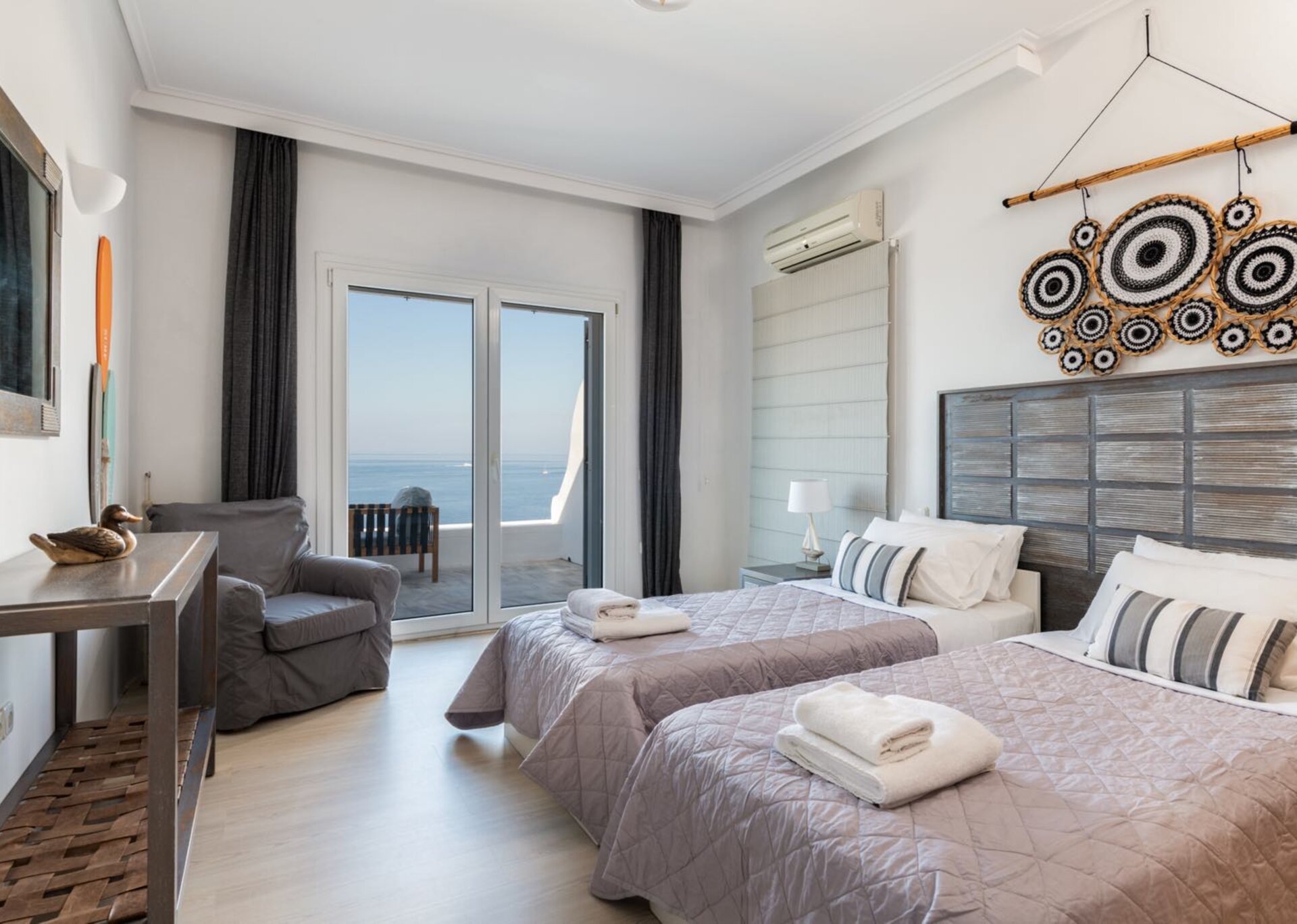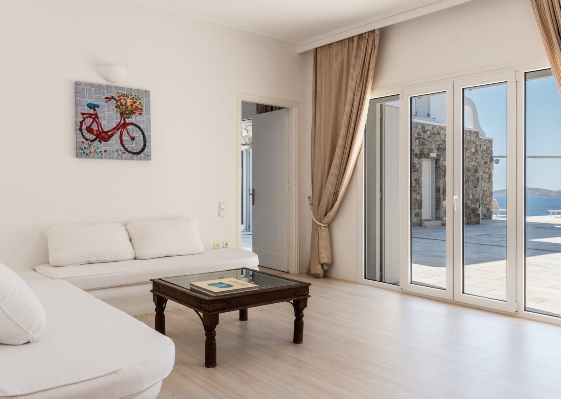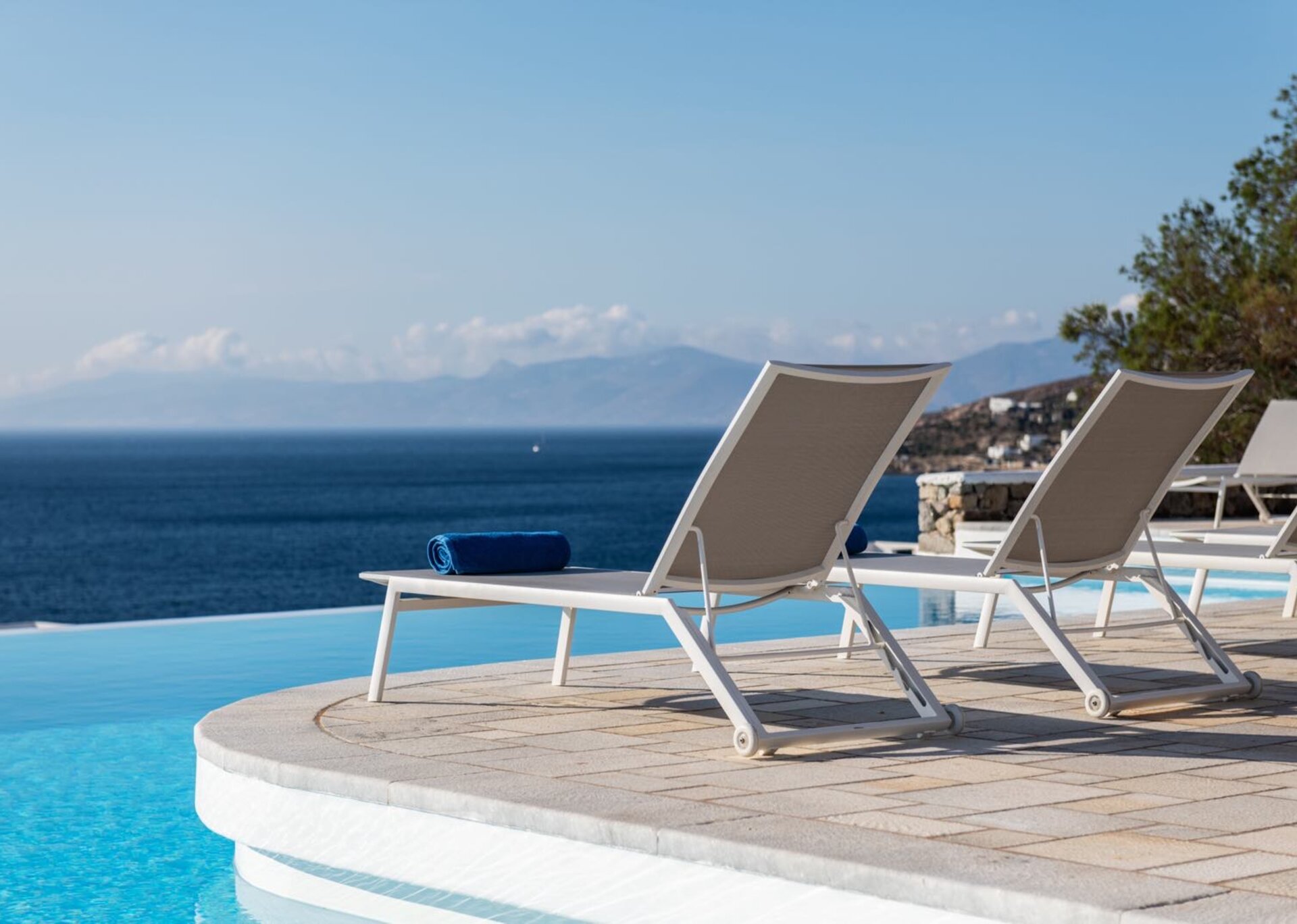 The living room is decorated with elegant and modern white furniture. The fully equipped kitchen and formal dining area feature large windows and balconies overlooking the pool and the sea, offering a panoramic view of the Aegean even while indoors. One master bedroom with TV, safe and en suite bathroom and one double bedroom with separate bathroom are located on the ground floor. The upper floor features a master bedroom with TV and safe and 2 similar bedrooms, all having their own en suite bathrooms and private terraces.