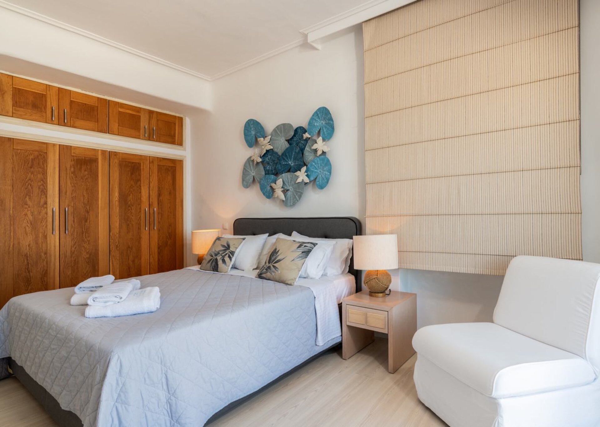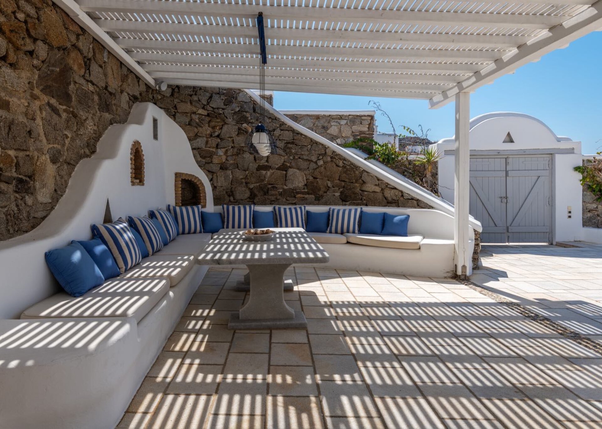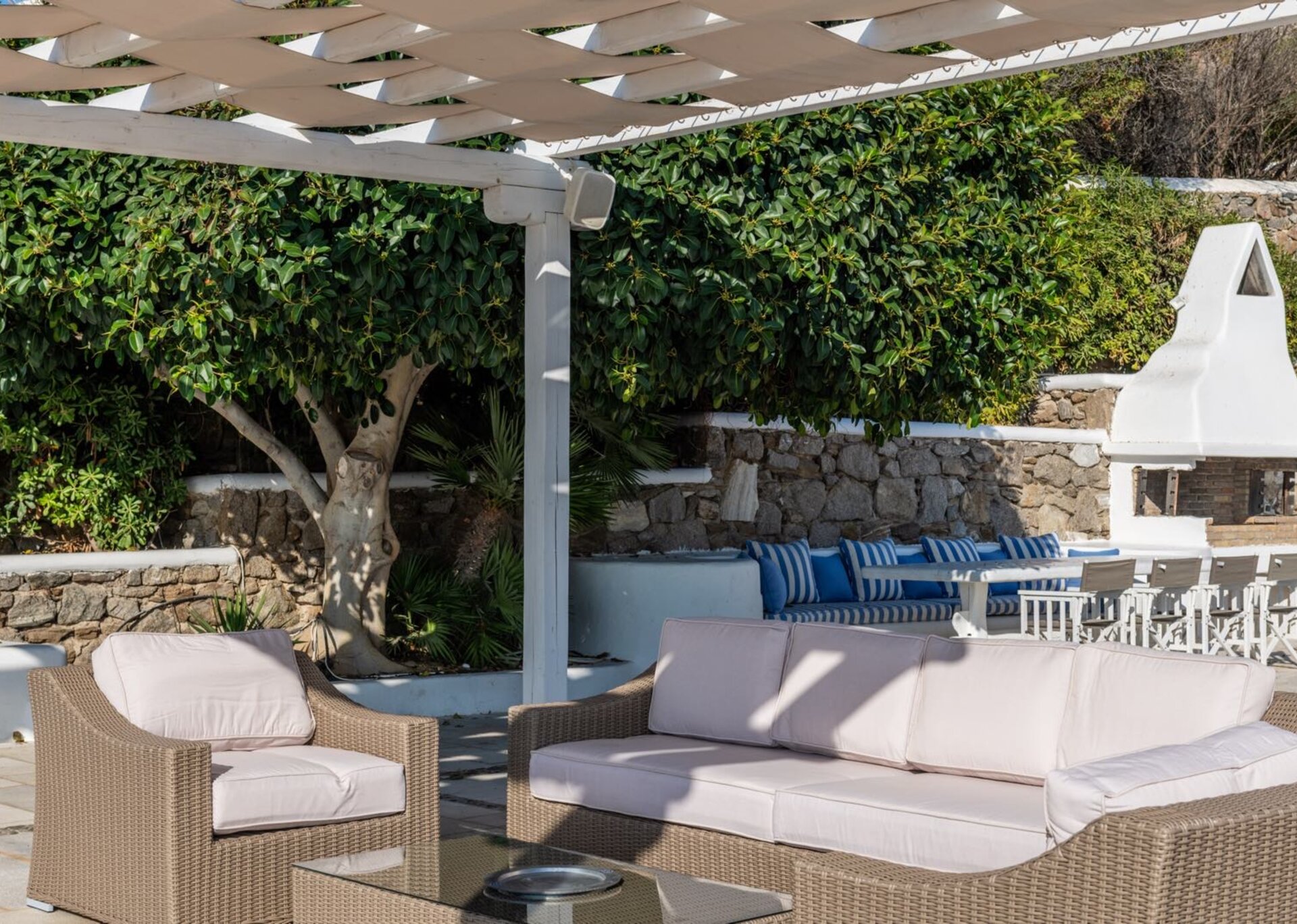 The house is surrounded by various spacious white-stone terraces and relaxation areas as well as a huge pond-style waterfront infinity pool. In the pool, the beautiful marble deck with comfortable sun-chairs promise a relaxing morning and afternoon and the two spacious outdoor dining and BBQ areas are perfect for cocktail parties and open-air dinners.