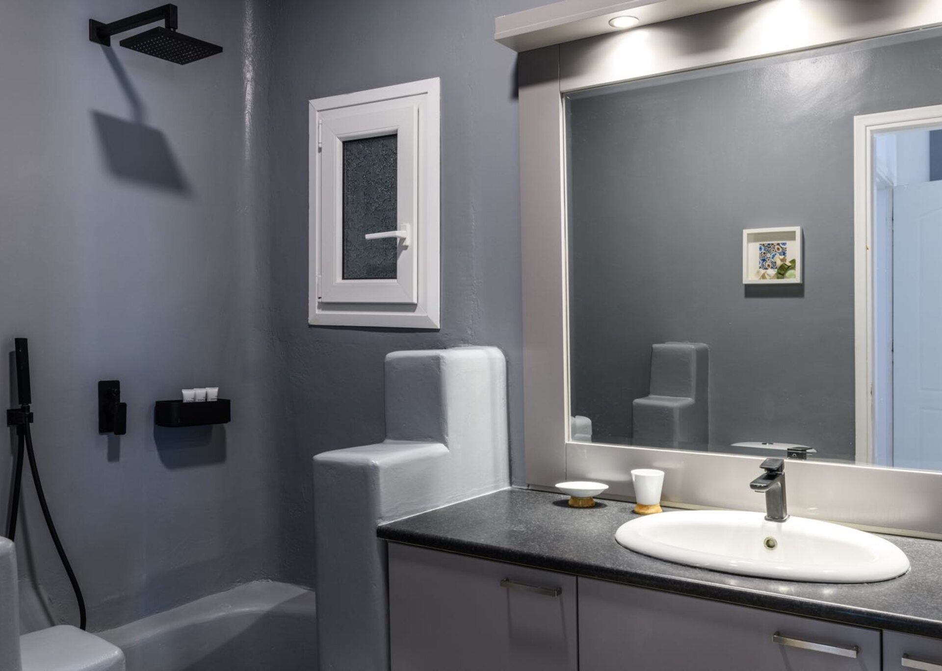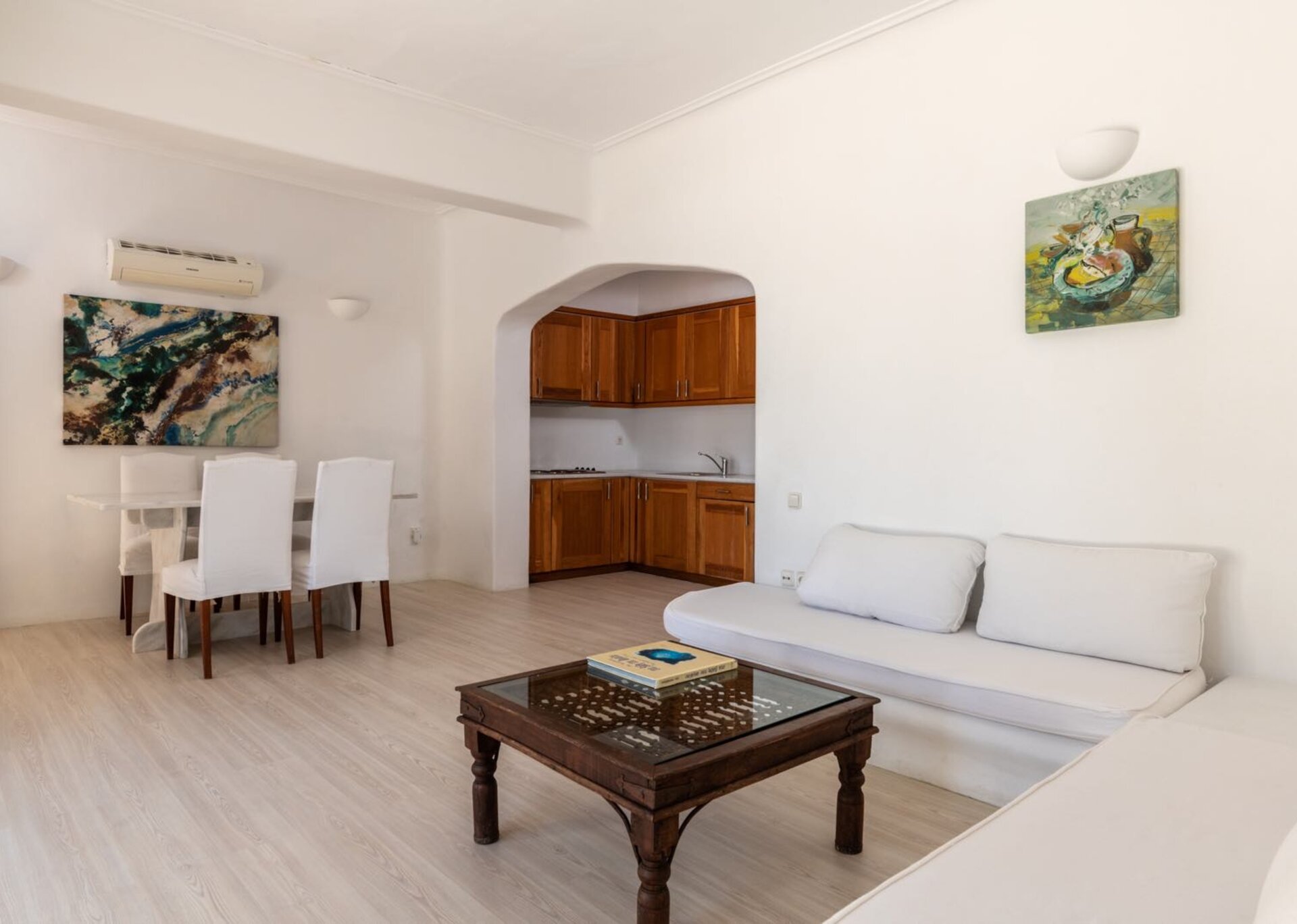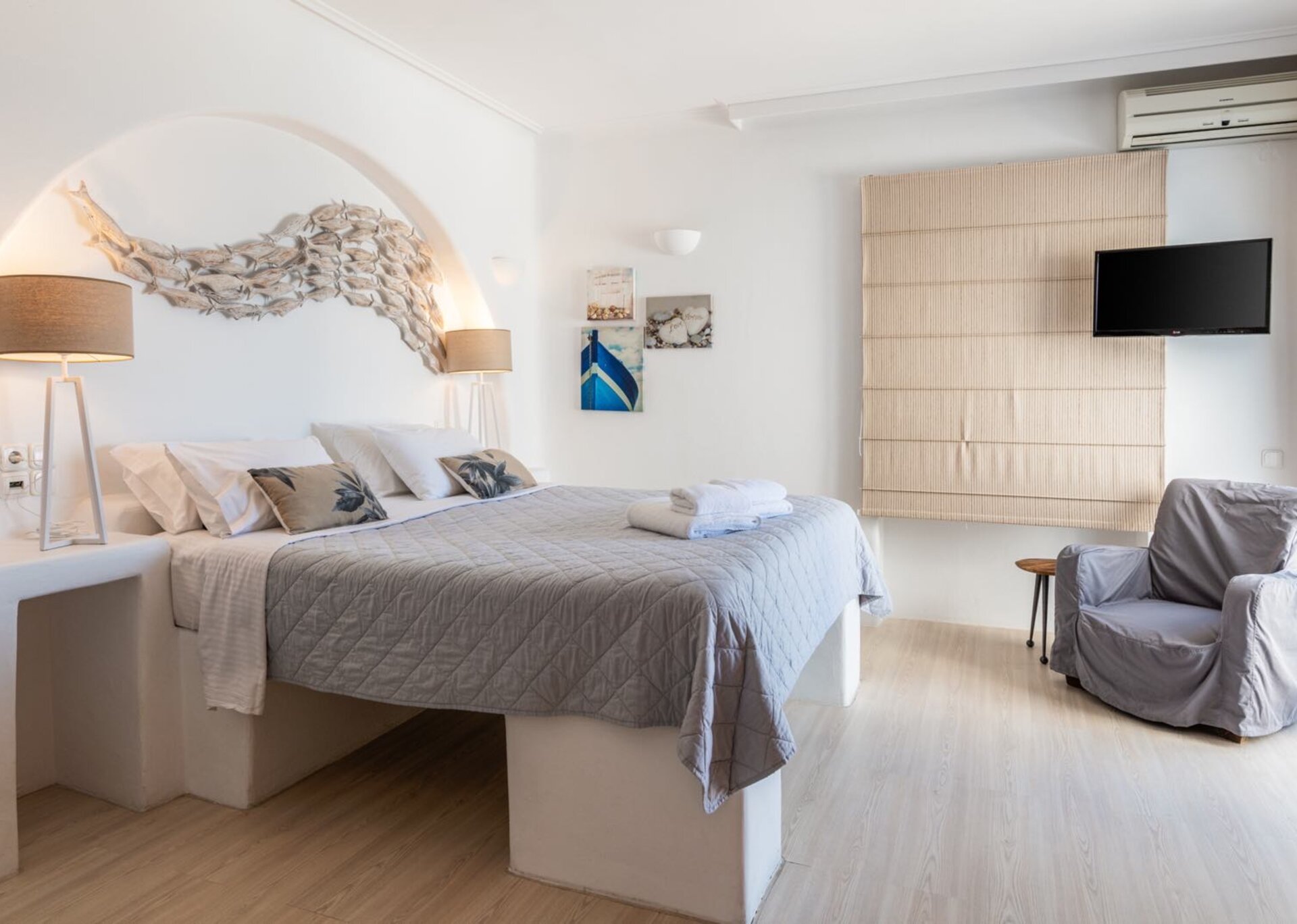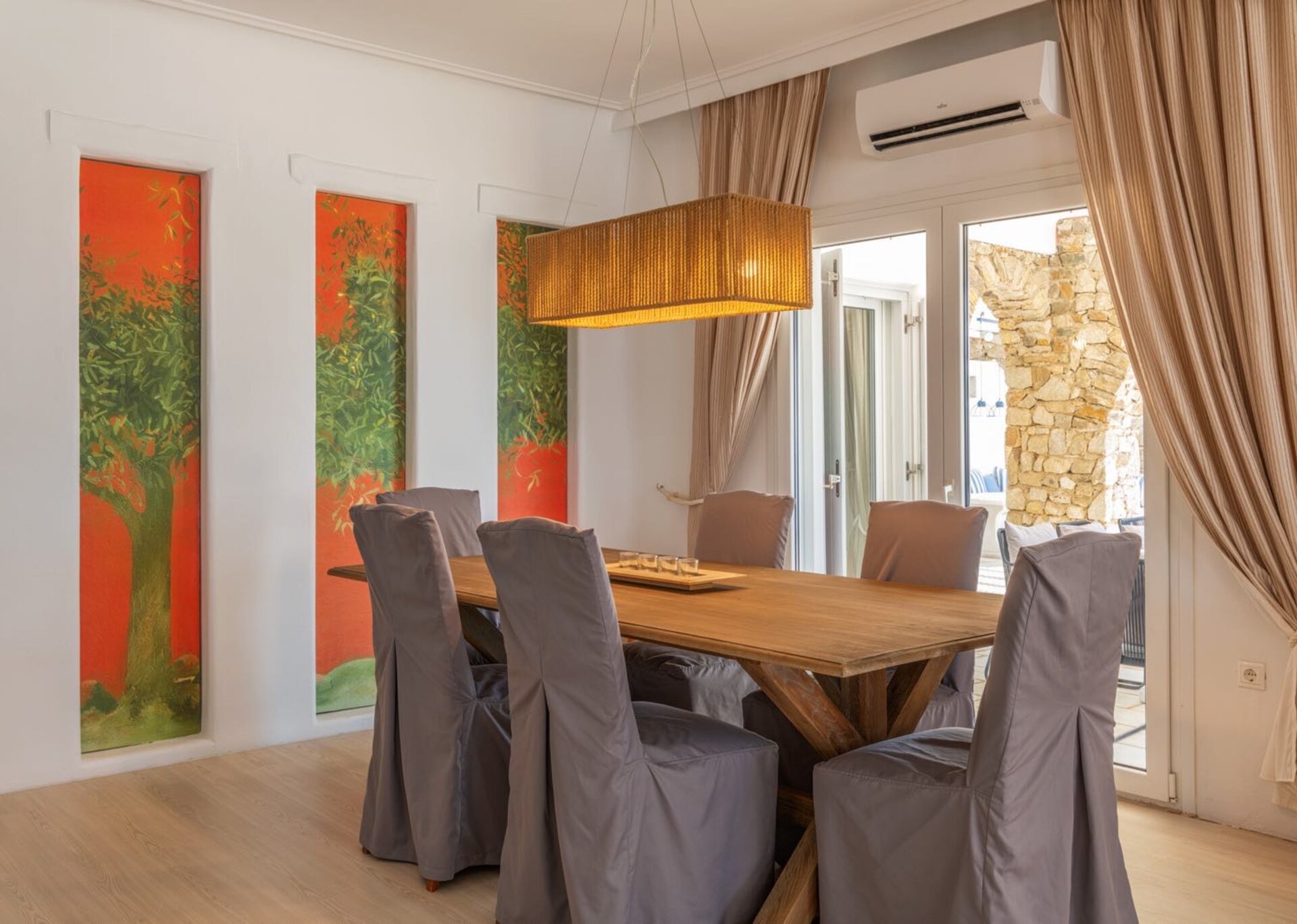 It is located just 4 km away from the Town, 5 km from the airport and 1.5km from Ornos.