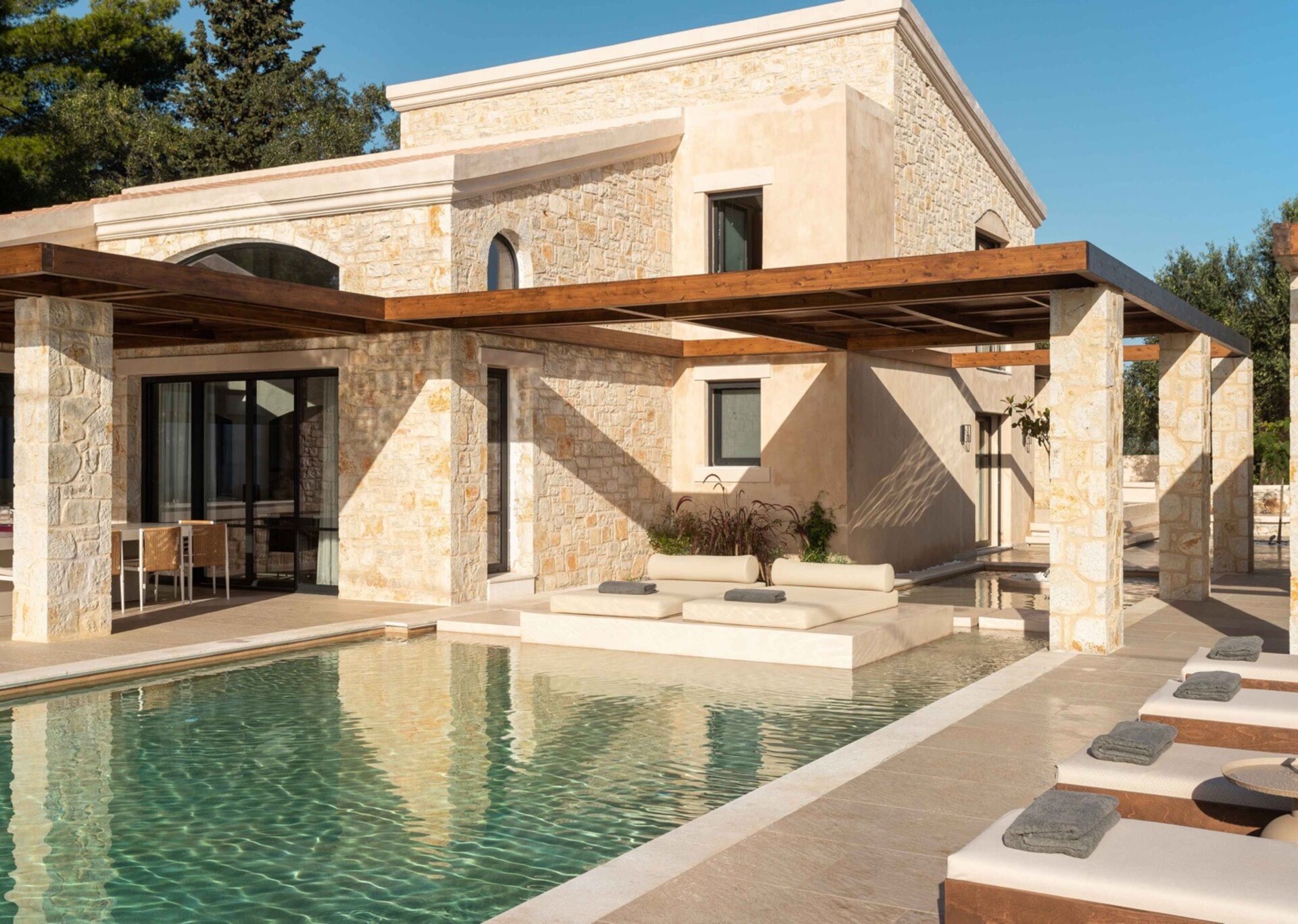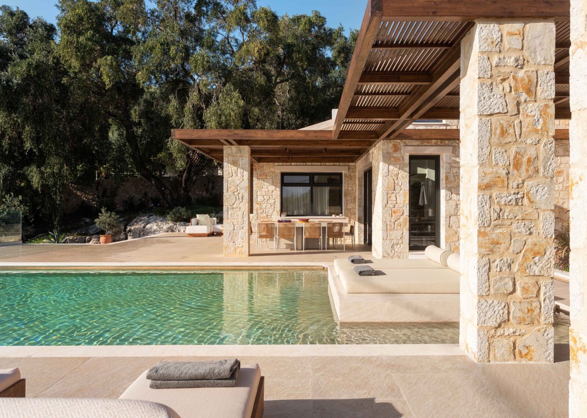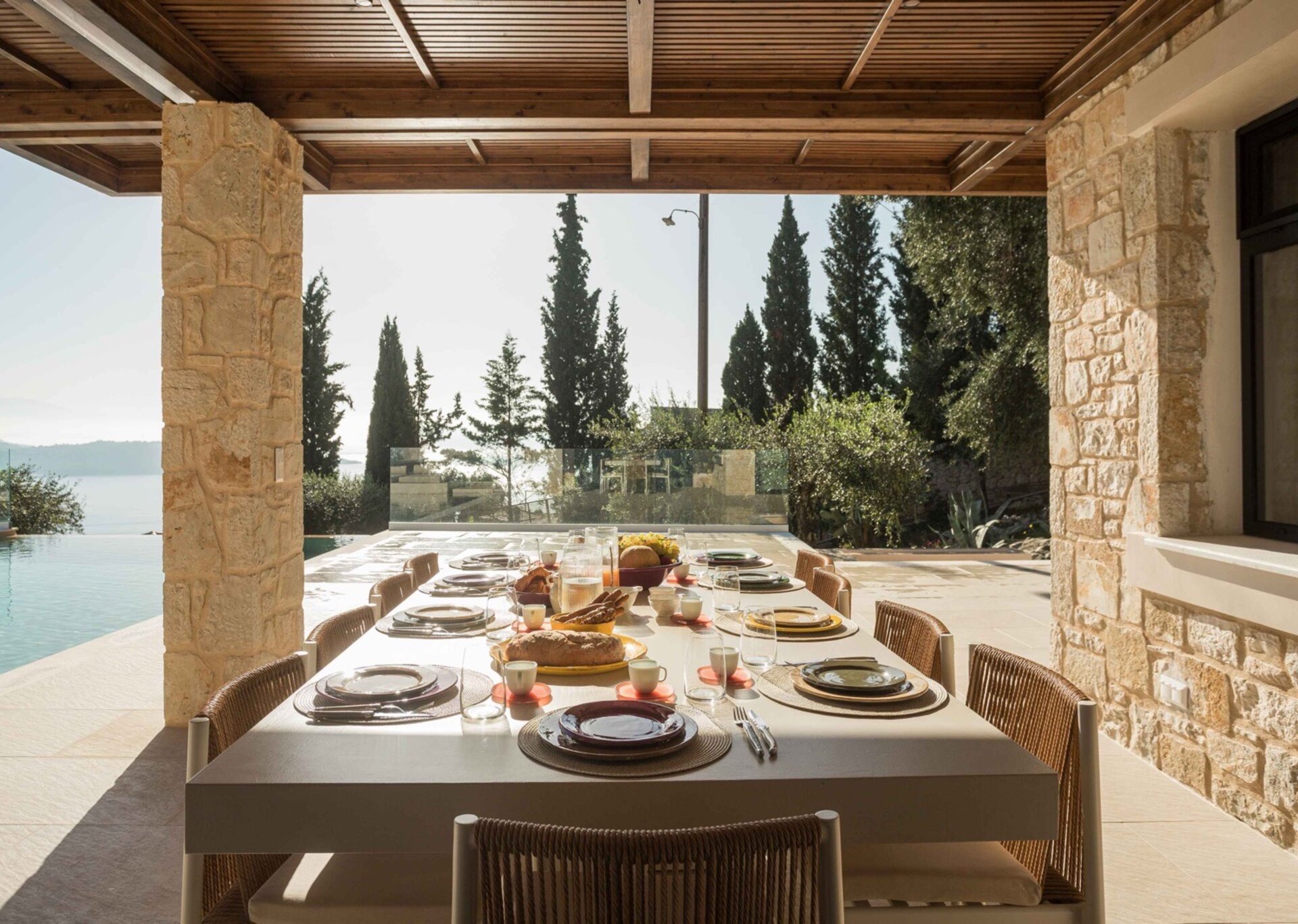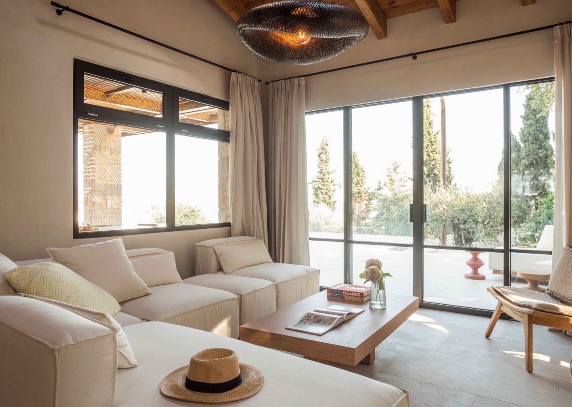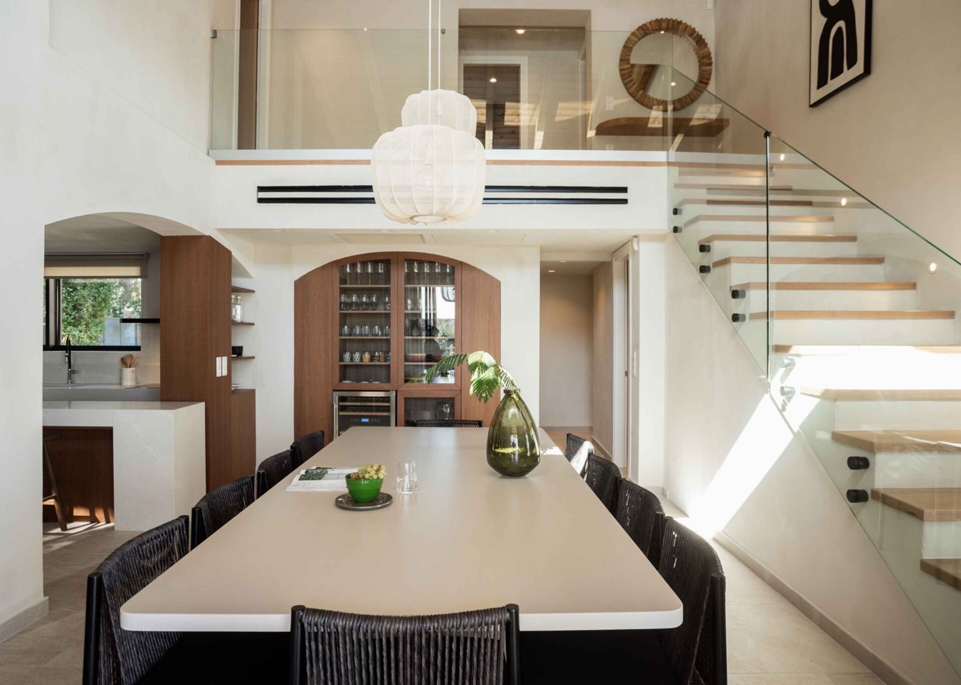 The voluminous open-plan layout of the villa greets guests with a spacious living room and dining area that open to a fully equipped modern kitchen. Floor-to-ceiling windows that open to the swimming pool terrace afford a panoramic view while a high, beamed ceiling amplifies the sense of spaciousness. A master bedroom with an en-suite bathroom that opens to a garden and a double or twin en-suite bathroom are located on the ground floor. The top floor of the villa features three double en-suite bedrooms, one with a bathtub bathroom, each offering stunning views of the surrounding area and the sea. All bedrooms are beautifully designed with immaculate taste and a cosy atmosphere that will make you rethink leaving them in the morning.