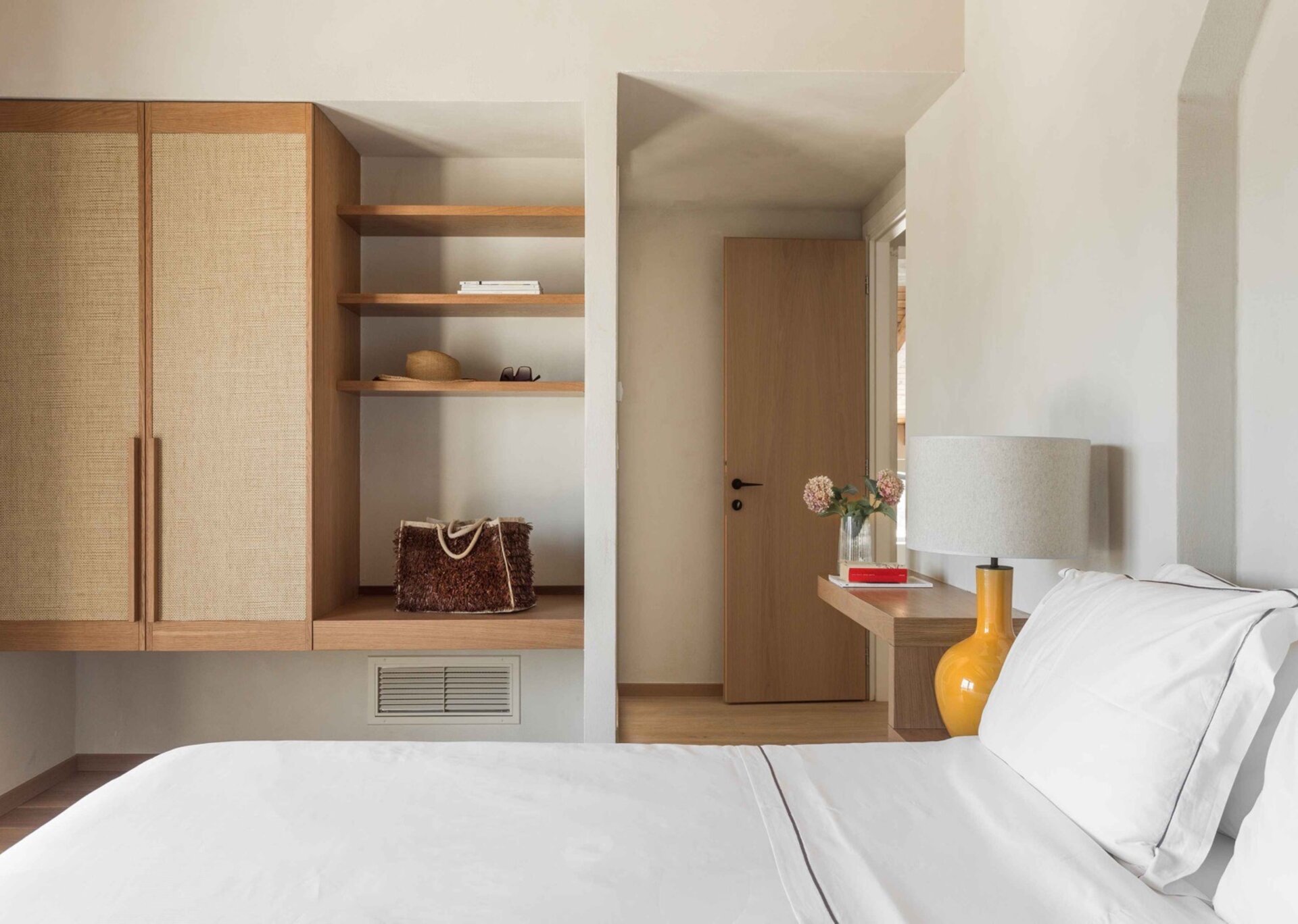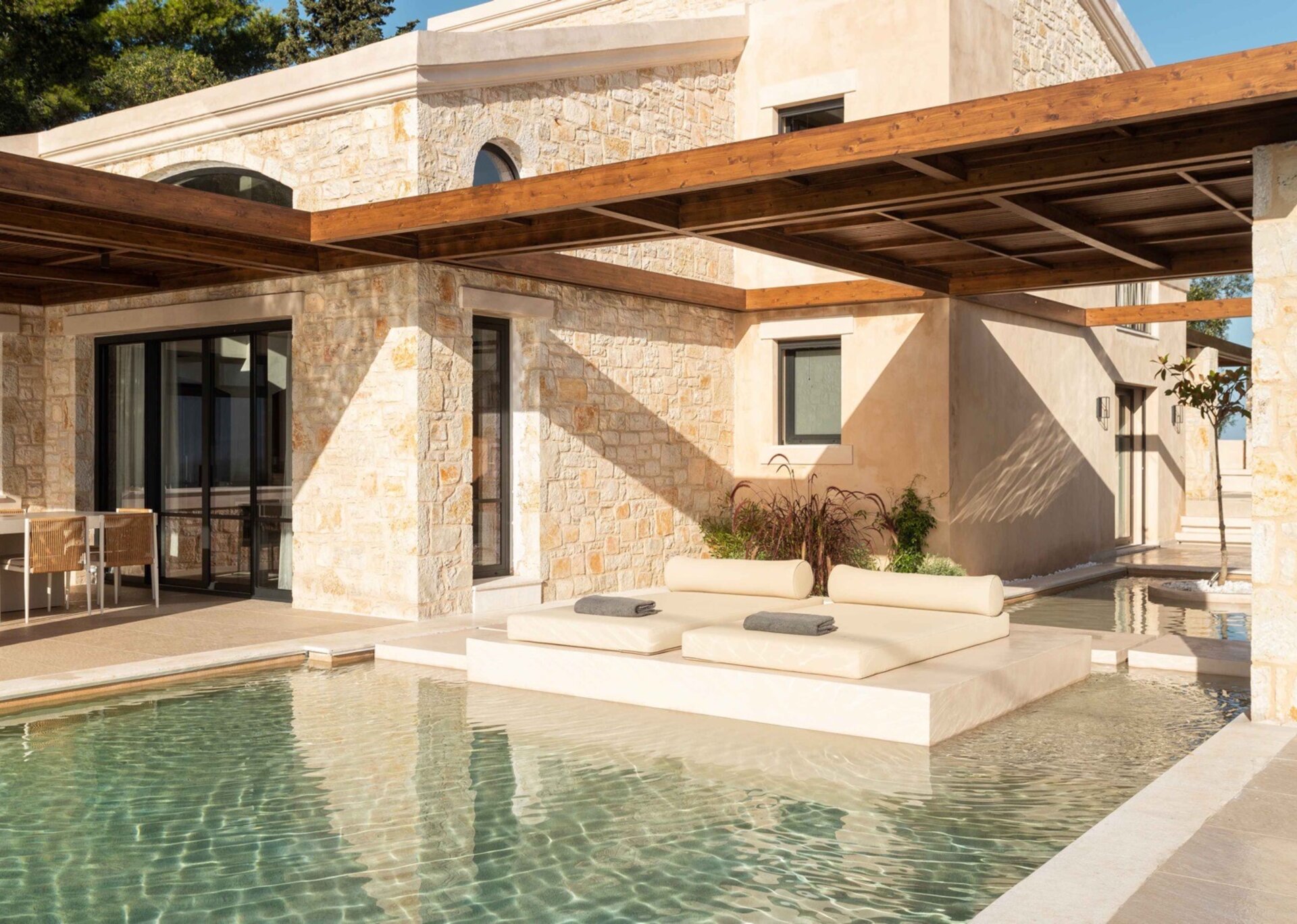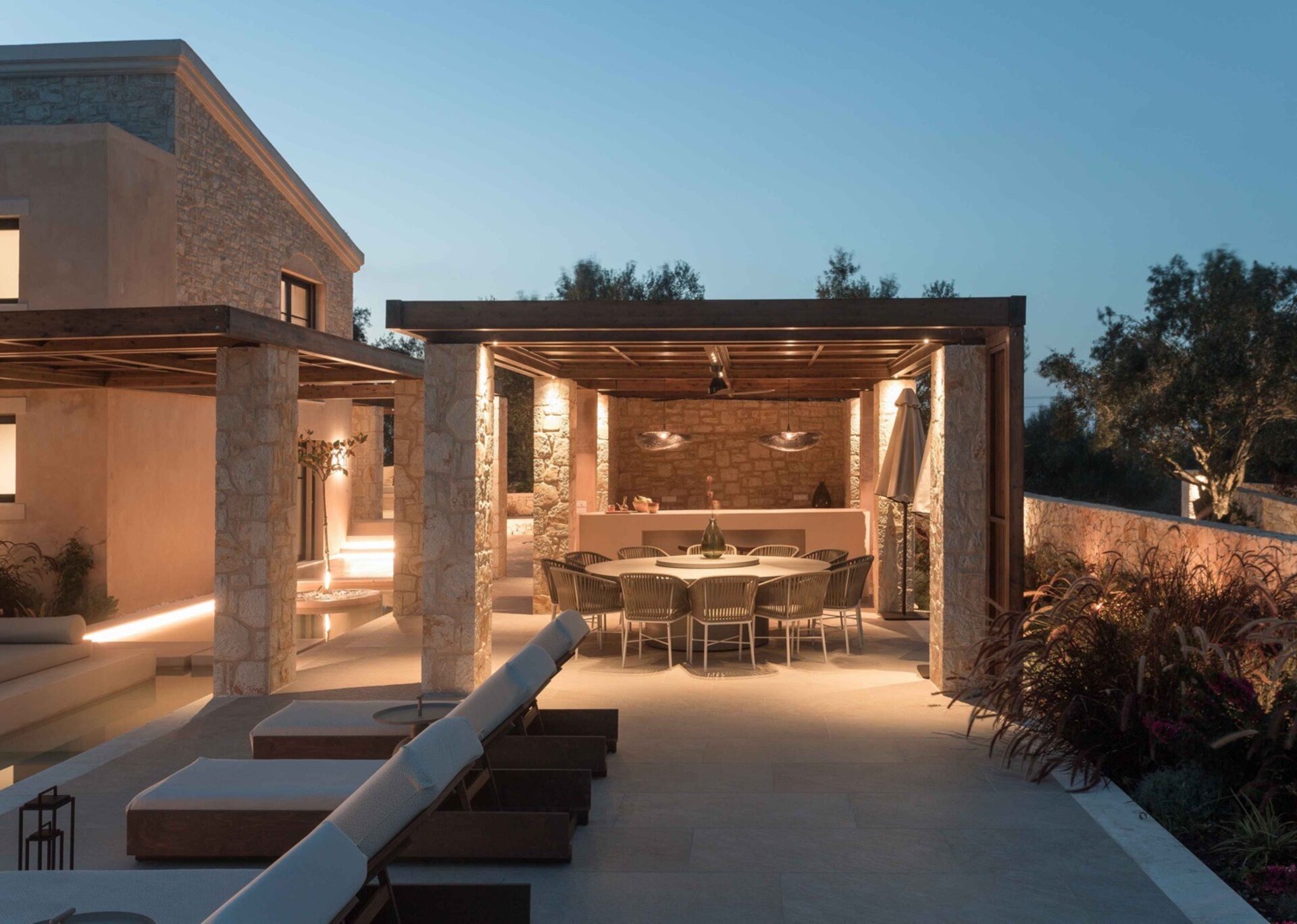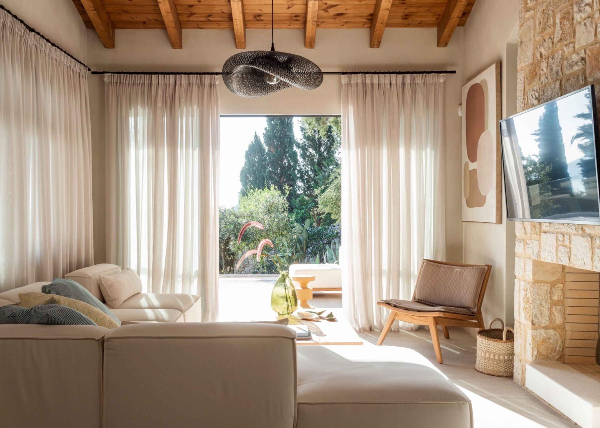 The voluminous open-plan layout of the villa greets guests with a spacious living room and dining area that open to a fully equipped modern kitchen. Floor-to-ceiling windows that open to the swimming pool terrace afford a panoramic view while a high, beamed ceiling amplifies the sense of spaciousness. A master bedroom with an en-suite bathroom that opens to a garden and a double or twin en-suite bathroom are located on the ground floor. The top floor of the villa features three double en-suite bedrooms, one with a bathtub bathroom, each offering stunning views of the surrounding area and the sea. All bedrooms are beautifully designed with immaculate taste and a cosy atmosphere that will make you rethink leaving them in the morning.