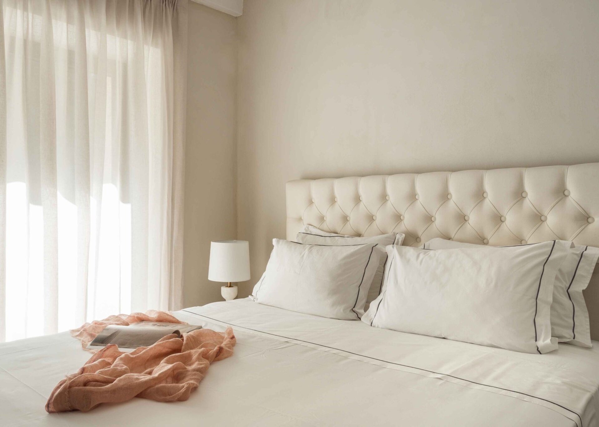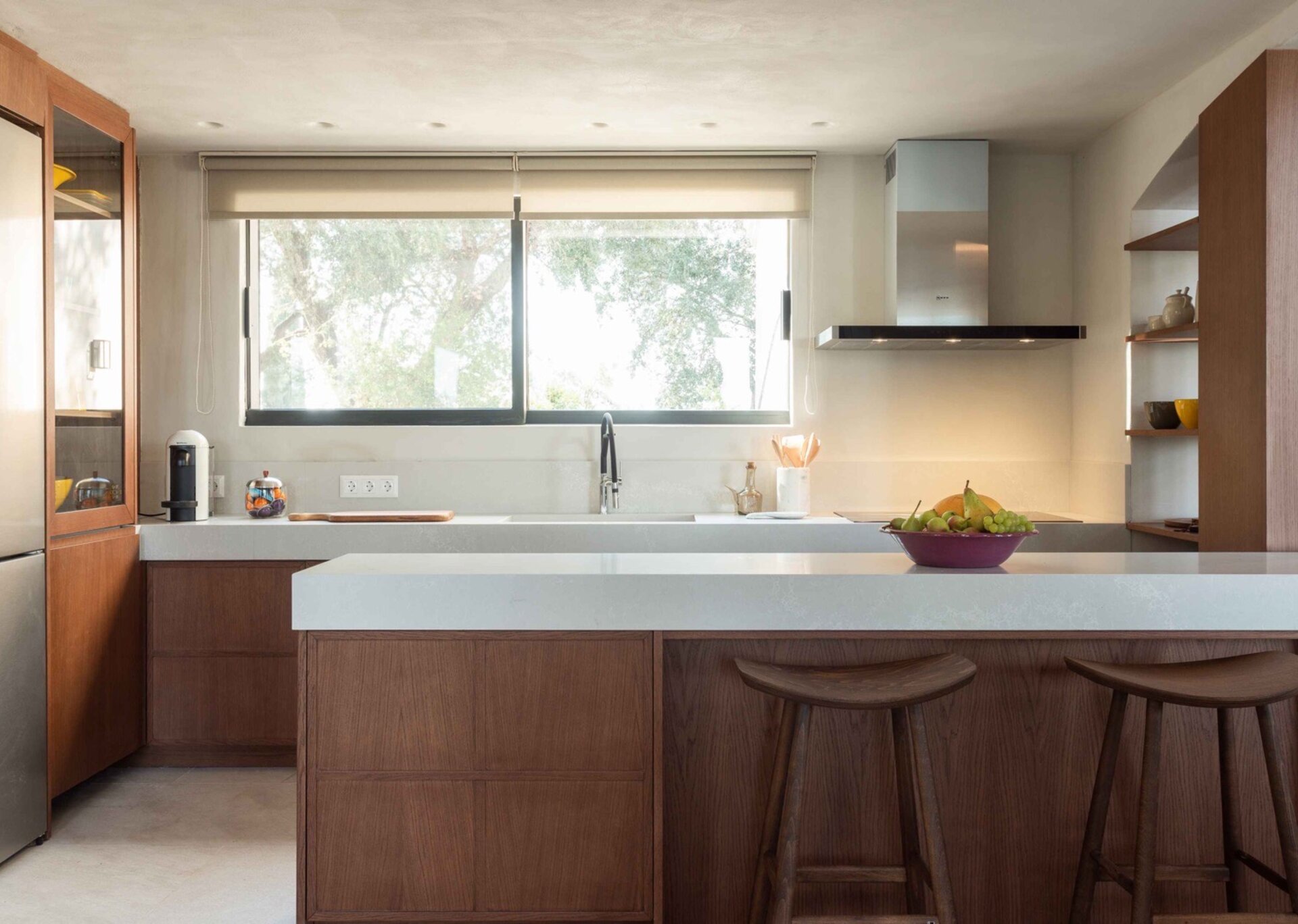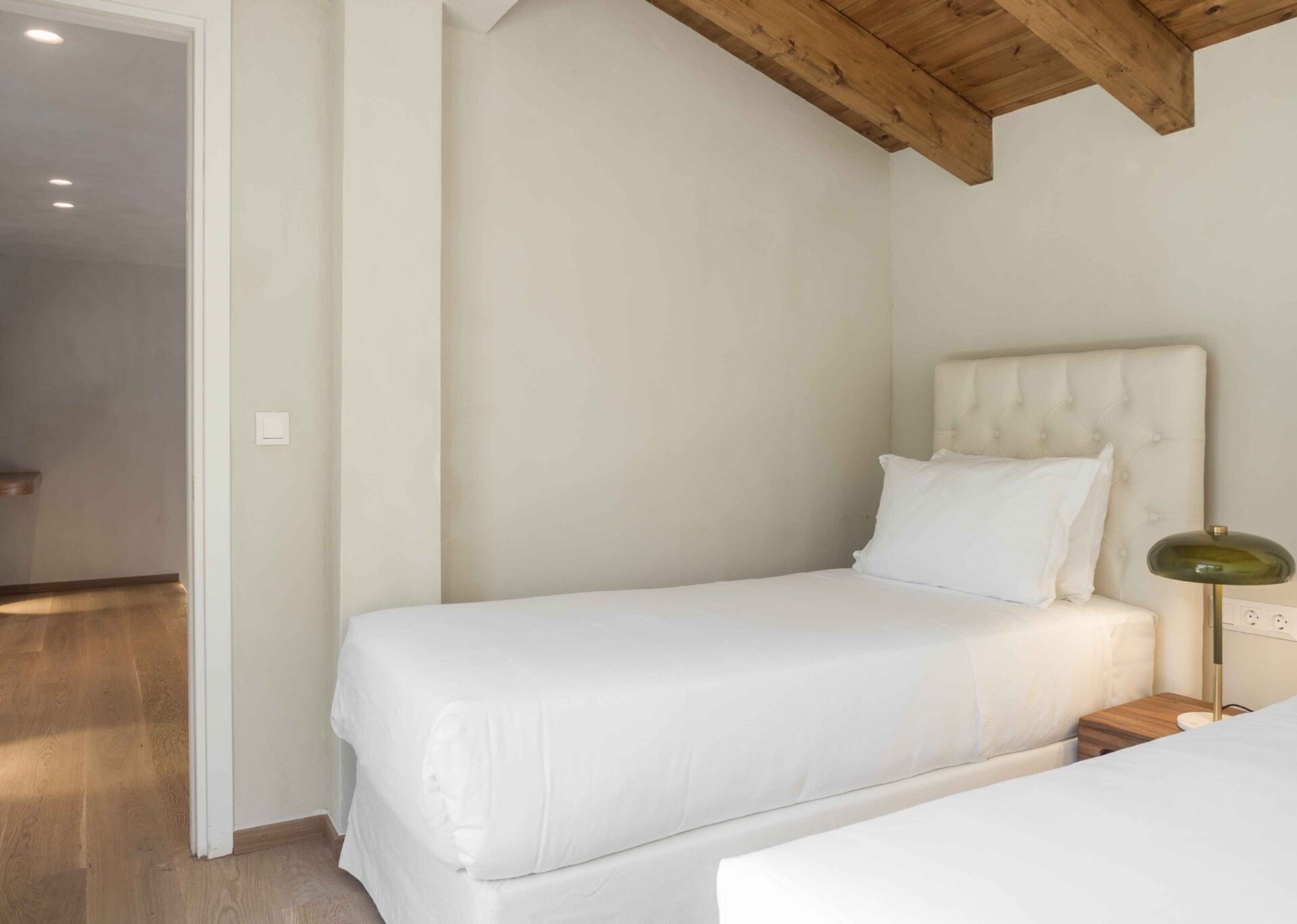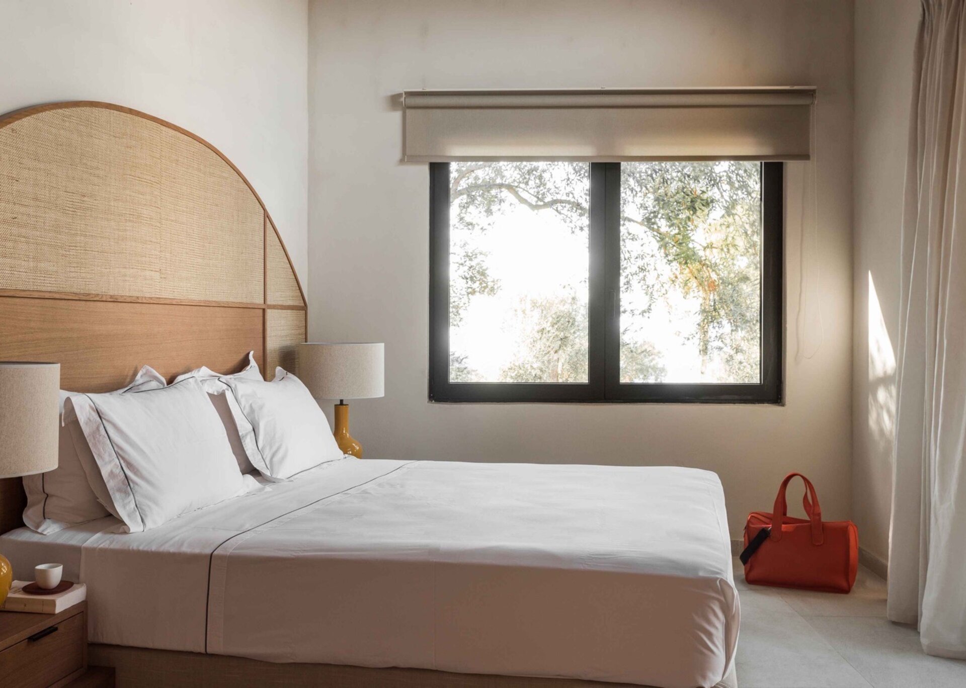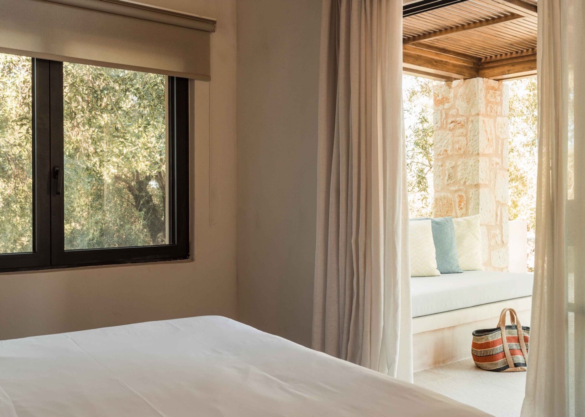 The voluminous open-plan layout of the villa greets guests with a spacious living room and dining area that open to a fully equipped modern kitchen. Floor-to-ceiling windows that open to the swimming pool terrace afford a panoramic view while a high, beamed ceiling amplifies the sense of spaciousness. A master bedroom with an en-suite bathroom that opens to a garden and a double or twin en-suite bathroom are located on the ground floor. The top floor of the villa features three double en-suite bedrooms, one with a bathtub bathroom, each offering stunning views of the surrounding area and the sea. All bedrooms are beautifully designed with immaculate taste and a cosy atmosphere that will make you rethink leaving them in the morning.