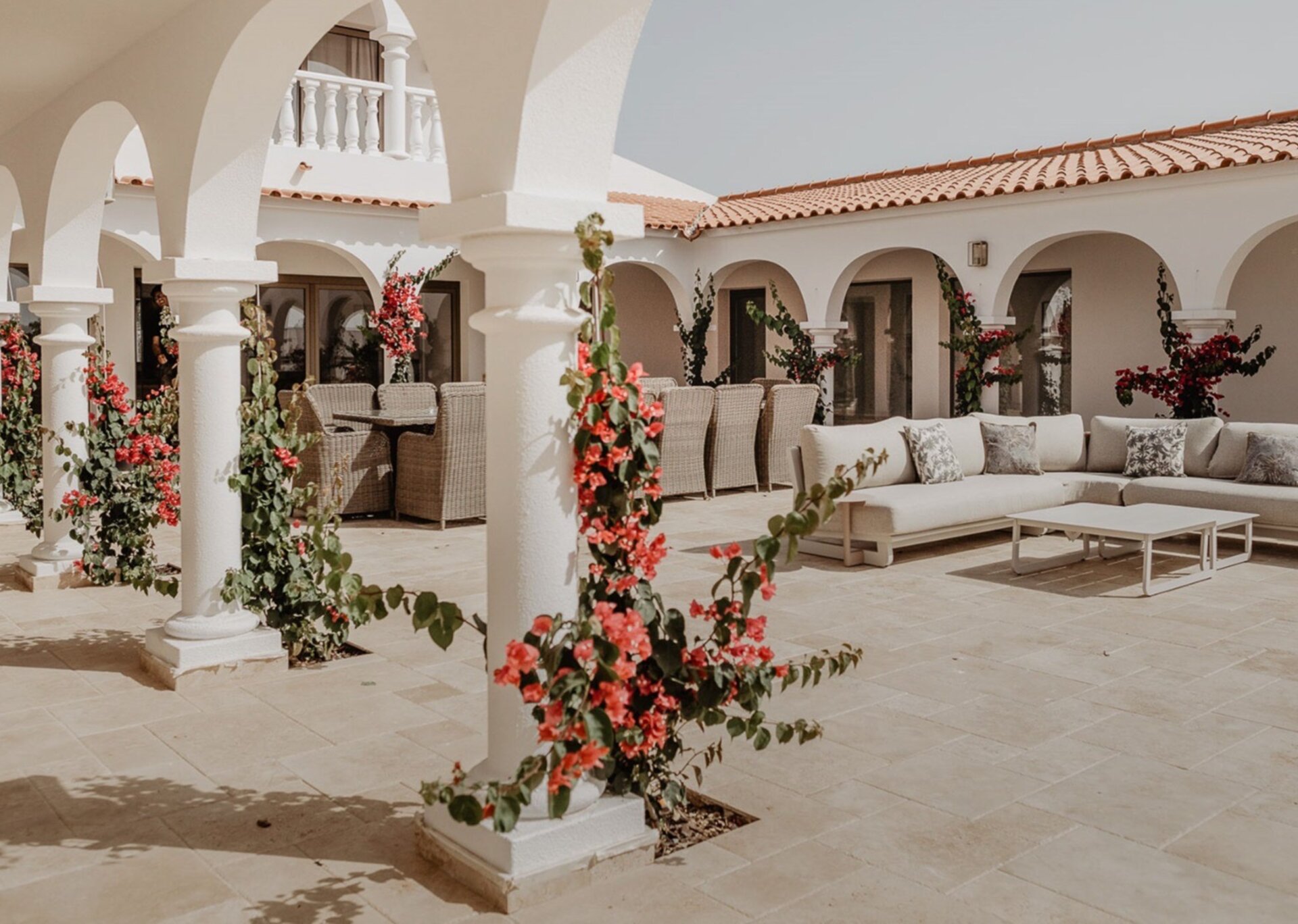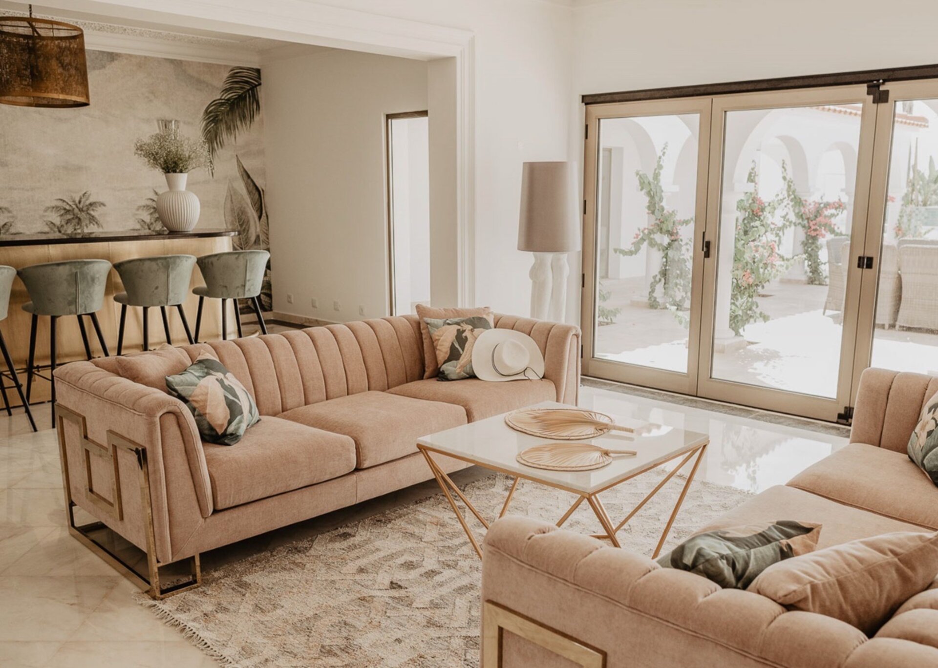 Splendid rooms open to an oversized patio and glittering pool with large expanse of lawn beyond. The open plan living/dining and bar area with large slide-back glass windows highlights the typical local architectural arches beyond.