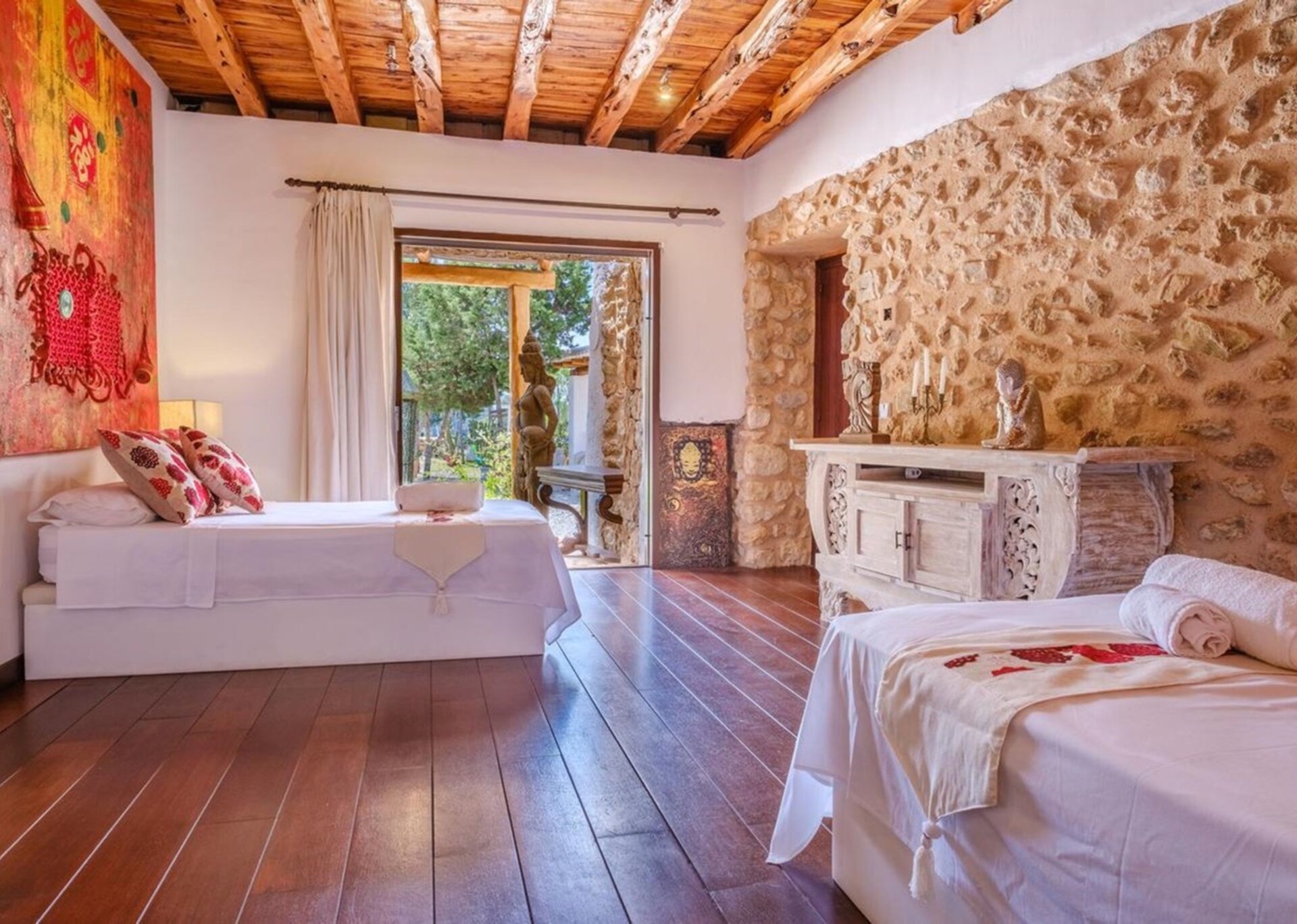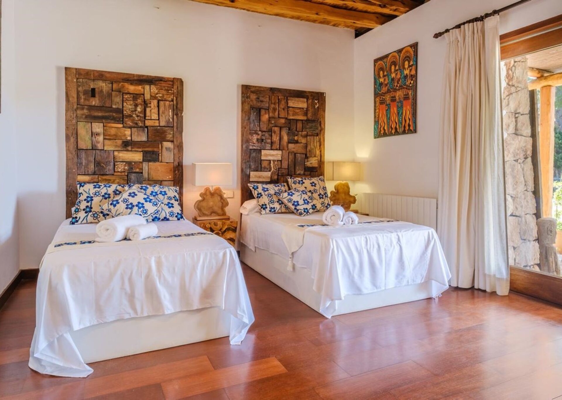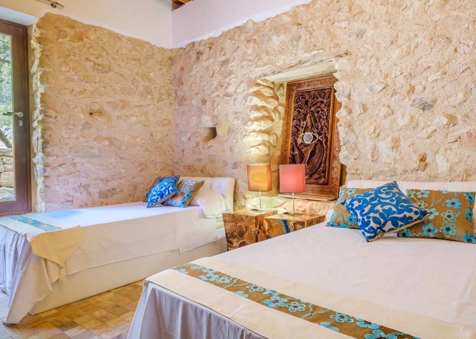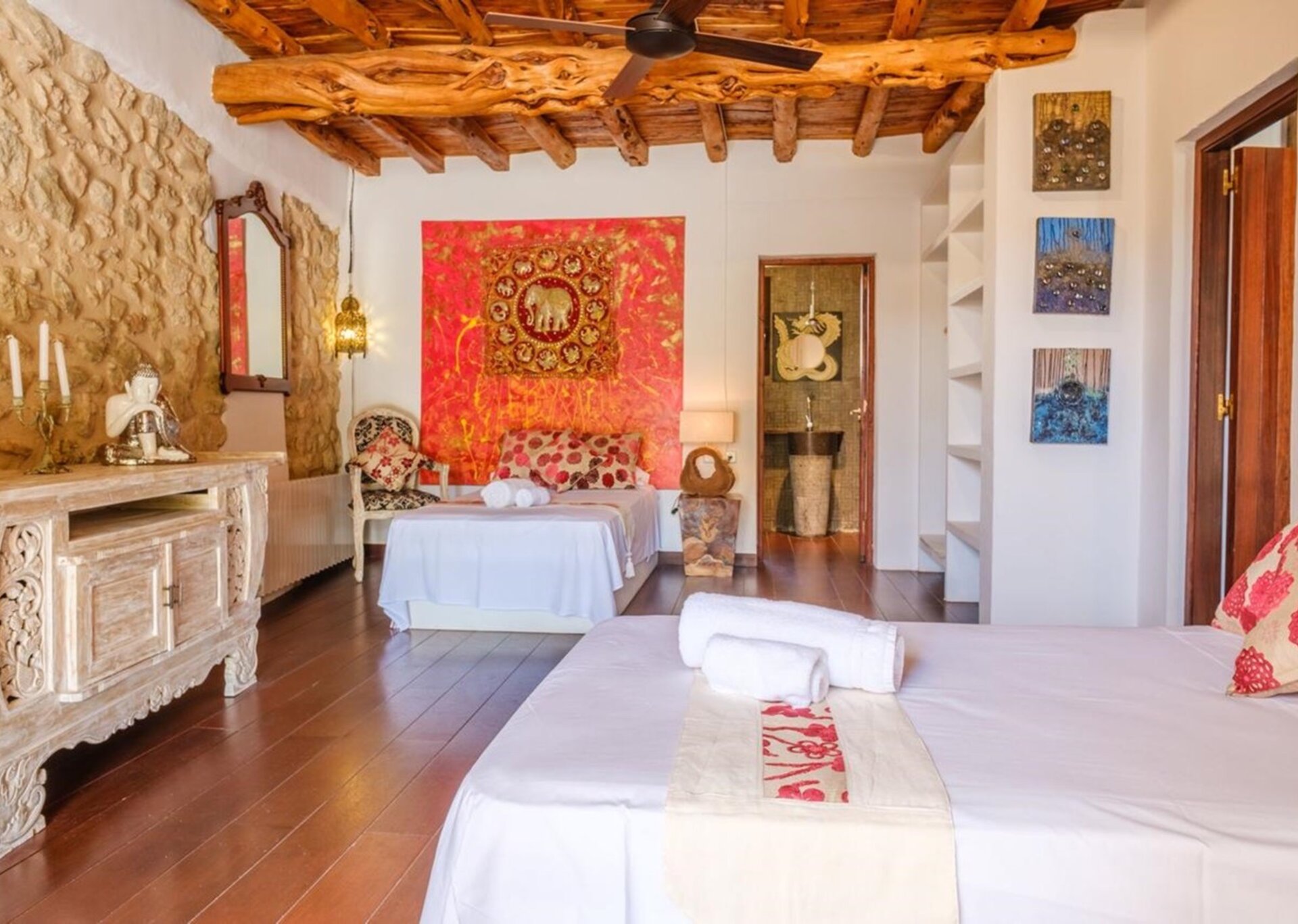 Lisa is an exceptional five-bedroom villa situated in a secluded part of the island, rarely explored by vacationers. Its prime location next to the picturesque Cala Salada beach sets it apart. This magnificent property seamlessly combines tasteful interiors that blend Asian and African influences with the traditional charm of a 500-year-old finca farmhouse. Meticulously restored, Lisa offers breathtaking sea views and unforgettable Ibiza sunsets. Nestled within 50,000 m2 of land, the villa boasts numerous enchanting spots that allow you to fully immerse yourself in the beauty of the natural surroundings. Wander along pathways that wind through the Mediterranean garden, filled with vibrant colors, aromatic scents, citrus orchards, and vegetable gardens.