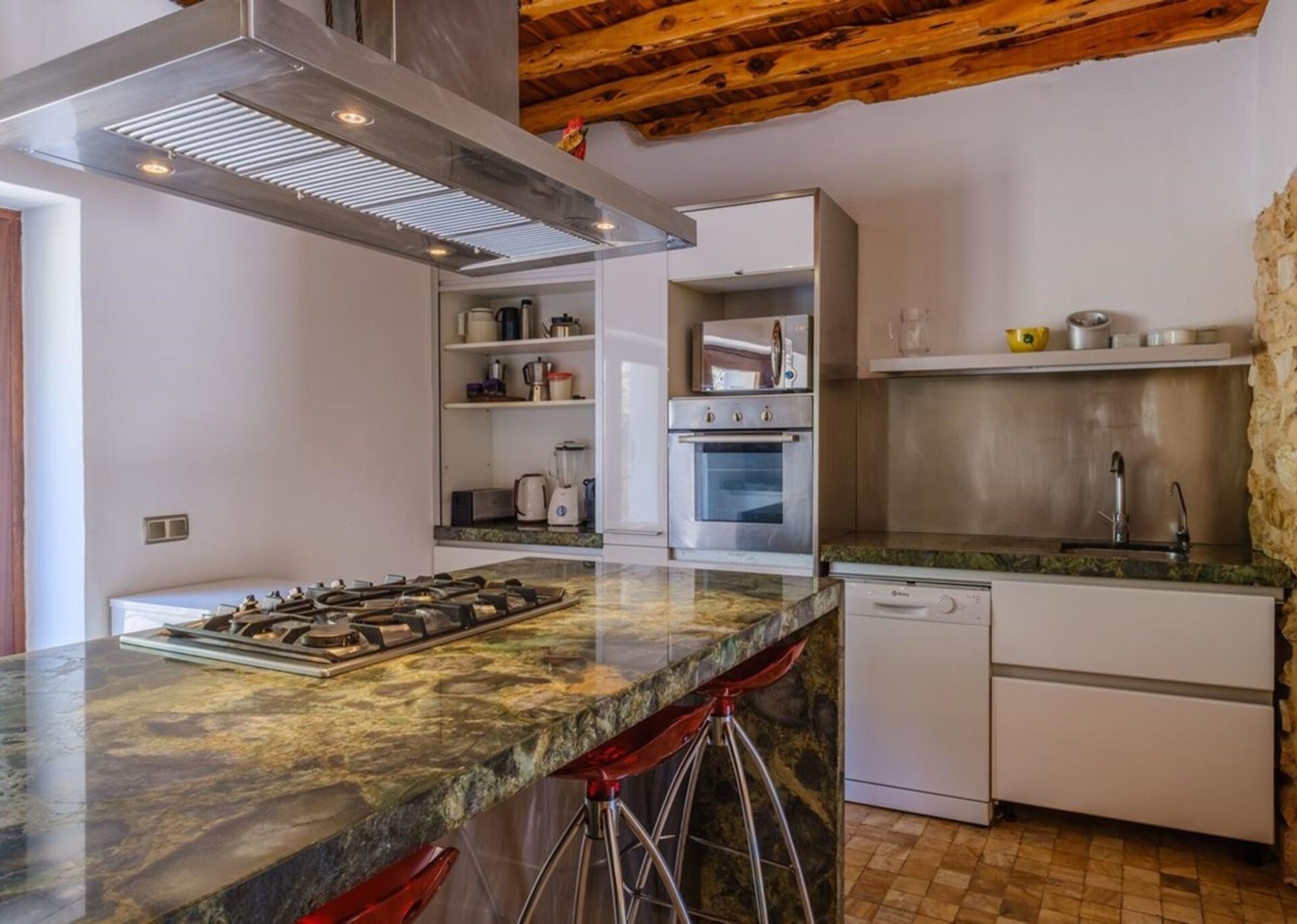 Lisa is an exquisite transformation of a 500-year-old finca, a perfect haven for those seeking grandiose dimensions, a sprawling layout, and lofty ceiling heights. While maintaining its traditional rural essence, the house has been thoughtfully divided and modernized. The local design aesthetic is embodied in the use of natural materials, such as rugged stone, exposed timber beams, wooden window frames, and shutters. The addition of modern elements like polished concrete floors and contemporary fixtures throughout the house imparts a sense of sophistication. The kitchen blends traditional country style with a modern, sociable layout, creating a space that is both charming and functional.