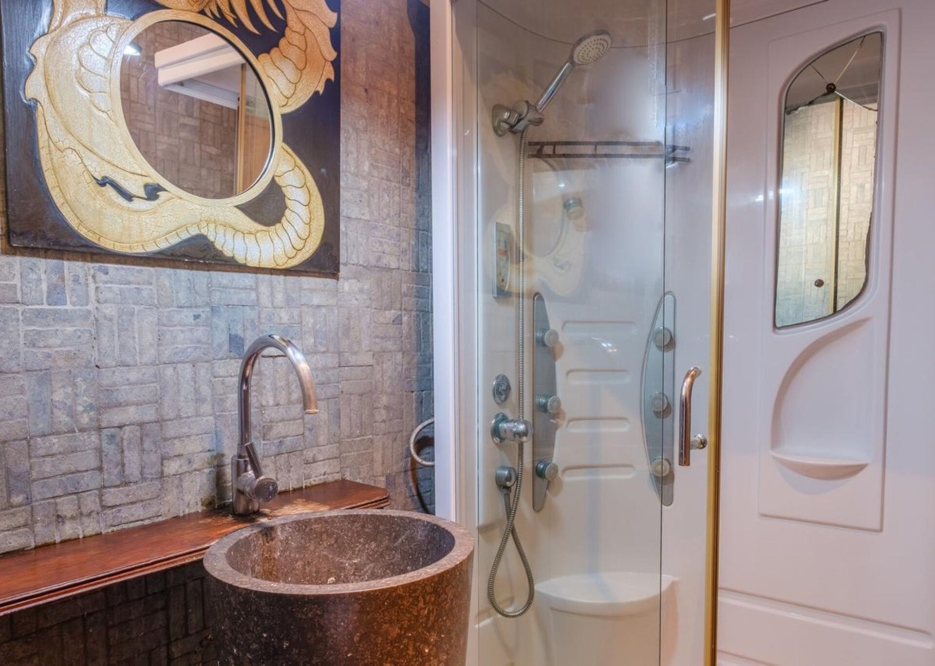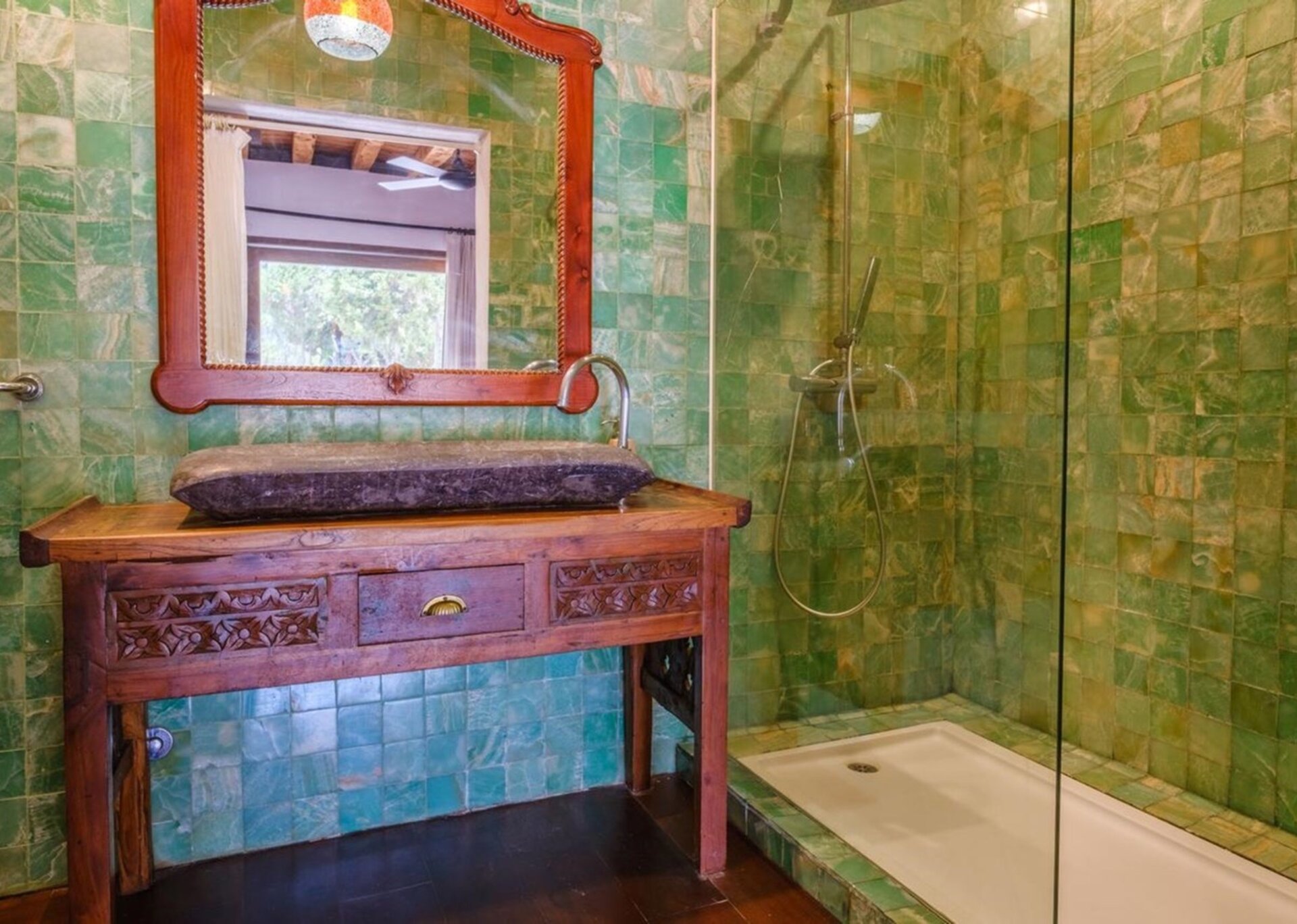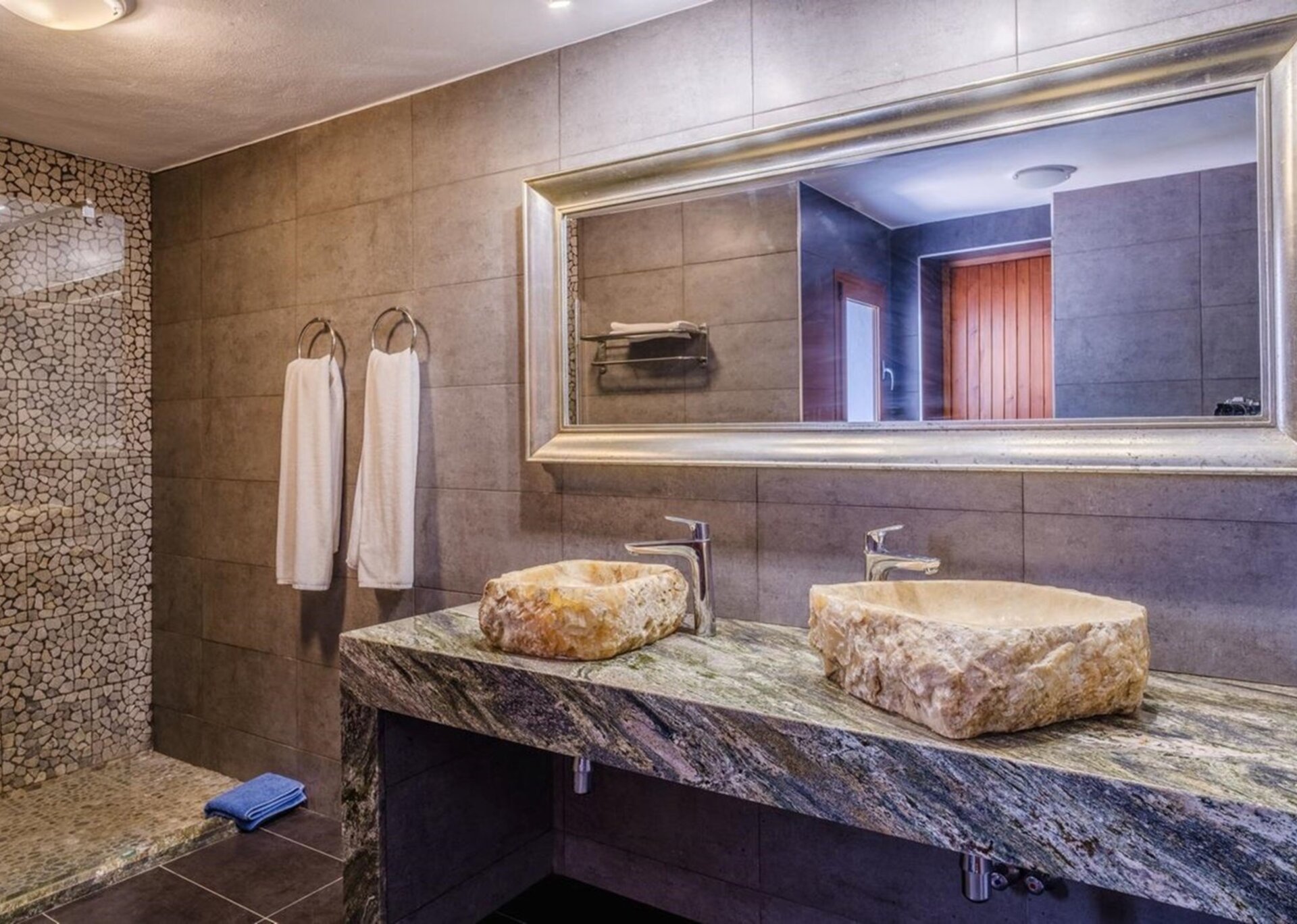 An elegant corridor connects the upstairs sleeping quarters, each exuding its own unique character and allure. Lisa boasts five double bedrooms, three of which feature luxurious en-suite bathrooms, while the remaining two share a well-appointed bathroom. The pièce de résistance is the master bedroom, graced with a spacious 100m2 private terrace offering unparalleled sunset views and vistas of the sea. The suites on the lower floor provide a serene sanctuary for guests, away from the vibrant energy of the upstairs terraces. Air conditioning is present in all bedrooms, and several rooms are equipped with ceiling fans for added comfort.