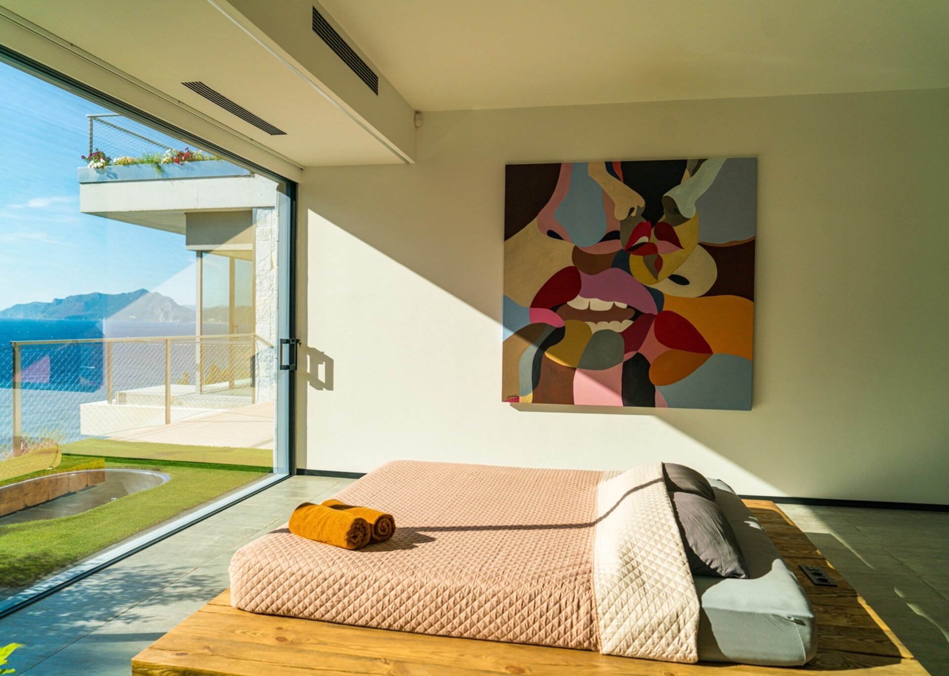Bedroom 4 – King-size bed, en-suite bathroom with double vanity and shower, shared balcony with a Jacuzzi, and breathtaking sea views