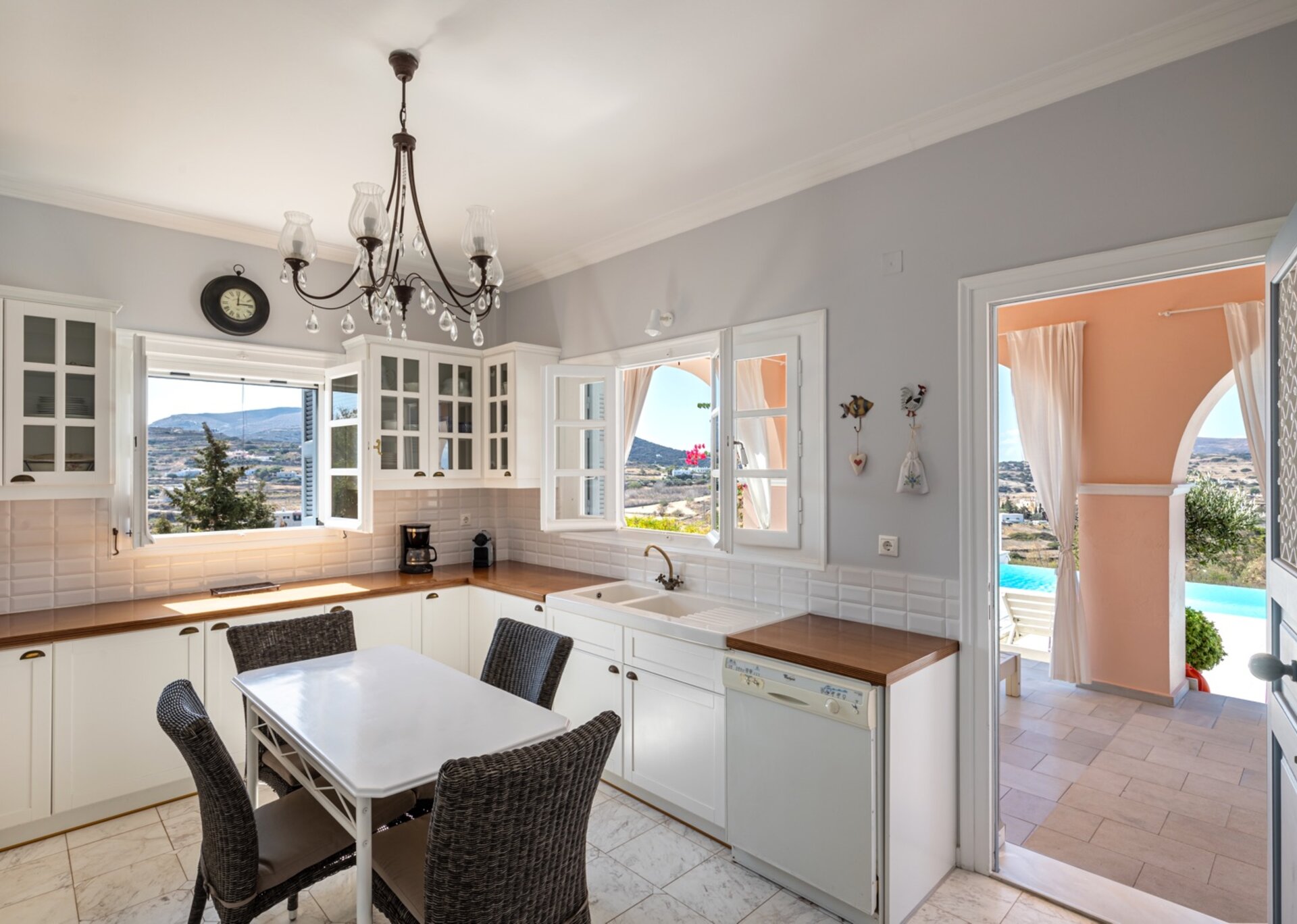 Inside the house the mood is lavish. The decoration is minimal and stripped of any unnecessary details. The cozy living room is sumptuously furnished with high quality pieces and its ideal for relaxation with family and friends. Also, there is a fully equipped kitchen and a dining room to enjoy a meal and capture blissful moments in this Cycladic adventure.