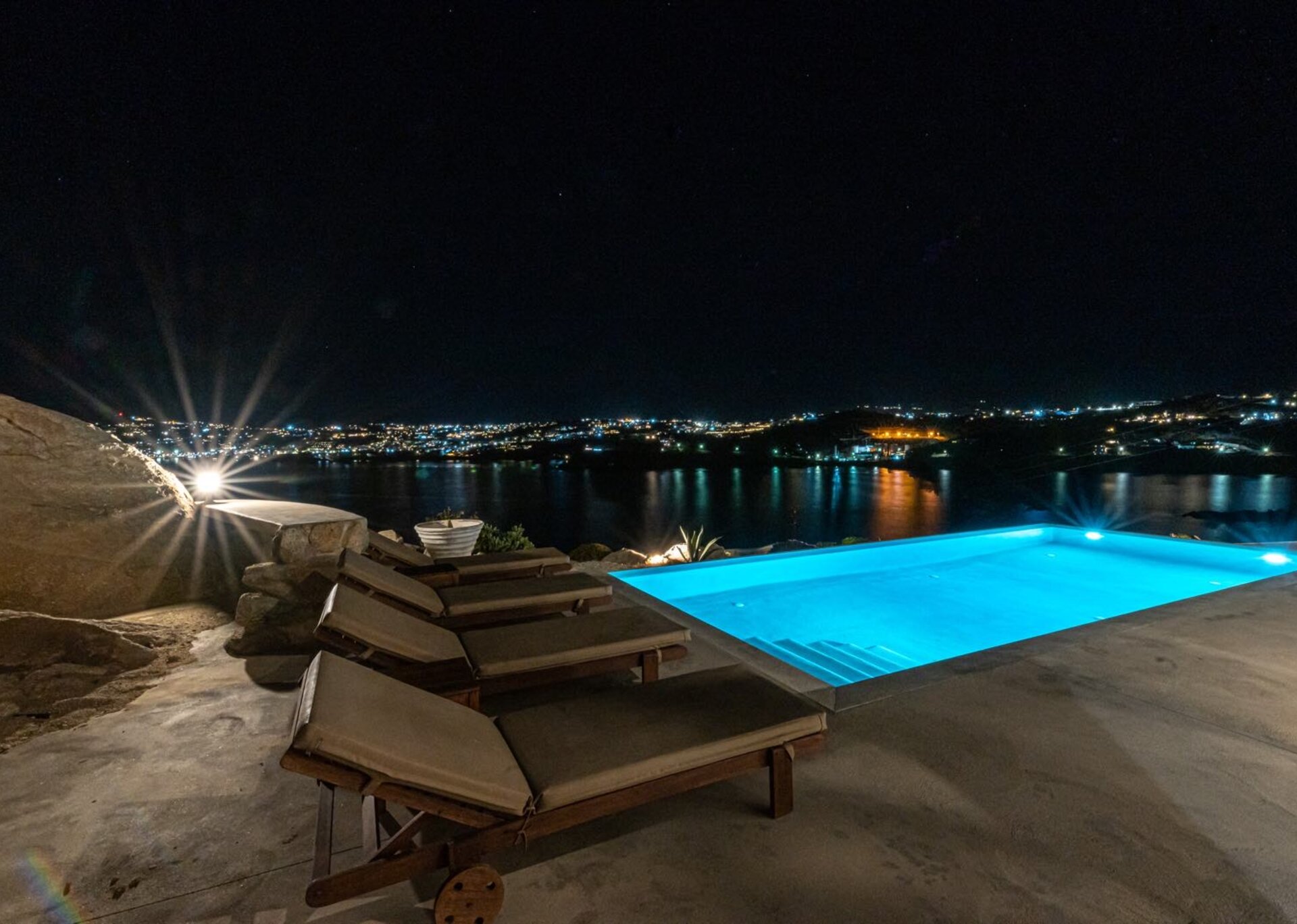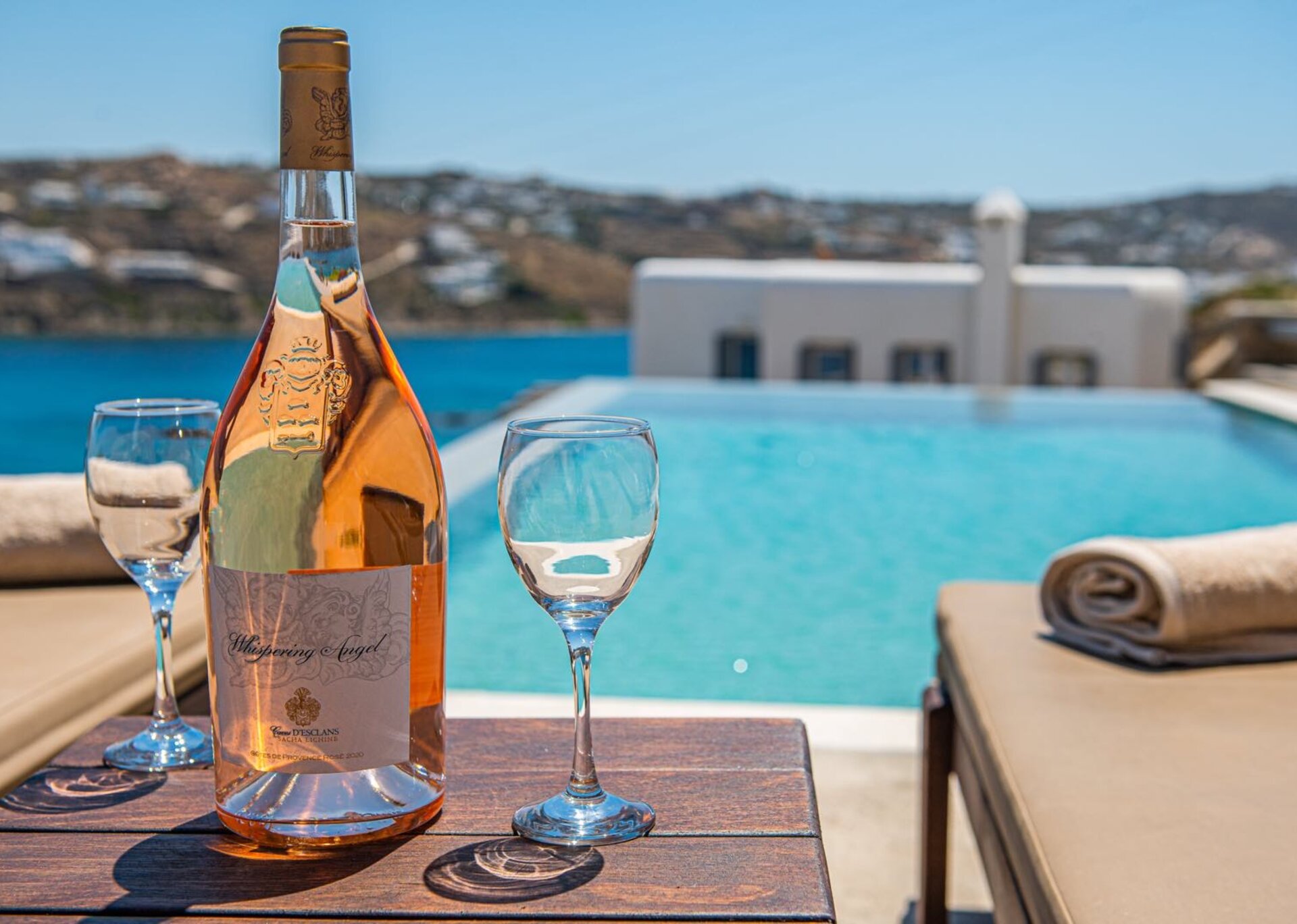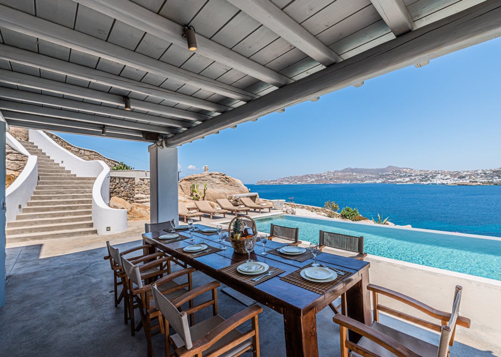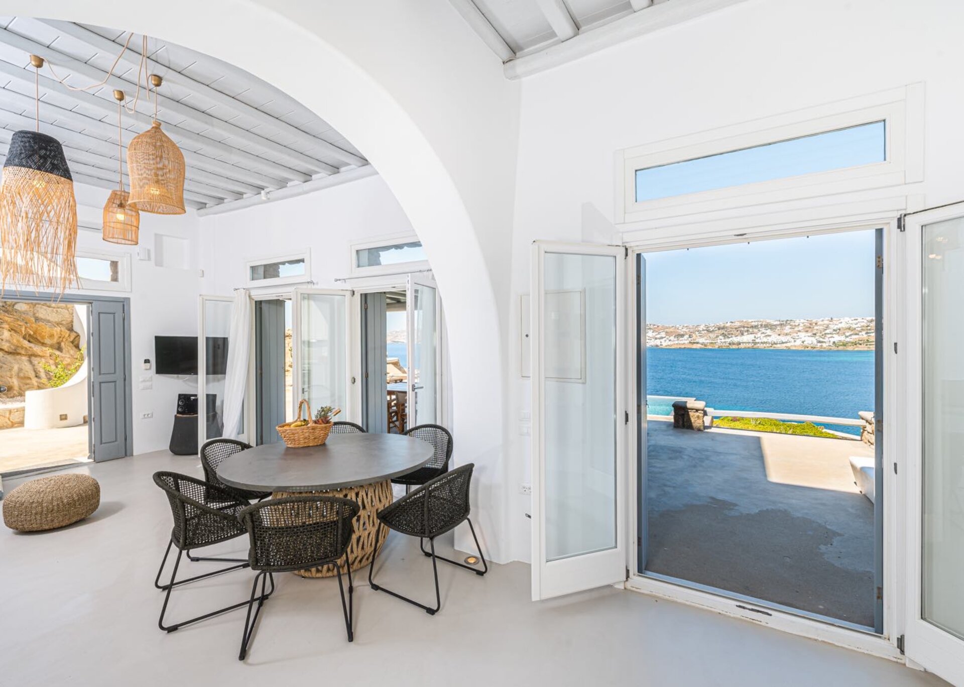 Majesty is an experience in aesthetics:The impressive, newly built villa is situated on a privileged hillside overlooking the sea and picturesque “Little Venice” part of the Town of Mykonos.