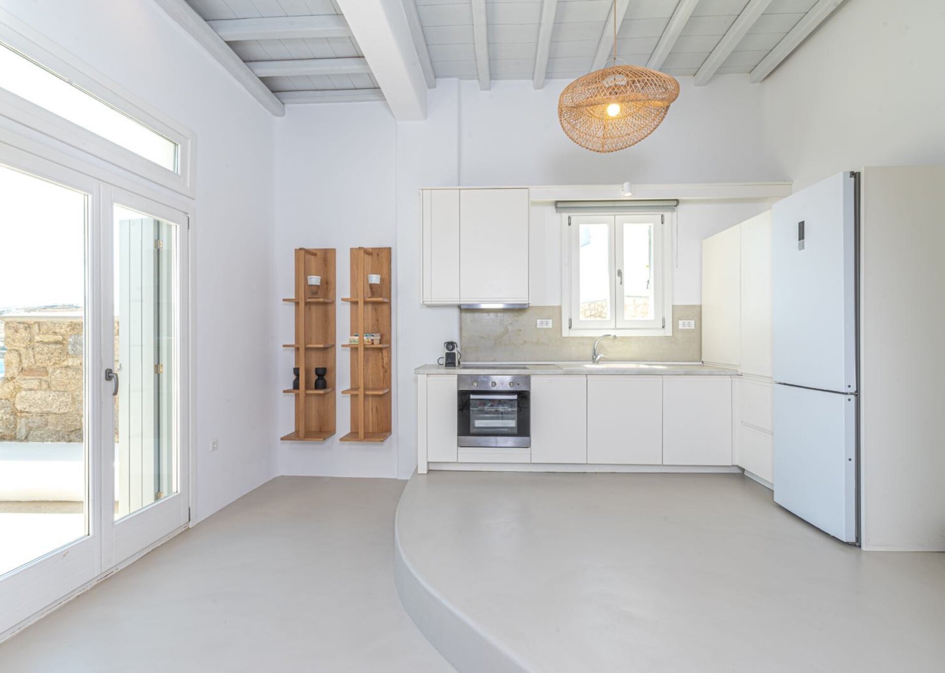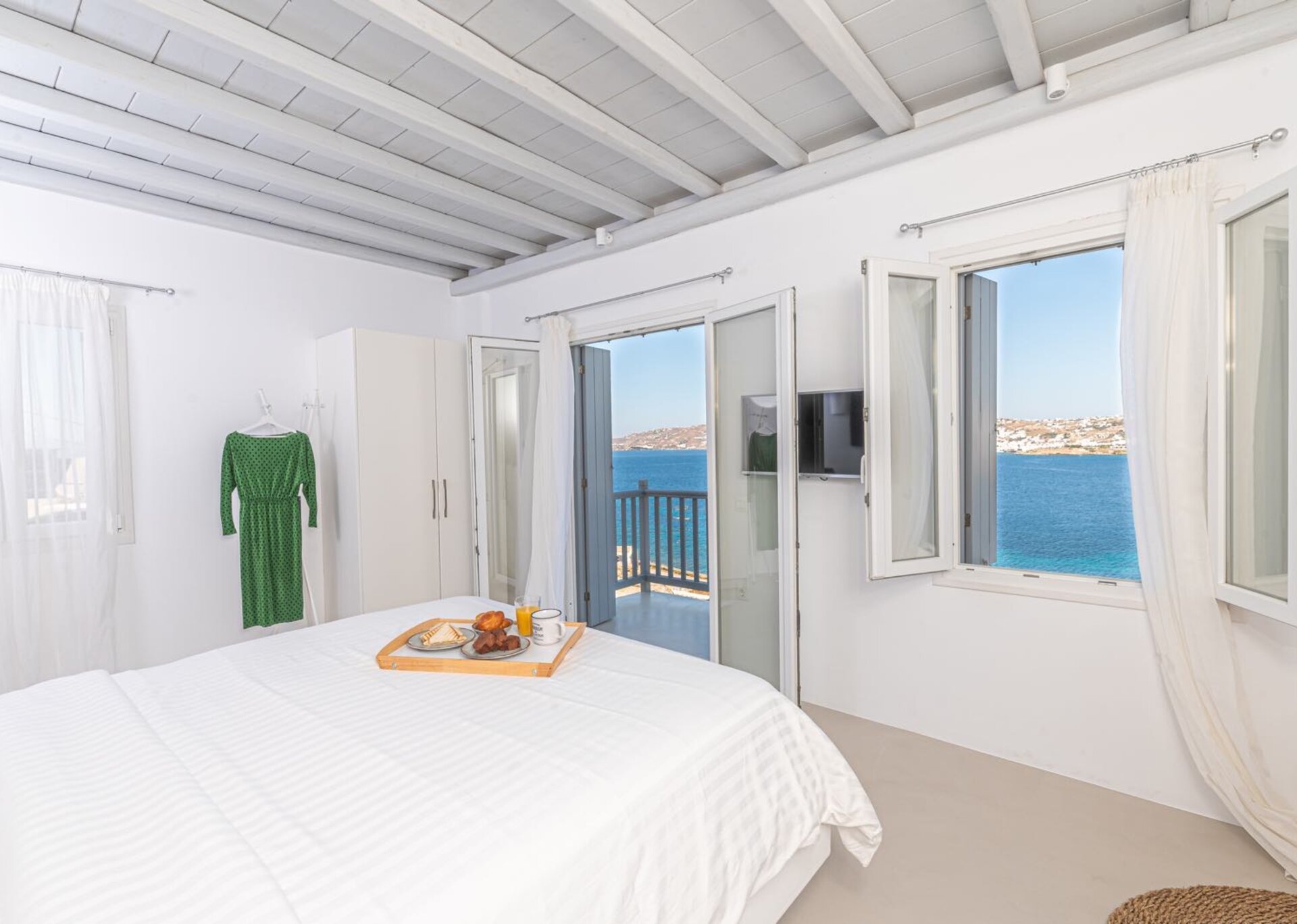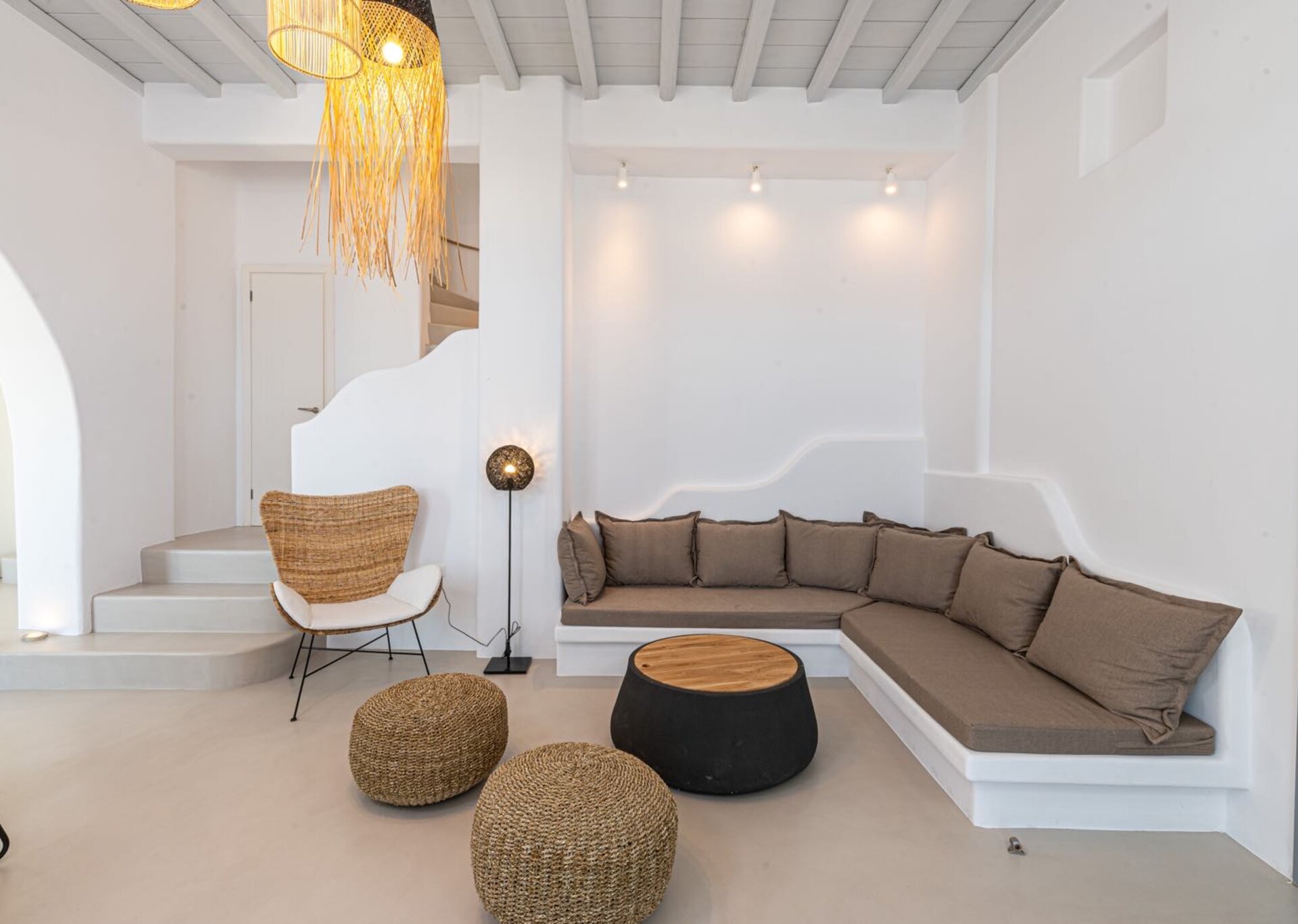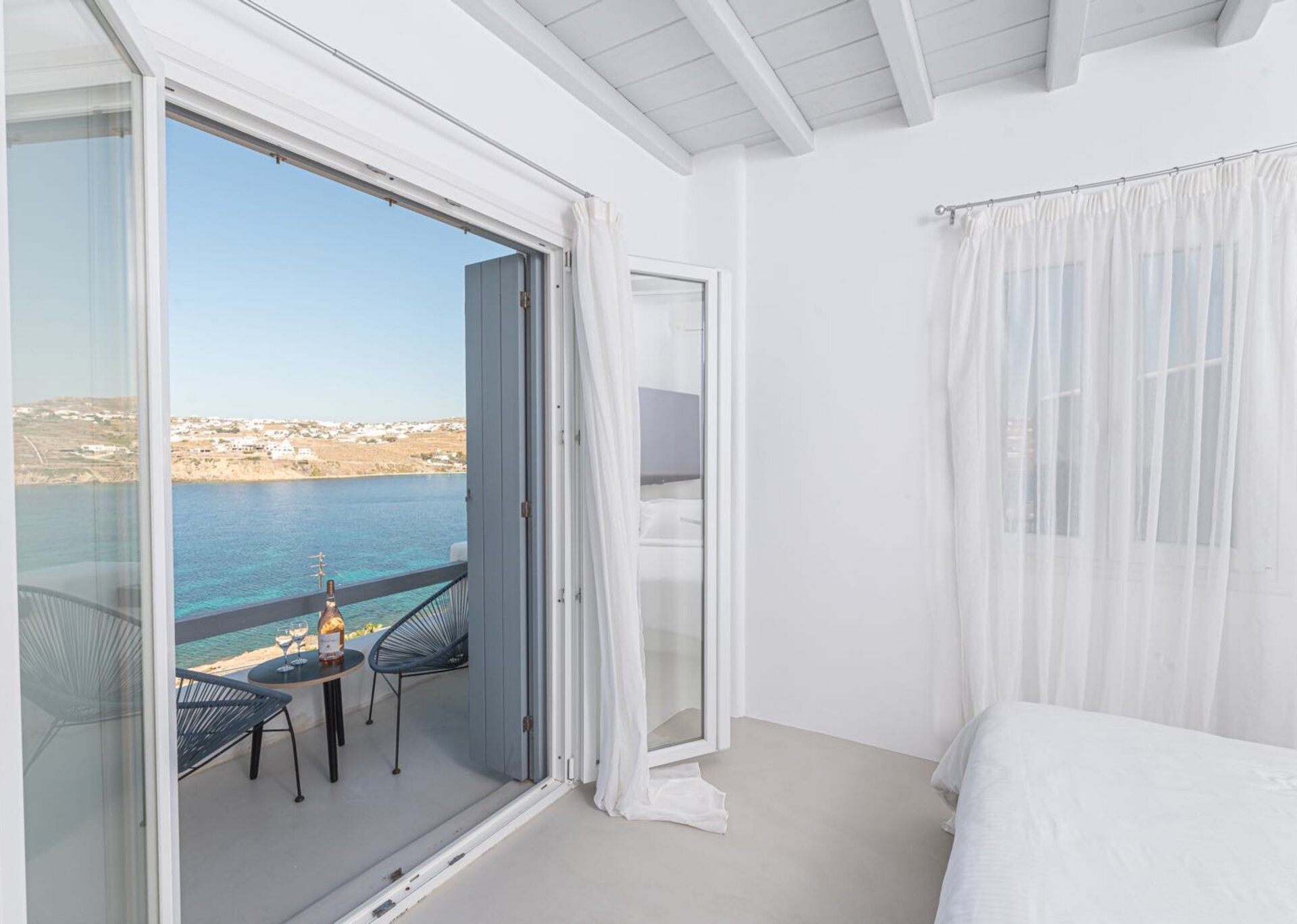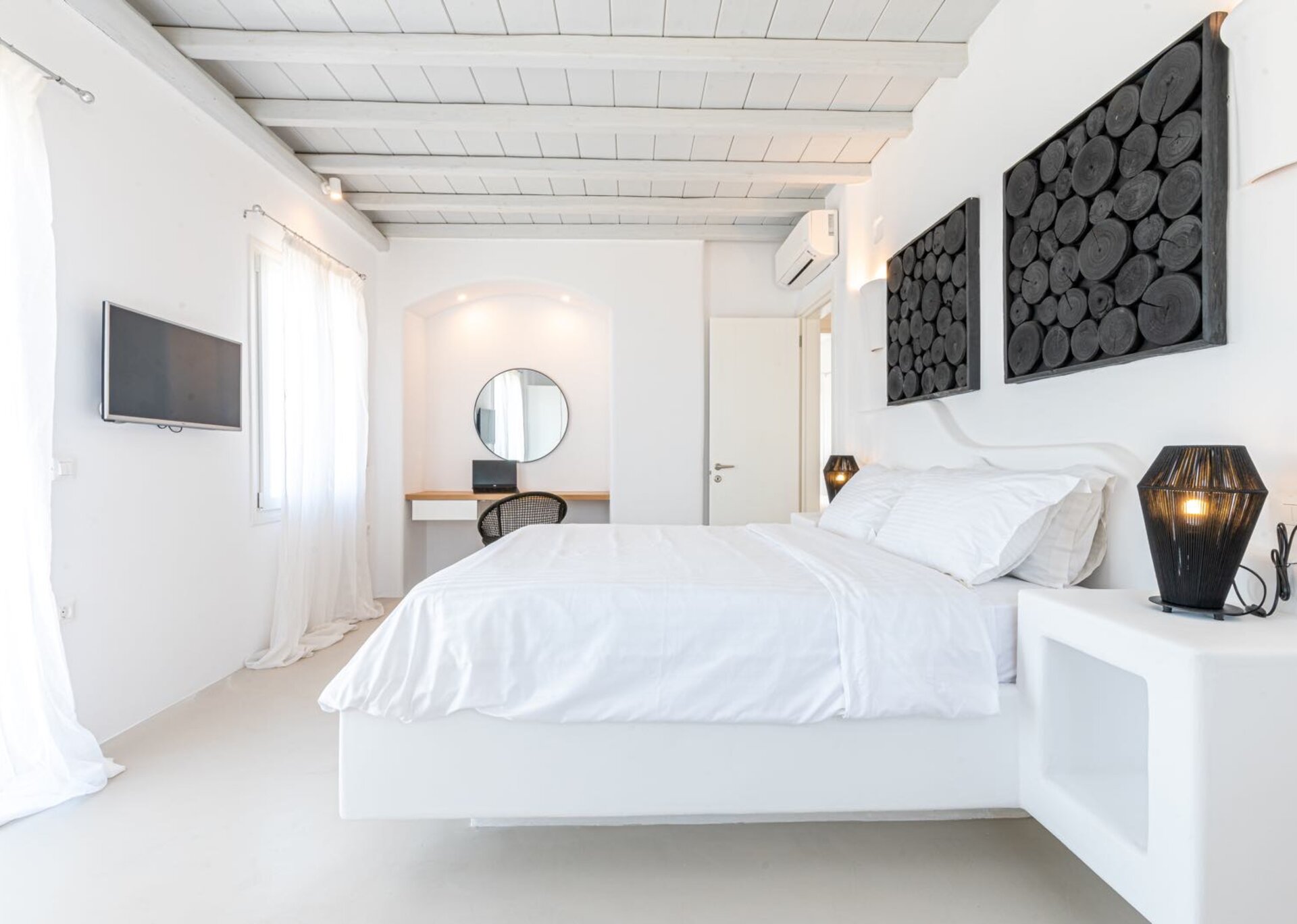 Majesty is an experience in aesthetics:The impressive, newly built villa is situated on a privileged hillside overlooking the sea and picturesque “Little Venice” part of the Town of Mykonos.
