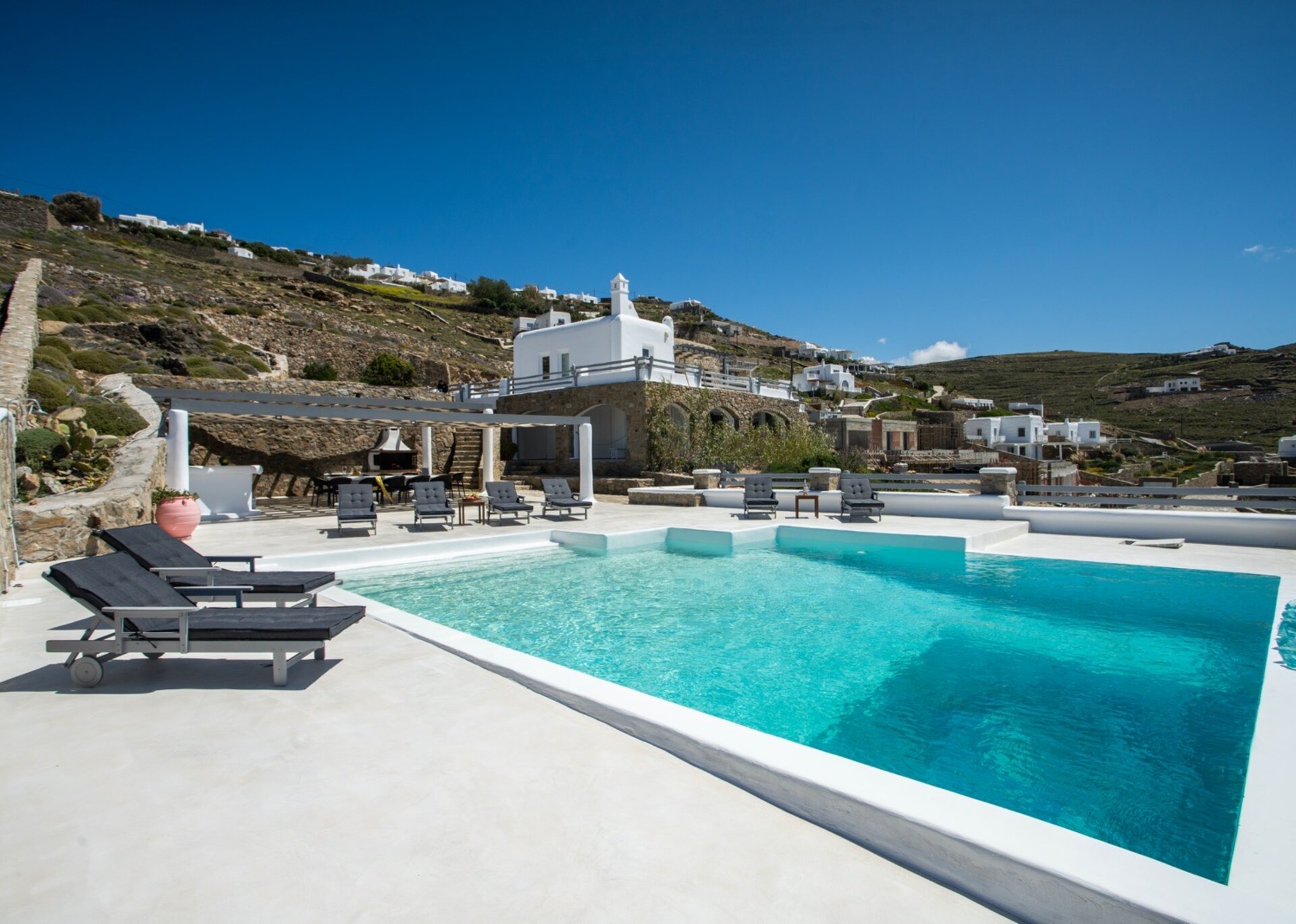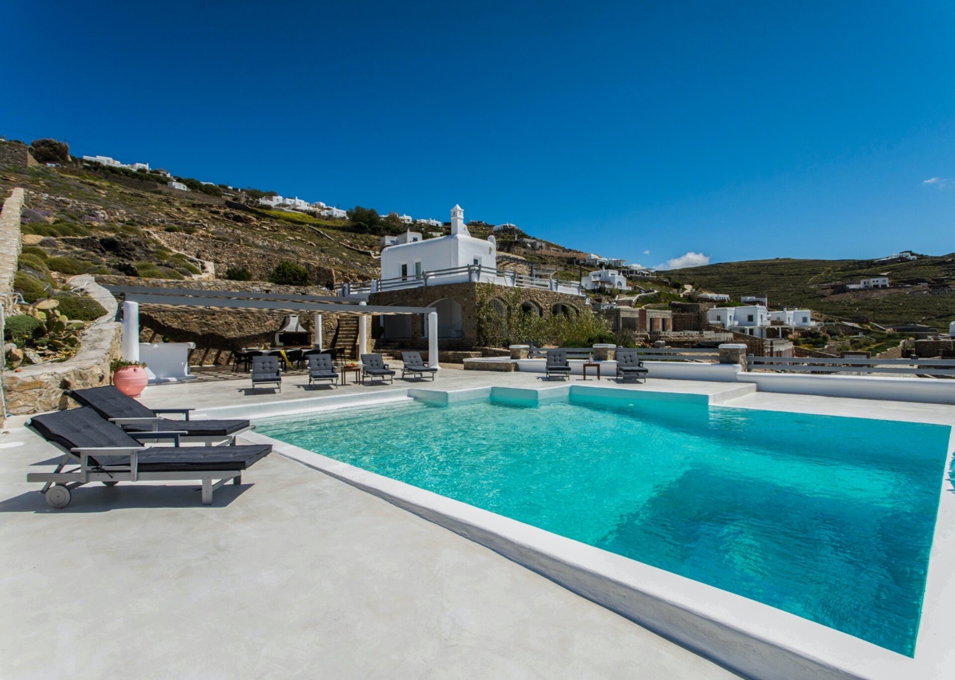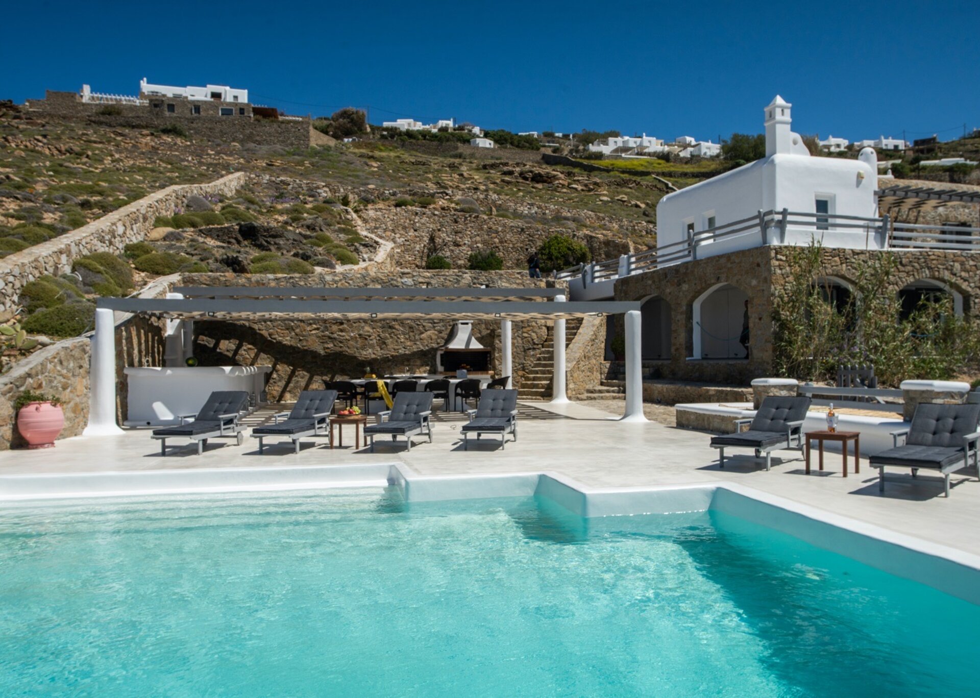 This beautiful villa, located in the privileged location of Houlakia can host up to 9 persons. This spacious villa offers combines privacy and tranquillity with beautiful landscapes and spectacular views of the Aegean sea and only a few minutes away from the nightlife and the famous restaurants of the island.